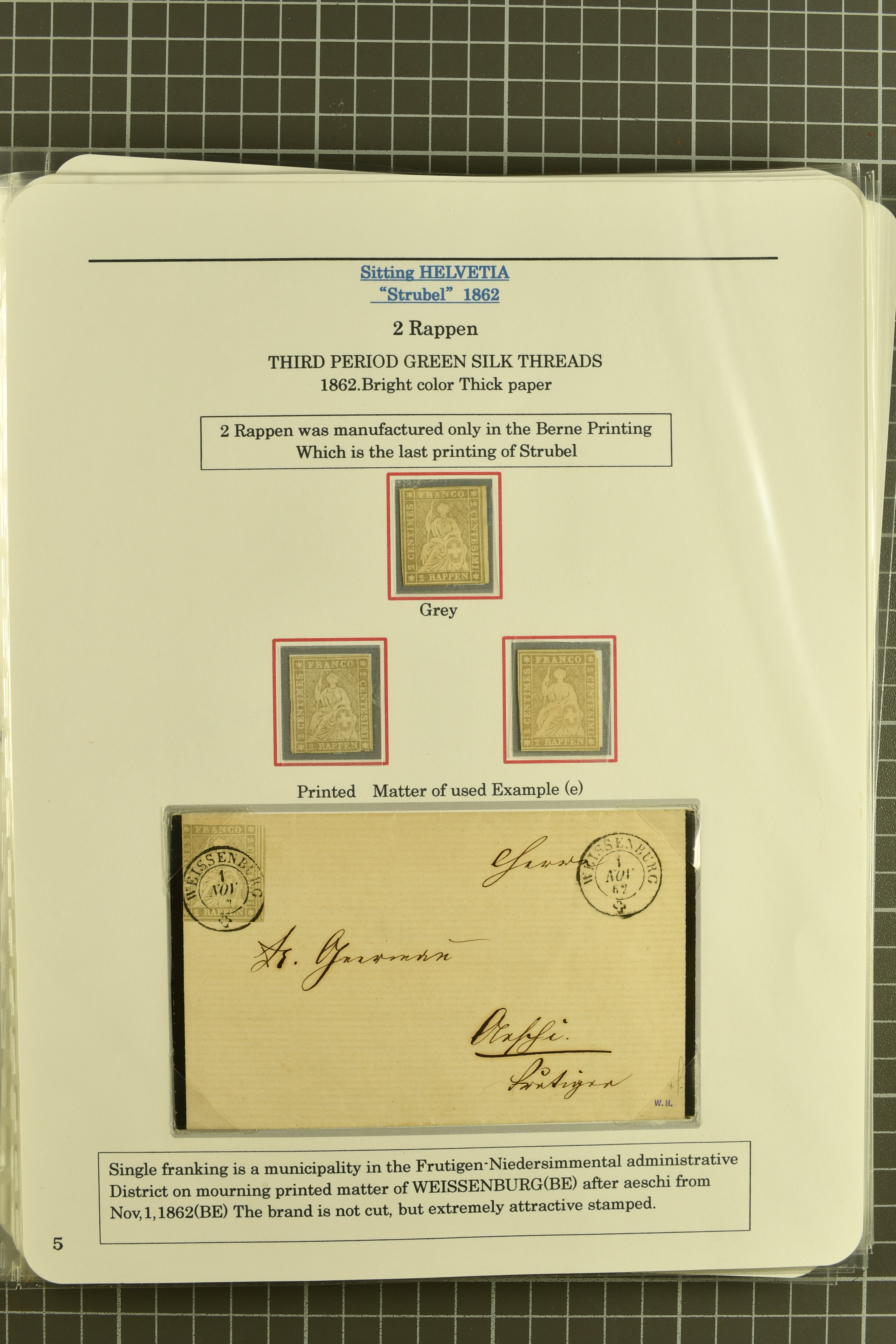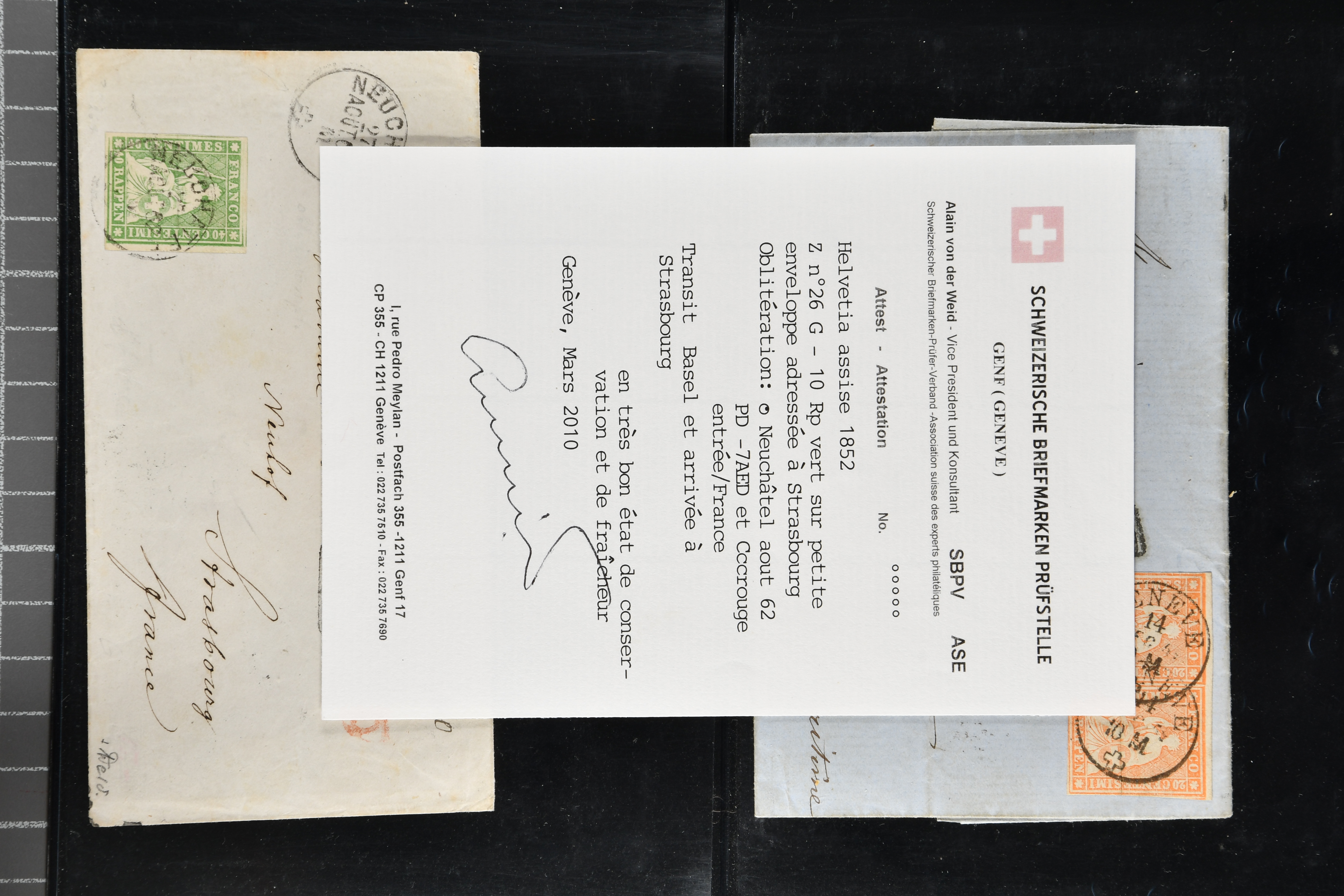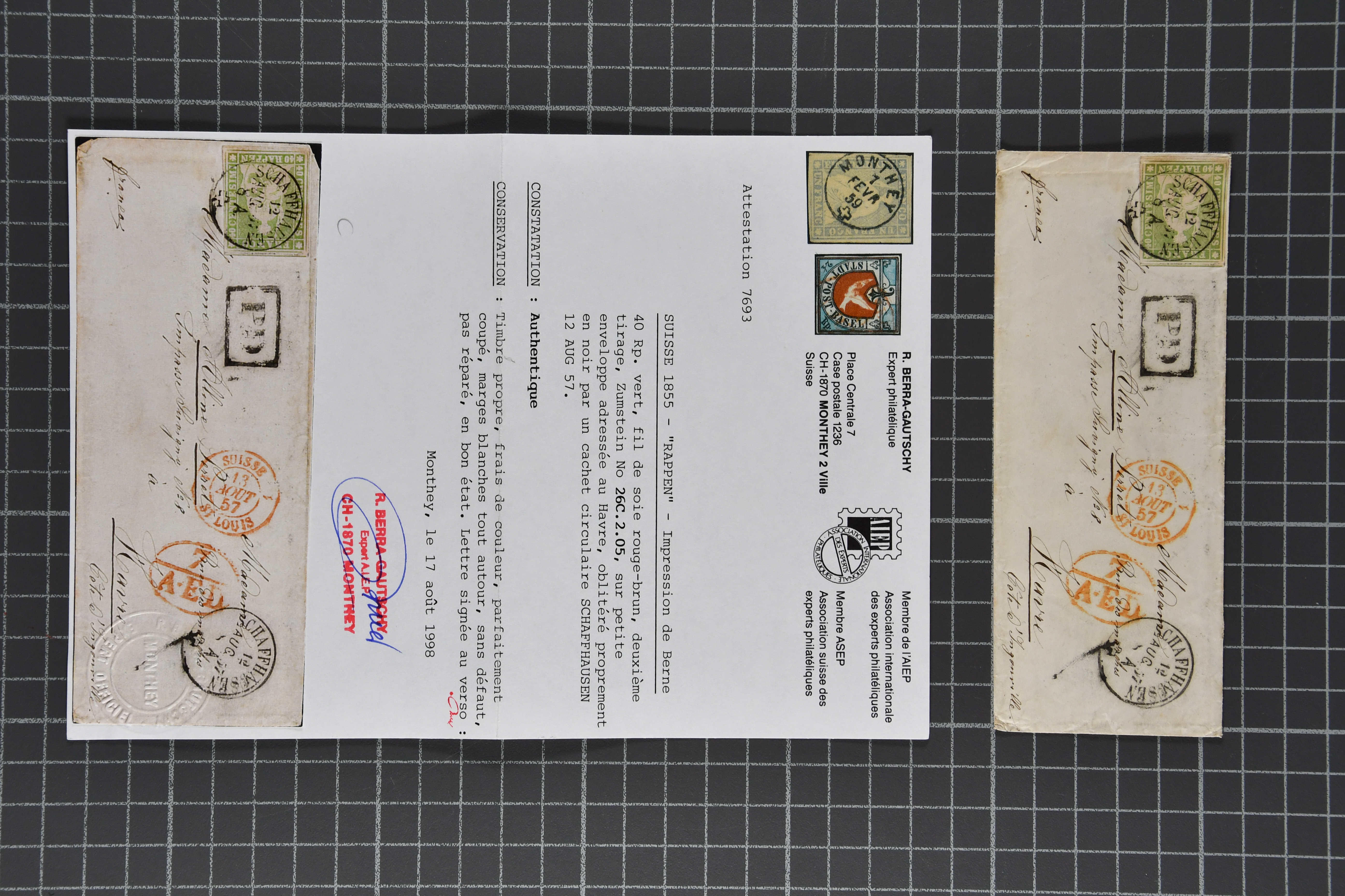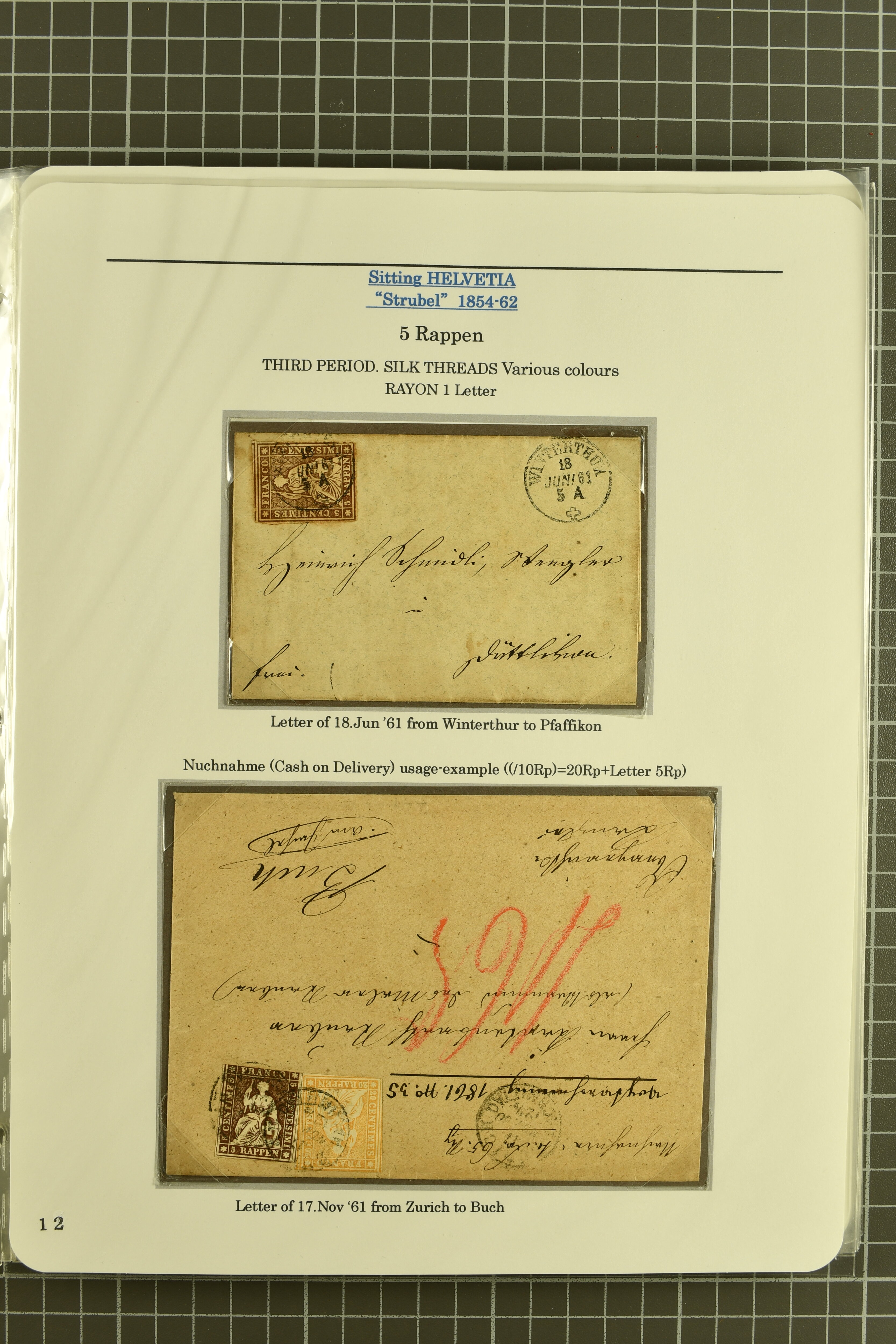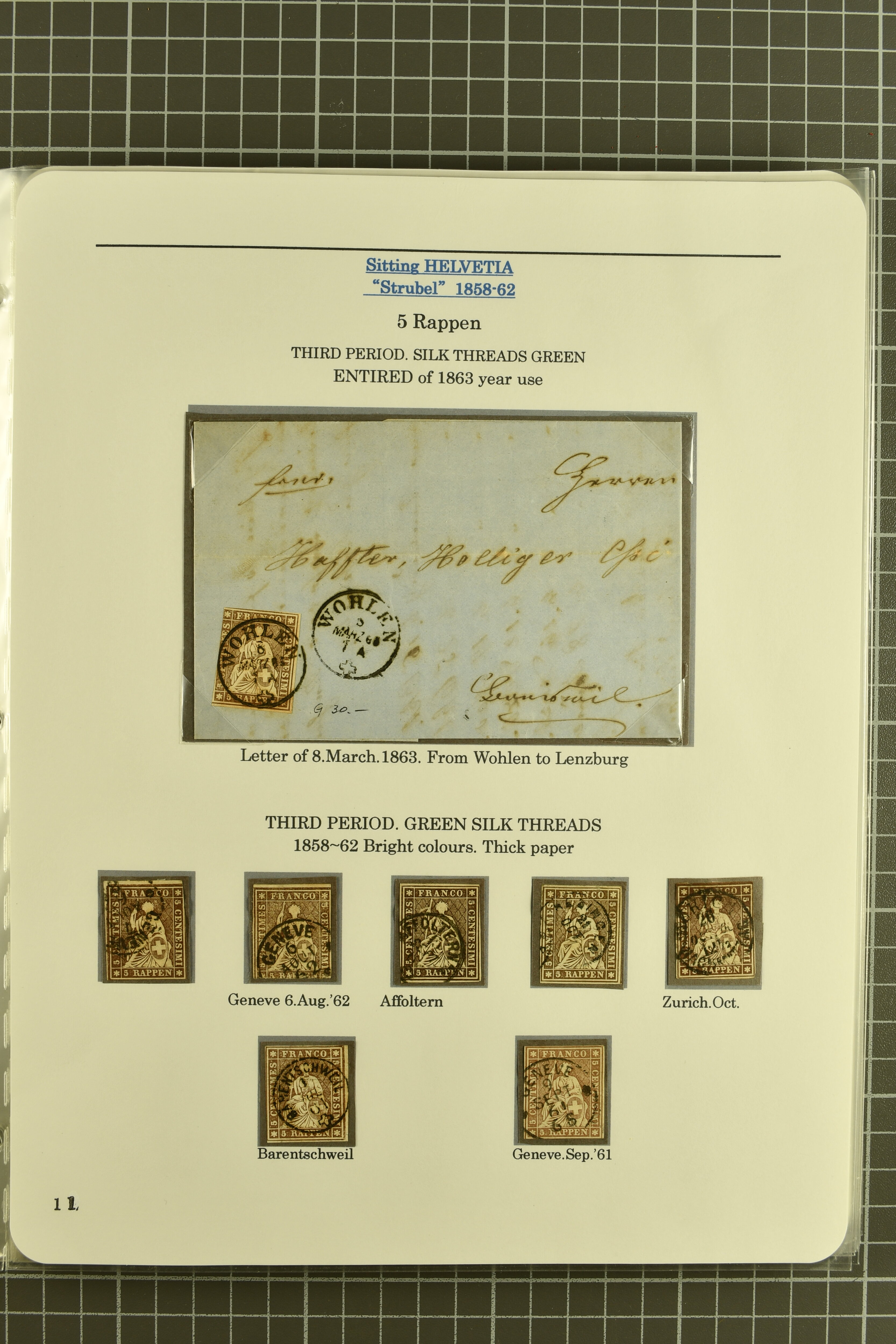9778 image1854/62: Ziemlich spezialisierte Sammlung mit 21 Briefen und 110 ungebr./gest. Einzelwerten auf 23 Ausstellungsblättern. Dabei elf ungebr. Werte inkl. 5 Rp. braun (SBK 22A), 20 Rp. gelblichorange (SBK 25G), 40 Rp. olivgrün (2, SBK 26G) und 1 Fr. grau (SBK 27D), bessere gest. Werte wie neun Exemplare der 2 Rp. grau (SBK 21G), drei Exemplare 1 Fr. grau mit schwarzem Seidenfaden (SBK 27C) und sechs mit gelbem Seidenfaden (SBK 27D) sowie interessante Frankaturen wie 2 Rp. grau, ideal klar und übergehend entw. mit kl. Zweikreisstp. "WEISSENBURG 1 NOV. 62" auf frischer Trauer-Drucksache nach Aeschi bei Spiez, 5 Rp. braun (SBK 22G), diagonal halbiert als sog. "Genfer Provisorium" auf Briefstück, 15 Rp. karminrot (SBK 24A) entw. mit seltener 10-liniger Raute von Triengen (AW 55) in schwarz auf Nachnahme-Faltbrieflein im Ort, 20 Rp. gelblichorange (SBK 25B) auf Faltbrieflein im Grenzrayon von Genf nach Bonneville, Savoyen (Sardinien) sowie auf Nachnahme von Langenthal nach Dagmersellen mit nebenges. Schreibschriftspt. "Gondiswil" oder 40 Rp. grünlicholiv (SBK 26C) im waagr. Paar auf sauberem Faltbrief von Schaffhausen nach Leipzig, Sachsen. Unterschiedliche Erhaltung; vier Befunde. SBK=CHF 30'000+ (Image 1) (Image 2) (Image 3) (Image 4) (Image 5) (Image 6) (Image 7) (Image 8) (Image 9) (Image 10) (Image 11) (Image 12) (Image 13) (Image 14) (Image 15) (Image 16) (Image 17) (Image 18) (Image 19) (Image 20) (Image 21) (Image 22) (Image 23) (Image 24) (Image 25) (Image 26)