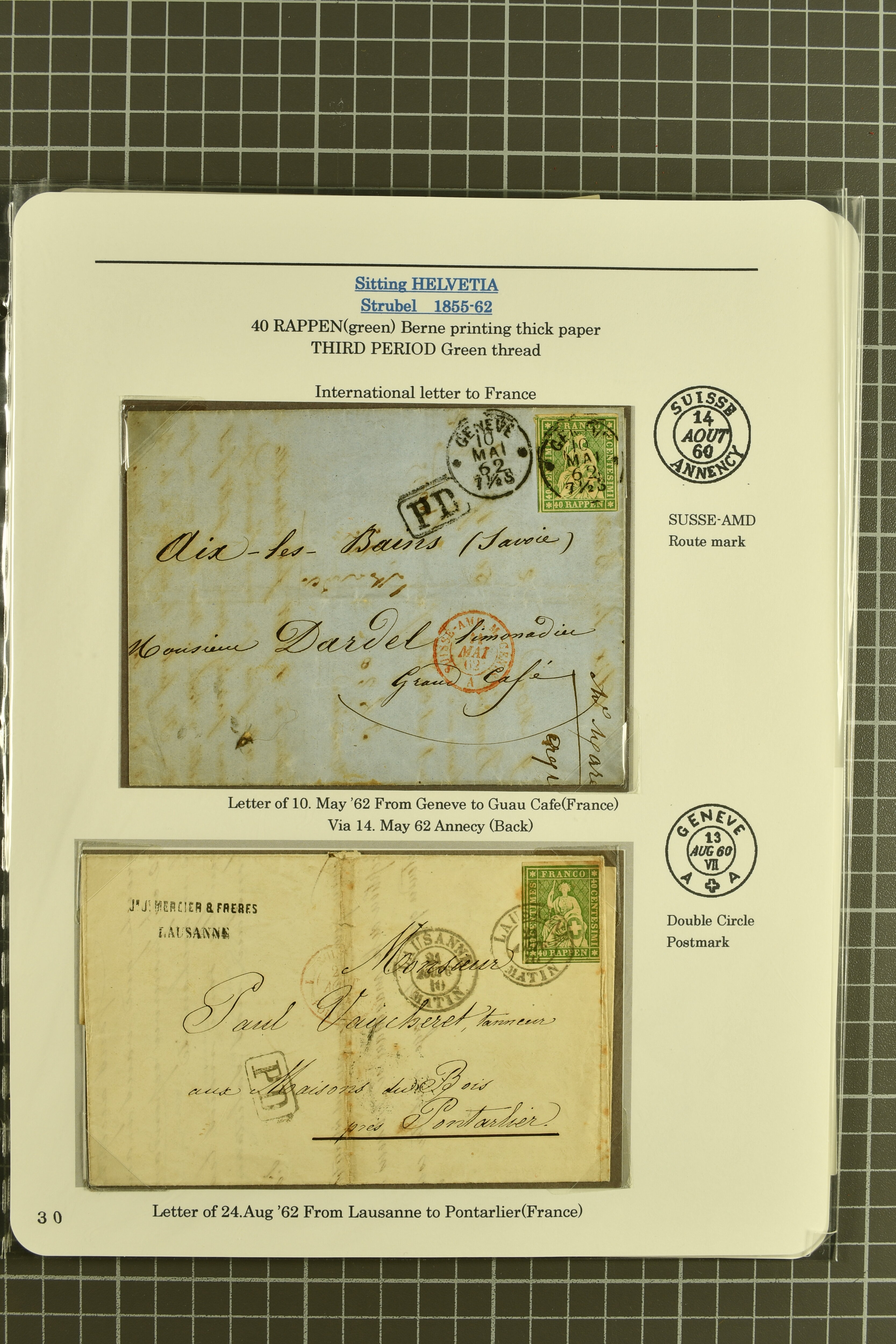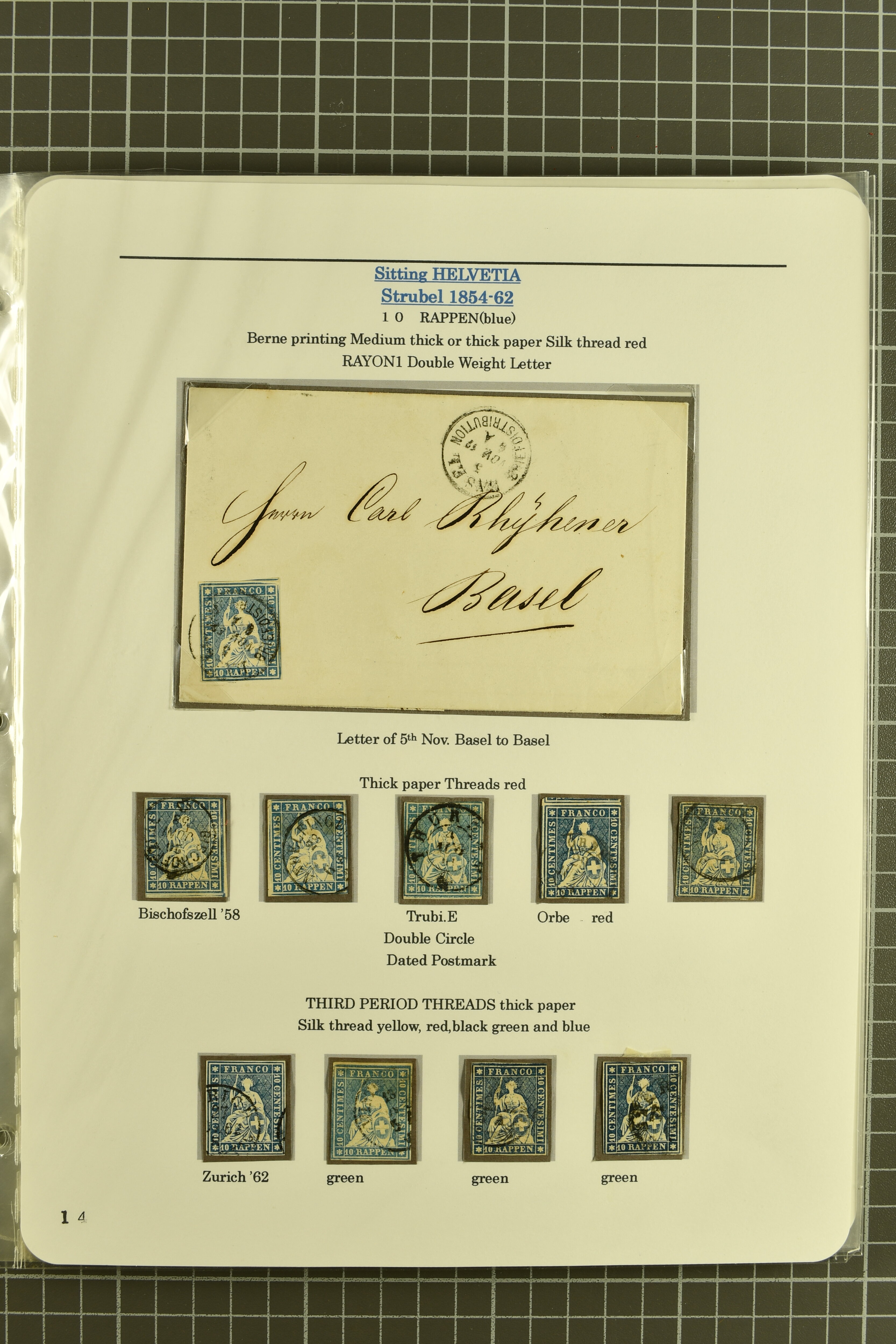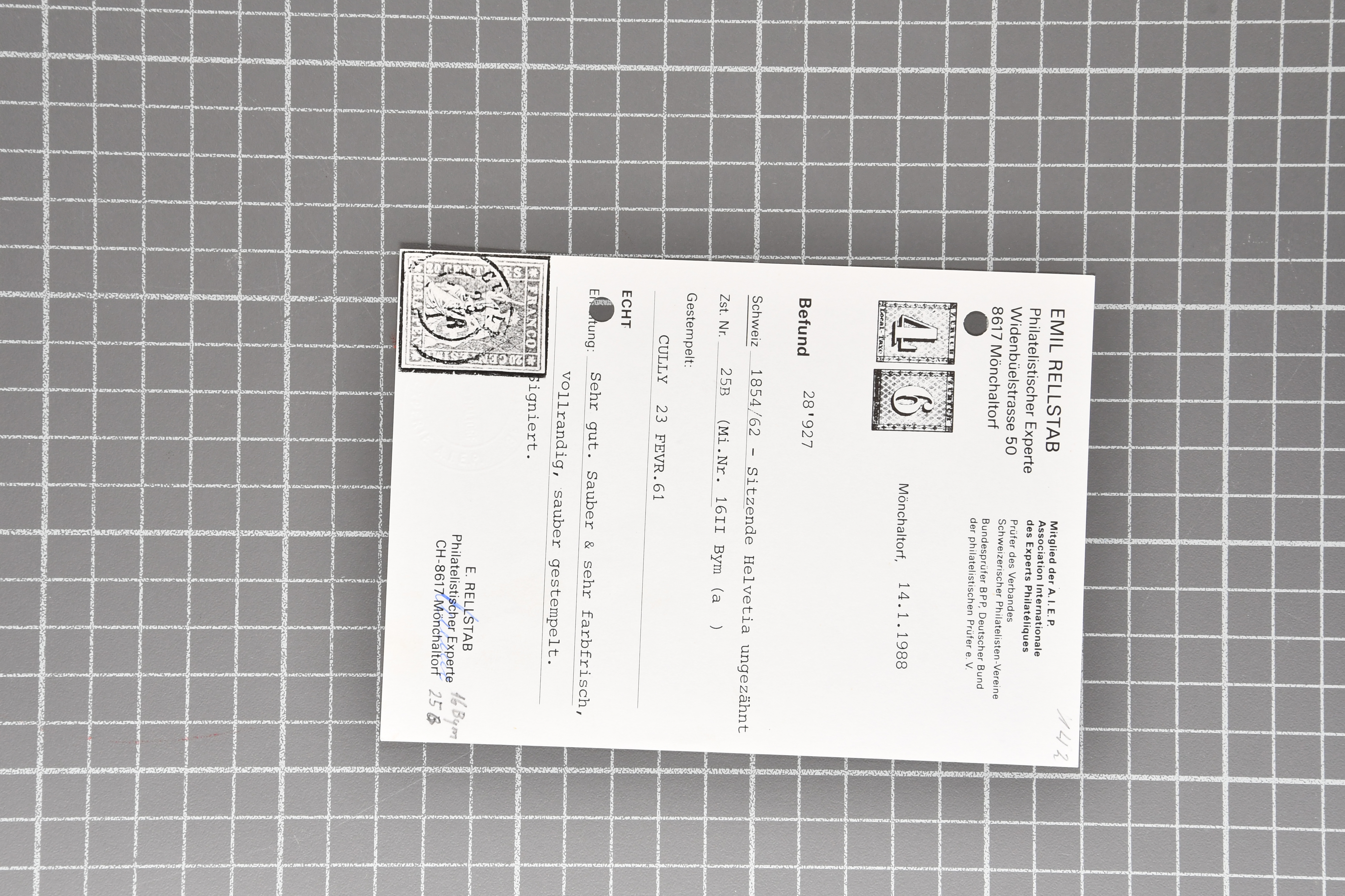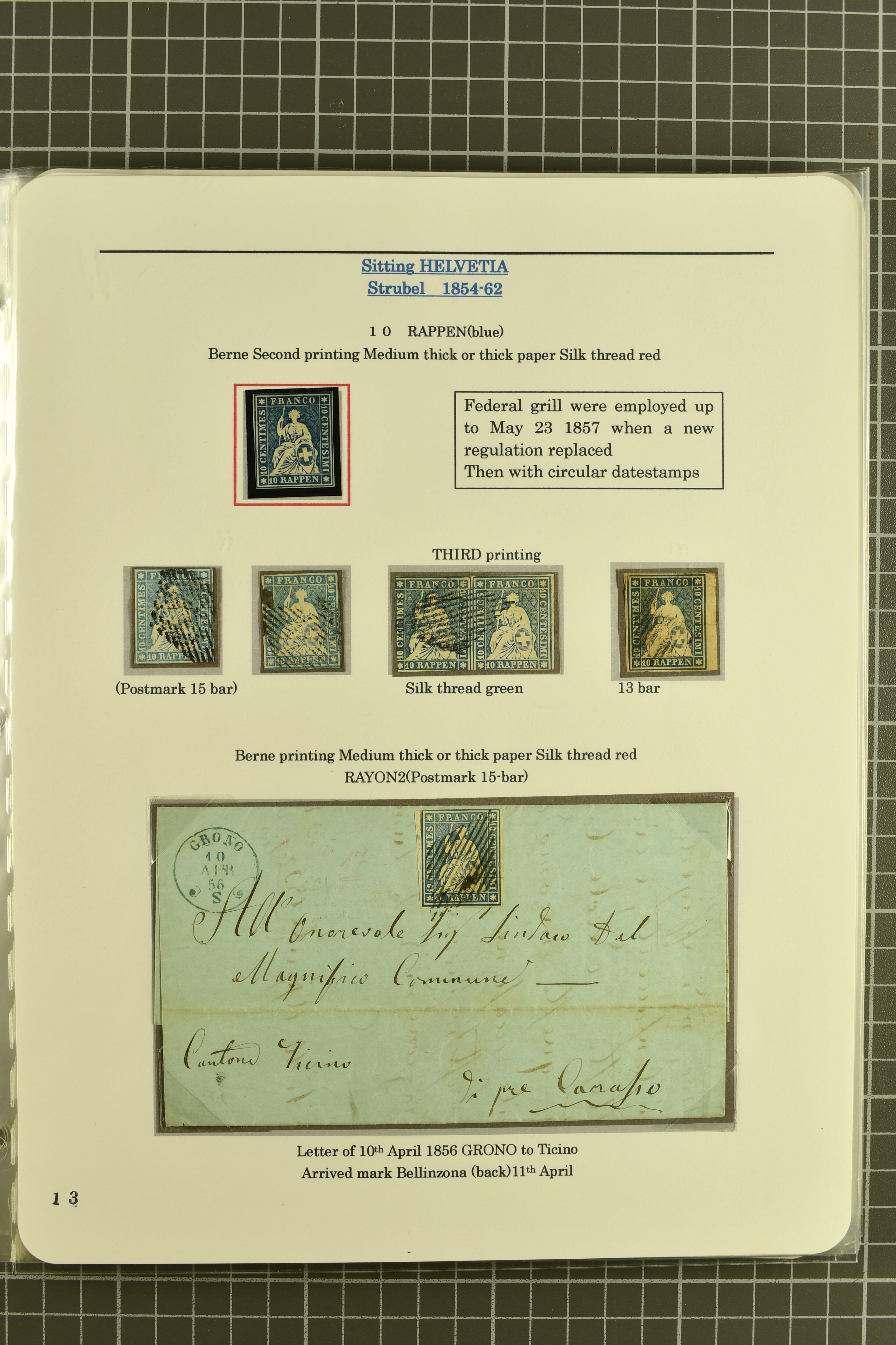 9778 image1854/62: Ziemlich spezialisierte Sammlung mit 21 Briefen und 110 ungebr./gest. Einzelwerten auf 23 Ausstellungsblättern. Dabei elf ungebr. Werte inkl. 5 Rp. braun (SBK 22A), 20 Rp. gelblichorange (SBK 25G), 40 Rp. olivgrün (2, SBK 26G) und 1 Fr. grau (SBK 27D), bessere gest. Werte wie neun Exemplare der 2 Rp. grau (SBK 21G), drei Exemplare 1 Fr. grau mit schwarzem Seidenfaden (SBK 27C) und sechs mit gelbem Seidenfaden (SBK 27D) sowie interessante Frankaturen wie 2 Rp. grau, ideal klar und übergehend entw. mit kl. Zweikreisstp. "WEISSENBURG 1 NOV. 62" auf frischer Trauer-Drucksache nach Aeschi bei Spiez, 5 Rp. braun (SBK 22G), diagonal halbiert als sog. "Genfer Provisorium" auf Briefstück, 15 Rp. karminrot (SBK 24A) entw. mit seltener 10-liniger Raute von Triengen (AW 55) in schwarz auf Nachnahme-Faltbrieflein im Ort, 20 Rp. gelblichorange (SBK 25B) auf Faltbrieflein im Grenzrayon von Genf nach Bonneville, Savoyen (Sardinien) sowie auf Nachnahme von Langenthal nach Dagmersellen mit nebenges. Schreibschriftspt. "Gondiswil" oder 40 Rp. grünlicholiv (SBK 26C) im waagr. Paar auf sauberem Faltbrief von Schaffhausen nach Leipzig, Sachsen. Unterschiedliche Erhaltung; vier Befunde. SBK=CHF 30'000+ (Image 1) (Image 2) (Image 3) (Image 4) (Image 5) (Image 6) (Image 7) (Image 8) (Image 9) (Image 10) (Image 11) (Image 12) (Image 13) (Image 14) (Image 15) (Image 16) (Image 17) (Image 18) (Image 19) (Image 20) (Image 21) (Image 22) (Image 23) (Image 24) (Image 25) (Image 26)