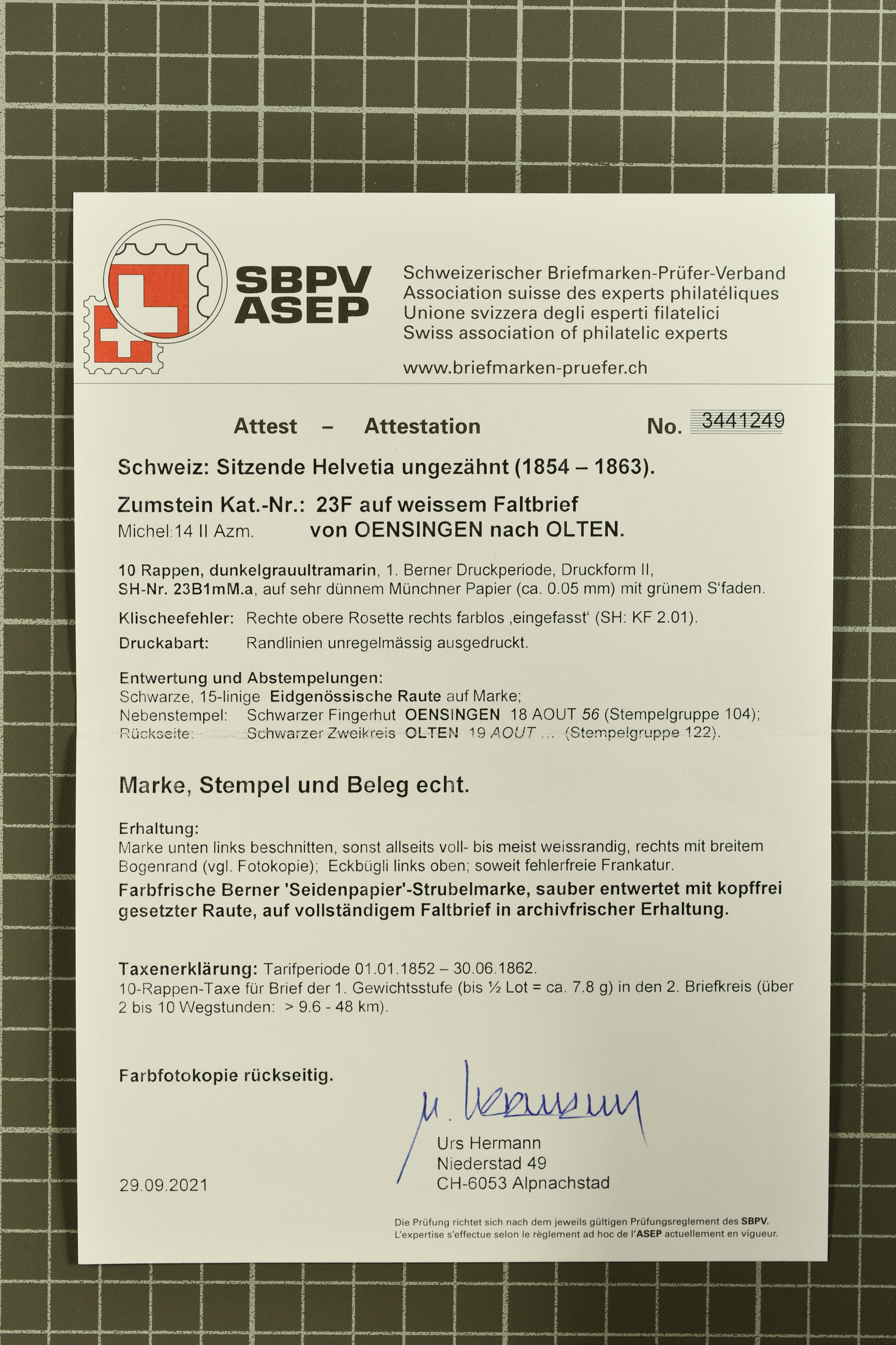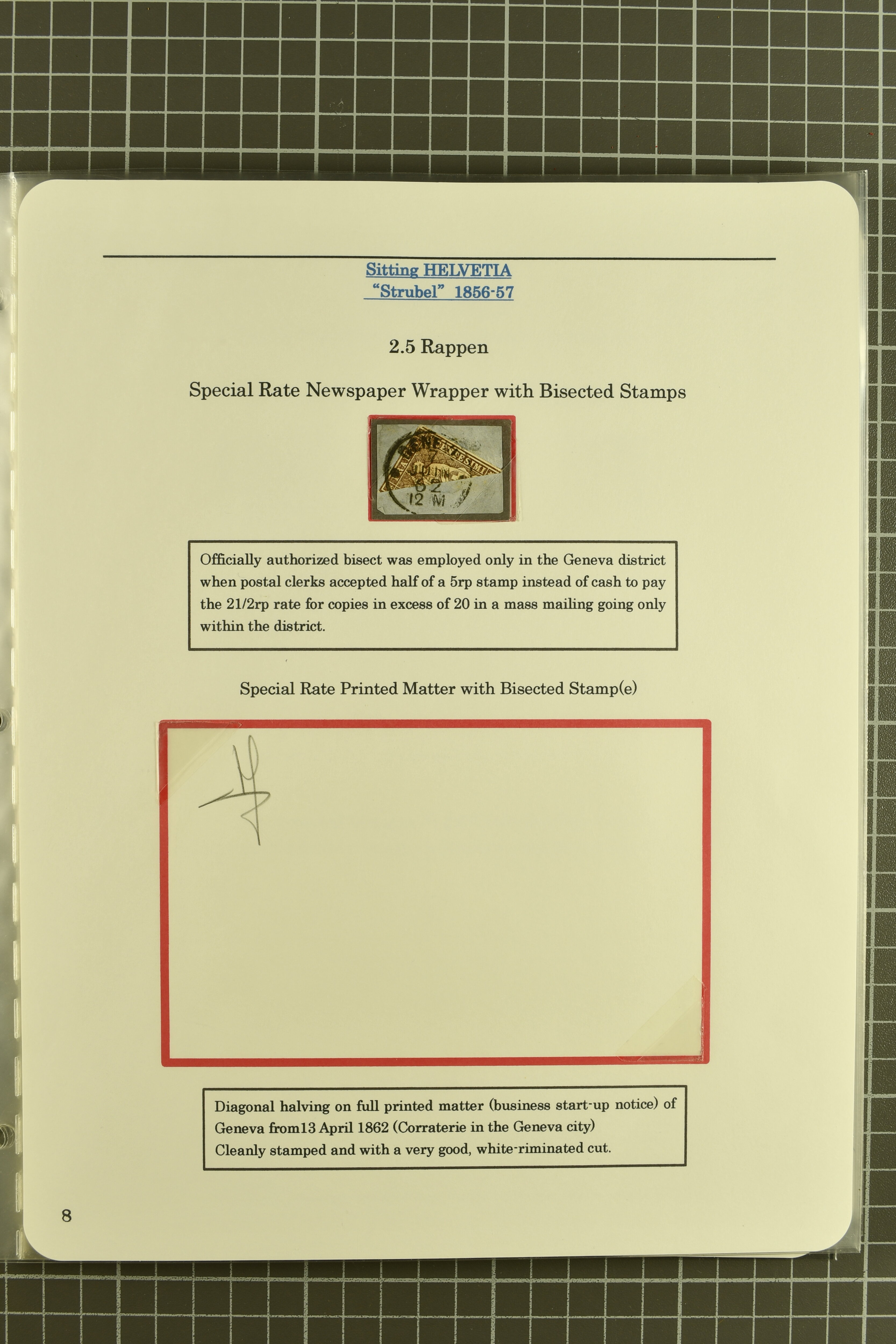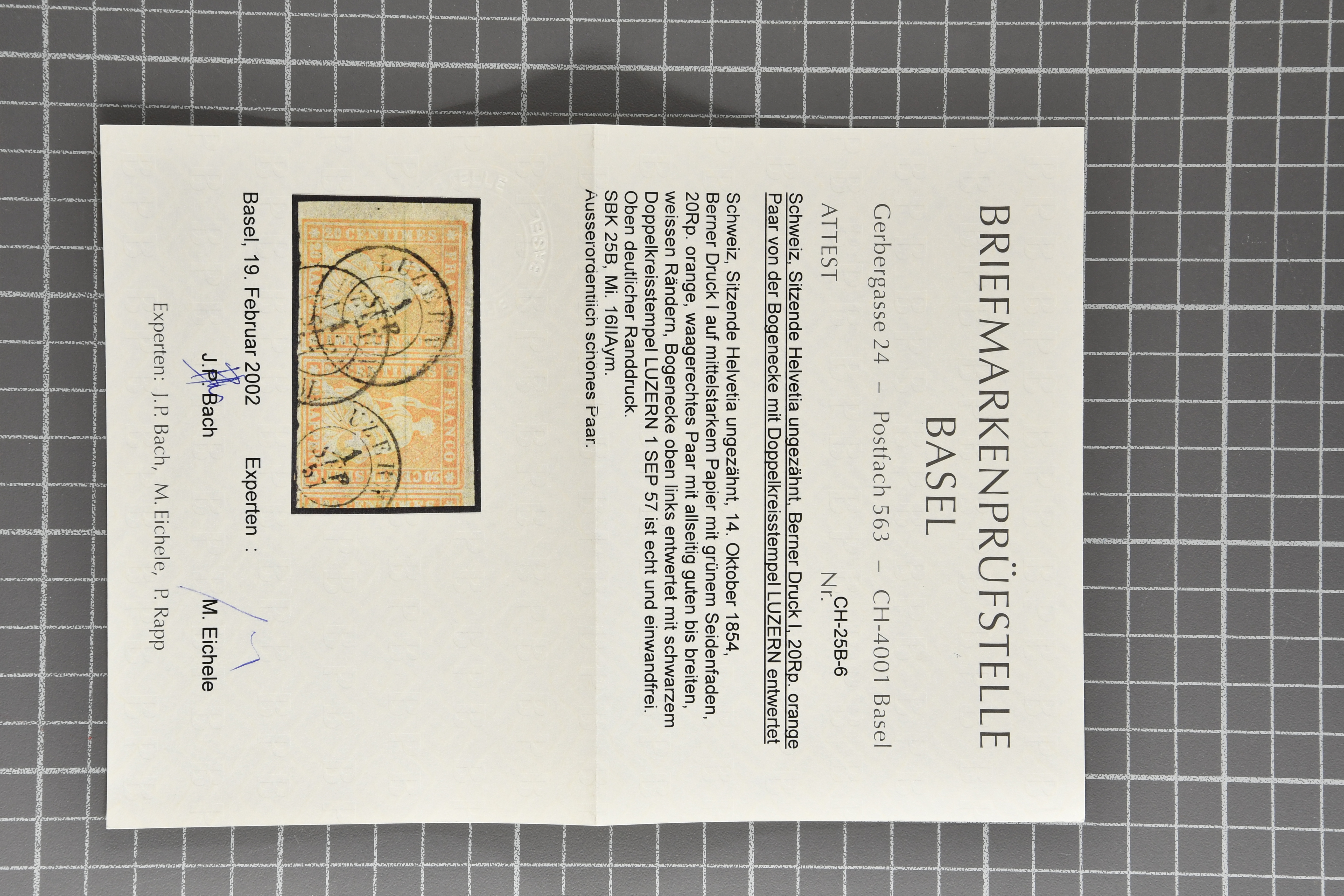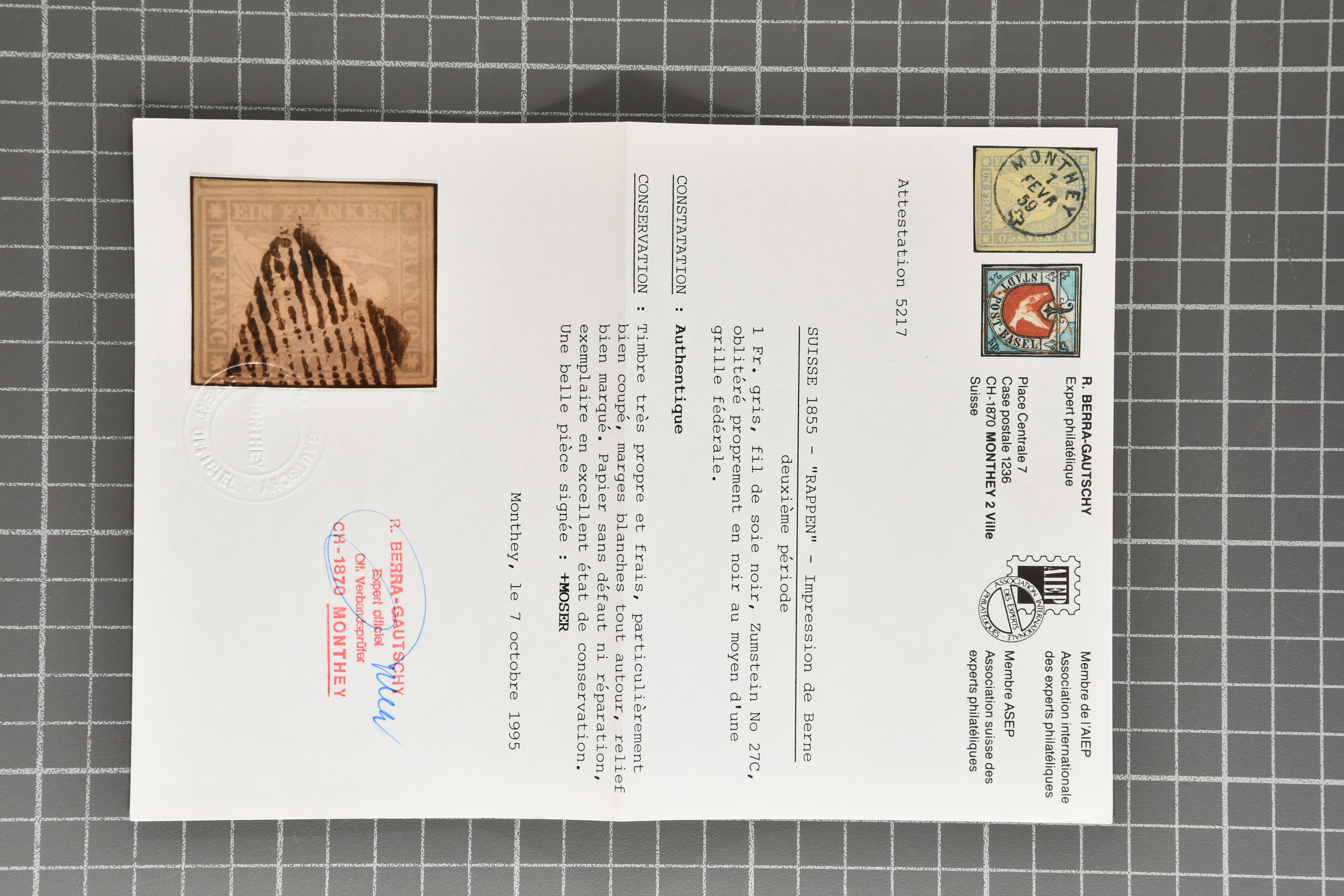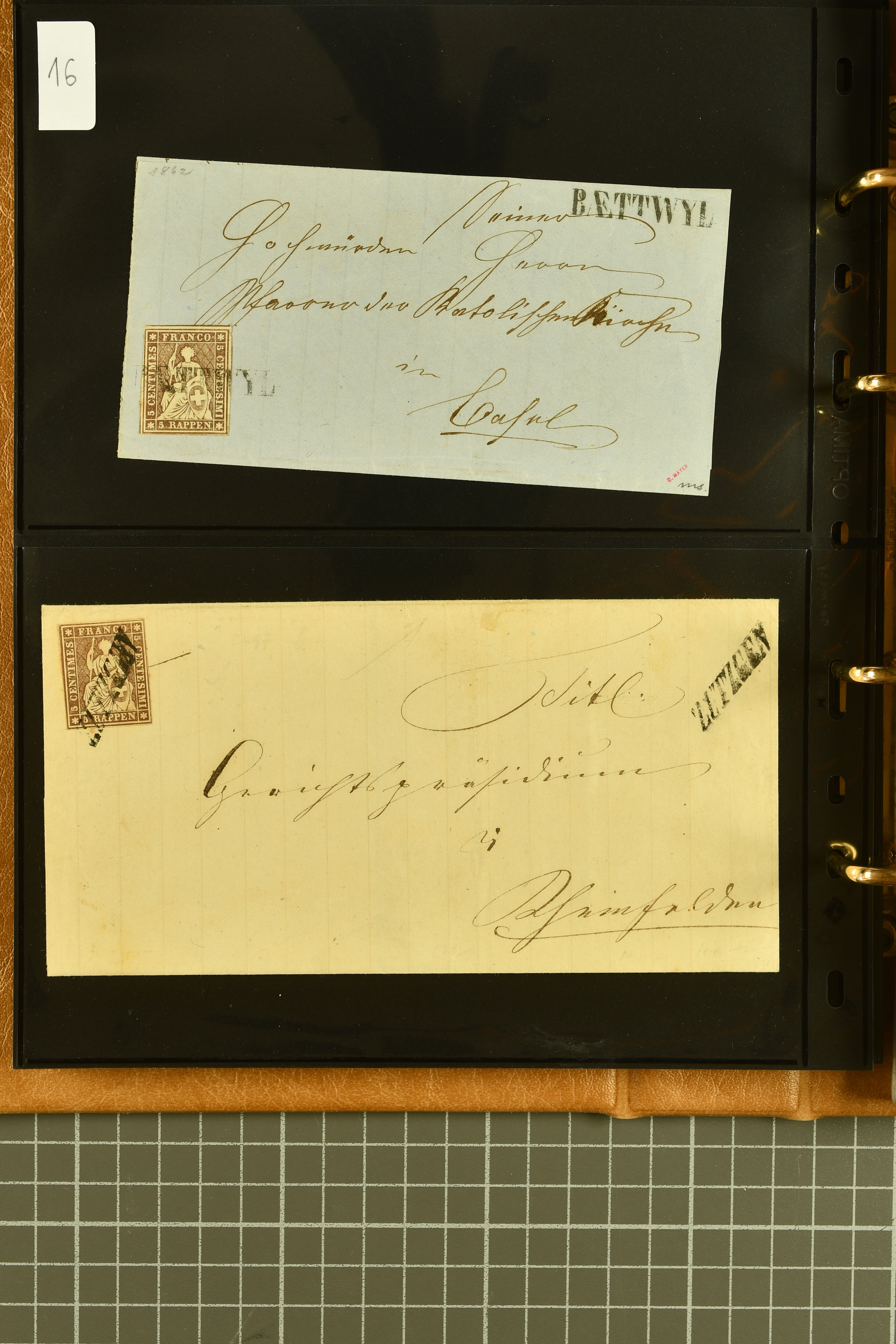 9778 image1854/62: Ziemlich spezialisierte Sammlung mit 21 Briefen und 110 ungebr./gest. Einzelwerten auf 23 Ausstellungsblättern. Dabei elf ungebr. Werte inkl. 5 Rp. braun (SBK 22A), 20 Rp. gelblichorange (SBK 25G), 40 Rp. olivgrün (2, SBK 26G) und 1 Fr. grau (SBK 27D), bessere gest. Werte wie neun Exemplare der 2 Rp. grau (SBK 21G), drei Exemplare 1 Fr. grau mit schwarzem Seidenfaden (SBK 27C) und sechs mit gelbem Seidenfaden (SBK 27D) sowie interessante Frankaturen wie 2 Rp. grau, ideal klar und übergehend entw. mit kl. Zweikreisstp. "WEISSENBURG 1 NOV. 62" auf frischer Trauer-Drucksache nach Aeschi bei Spiez, 5 Rp. braun (SBK 22G), diagonal halbiert als sog. "Genfer Provisorium" auf Briefstück, 15 Rp. karminrot (SBK 24A) entw. mit seltener 10-liniger Raute von Triengen (AW 55) in schwarz auf Nachnahme-Faltbrieflein im Ort, 20 Rp. gelblichorange (SBK 25B) auf Faltbrieflein im Grenzrayon von Genf nach Bonneville, Savoyen (Sardinien) sowie auf Nachnahme von Langenthal nach Dagmersellen mit nebenges. Schreibschriftspt. "Gondiswil" oder 40 Rp. grünlicholiv (SBK 26C) im waagr. Paar auf sauberem Faltbrief von Schaffhausen nach Leipzig, Sachsen. Unterschiedliche Erhaltung; vier Befunde. SBK=CHF 30'000+ (Image 1) (Image 2) (Image 3) (Image 4) (Image 5) (Image 6) (Image 7) (Image 8) (Image 9) (Image 10) (Image 11) (Image 12) (Image 13) (Image 14) (Image 15) (Image 16) (Image 17) (Image 18) (Image 19) (Image 20) (Image 21) (Image 22) (Image 23) (Image 24) (Image 25) (Image 26)