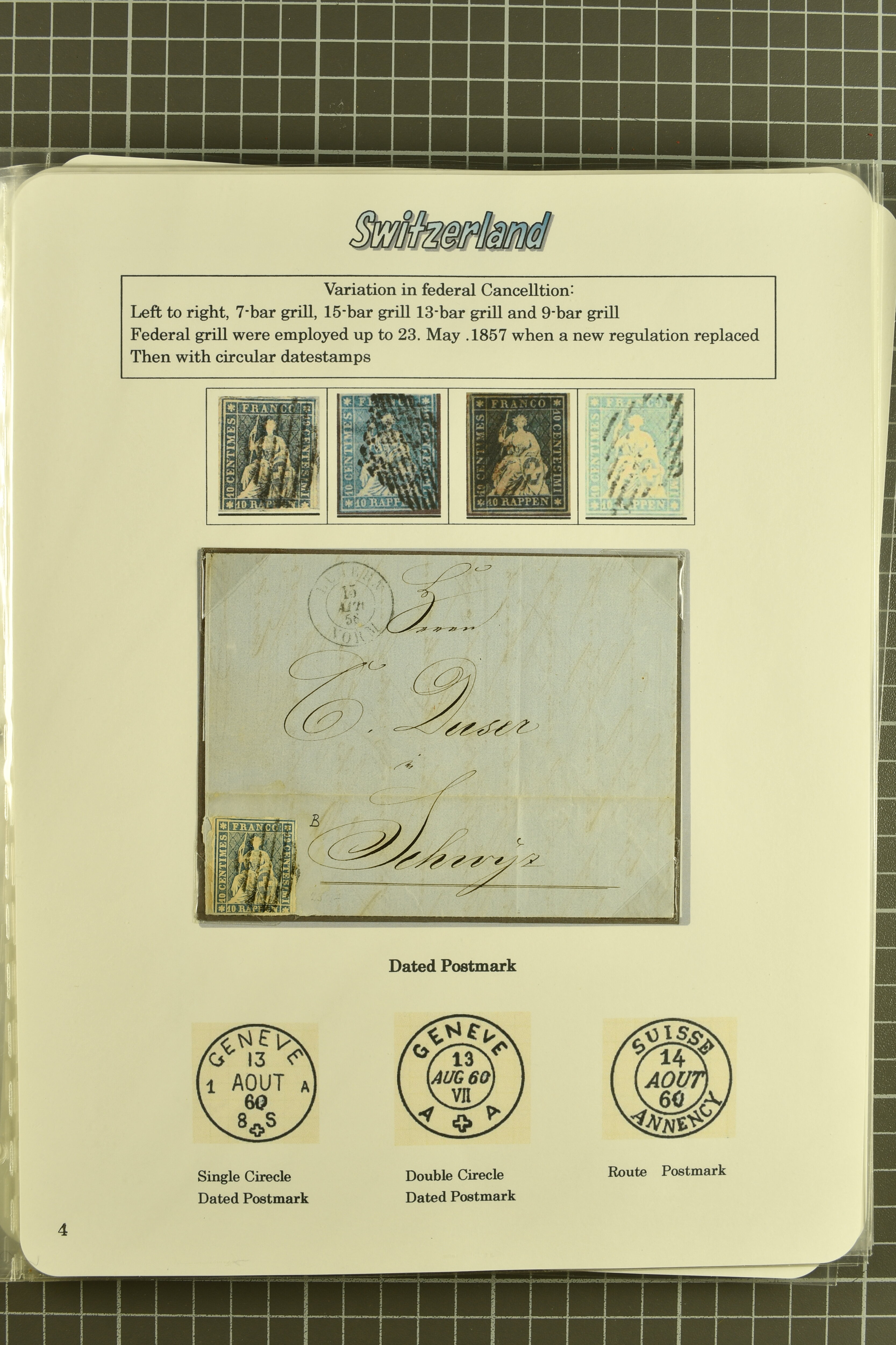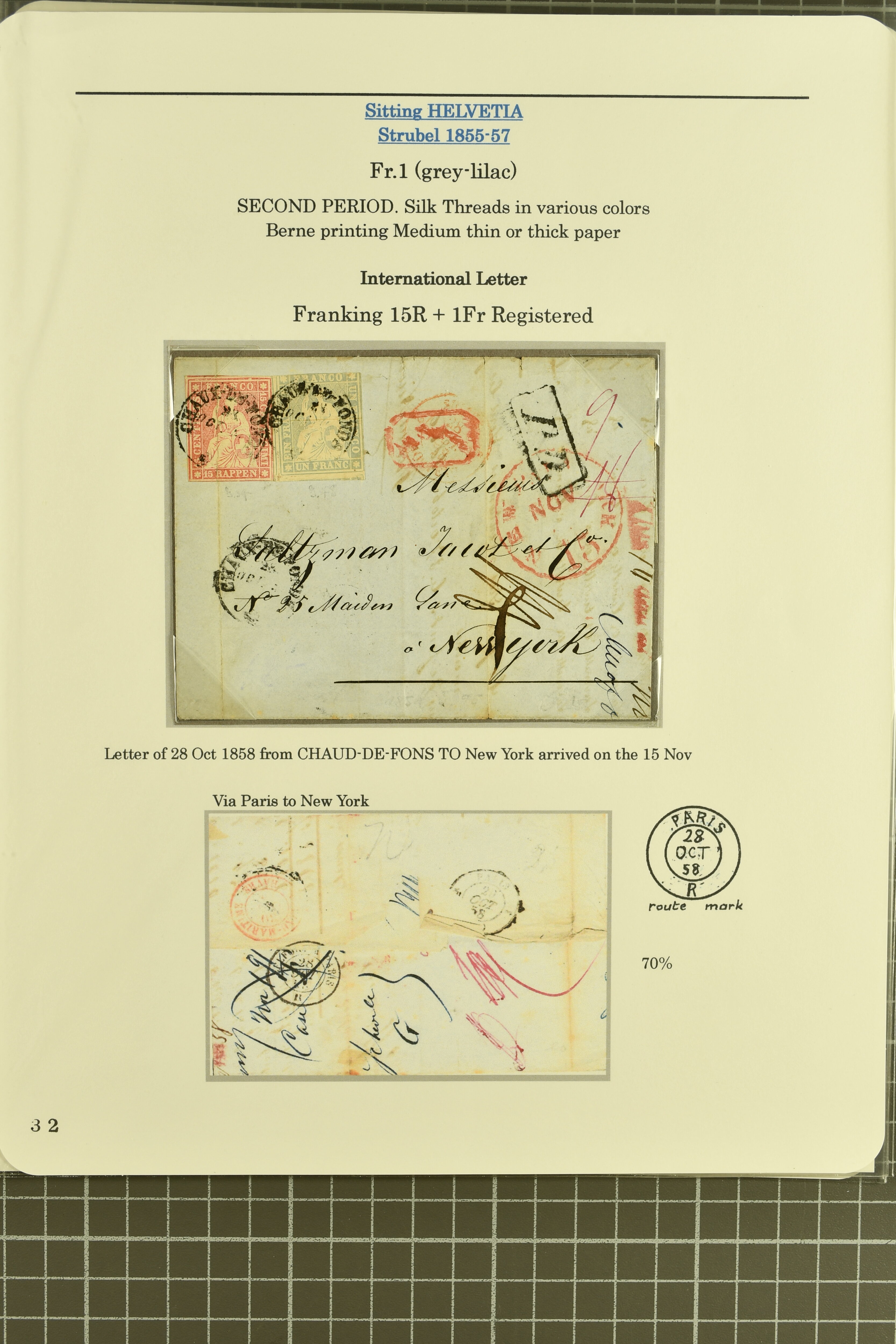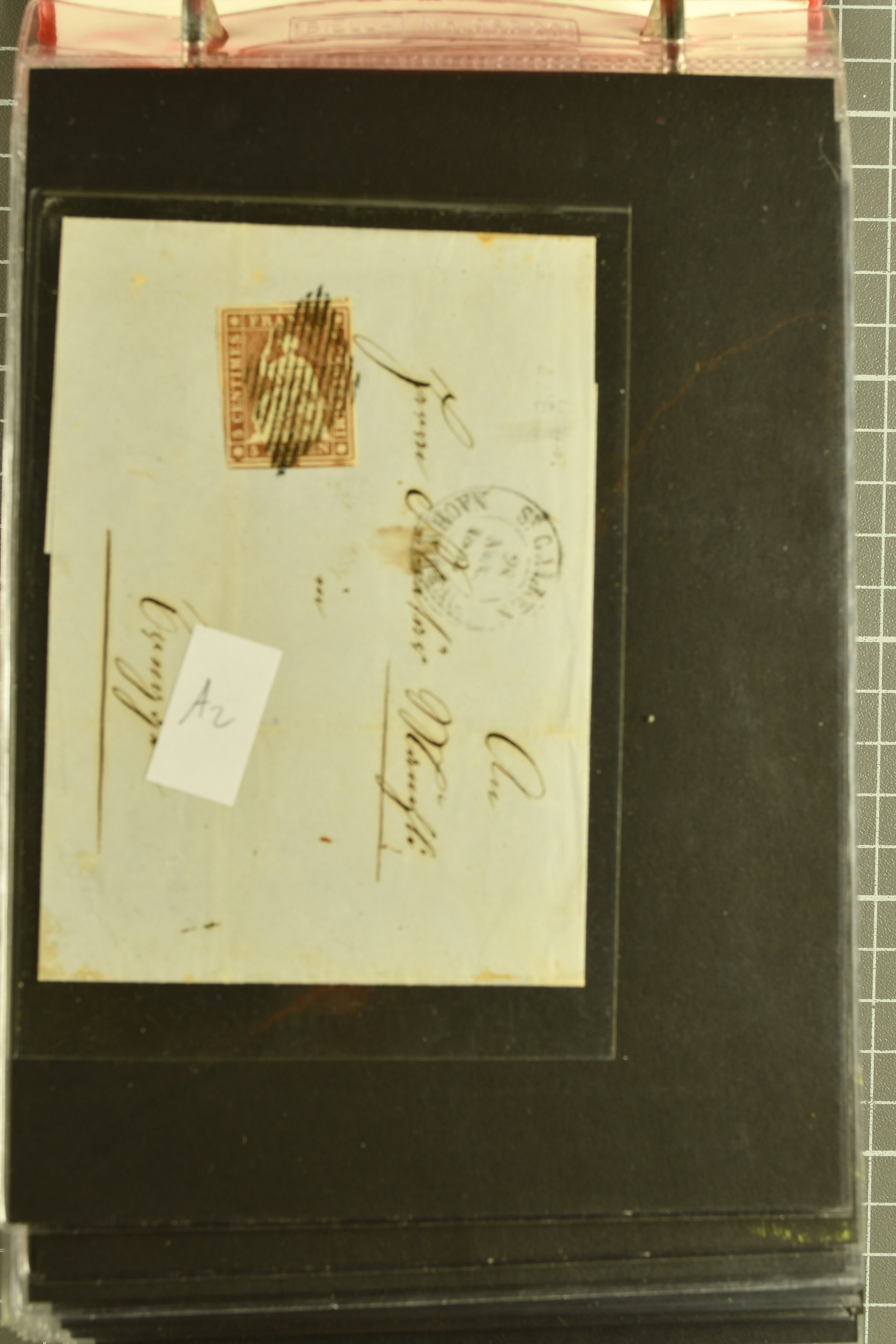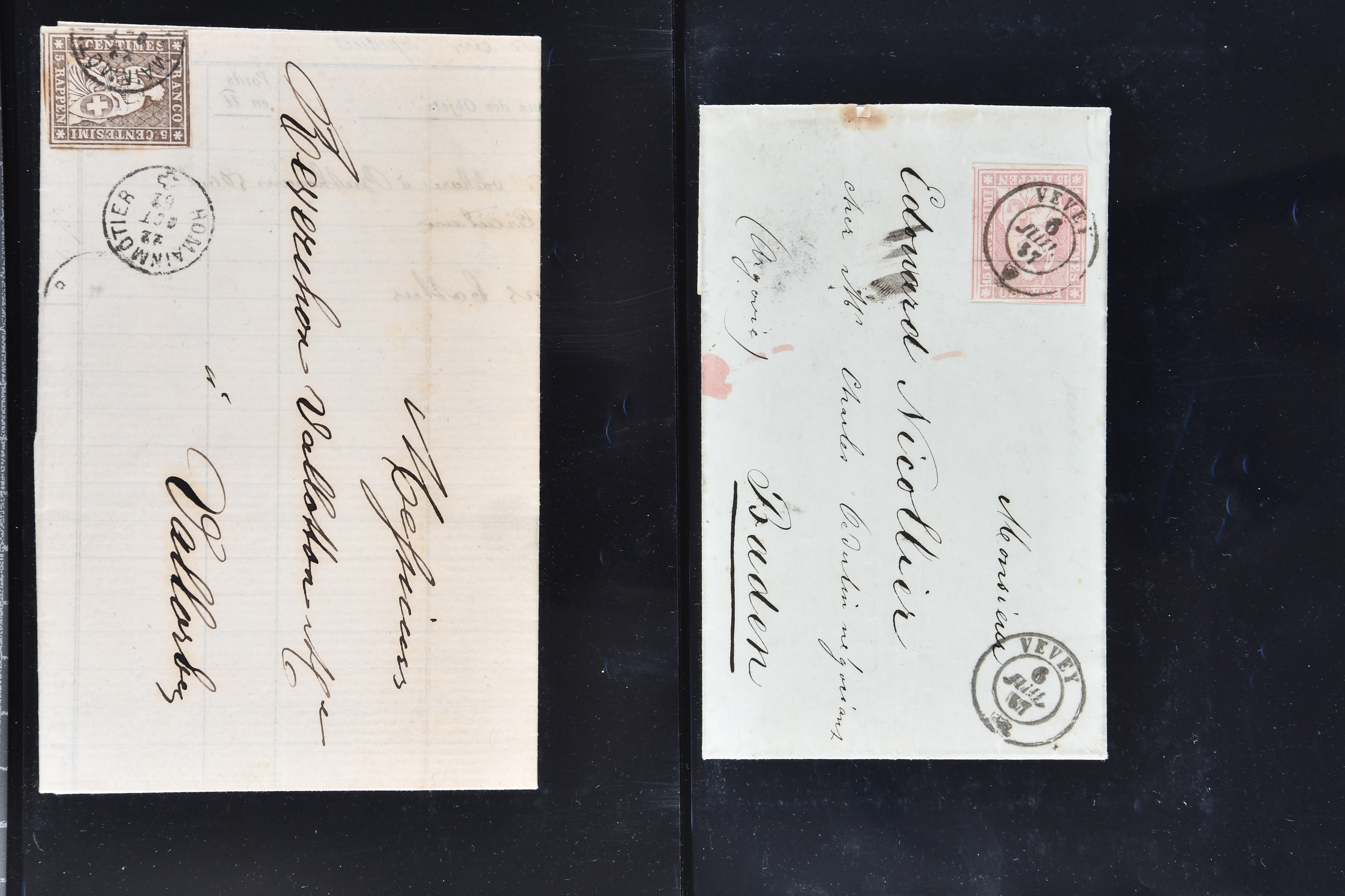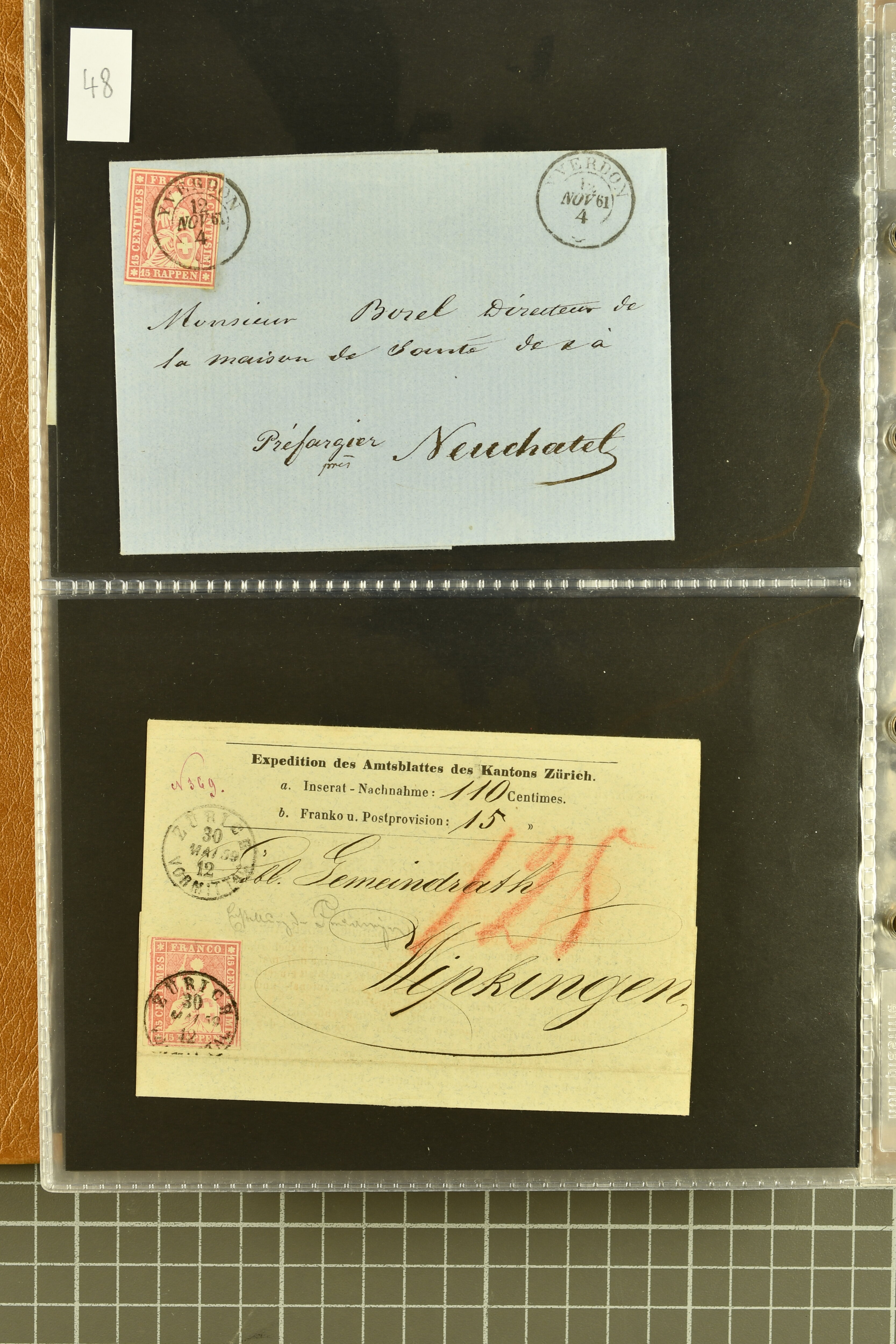 9778 image1854/62: Ziemlich spezialisierte Sammlung mit 21 Briefen und 110 ungebr./gest. Einzelwerten auf 23 Ausstellungsblättern. Dabei elf ungebr. Werte inkl. 5 Rp. braun (SBK 22A), 20 Rp. gelblichorange (SBK 25G), 40 Rp. olivgrün (2, SBK 26G) und 1 Fr. grau (SBK 27D), bessere gest. Werte wie neun Exemplare der 2 Rp. grau (SBK 21G), drei Exemplare 1 Fr. grau mit schwarzem Seidenfaden (SBK 27C) und sechs mit gelbem Seidenfaden (SBK 27D) sowie interessante Frankaturen wie 2 Rp. grau, ideal klar und übergehend entw. mit kl. Zweikreisstp. "WEISSENBURG 1 NOV. 62" auf frischer Trauer-Drucksache nach Aeschi bei Spiez, 5 Rp. braun (SBK 22G), diagonal halbiert als sog. "Genfer Provisorium" auf Briefstück, 15 Rp. karminrot (SBK 24A) entw. mit seltener 10-liniger Raute von Triengen (AW 55) in schwarz auf Nachnahme-Faltbrieflein im Ort, 20 Rp. gelblichorange (SBK 25B) auf Faltbrieflein im Grenzrayon von Genf nach Bonneville, Savoyen (Sardinien) sowie auf Nachnahme von Langenthal nach Dagmersellen mit nebenges. Schreibschriftspt. "Gondiswil" oder 40 Rp. grünlicholiv (SBK 26C) im waagr. Paar auf sauberem Faltbrief von Schaffhausen nach Leipzig, Sachsen. Unterschiedliche Erhaltung; vier Befunde. SBK=CHF 30'000+ (Image 1) (Image 2) (Image 3) (Image 4) (Image 5) (Image 6) (Image 7) (Image 8) (Image 9) (Image 10) (Image 11) (Image 12) (Image 13) (Image 14) (Image 15) (Image 16) (Image 17) (Image 18) (Image 19) (Image 20) (Image 21) (Image 22) (Image 23) (Image 24) (Image 25) (Image 26)