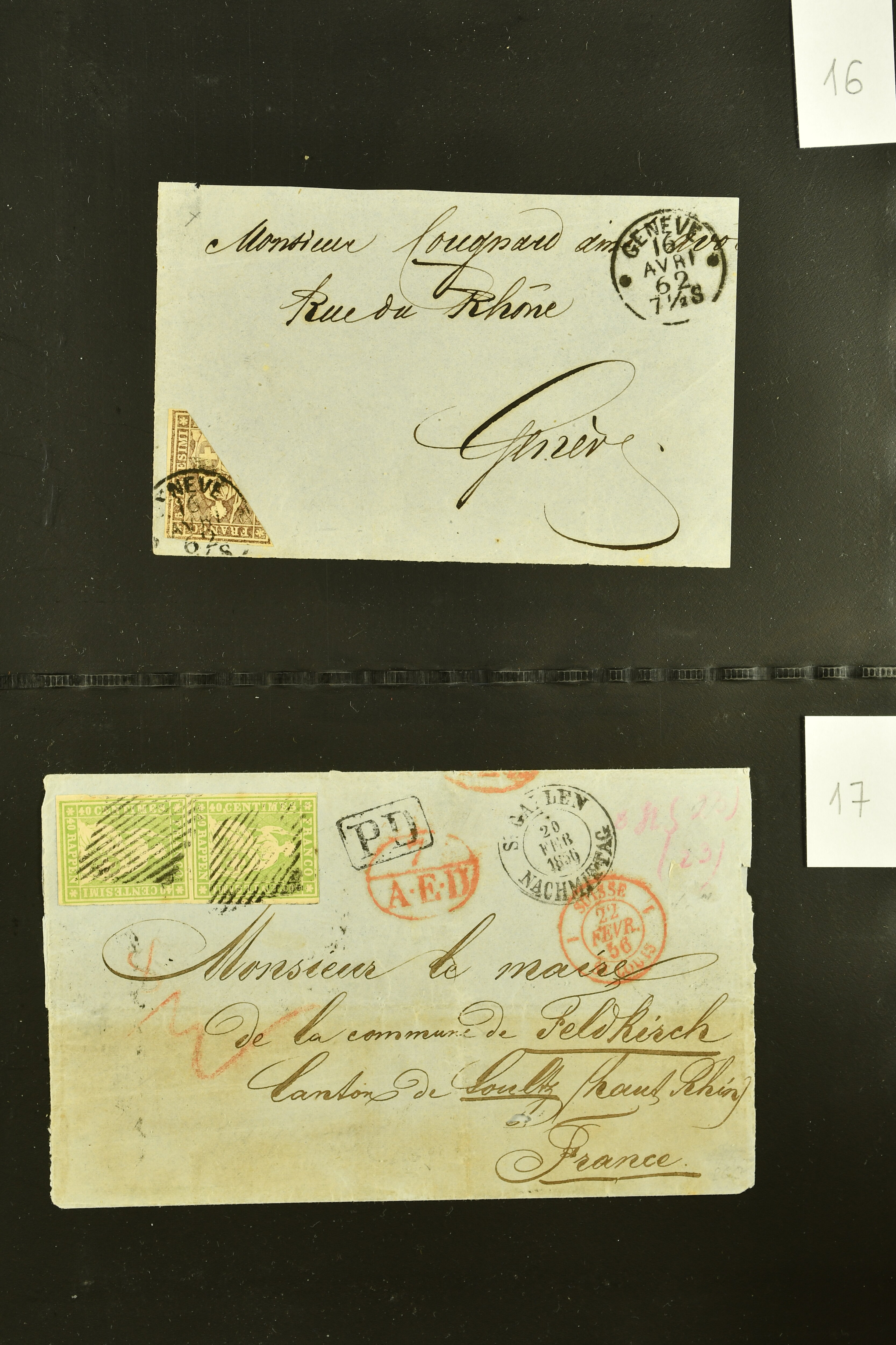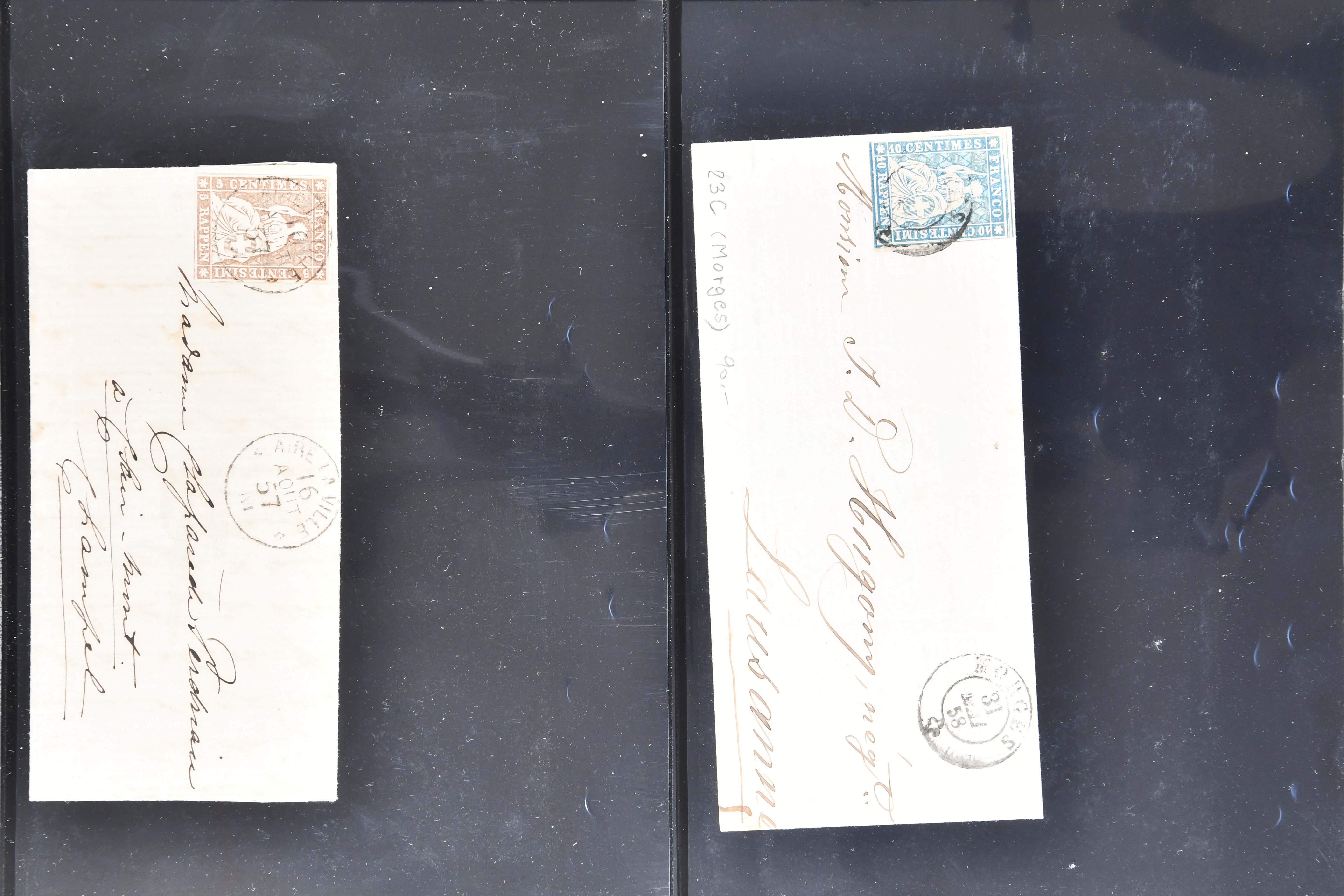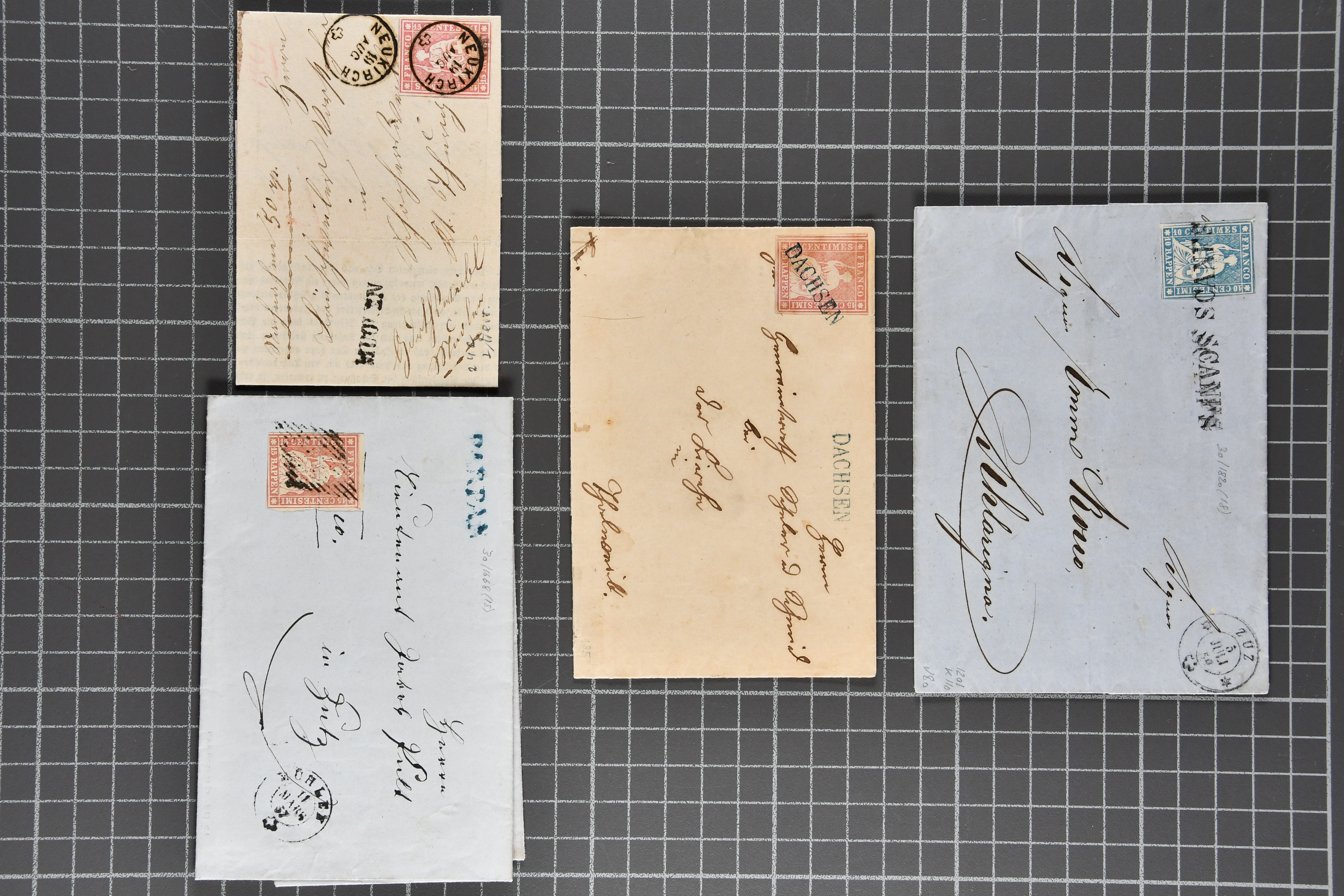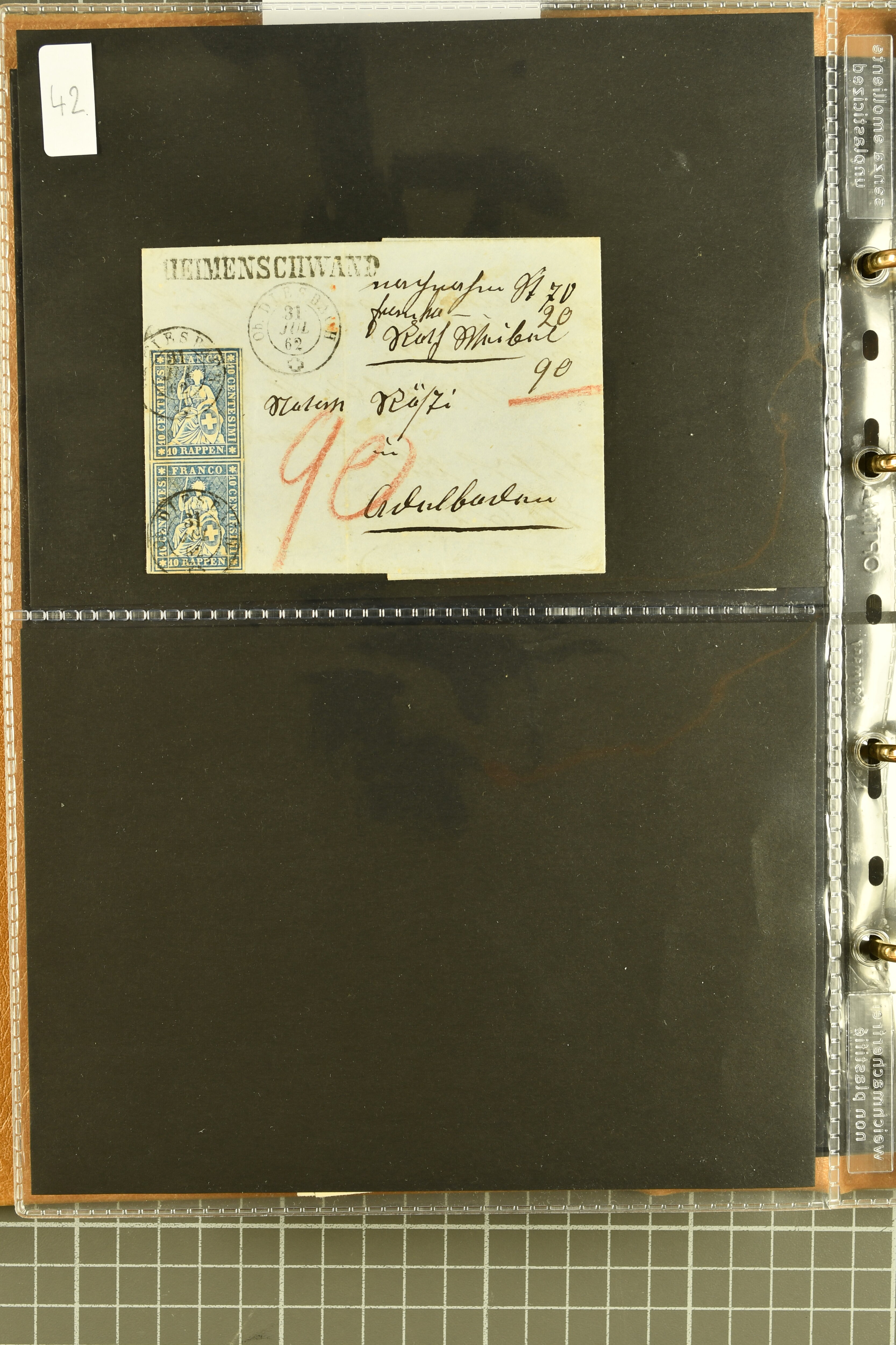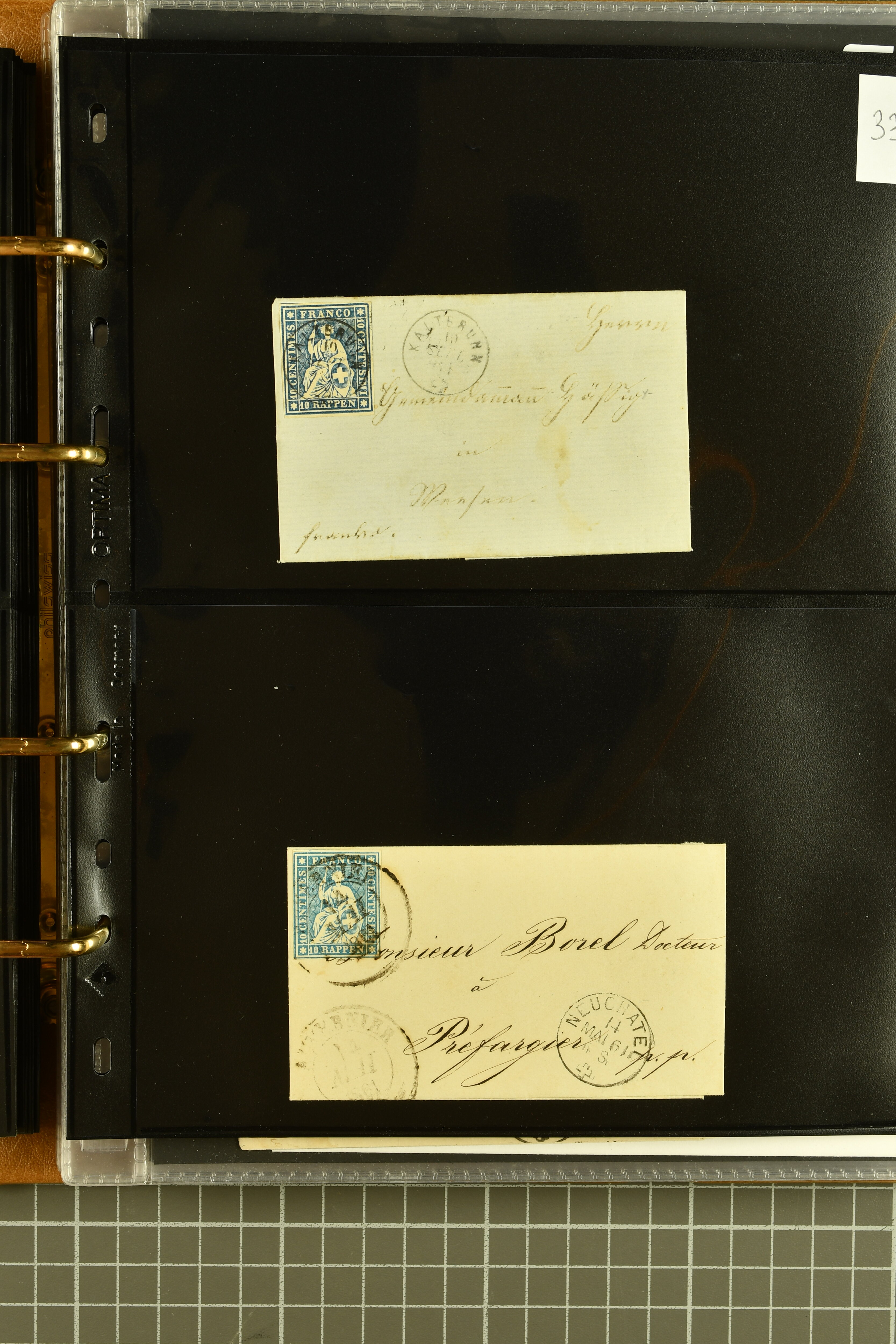 9778 image1854/62: Ziemlich spezialisierte Sammlung mit 21 Briefen und 110 ungebr./gest. Einzelwerten auf 23 Ausstellungsblättern. Dabei elf ungebr. Werte inkl. 5 Rp. braun (SBK 22A), 20 Rp. gelblichorange (SBK 25G), 40 Rp. olivgrün (2, SBK 26G) und 1 Fr. grau (SBK 27D), bessere gest. Werte wie neun Exemplare der 2 Rp. grau (SBK 21G), drei Exemplare 1 Fr. grau mit schwarzem Seidenfaden (SBK 27C) und sechs mit gelbem Seidenfaden (SBK 27D) sowie interessante Frankaturen wie 2 Rp. grau, ideal klar und übergehend entw. mit kl. Zweikreisstp. "WEISSENBURG 1 NOV. 62" auf frischer Trauer-Drucksache nach Aeschi bei Spiez, 5 Rp. braun (SBK 22G), diagonal halbiert als sog. "Genfer Provisorium" auf Briefstück, 15 Rp. karminrot (SBK 24A) entw. mit seltener 10-liniger Raute von Triengen (AW 55) in schwarz auf Nachnahme-Faltbrieflein im Ort, 20 Rp. gelblichorange (SBK 25B) auf Faltbrieflein im Grenzrayon von Genf nach Bonneville, Savoyen (Sardinien) sowie auf Nachnahme von Langenthal nach Dagmersellen mit nebenges. Schreibschriftspt. "Gondiswil" oder 40 Rp. grünlicholiv (SBK 26C) im waagr. Paar auf sauberem Faltbrief von Schaffhausen nach Leipzig, Sachsen. Unterschiedliche Erhaltung; vier Befunde. SBK=CHF 30'000+ (Image 1) (Image 2) (Image 3) (Image 4) (Image 5) (Image 6) (Image 7) (Image 8) (Image 9) (Image 10) (Image 11) (Image 12) (Image 13) (Image 14) (Image 15) (Image 16) (Image 17) (Image 18) (Image 19) (Image 20) (Image 21) (Image 22) (Image 23) (Image 24) (Image 25) (Image 26)