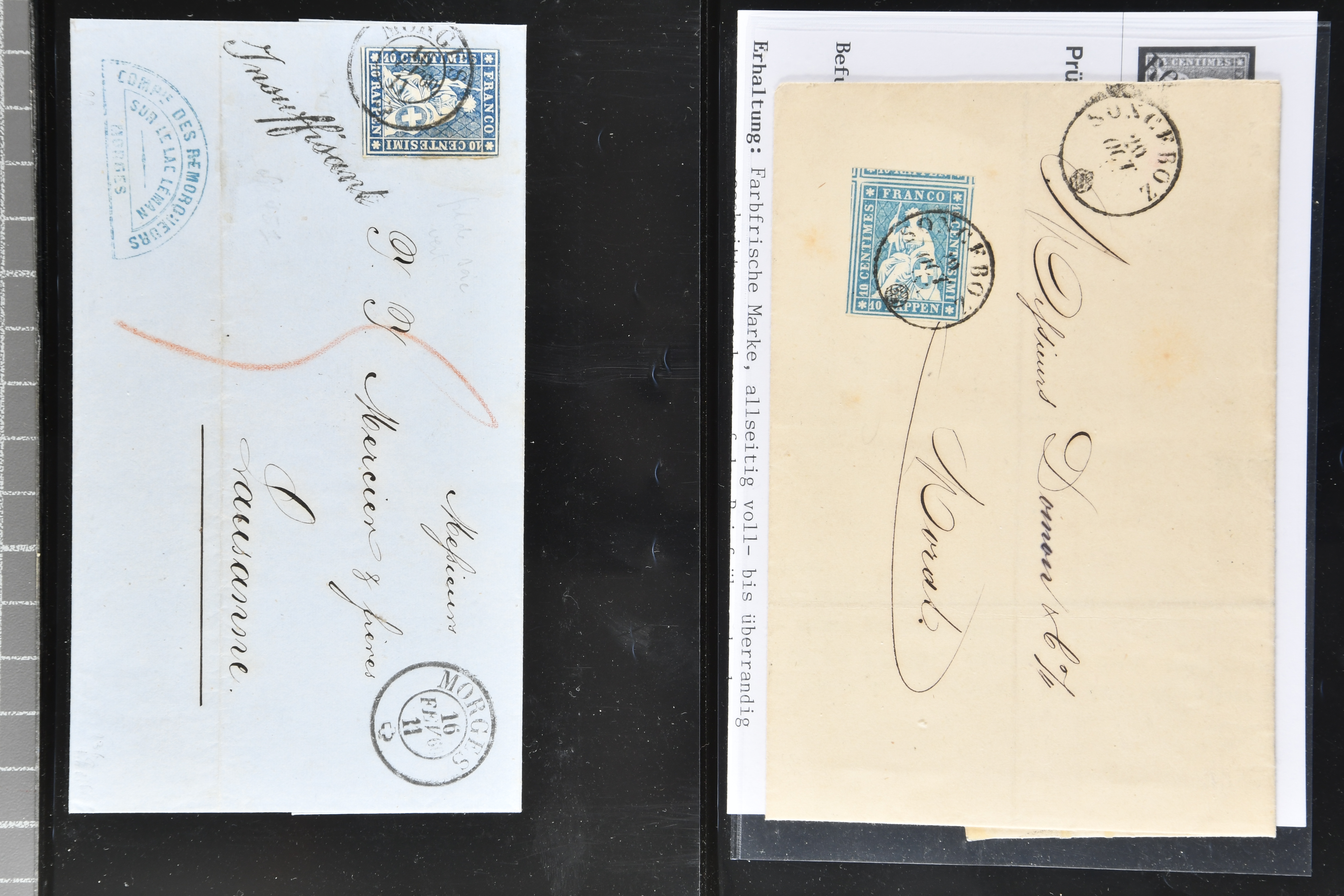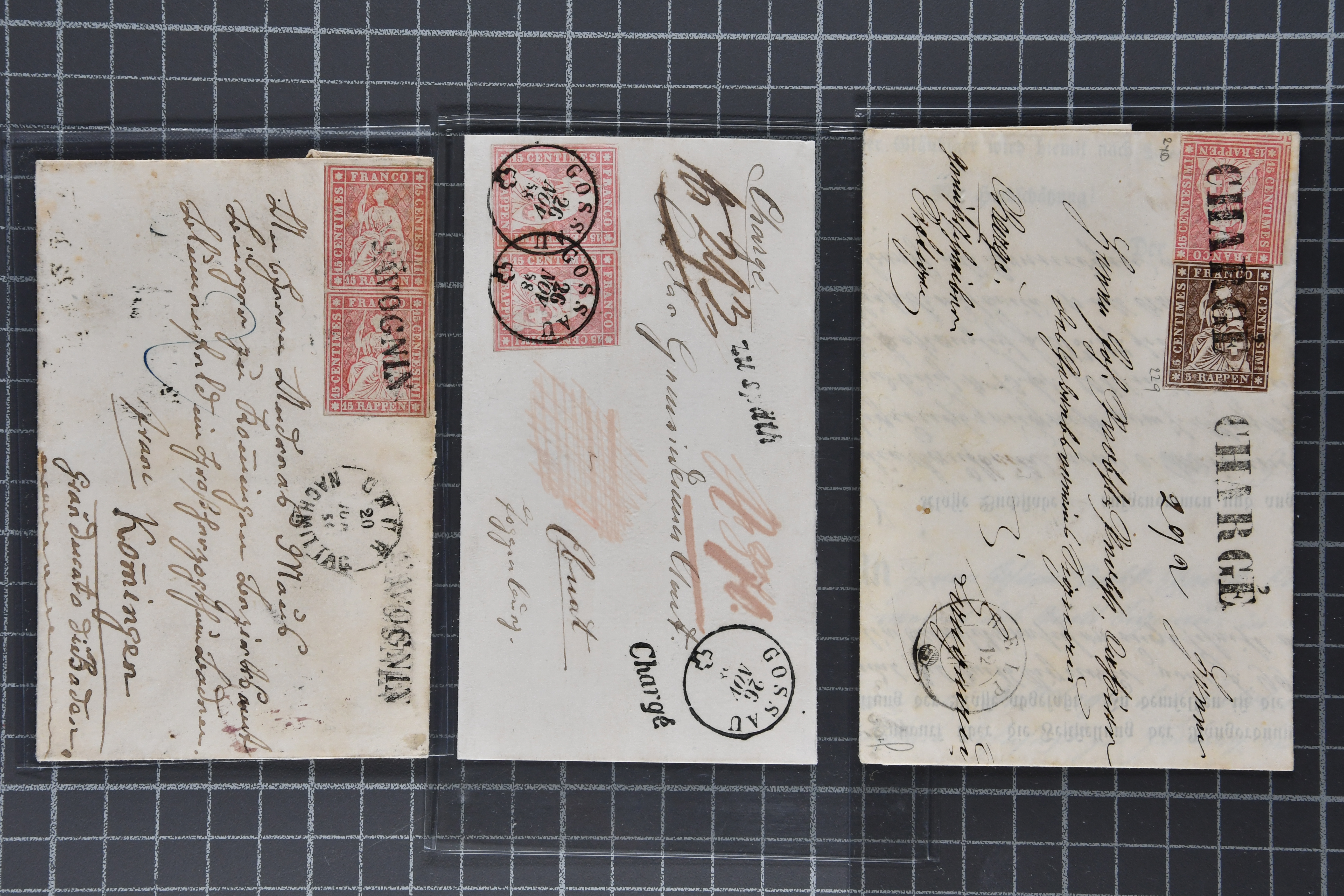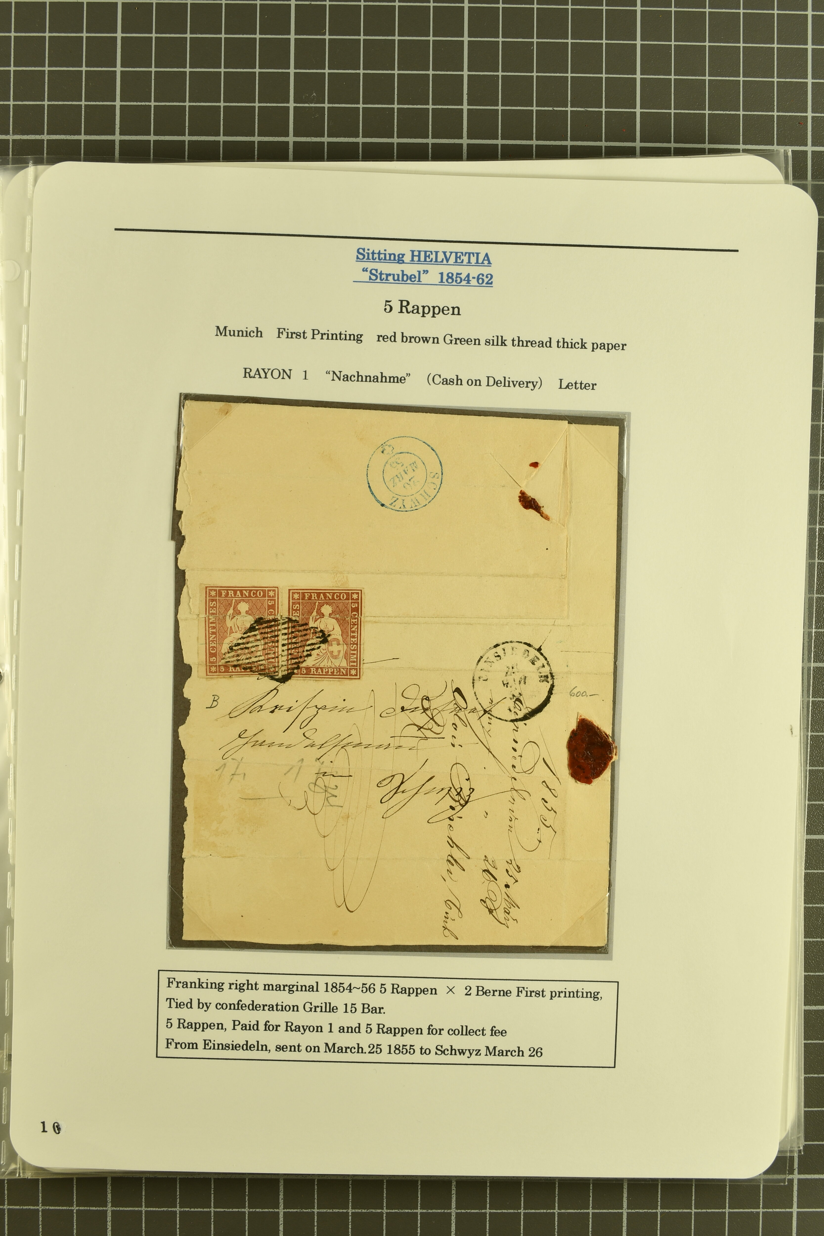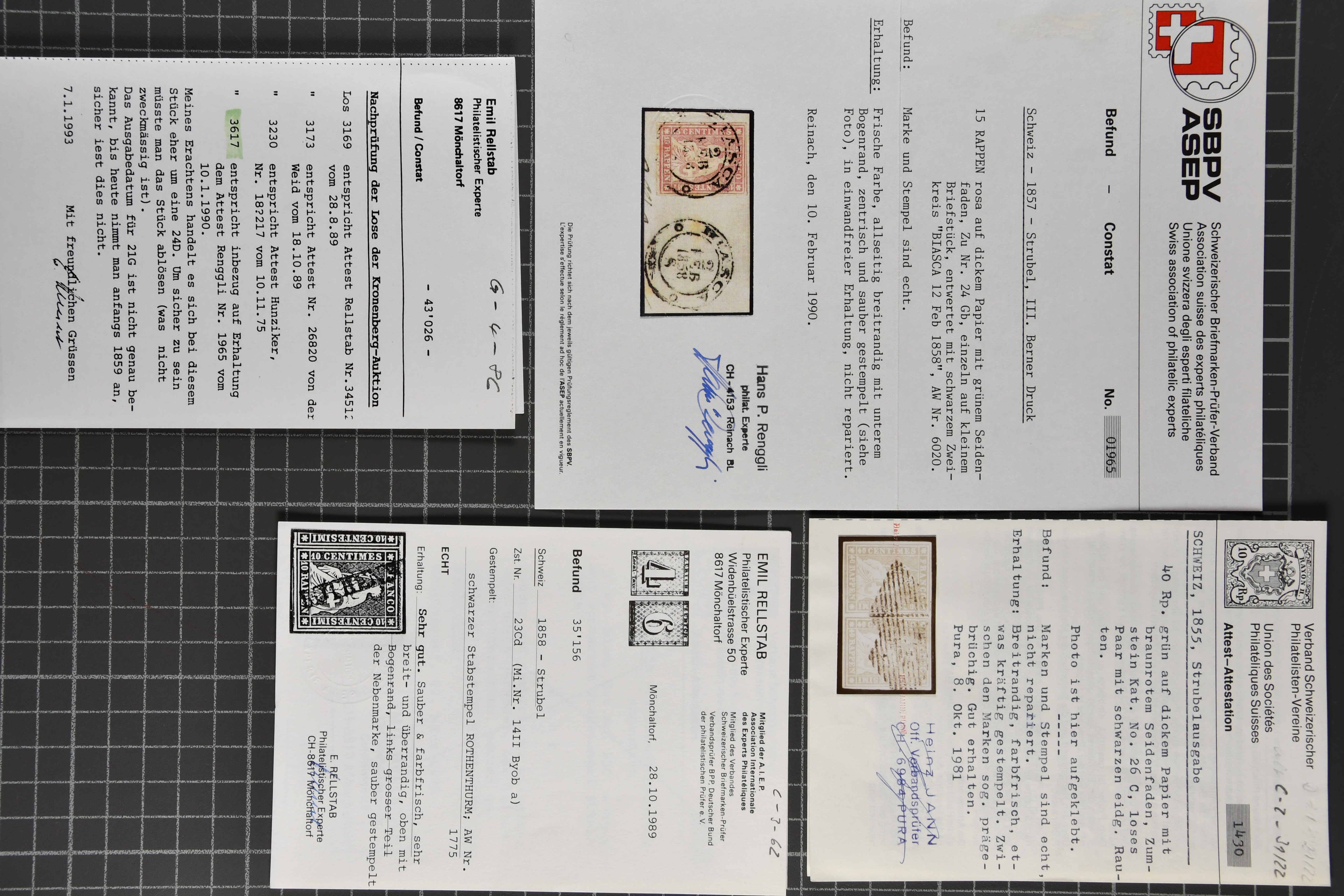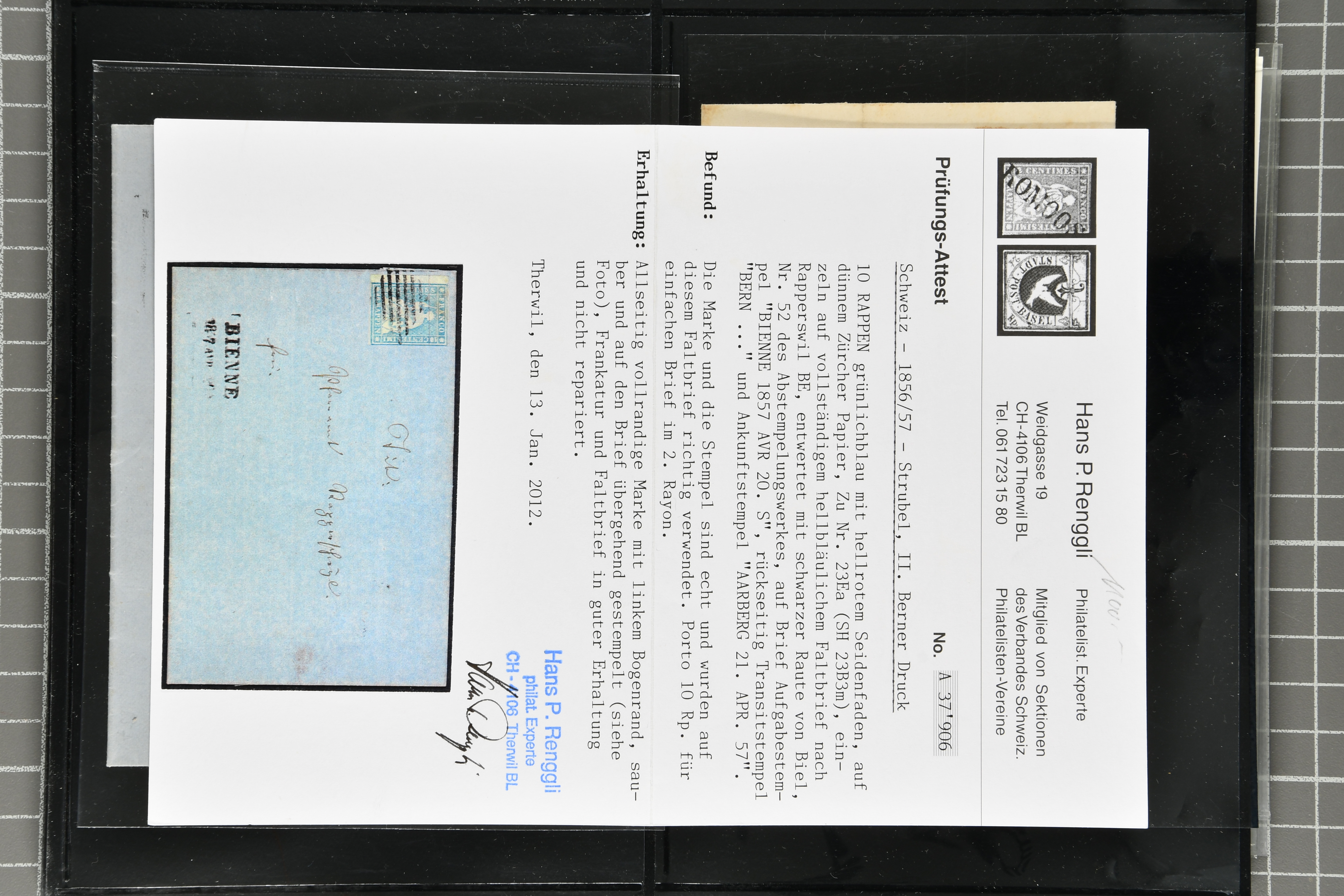 9789 cover image1854/62: Lot zehn meist hochwertige Strubelfrankaturen mit 10 Rp. hellpreussischblau (SBK 23Aa) auf Faltbrief von Andelfingen nach Winterthur, 10 Rp. dunkelpreussischblau (SBK 23A2), schön entw. mit blauer eidg. Raute auf Nachnahme-Briefteil nach Arth, 10 Rp. bräunlichrot (SBK 24Aa), zwei Einzelwerte zus. klar entw. mit blauer eidg. Raute mit nebenges. Stabstp. "BUTTISHOLZ" und gr. Zierkreisstp. "WILLISAU 17 NOV. 1854" auf Nachnahme-Faltbrief nach Dagmersellen, 10 Rp. rotkarmin (SBK 24A) mit Schmitzdruck der oberen Randlinie und breitem Bogenrand oben, zart entw. mit blauer eidg. Raute auf Faltbrief von Hochdorf nach Bulle, 10 Rp. grünlichblau (SBK 23Ca) mit breitem Bogenrand rechts auf Faltbrieflein von Bätterkinden nach Langnau, 10 Rp. grauultramarin auf dünnem Münchner Papier (SBK 23F) mit breitem Bogenrand rechts auf Faltbrief von Oensingen nach Olten, zwei Einzelfrankaturen der 15 Rp. rötlichkarmin auf ebensolchem Papier (SBK 24F) sowie 5 Rp. braun (SBK 22G), diagonal halbiert als sog. "Genfer Provisorium" auf Drucksachen-Vorderseite in der Stadt. Etwas unterschiedliche Erhaltung; ein Befund, fünf Atteste. SBK=CHF 13'600 (Image 1) (Image 2) (Image 3) (Image 4) (Image 5) (Image 6) (Image 7) (Image 8) (Image 9) (Image 10)