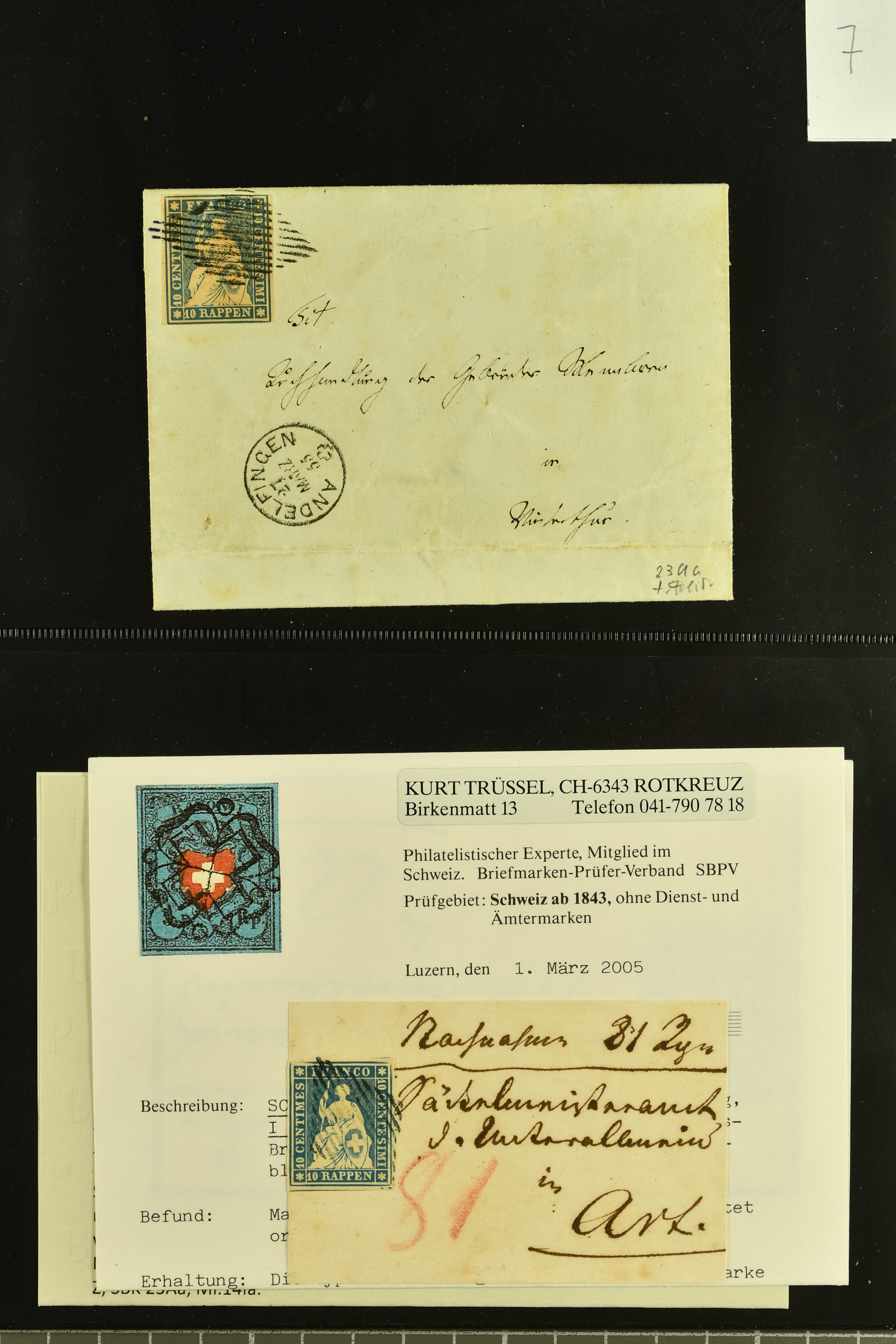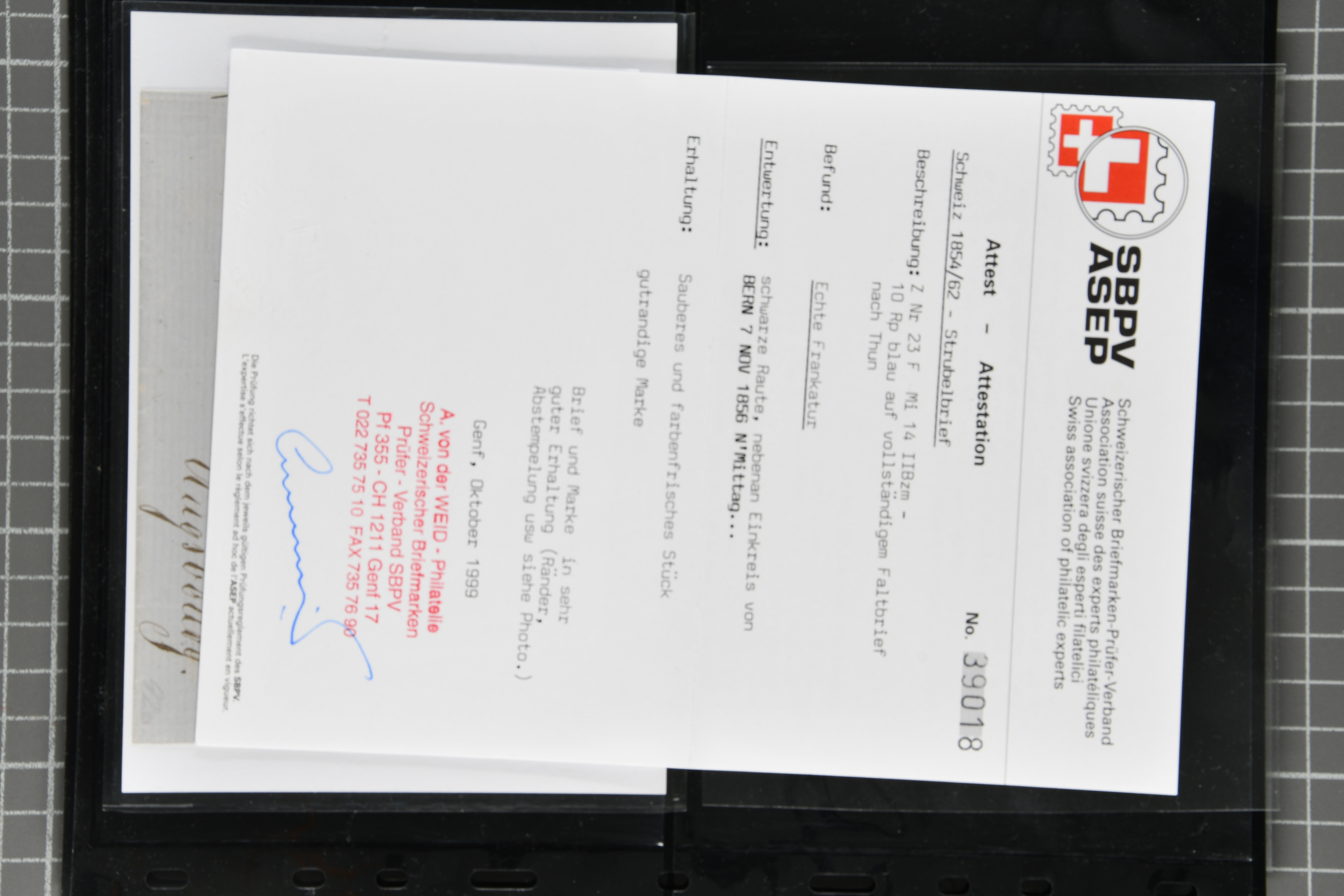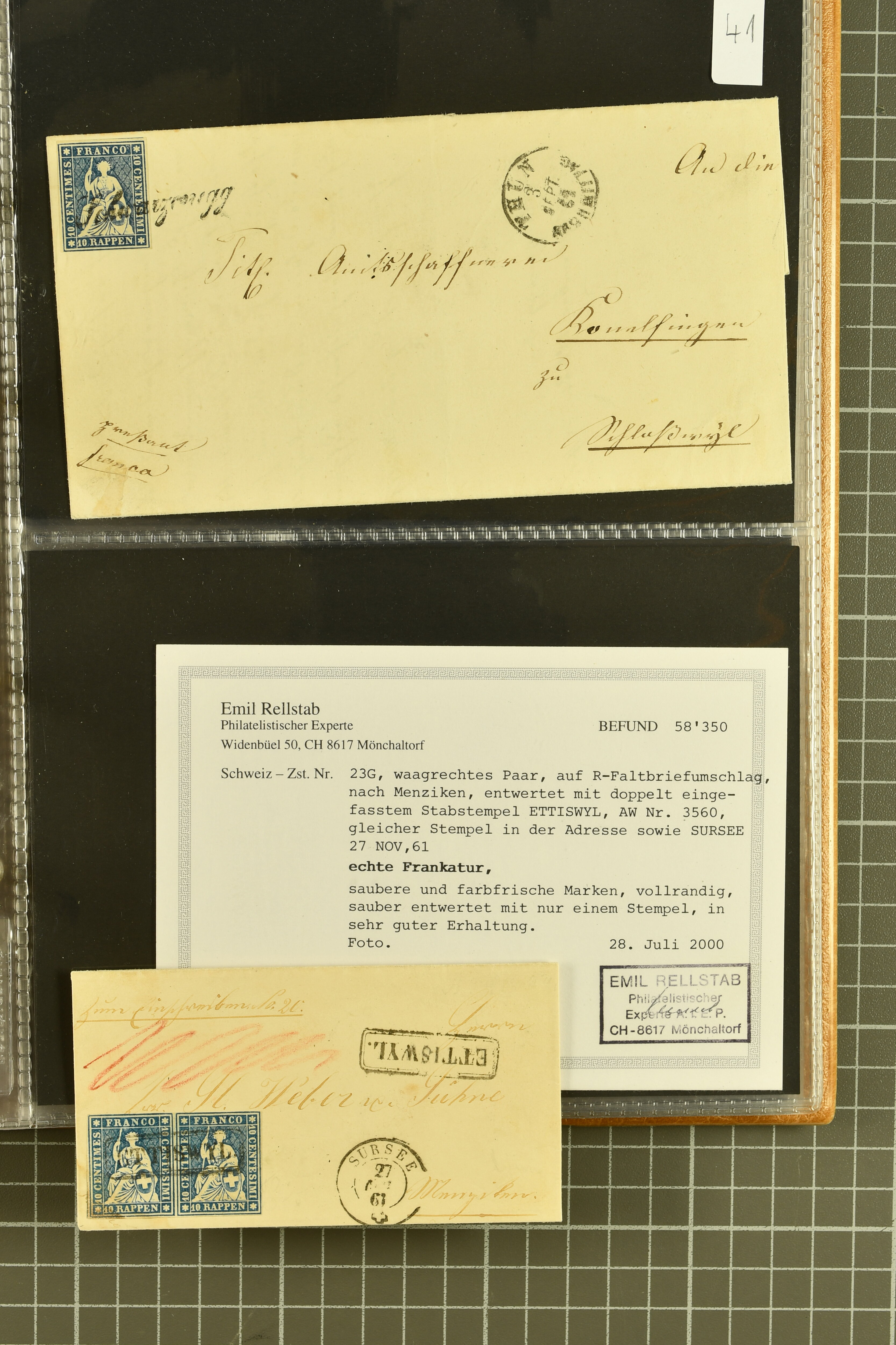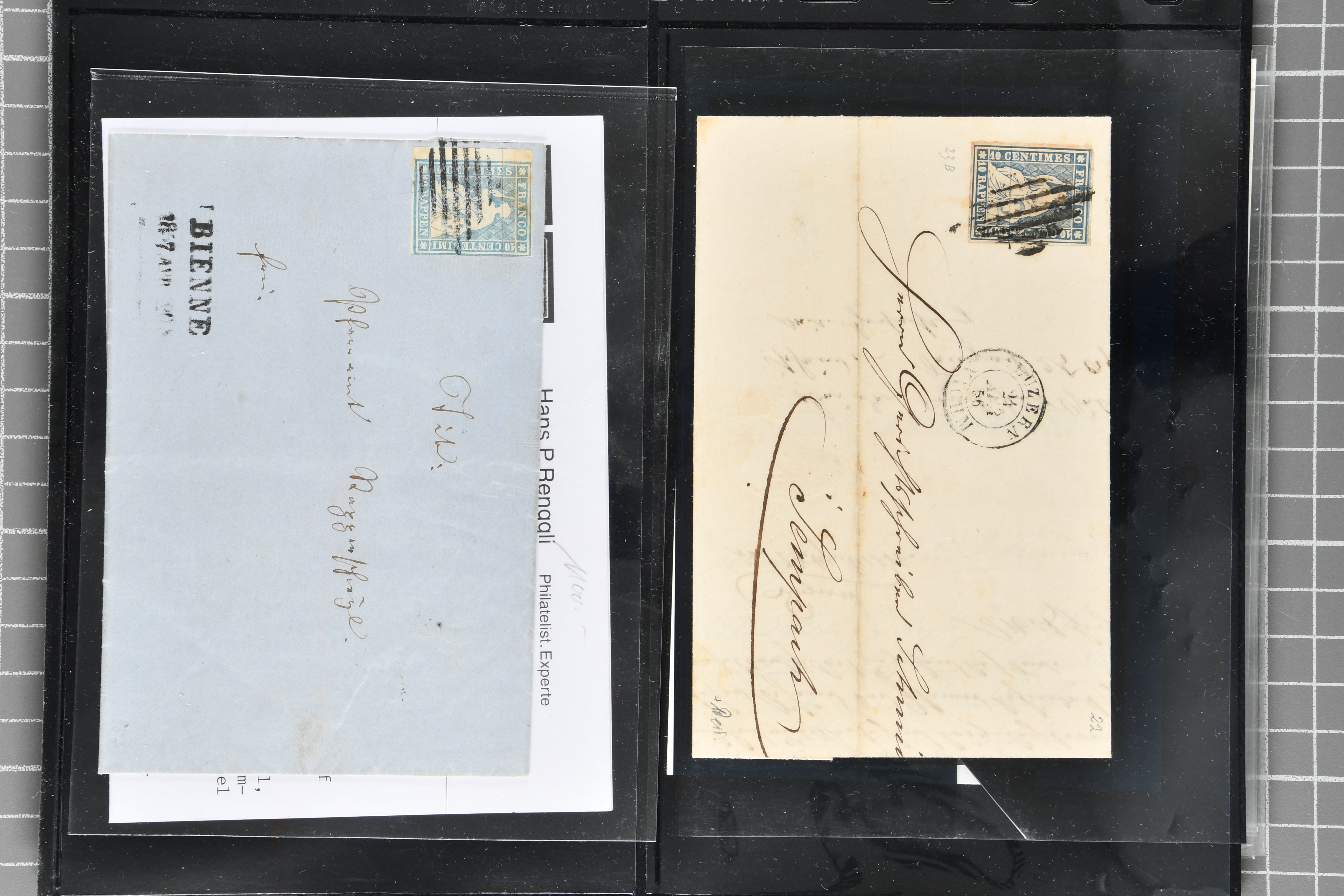 9789 cover image1854/62: Lot zehn meist hochwertige Strubelfrankaturen mit 10 Rp. hellpreussischblau (SBK 23Aa) auf Faltbrief von Andelfingen nach Winterthur, 10 Rp. dunkelpreussischblau (SBK 23A2), schön entw. mit blauer eidg. Raute auf Nachnahme-Briefteil nach Arth, 10 Rp. bräunlichrot (SBK 24Aa), zwei Einzelwerte zus. klar entw. mit blauer eidg. Raute mit nebenges. Stabstp. "BUTTISHOLZ" und gr. Zierkreisstp. "WILLISAU 17 NOV. 1854" auf Nachnahme-Faltbrief nach Dagmersellen, 10 Rp. rotkarmin (SBK 24A) mit Schmitzdruck der oberen Randlinie und breitem Bogenrand oben, zart entw. mit blauer eidg. Raute auf Faltbrief von Hochdorf nach Bulle, 10 Rp. grünlichblau (SBK 23Ca) mit breitem Bogenrand rechts auf Faltbrieflein von Bätterkinden nach Langnau, 10 Rp. grauultramarin auf dünnem Münchner Papier (SBK 23F) mit breitem Bogenrand rechts auf Faltbrief von Oensingen nach Olten, zwei Einzelfrankaturen der 15 Rp. rötlichkarmin auf ebensolchem Papier (SBK 24F) sowie 5 Rp. braun (SBK 22G), diagonal halbiert als sog. "Genfer Provisorium" auf Drucksachen-Vorderseite in der Stadt. Etwas unterschiedliche Erhaltung; ein Befund, fünf Atteste. SBK=CHF 13'600 (Image 1) (Image 2) (Image 3) (Image 4) (Image 5) (Image 6) (Image 7) (Image 8) (Image 9) (Image 10)
