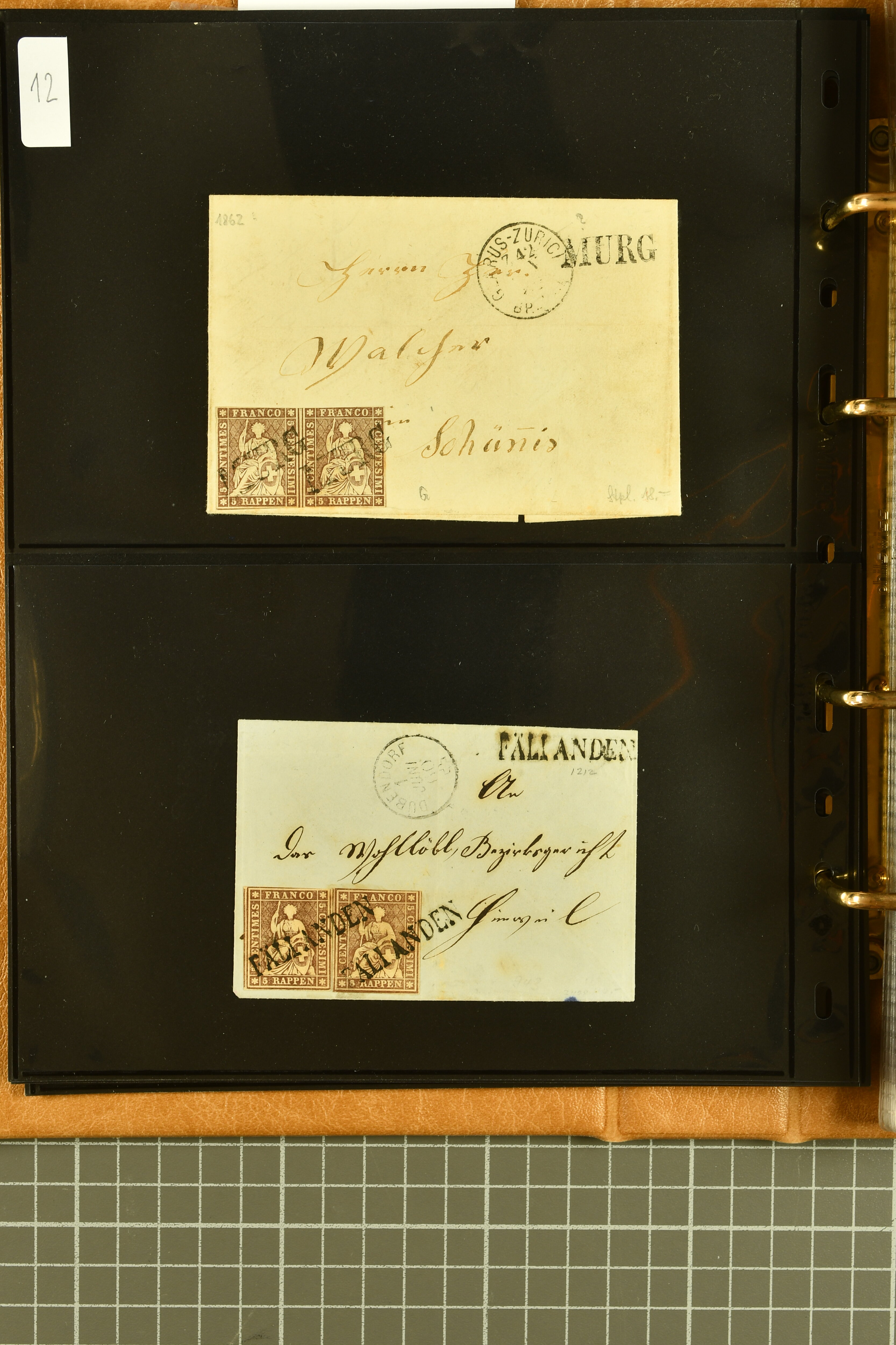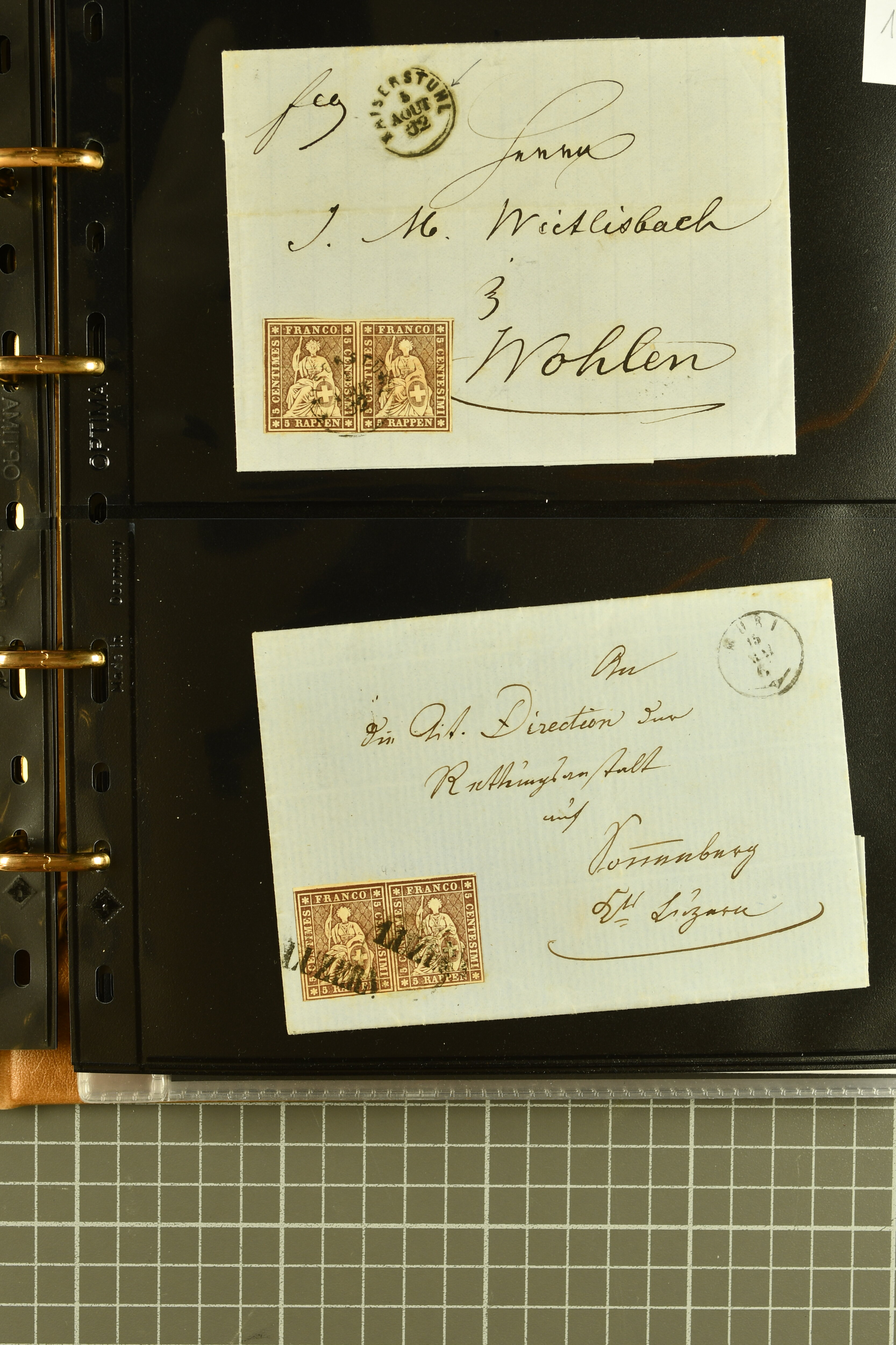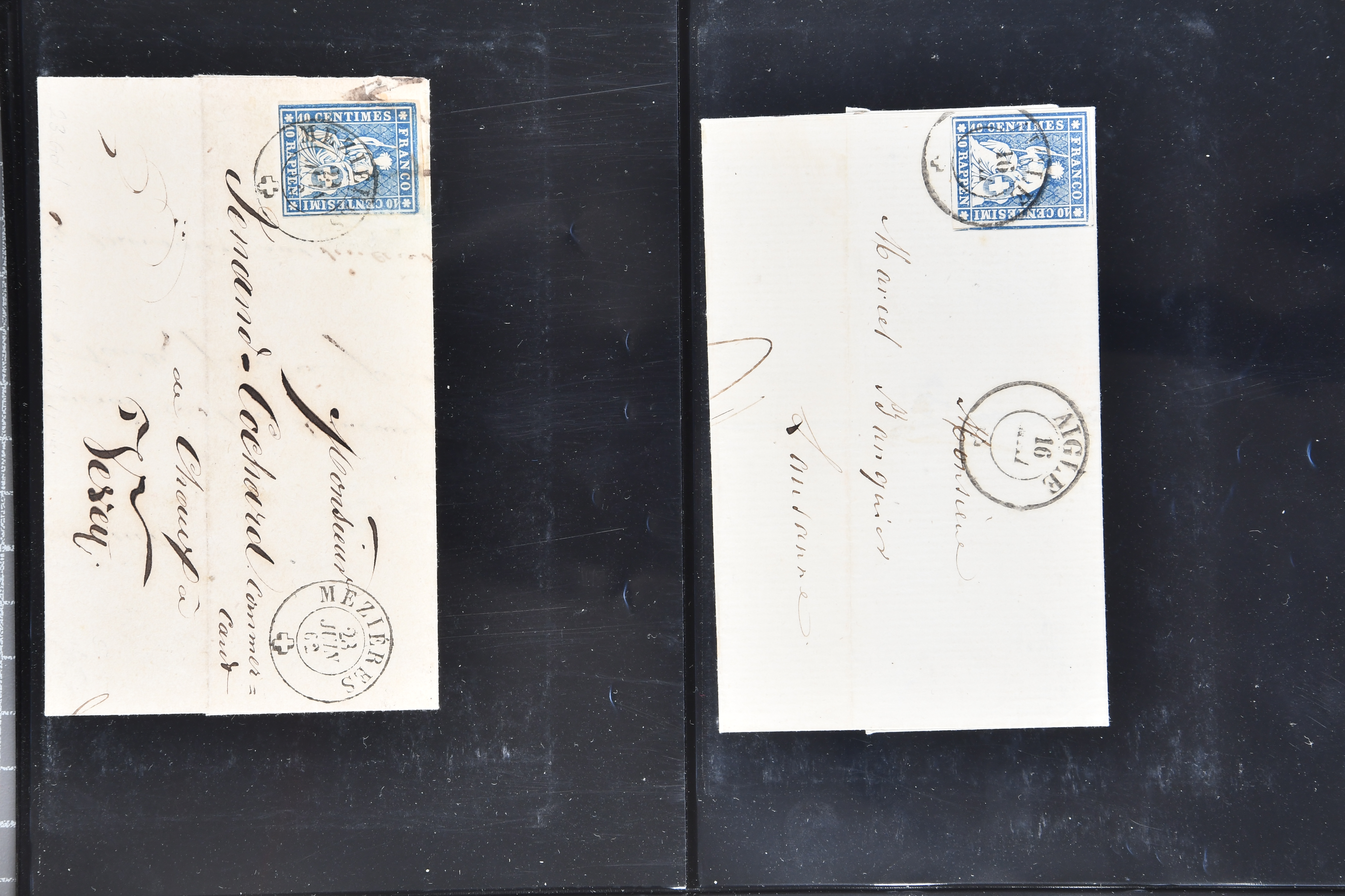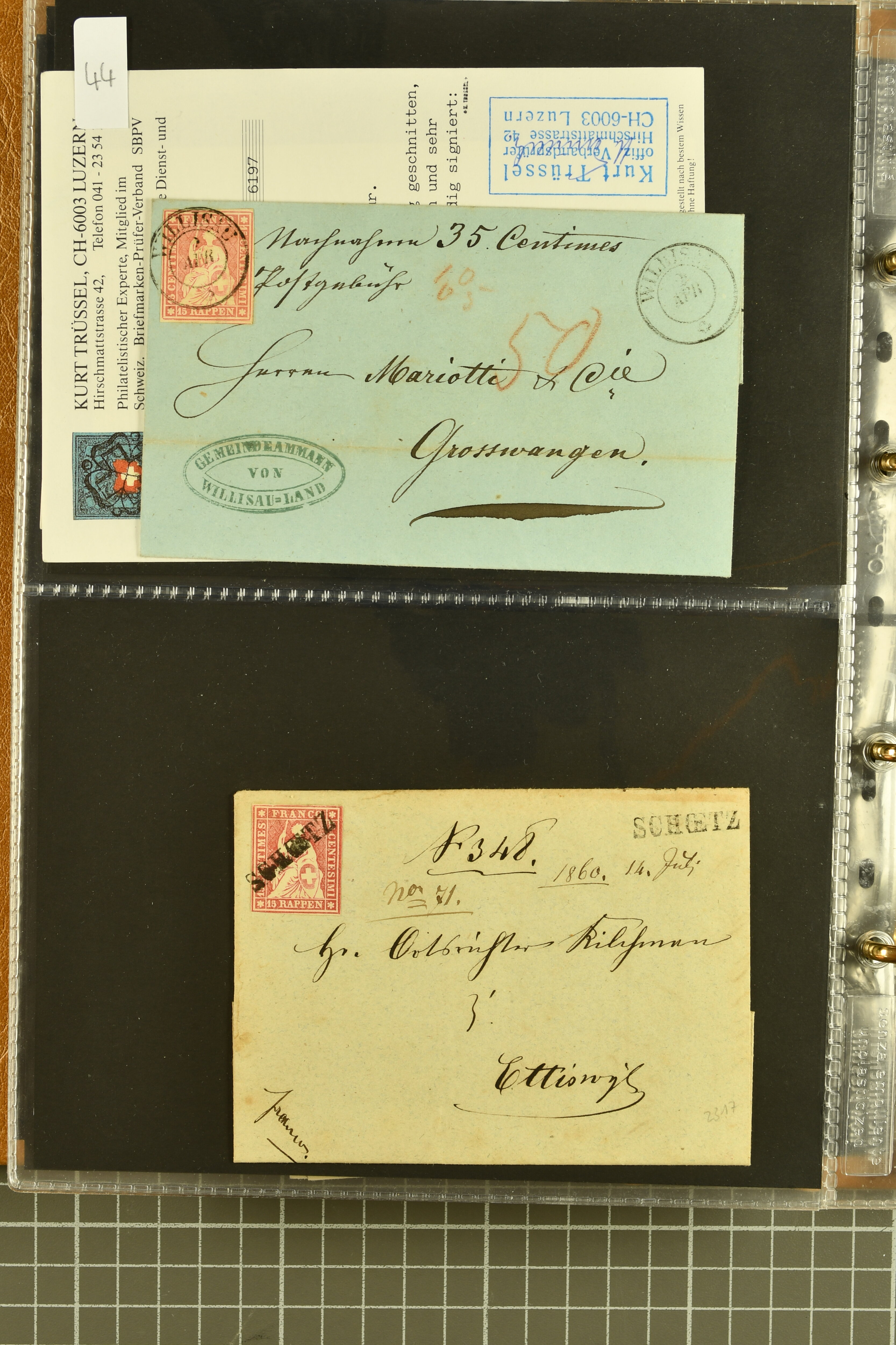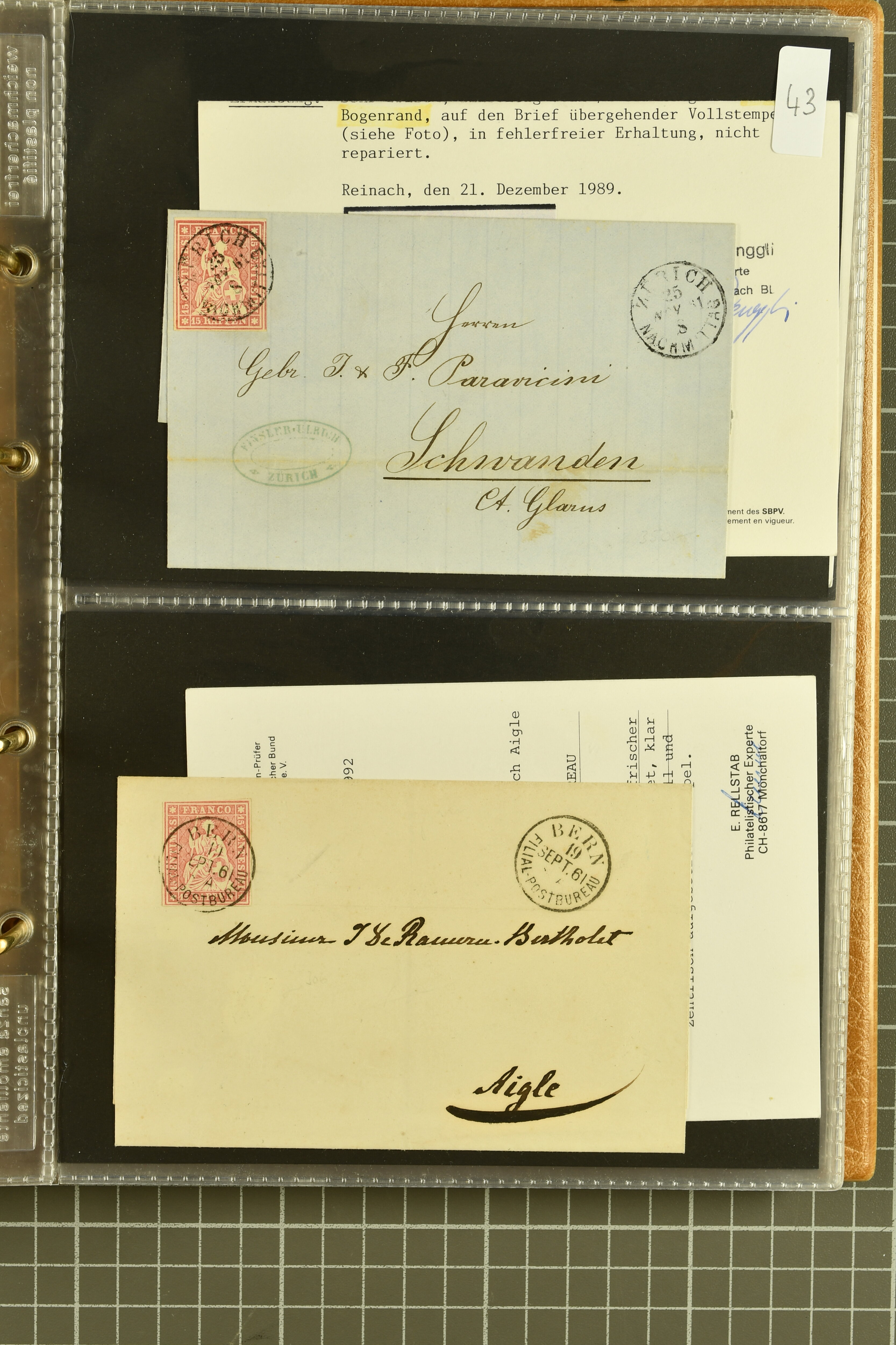 9789 cover image1854/62: Lot zehn meist hochwertige Strubelfrankaturen mit 10 Rp. hellpreussischblau (SBK 23Aa) auf Faltbrief von Andelfingen nach Winterthur, 10 Rp. dunkelpreussischblau (SBK 23A2), schön entw. mit blauer eidg. Raute auf Nachnahme-Briefteil nach Arth, 10 Rp. bräunlichrot (SBK 24Aa), zwei Einzelwerte zus. klar entw. mit blauer eidg. Raute mit nebenges. Stabstp. "BUTTISHOLZ" und gr. Zierkreisstp. "WILLISAU 17 NOV. 1854" auf Nachnahme-Faltbrief nach Dagmersellen, 10 Rp. rotkarmin (SBK 24A) mit Schmitzdruck der oberen Randlinie und breitem Bogenrand oben, zart entw. mit blauer eidg. Raute auf Faltbrief von Hochdorf nach Bulle, 10 Rp. grünlichblau (SBK 23Ca) mit breitem Bogenrand rechts auf Faltbrieflein von Bätterkinden nach Langnau, 10 Rp. grauultramarin auf dünnem Münchner Papier (SBK 23F) mit breitem Bogenrand rechts auf Faltbrief von Oensingen nach Olten, zwei Einzelfrankaturen der 15 Rp. rötlichkarmin auf ebensolchem Papier (SBK 24F) sowie 5 Rp. braun (SBK 22G), diagonal halbiert als sog. "Genfer Provisorium" auf Drucksachen-Vorderseite in der Stadt. Etwas unterschiedliche Erhaltung; ein Befund, fünf Atteste. SBK=CHF 13'600 (Image 1) (Image 2) (Image 3) (Image 4) (Image 5) (Image 6) (Image 7) (Image 8) (Image 9) (Image 10)