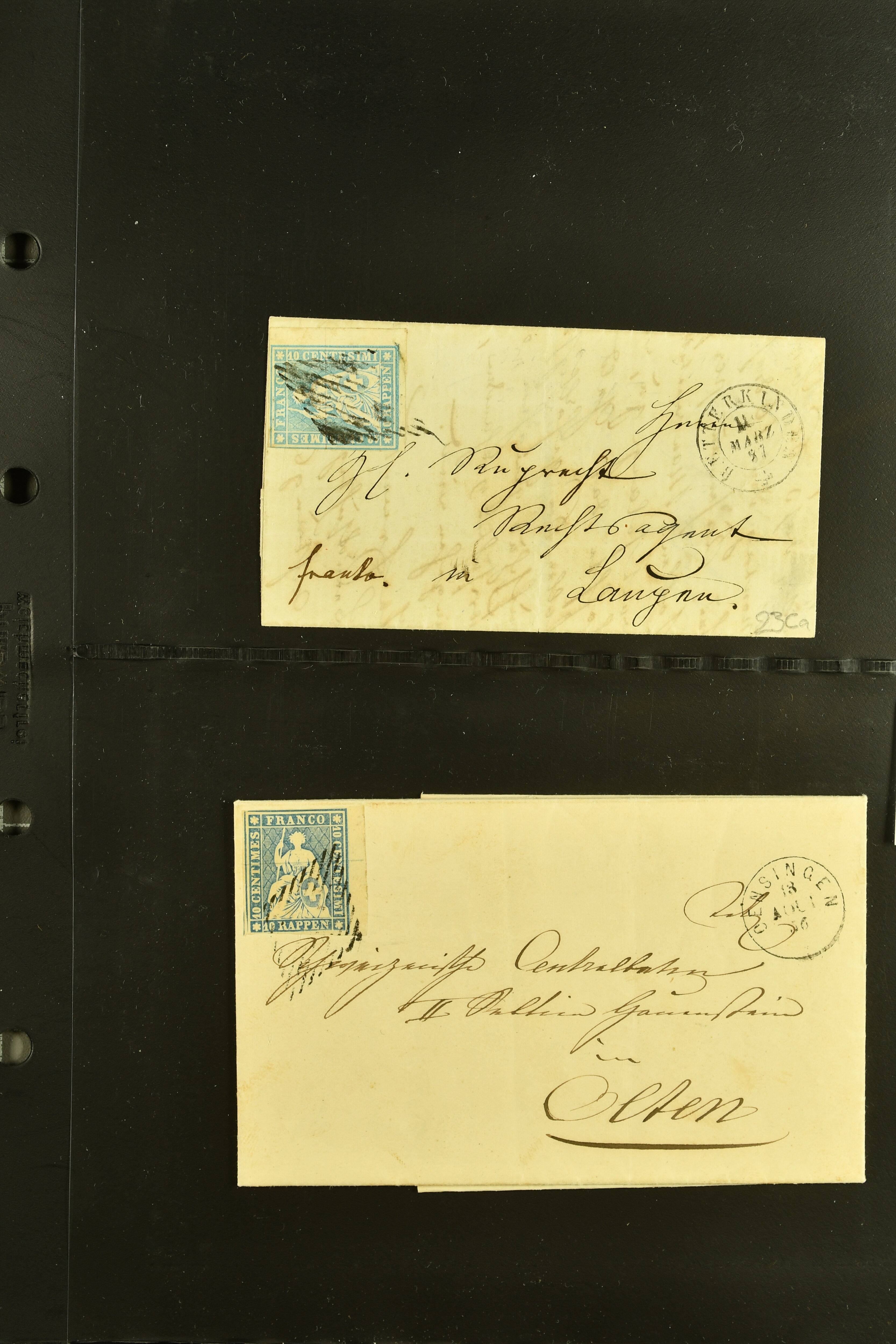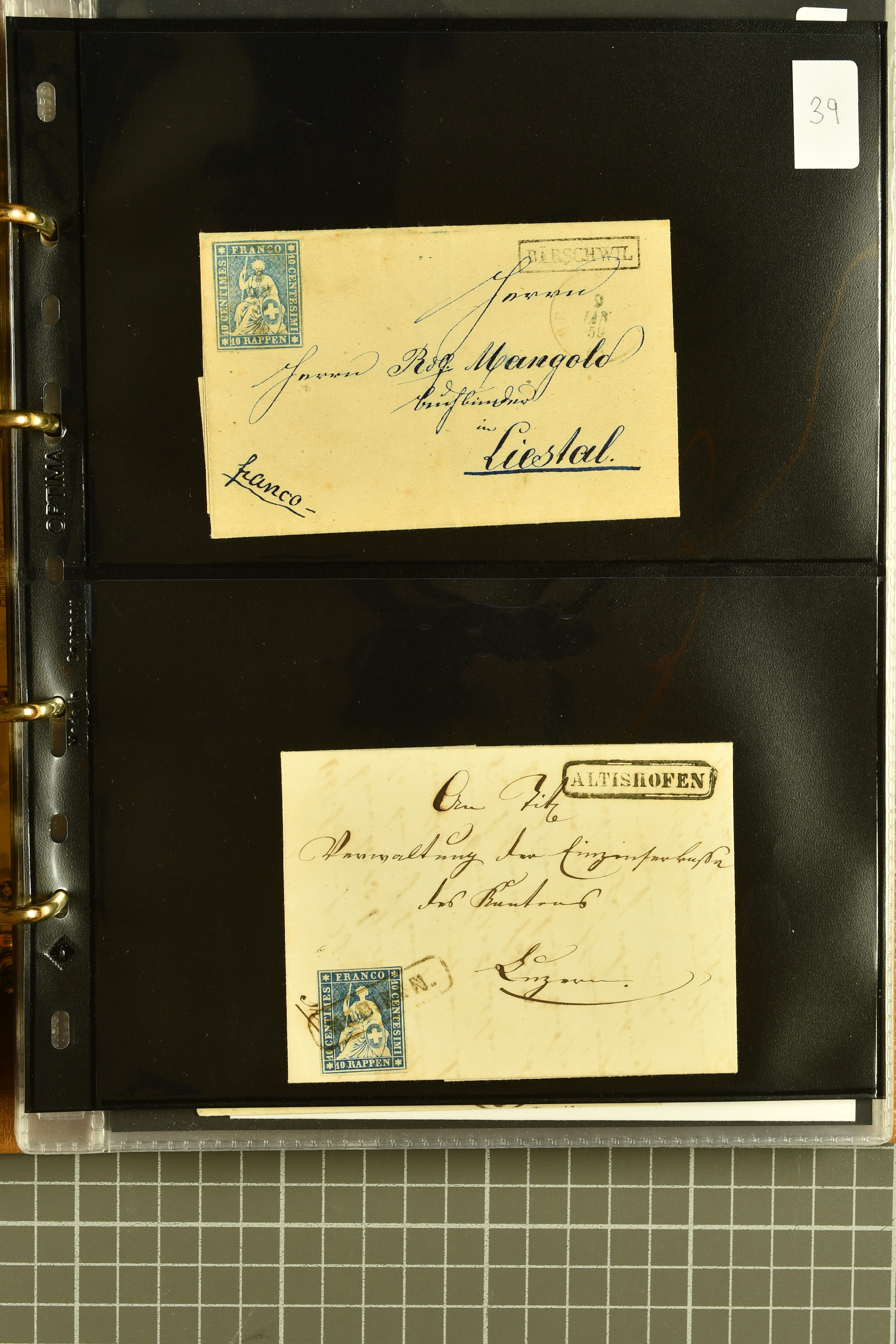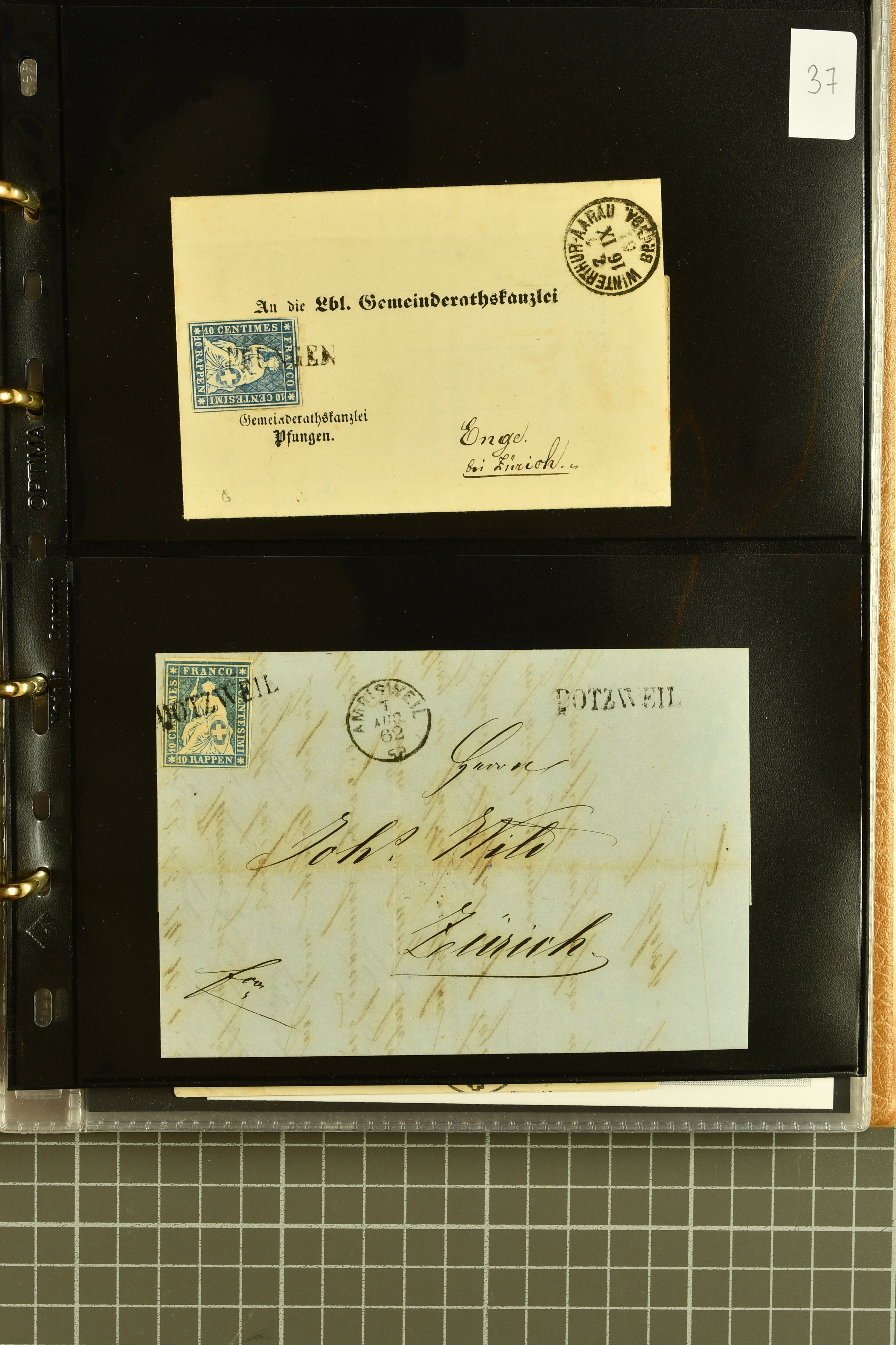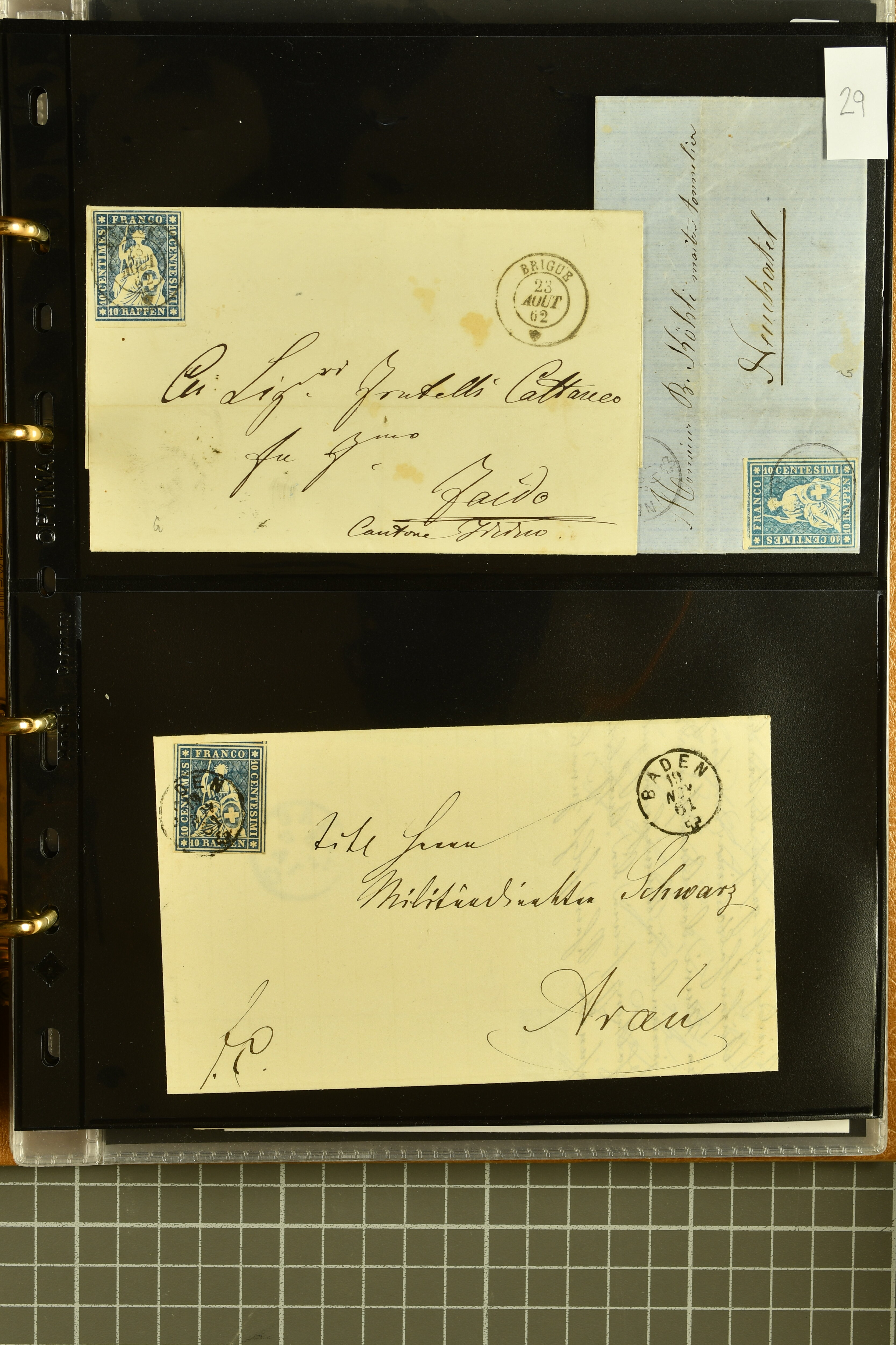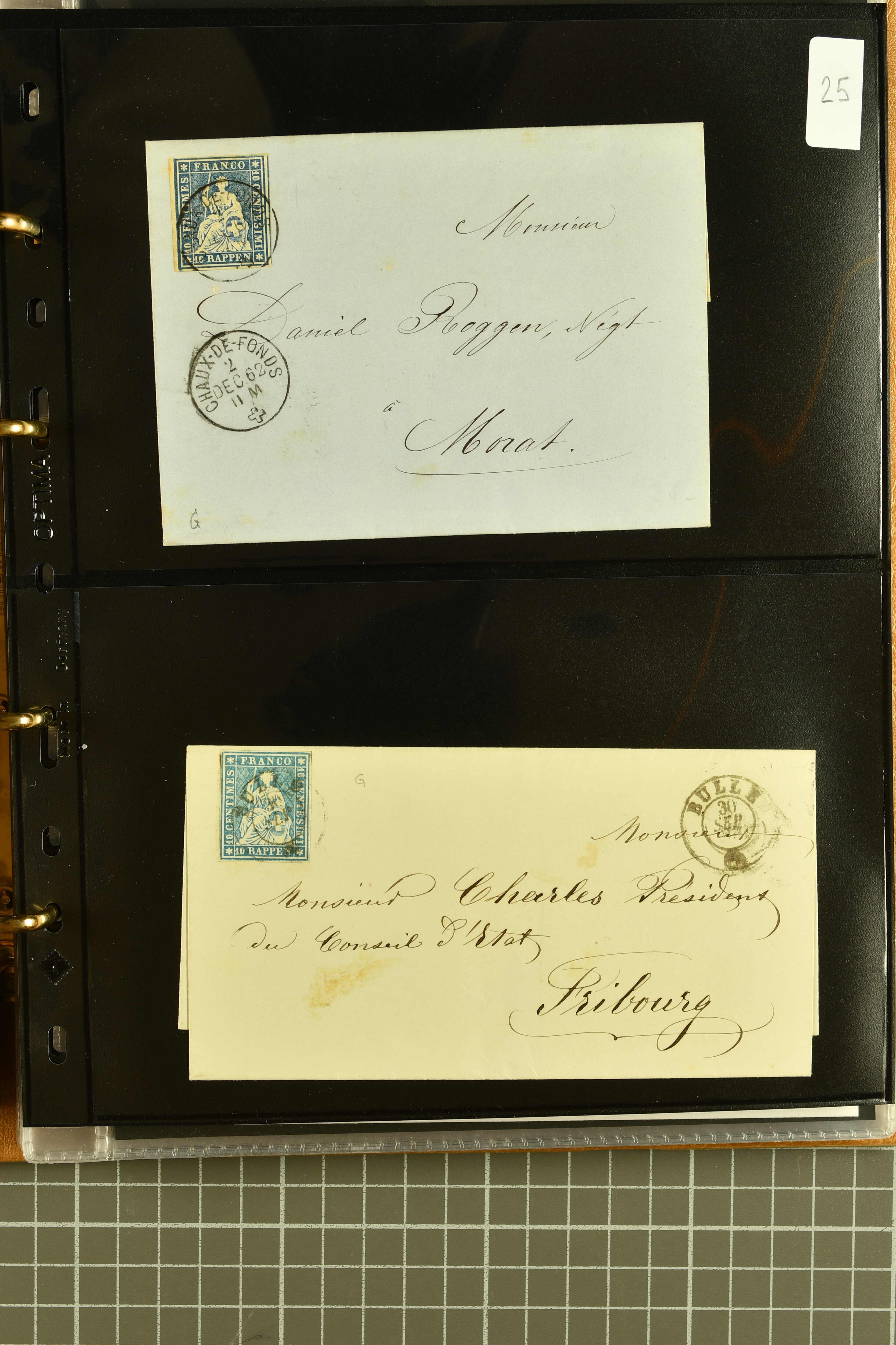 9789 cover image1854/62: Lot zehn meist hochwertige Strubelfrankaturen mit 10 Rp. hellpreussischblau (SBK 23Aa) auf Faltbrief von Andelfingen nach Winterthur, 10 Rp. dunkelpreussischblau (SBK 23A2), schön entw. mit blauer eidg. Raute auf Nachnahme-Briefteil nach Arth, 10 Rp. bräunlichrot (SBK 24Aa), zwei Einzelwerte zus. klar entw. mit blauer eidg. Raute mit nebenges. Stabstp. "BUTTISHOLZ" und gr. Zierkreisstp. "WILLISAU 17 NOV. 1854" auf Nachnahme-Faltbrief nach Dagmersellen, 10 Rp. rotkarmin (SBK 24A) mit Schmitzdruck der oberen Randlinie und breitem Bogenrand oben, zart entw. mit blauer eidg. Raute auf Faltbrief von Hochdorf nach Bulle, 10 Rp. grünlichblau (SBK 23Ca) mit breitem Bogenrand rechts auf Faltbrieflein von Bätterkinden nach Langnau, 10 Rp. grauultramarin auf dünnem Münchner Papier (SBK 23F) mit breitem Bogenrand rechts auf Faltbrief von Oensingen nach Olten, zwei Einzelfrankaturen der 15 Rp. rötlichkarmin auf ebensolchem Papier (SBK 24F) sowie 5 Rp. braun (SBK 22G), diagonal halbiert als sog. "Genfer Provisorium" auf Drucksachen-Vorderseite in der Stadt. Etwas unterschiedliche Erhaltung; ein Befund, fünf Atteste. SBK=CHF 13'600 (Image 1) (Image 2) (Image 3) (Image 4) (Image 5) (Image 6) (Image 7) (Image 8) (Image 9) (Image 10)