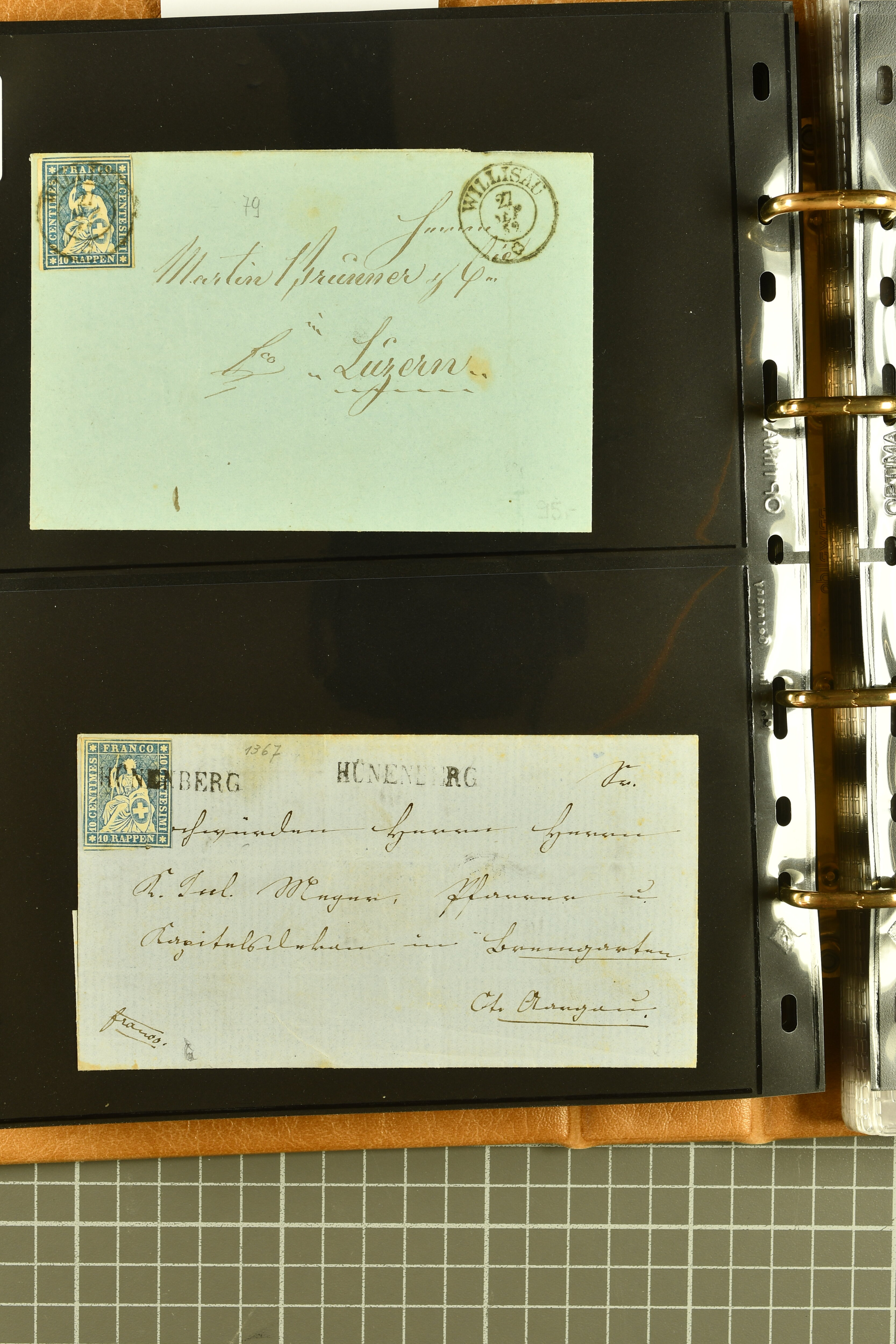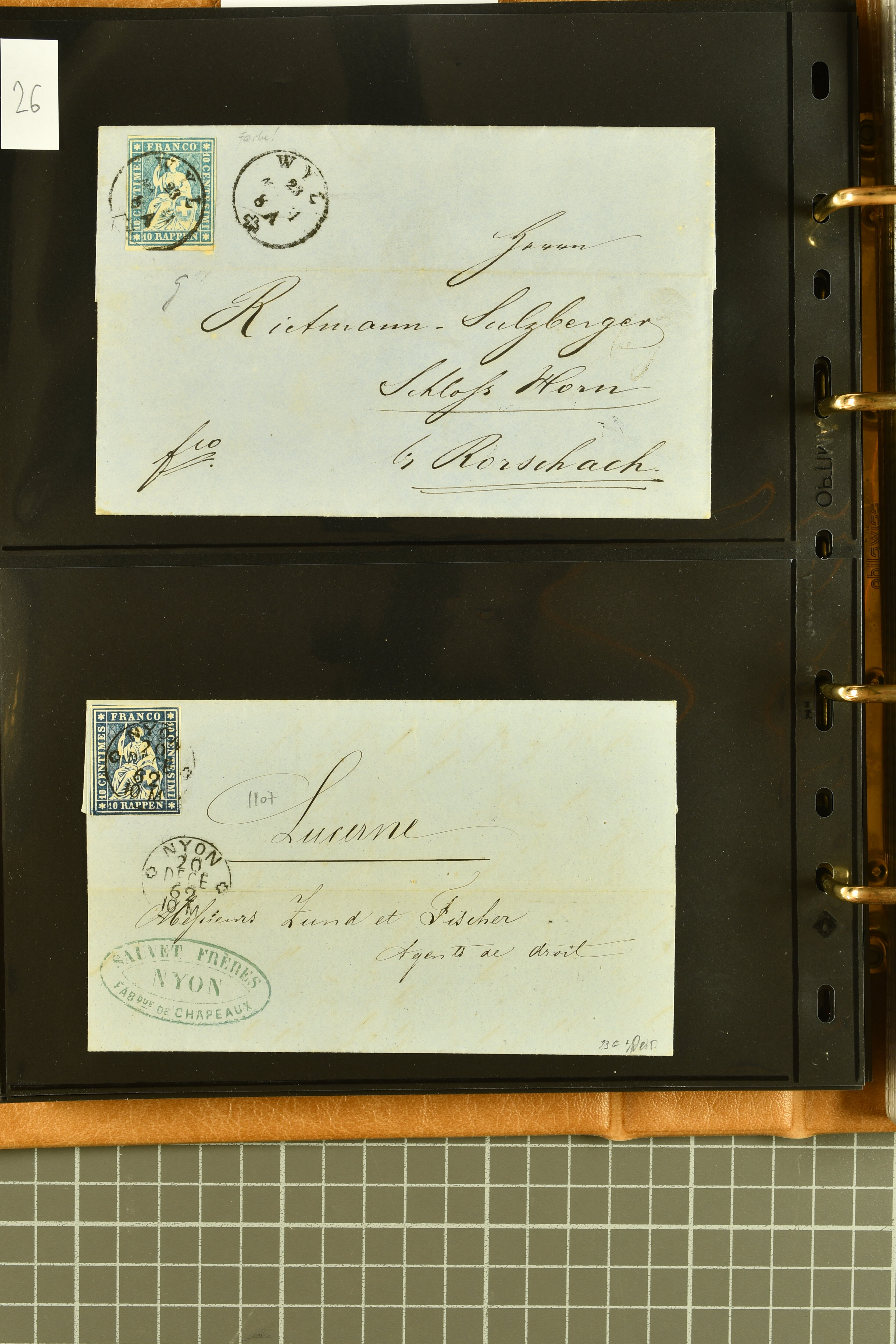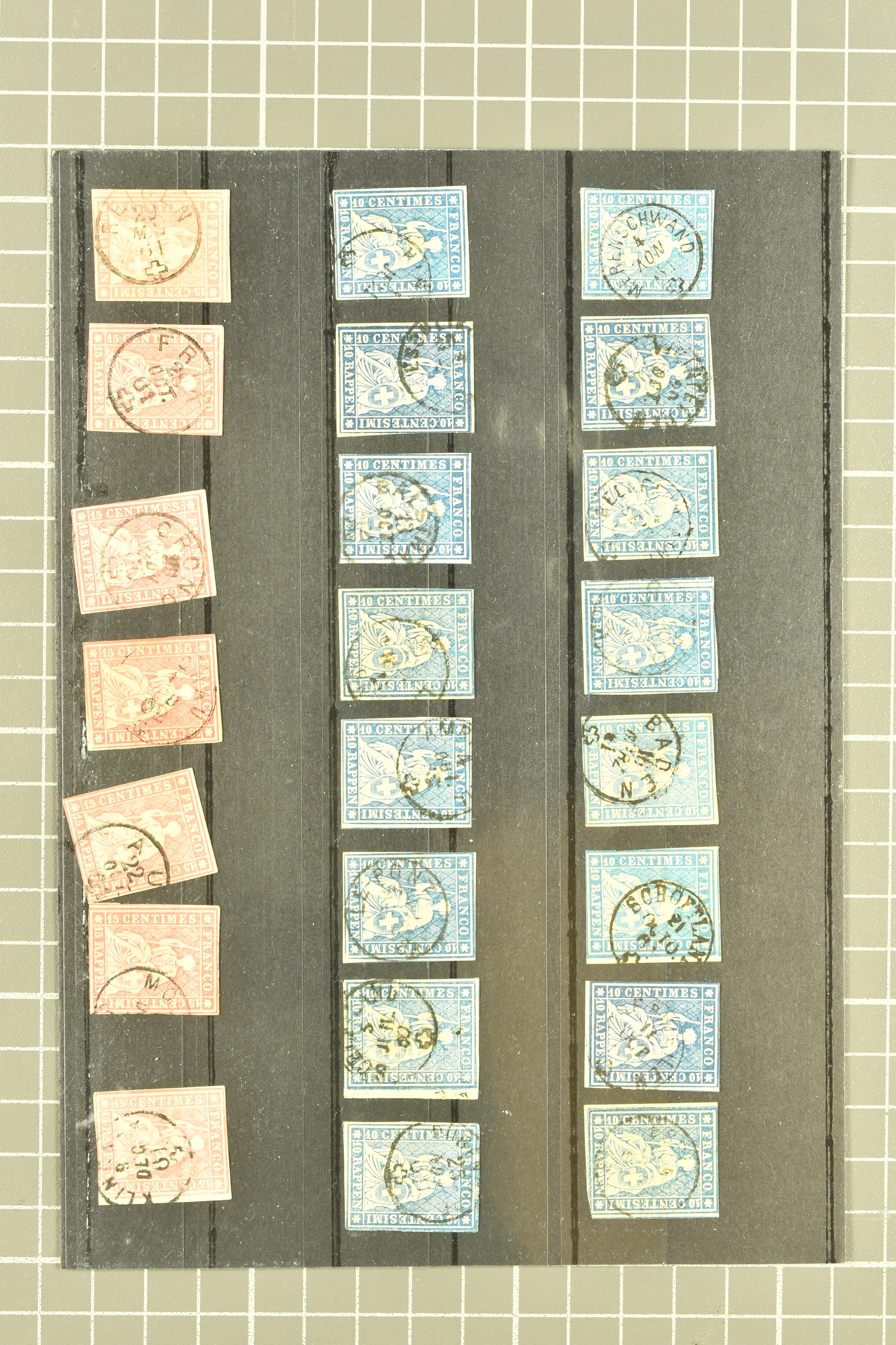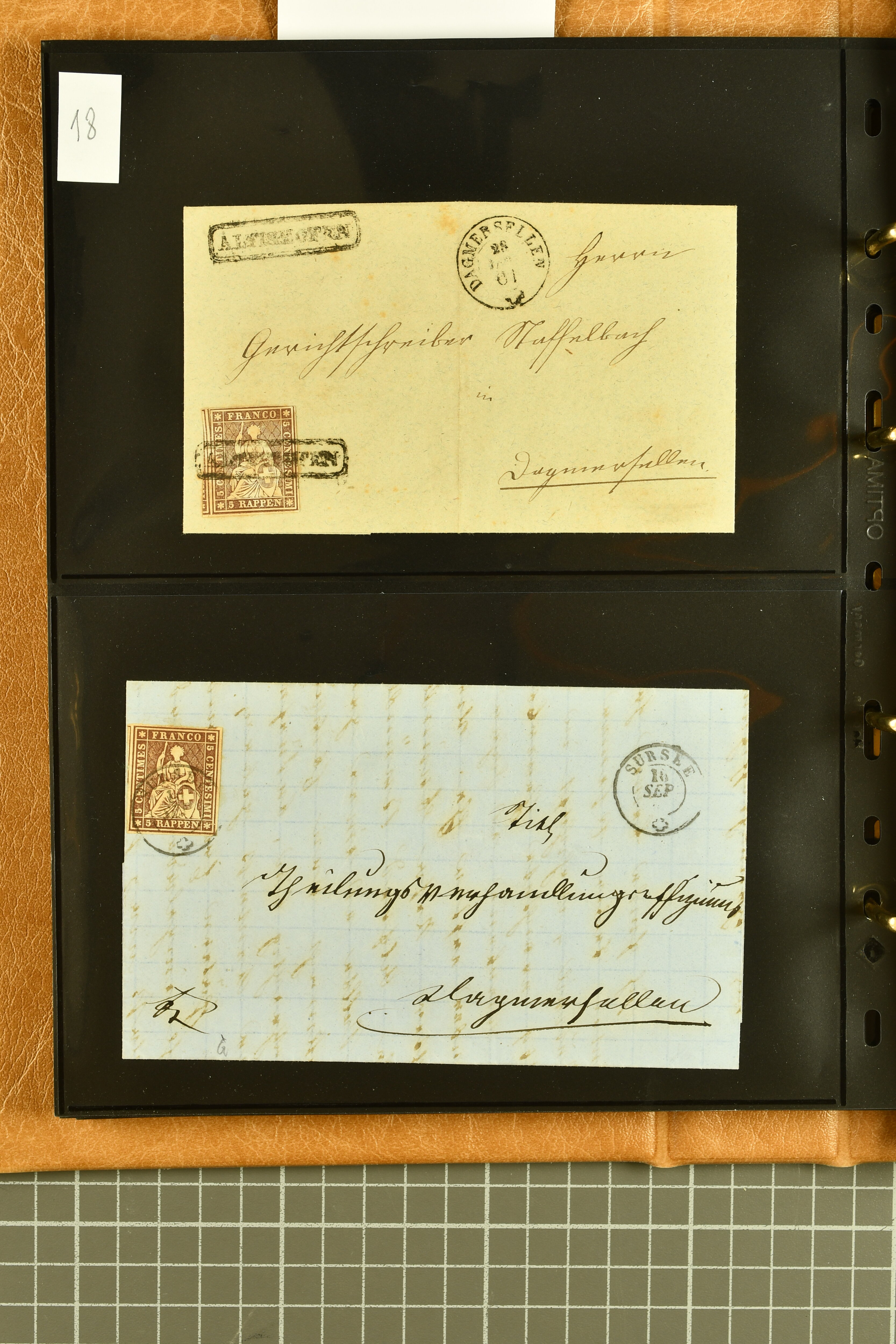 9789 cover image1854/62: Lot zehn meist hochwertige Strubelfrankaturen mit 10 Rp. hellpreussischblau (SBK 23Aa) auf Faltbrief von Andelfingen nach Winterthur, 10 Rp. dunkelpreussischblau (SBK 23A2), schön entw. mit blauer eidg. Raute auf Nachnahme-Briefteil nach Arth, 10 Rp. bräunlichrot (SBK 24Aa), zwei Einzelwerte zus. klar entw. mit blauer eidg. Raute mit nebenges. Stabstp. "BUTTISHOLZ" und gr. Zierkreisstp. "WILLISAU 17 NOV. 1854" auf Nachnahme-Faltbrief nach Dagmersellen, 10 Rp. rotkarmin (SBK 24A) mit Schmitzdruck der oberen Randlinie und breitem Bogenrand oben, zart entw. mit blauer eidg. Raute auf Faltbrief von Hochdorf nach Bulle, 10 Rp. grünlichblau (SBK 23Ca) mit breitem Bogenrand rechts auf Faltbrieflein von Bätterkinden nach Langnau, 10 Rp. grauultramarin auf dünnem Münchner Papier (SBK 23F) mit breitem Bogenrand rechts auf Faltbrief von Oensingen nach Olten, zwei Einzelfrankaturen der 15 Rp. rötlichkarmin auf ebensolchem Papier (SBK 24F) sowie 5 Rp. braun (SBK 22G), diagonal halbiert als sog. "Genfer Provisorium" auf Drucksachen-Vorderseite in der Stadt. Etwas unterschiedliche Erhaltung; ein Befund, fünf Atteste. SBK=CHF 13'600 (Image 1) (Image 2) (Image 3) (Image 4) (Image 5) (Image 6) (Image 7) (Image 8) (Image 9) (Image 10)