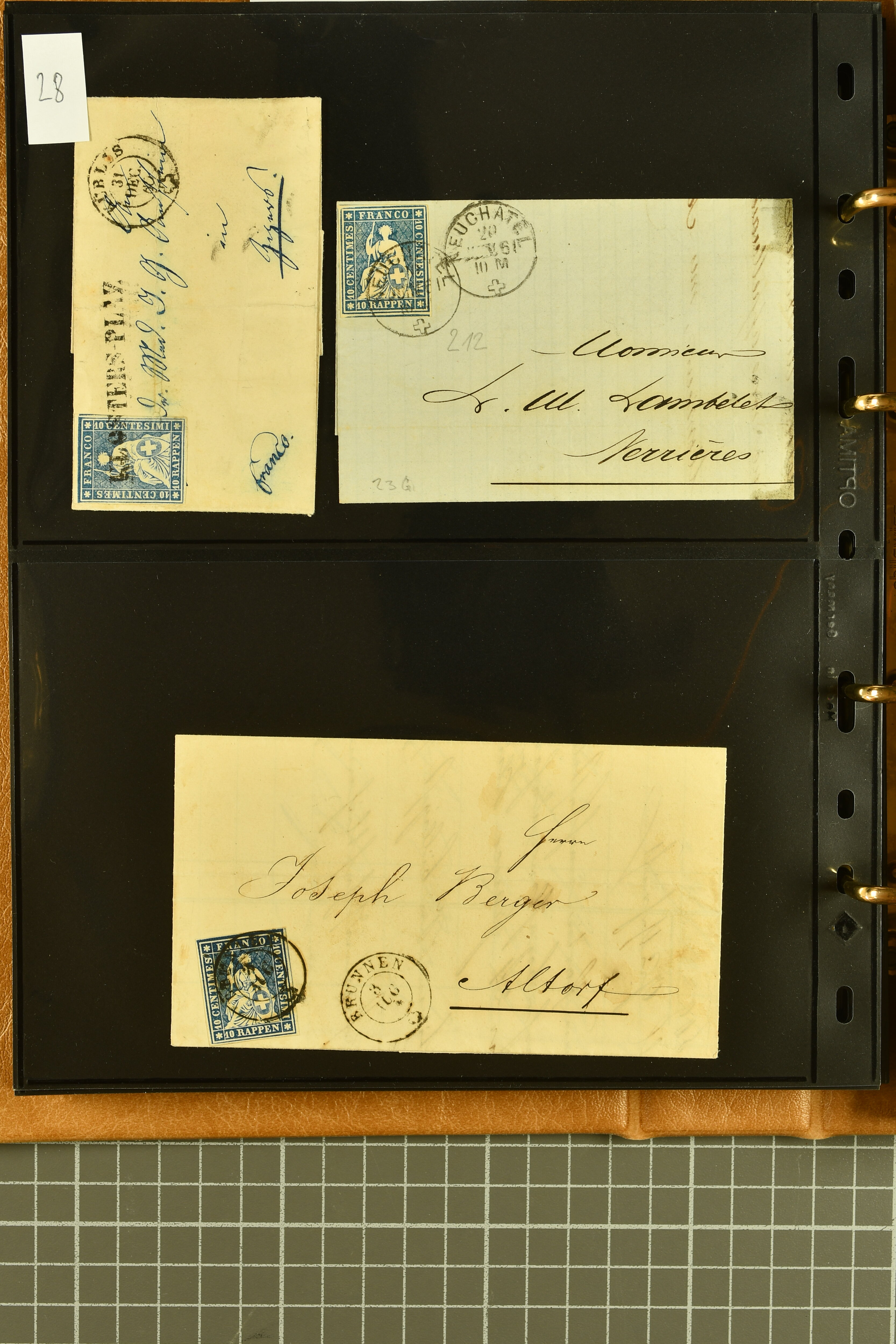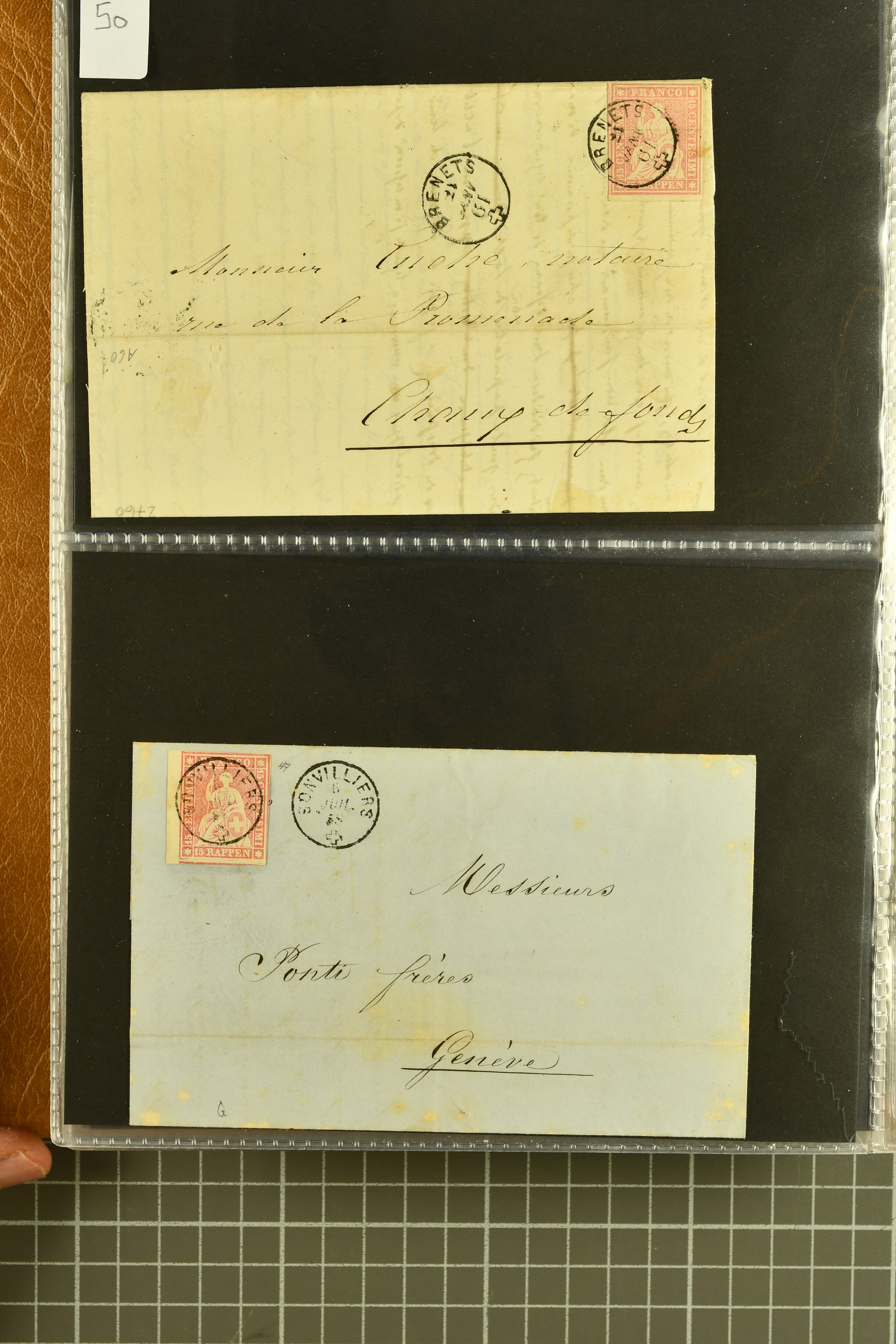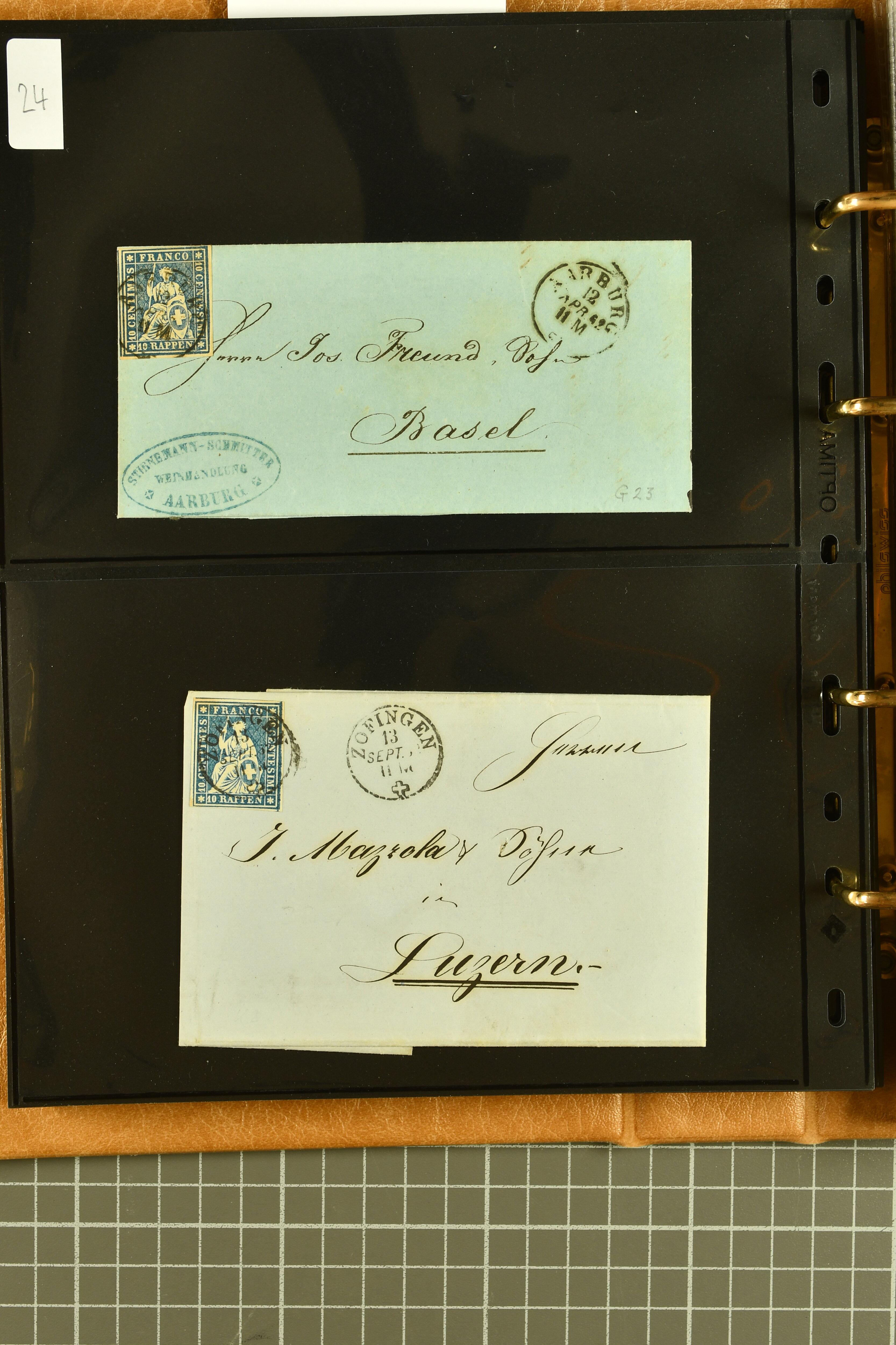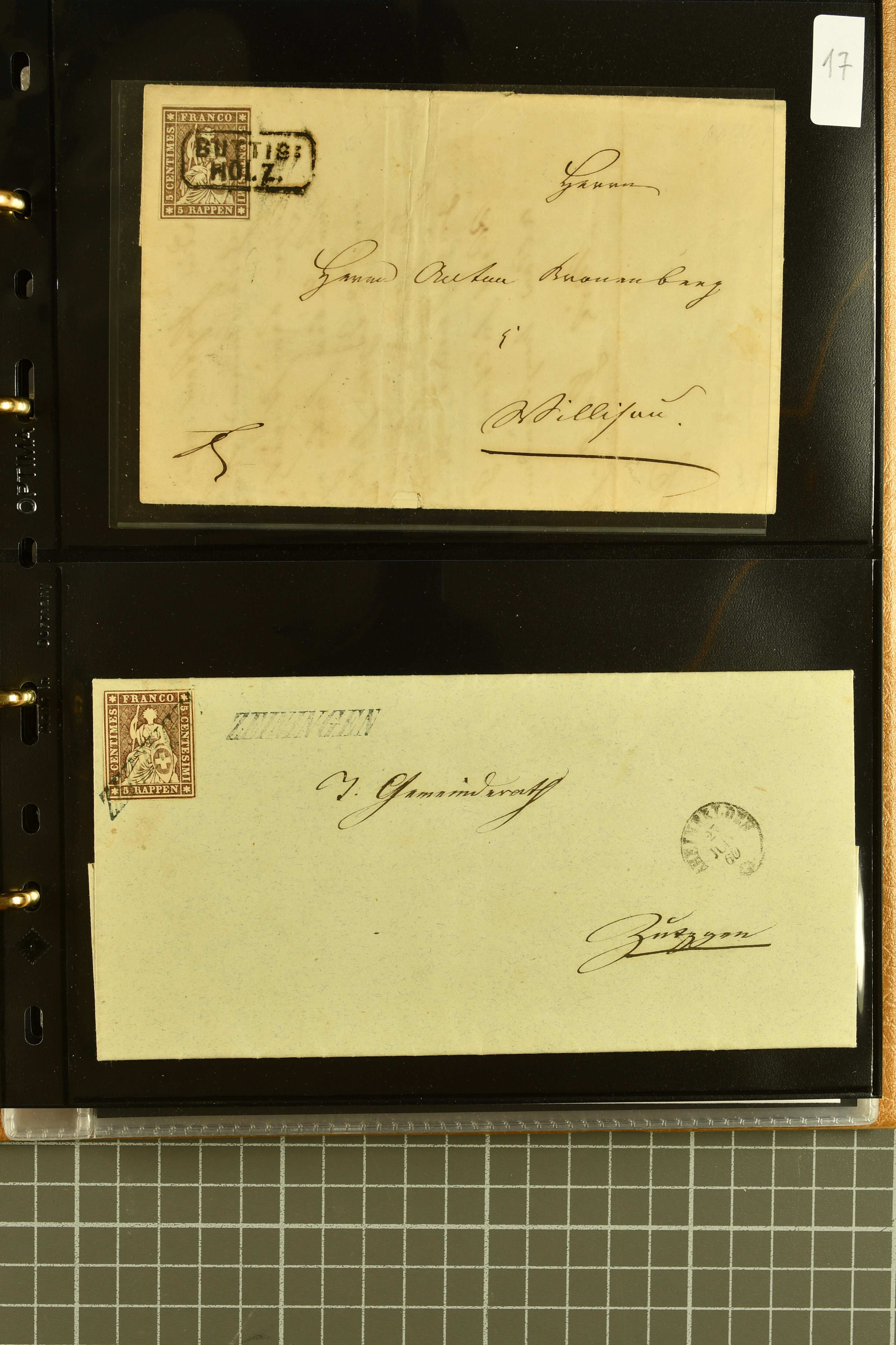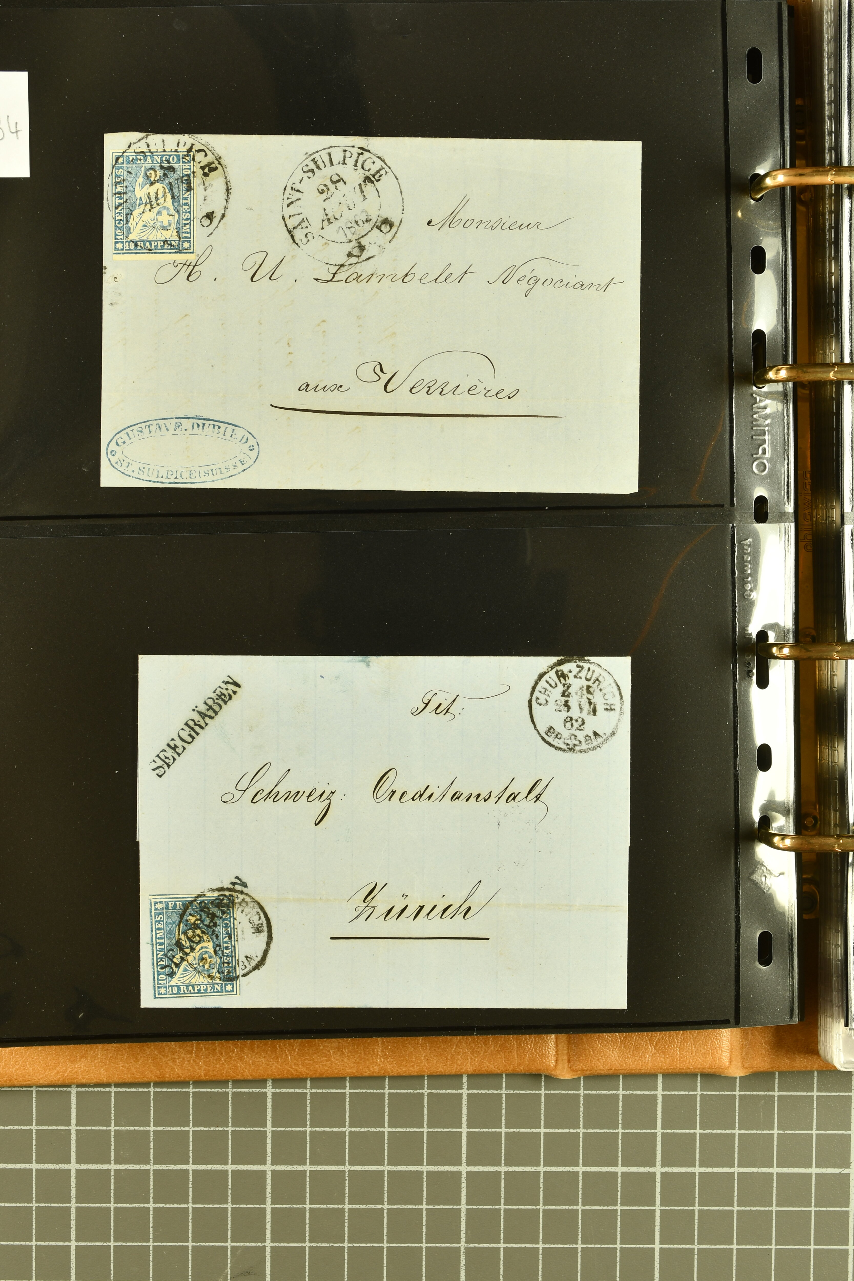 9789 cover image1854/62: Lot zehn meist hochwertige Strubelfrankaturen mit 10 Rp. hellpreussischblau (SBK 23Aa) auf Faltbrief von Andelfingen nach Winterthur, 10 Rp. dunkelpreussischblau (SBK 23A2), schön entw. mit blauer eidg. Raute auf Nachnahme-Briefteil nach Arth, 10 Rp. bräunlichrot (SBK 24Aa), zwei Einzelwerte zus. klar entw. mit blauer eidg. Raute mit nebenges. Stabstp. "BUTTISHOLZ" und gr. Zierkreisstp. "WILLISAU 17 NOV. 1854" auf Nachnahme-Faltbrief nach Dagmersellen, 10 Rp. rotkarmin (SBK 24A) mit Schmitzdruck der oberen Randlinie und breitem Bogenrand oben, zart entw. mit blauer eidg. Raute auf Faltbrief von Hochdorf nach Bulle, 10 Rp. grünlichblau (SBK 23Ca) mit breitem Bogenrand rechts auf Faltbrieflein von Bätterkinden nach Langnau, 10 Rp. grauultramarin auf dünnem Münchner Papier (SBK 23F) mit breitem Bogenrand rechts auf Faltbrief von Oensingen nach Olten, zwei Einzelfrankaturen der 15 Rp. rötlichkarmin auf ebensolchem Papier (SBK 24F) sowie 5 Rp. braun (SBK 22G), diagonal halbiert als sog. "Genfer Provisorium" auf Drucksachen-Vorderseite in der Stadt. Etwas unterschiedliche Erhaltung; ein Befund, fünf Atteste. SBK=CHF 13'600 (Image 1) (Image 2) (Image 3) (Image 4) (Image 5) (Image 6) (Image 7) (Image 8) (Image 9) (Image 10)