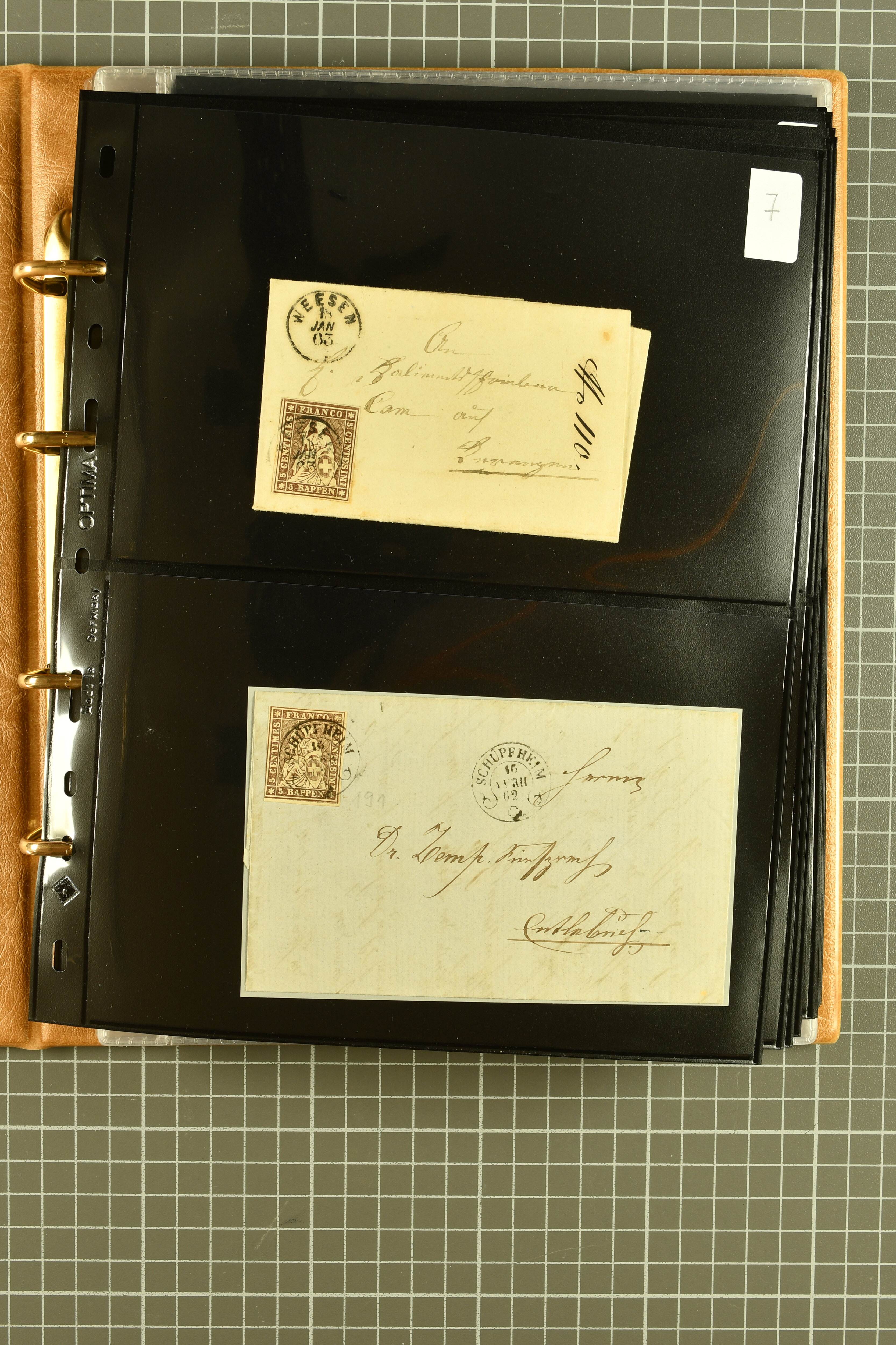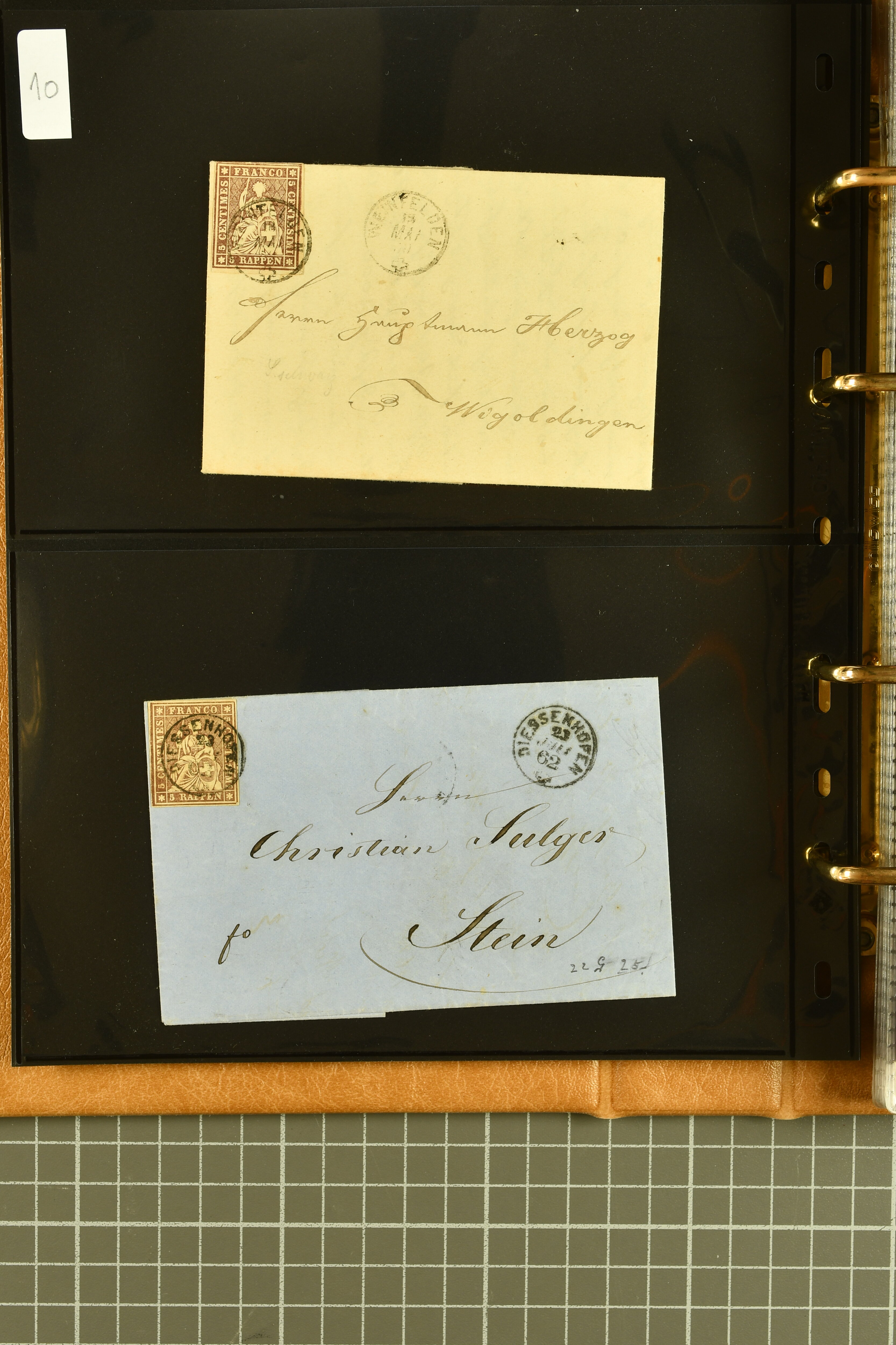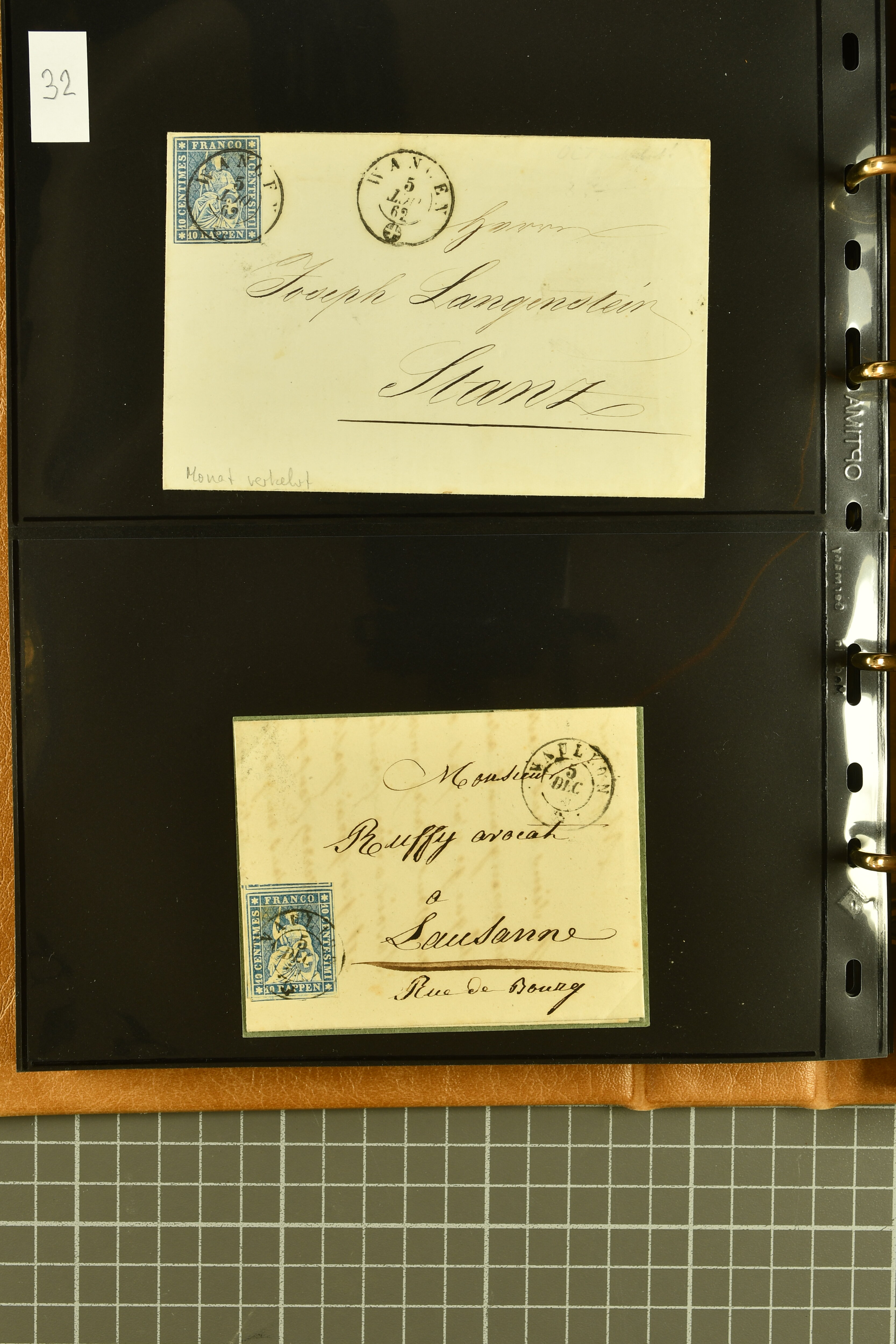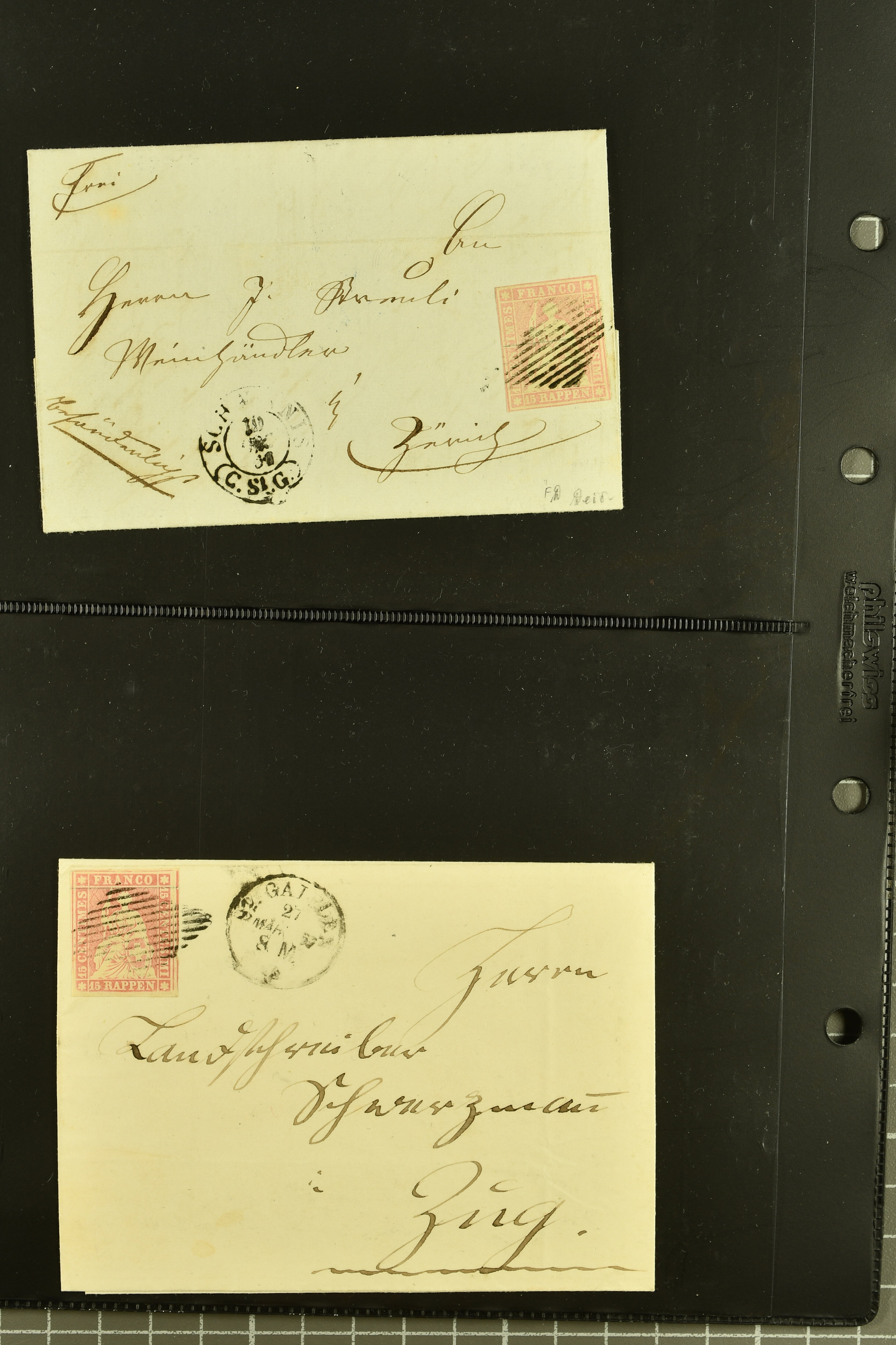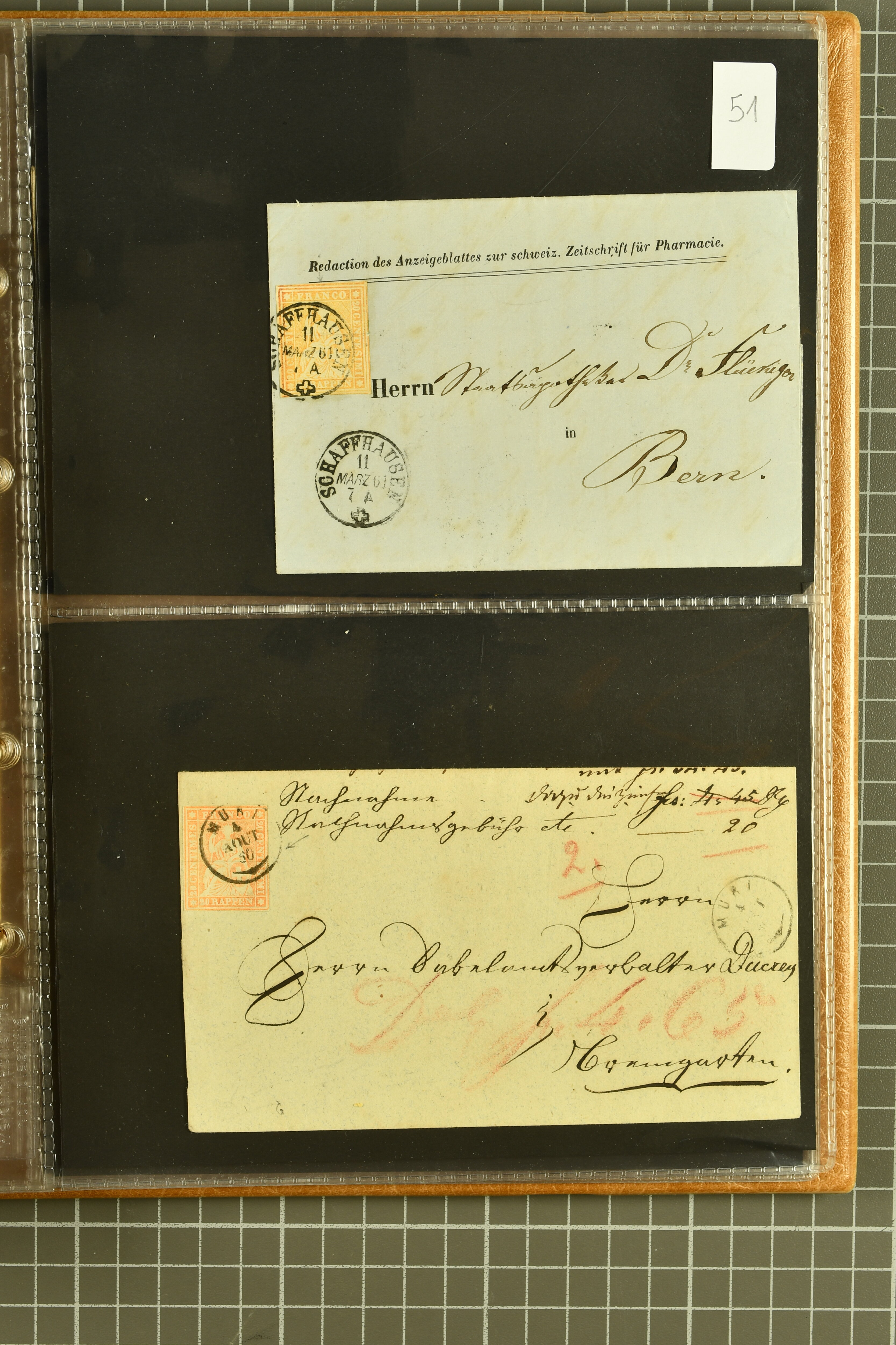 9789 cover image1854/62: Lot zehn meist hochwertige Strubelfrankaturen mit 10 Rp. hellpreussischblau (SBK 23Aa) auf Faltbrief von Andelfingen nach Winterthur, 10 Rp. dunkelpreussischblau (SBK 23A2), schön entw. mit blauer eidg. Raute auf Nachnahme-Briefteil nach Arth, 10 Rp. bräunlichrot (SBK 24Aa), zwei Einzelwerte zus. klar entw. mit blauer eidg. Raute mit nebenges. Stabstp. "BUTTISHOLZ" und gr. Zierkreisstp. "WILLISAU 17 NOV. 1854" auf Nachnahme-Faltbrief nach Dagmersellen, 10 Rp. rotkarmin (SBK 24A) mit Schmitzdruck der oberen Randlinie und breitem Bogenrand oben, zart entw. mit blauer eidg. Raute auf Faltbrief von Hochdorf nach Bulle, 10 Rp. grünlichblau (SBK 23Ca) mit breitem Bogenrand rechts auf Faltbrieflein von Bätterkinden nach Langnau, 10 Rp. grauultramarin auf dünnem Münchner Papier (SBK 23F) mit breitem Bogenrand rechts auf Faltbrief von Oensingen nach Olten, zwei Einzelfrankaturen der 15 Rp. rötlichkarmin auf ebensolchem Papier (SBK 24F) sowie 5 Rp. braun (SBK 22G), diagonal halbiert als sog. "Genfer Provisorium" auf Drucksachen-Vorderseite in der Stadt. Etwas unterschiedliche Erhaltung; ein Befund, fünf Atteste. SBK=CHF 13'600 (Image 1) (Image 2) (Image 3) (Image 4) (Image 5) (Image 6) (Image 7) (Image 8) (Image 9) (Image 10)