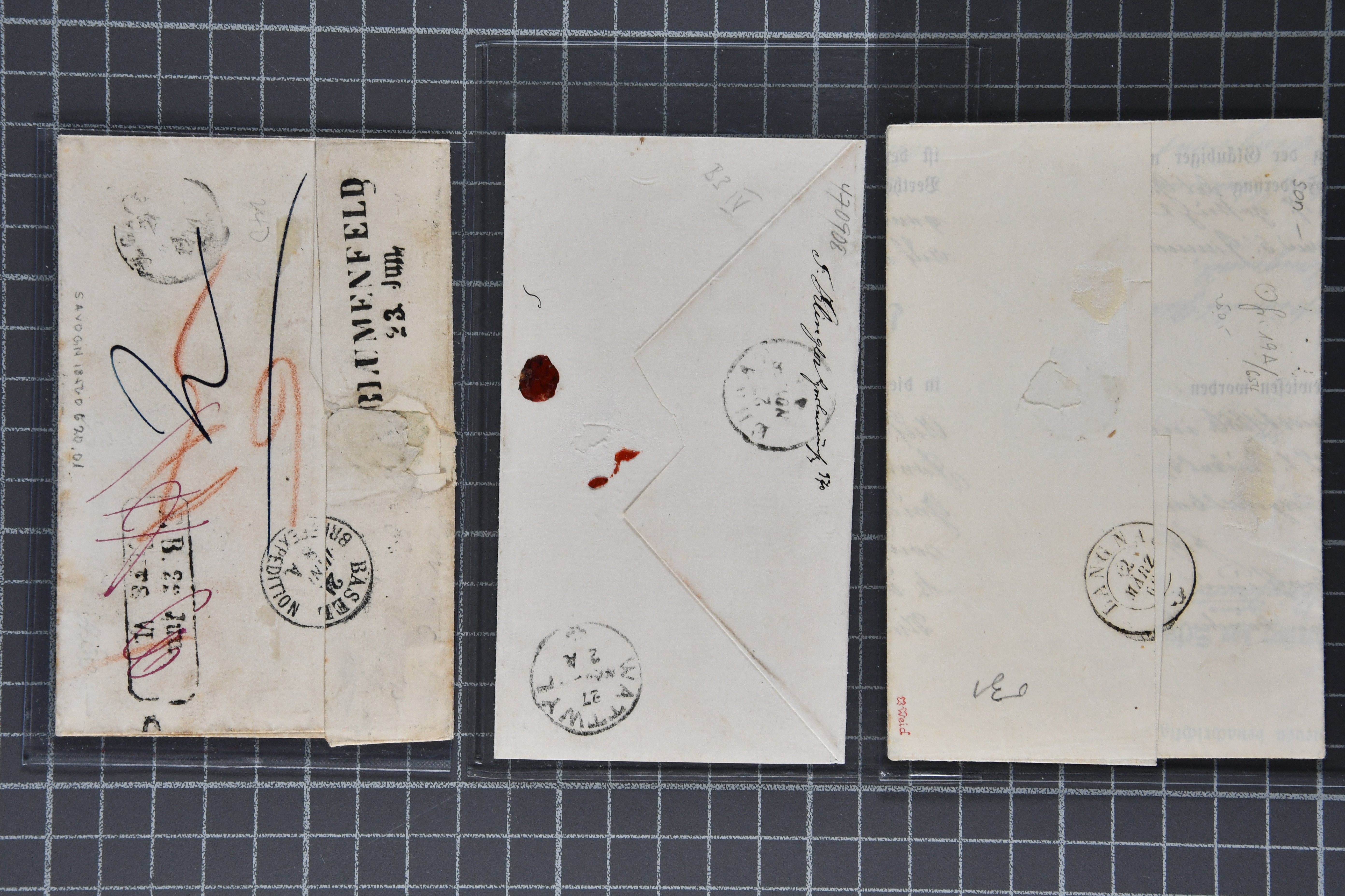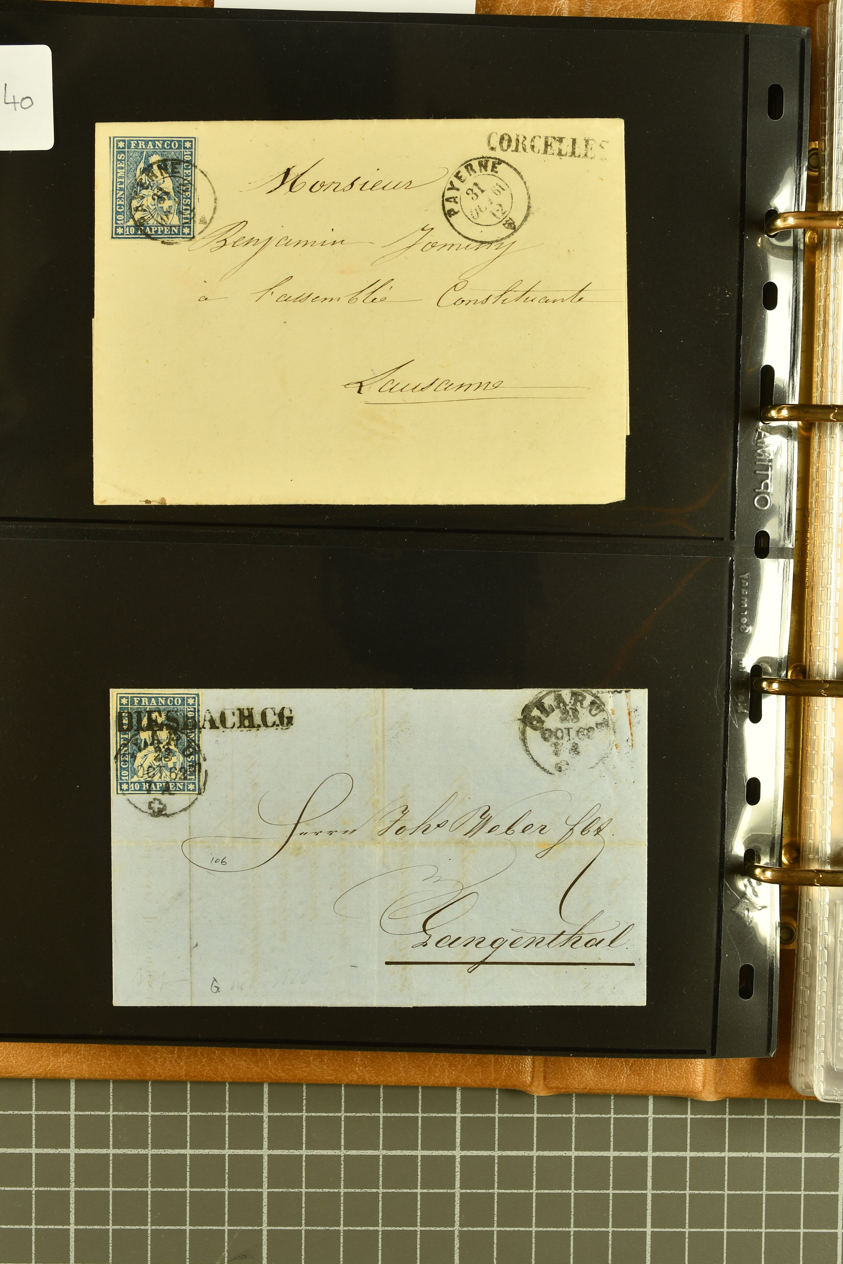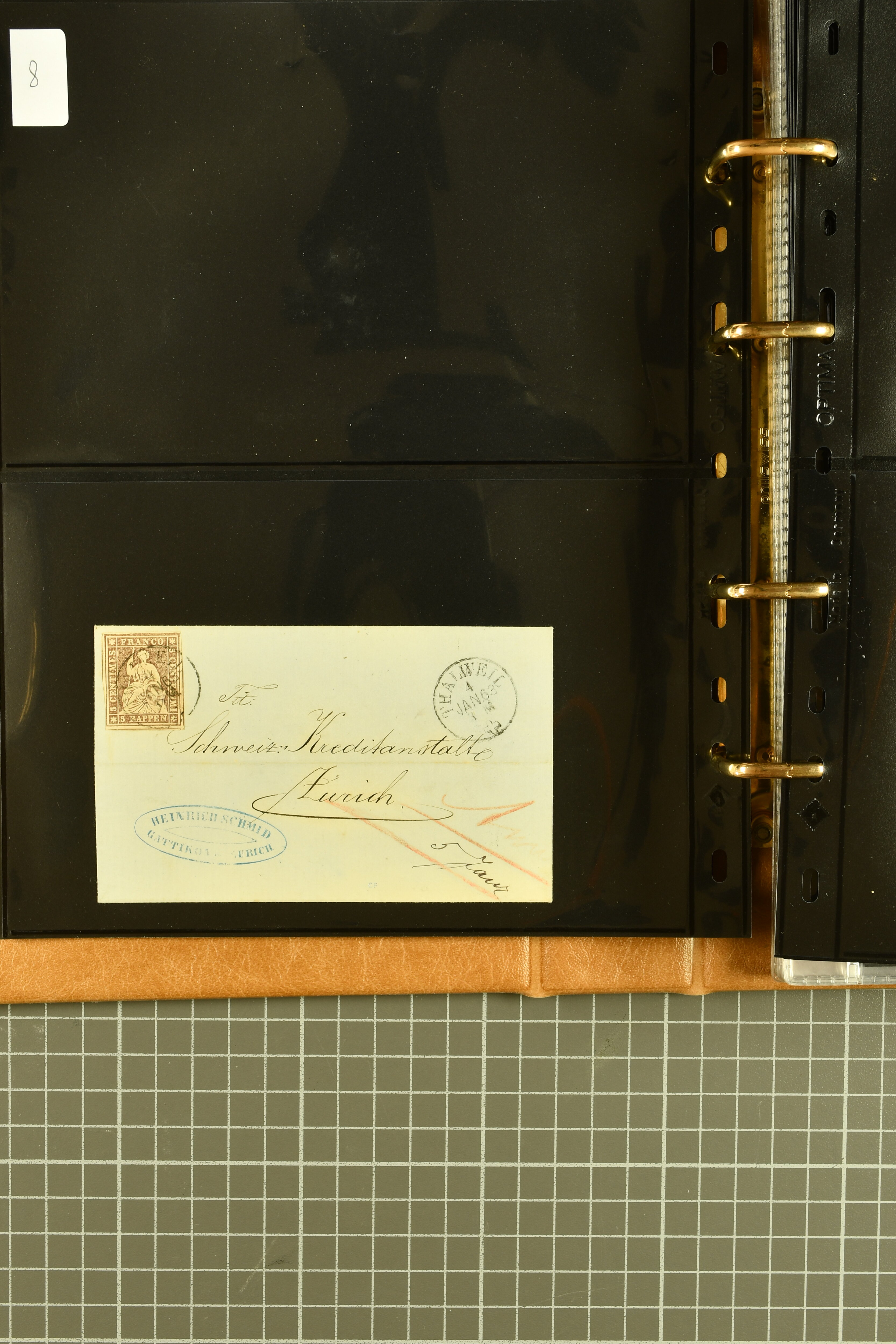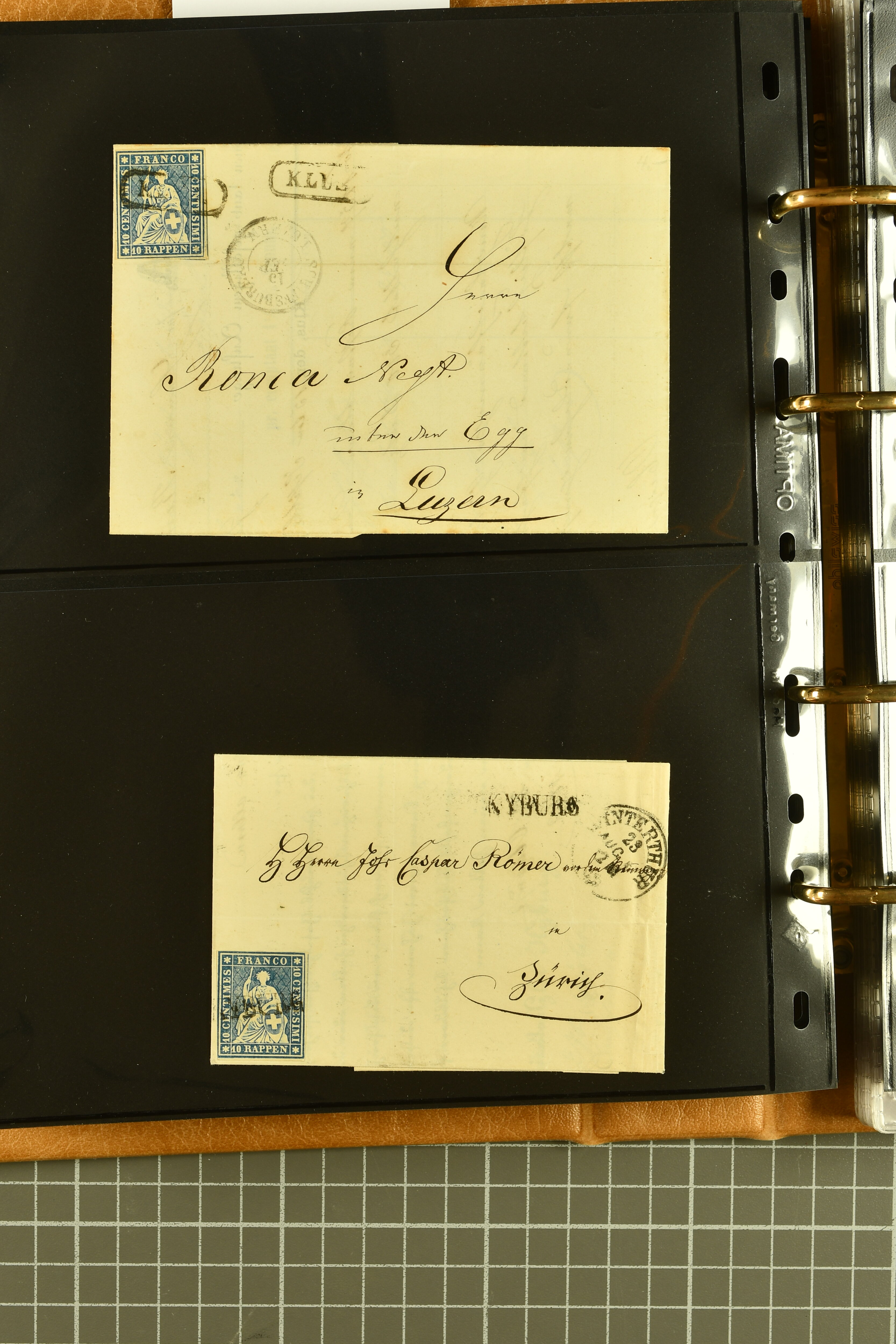 9789 cover image1854/62: Lot zehn meist hochwertige Strubelfrankaturen mit 10 Rp. hellpreussischblau (SBK 23Aa) auf Faltbrief von Andelfingen nach Winterthur, 10 Rp. dunkelpreussischblau (SBK 23A2), schön entw. mit blauer eidg. Raute auf Nachnahme-Briefteil nach Arth, 10 Rp. bräunlichrot (SBK 24Aa), zwei Einzelwerte zus. klar entw. mit blauer eidg. Raute mit nebenges. Stabstp. "BUTTISHOLZ" und gr. Zierkreisstp. "WILLISAU 17 NOV. 1854" auf Nachnahme-Faltbrief nach Dagmersellen, 10 Rp. rotkarmin (SBK 24A) mit Schmitzdruck der oberen Randlinie und breitem Bogenrand oben, zart entw. mit blauer eidg. Raute auf Faltbrief von Hochdorf nach Bulle, 10 Rp. grünlichblau (SBK 23Ca) mit breitem Bogenrand rechts auf Faltbrieflein von Bätterkinden nach Langnau, 10 Rp. grauultramarin auf dünnem Münchner Papier (SBK 23F) mit breitem Bogenrand rechts auf Faltbrief von Oensingen nach Olten, zwei Einzelfrankaturen der 15 Rp. rötlichkarmin auf ebensolchem Papier (SBK 24F) sowie 5 Rp. braun (SBK 22G), diagonal halbiert als sog. "Genfer Provisorium" auf Drucksachen-Vorderseite in der Stadt. Etwas unterschiedliche Erhaltung; ein Befund, fünf Atteste. SBK=CHF 13'600 (Image 1) (Image 2) (Image 3) (Image 4) (Image 5) (Image 6) (Image 7) (Image 8) (Image 9) (Image 10)