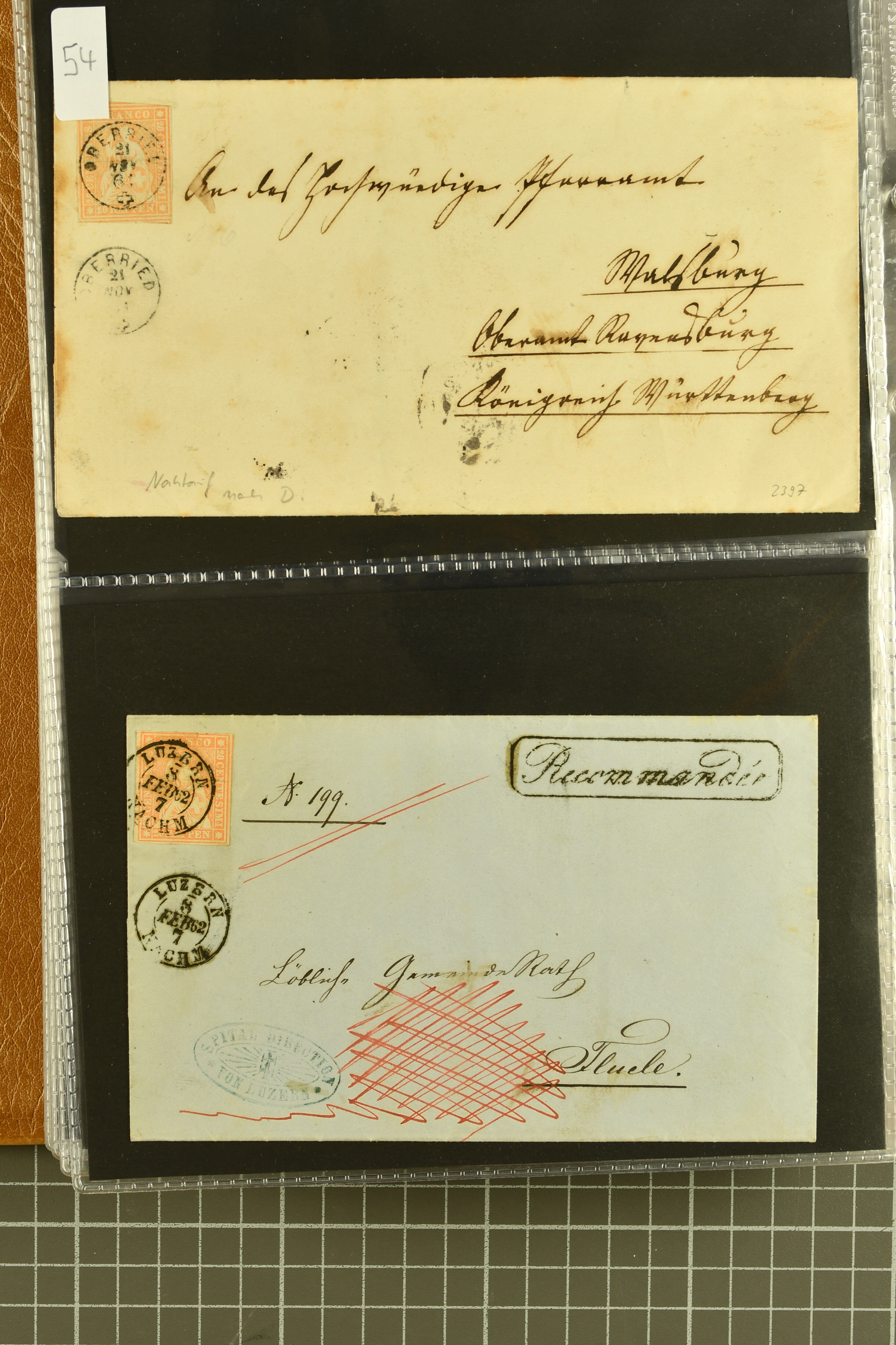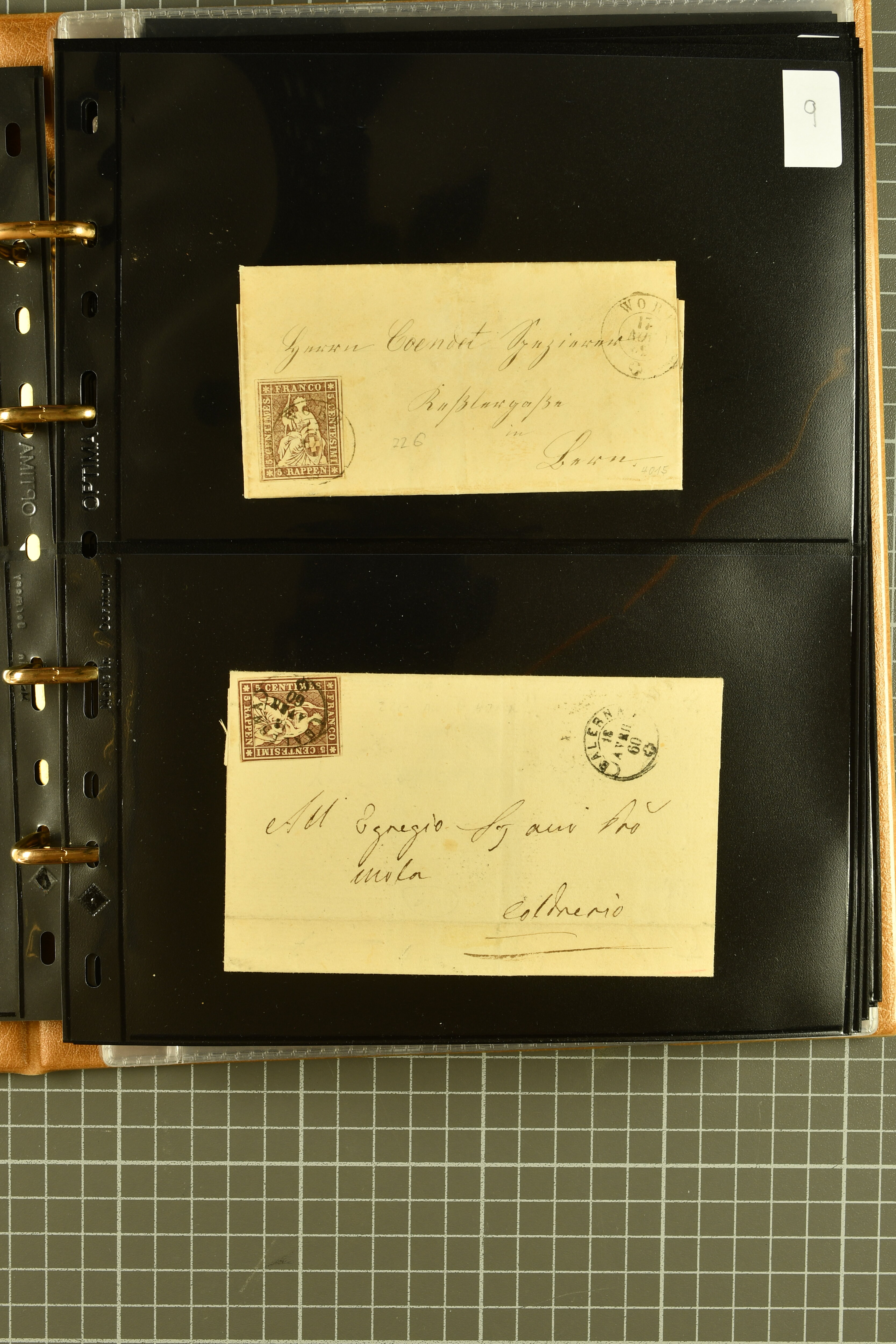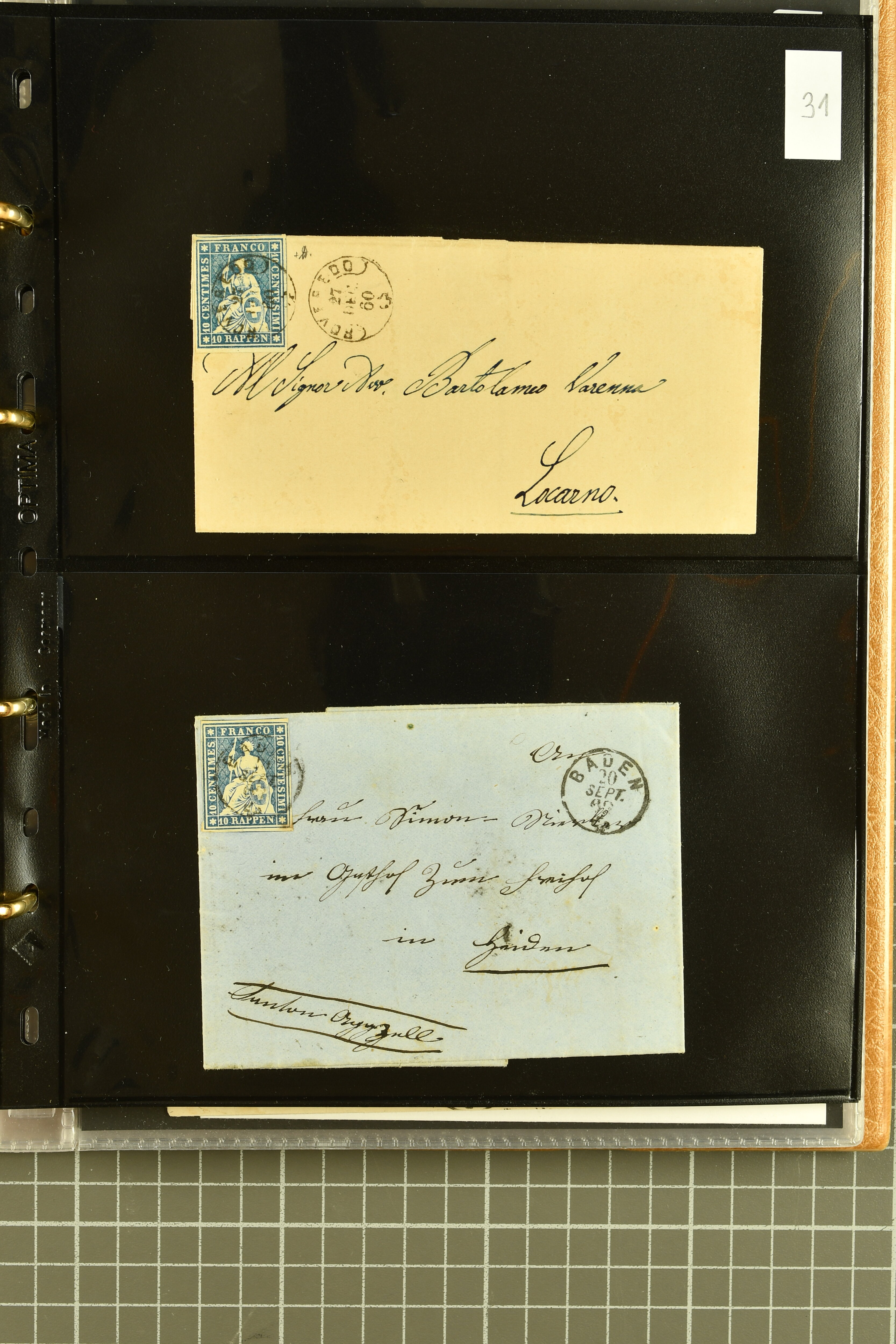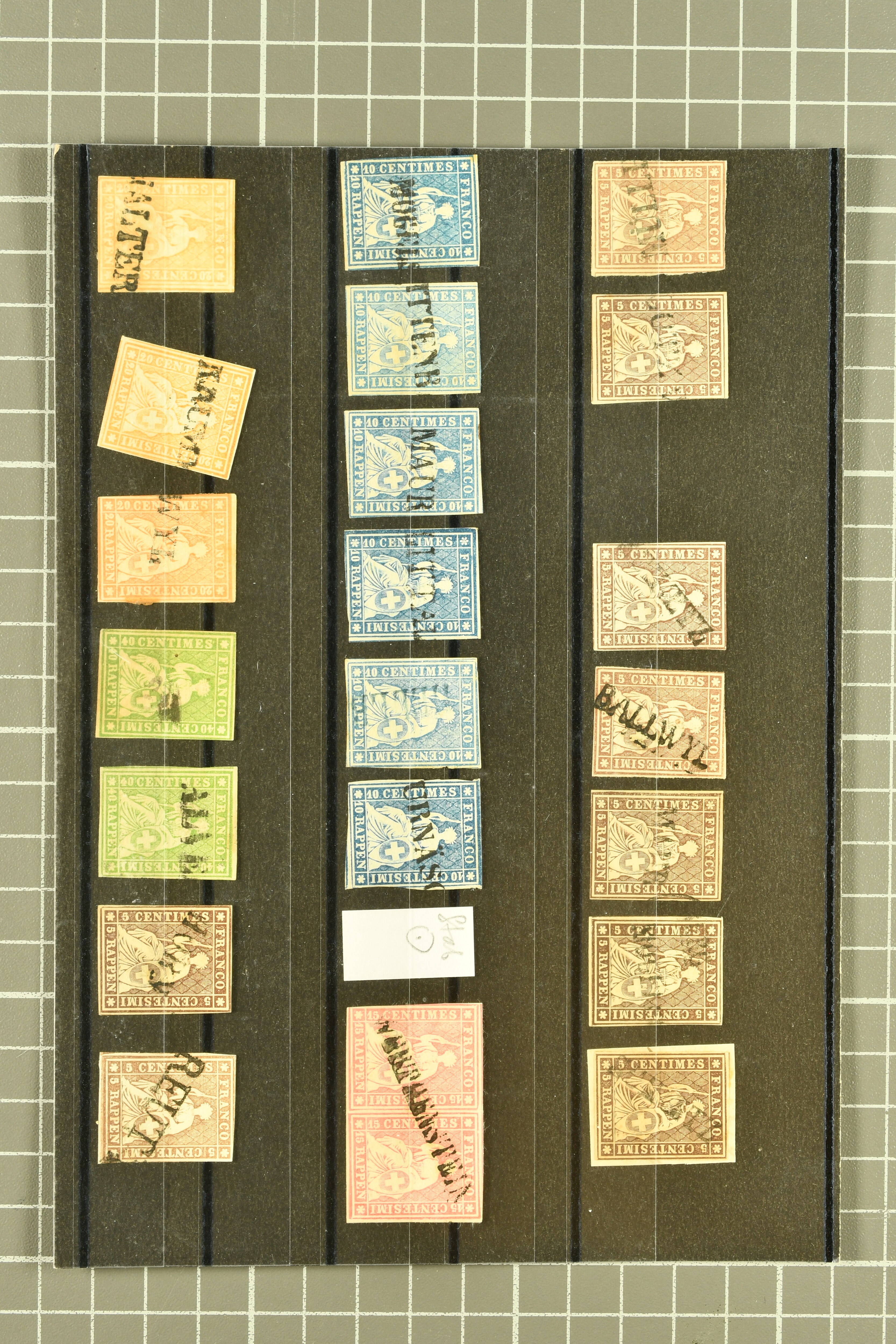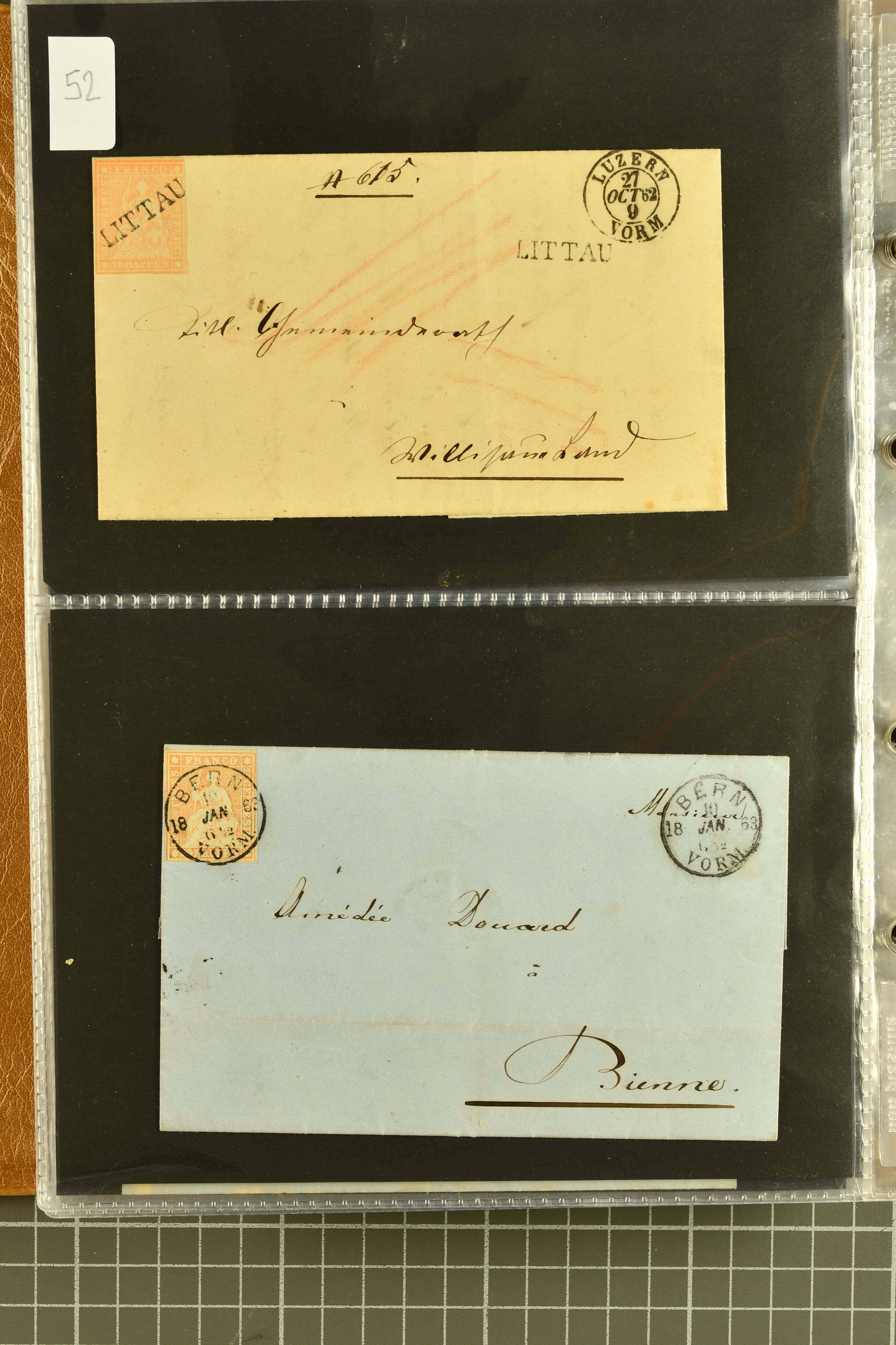 9789 cover image1854/62: Lot zehn meist hochwertige Strubelfrankaturen mit 10 Rp. hellpreussischblau (SBK 23Aa) auf Faltbrief von Andelfingen nach Winterthur, 10 Rp. dunkelpreussischblau (SBK 23A2), schön entw. mit blauer eidg. Raute auf Nachnahme-Briefteil nach Arth, 10 Rp. bräunlichrot (SBK 24Aa), zwei Einzelwerte zus. klar entw. mit blauer eidg. Raute mit nebenges. Stabstp. "BUTTISHOLZ" und gr. Zierkreisstp. "WILLISAU 17 NOV. 1854" auf Nachnahme-Faltbrief nach Dagmersellen, 10 Rp. rotkarmin (SBK 24A) mit Schmitzdruck der oberen Randlinie und breitem Bogenrand oben, zart entw. mit blauer eidg. Raute auf Faltbrief von Hochdorf nach Bulle, 10 Rp. grünlichblau (SBK 23Ca) mit breitem Bogenrand rechts auf Faltbrieflein von Bätterkinden nach Langnau, 10 Rp. grauultramarin auf dünnem Münchner Papier (SBK 23F) mit breitem Bogenrand rechts auf Faltbrief von Oensingen nach Olten, zwei Einzelfrankaturen der 15 Rp. rötlichkarmin auf ebensolchem Papier (SBK 24F) sowie 5 Rp. braun (SBK 22G), diagonal halbiert als sog. "Genfer Provisorium" auf Drucksachen-Vorderseite in der Stadt. Etwas unterschiedliche Erhaltung; ein Befund, fünf Atteste. SBK=CHF 13'600 (Image 1) (Image 2) (Image 3) (Image 4) (Image 5) (Image 6) (Image 7) (Image 8) (Image 9) (Image 10)