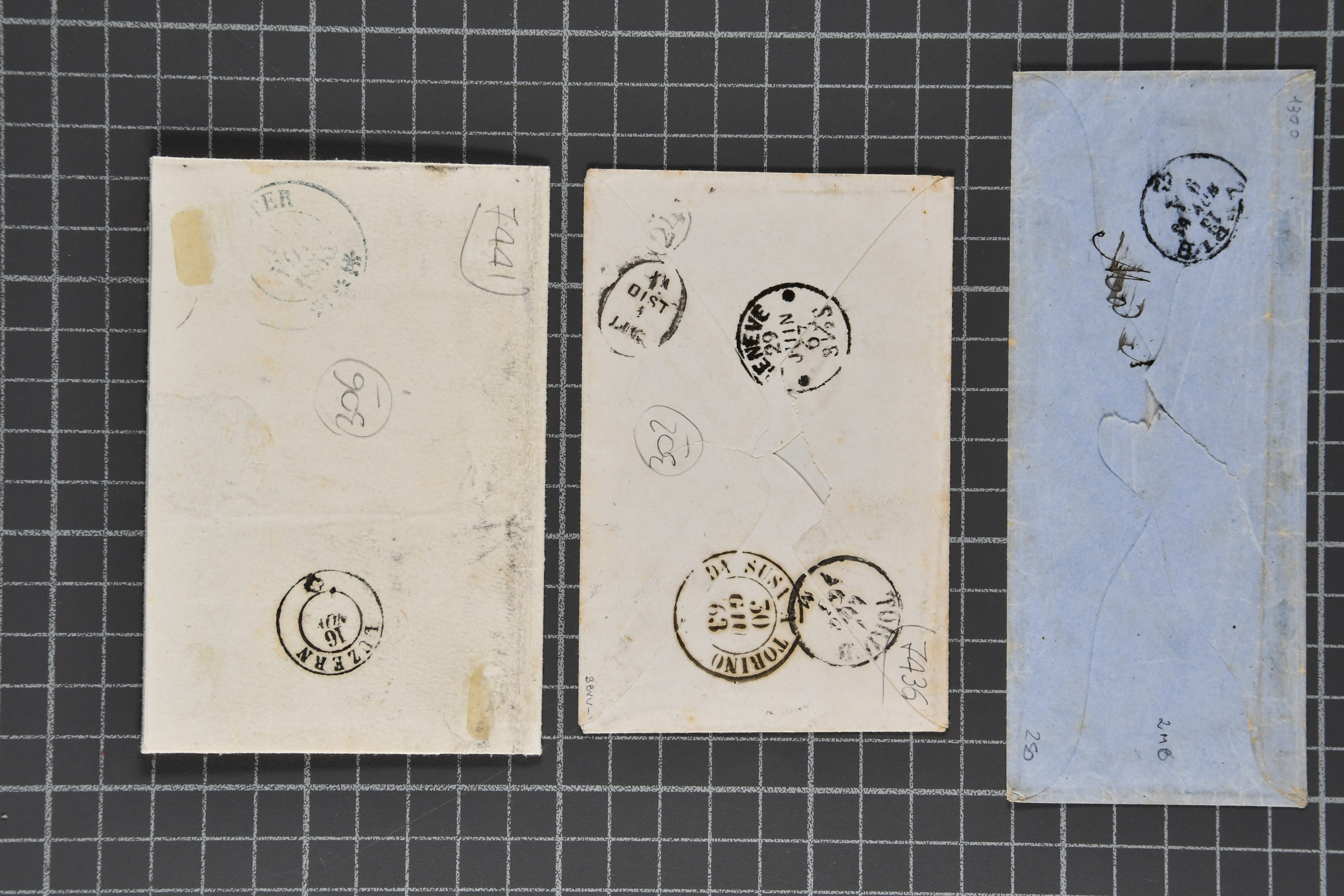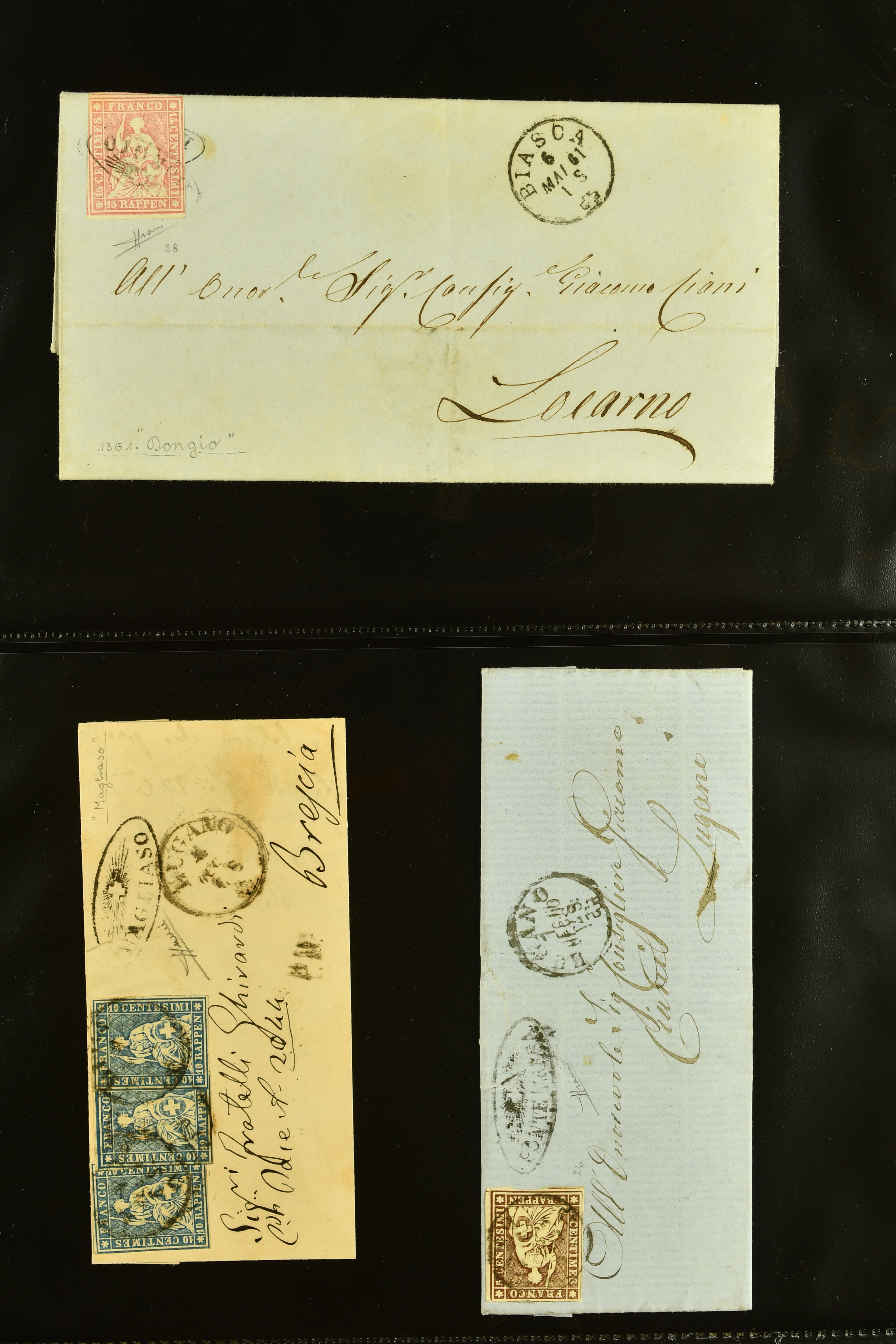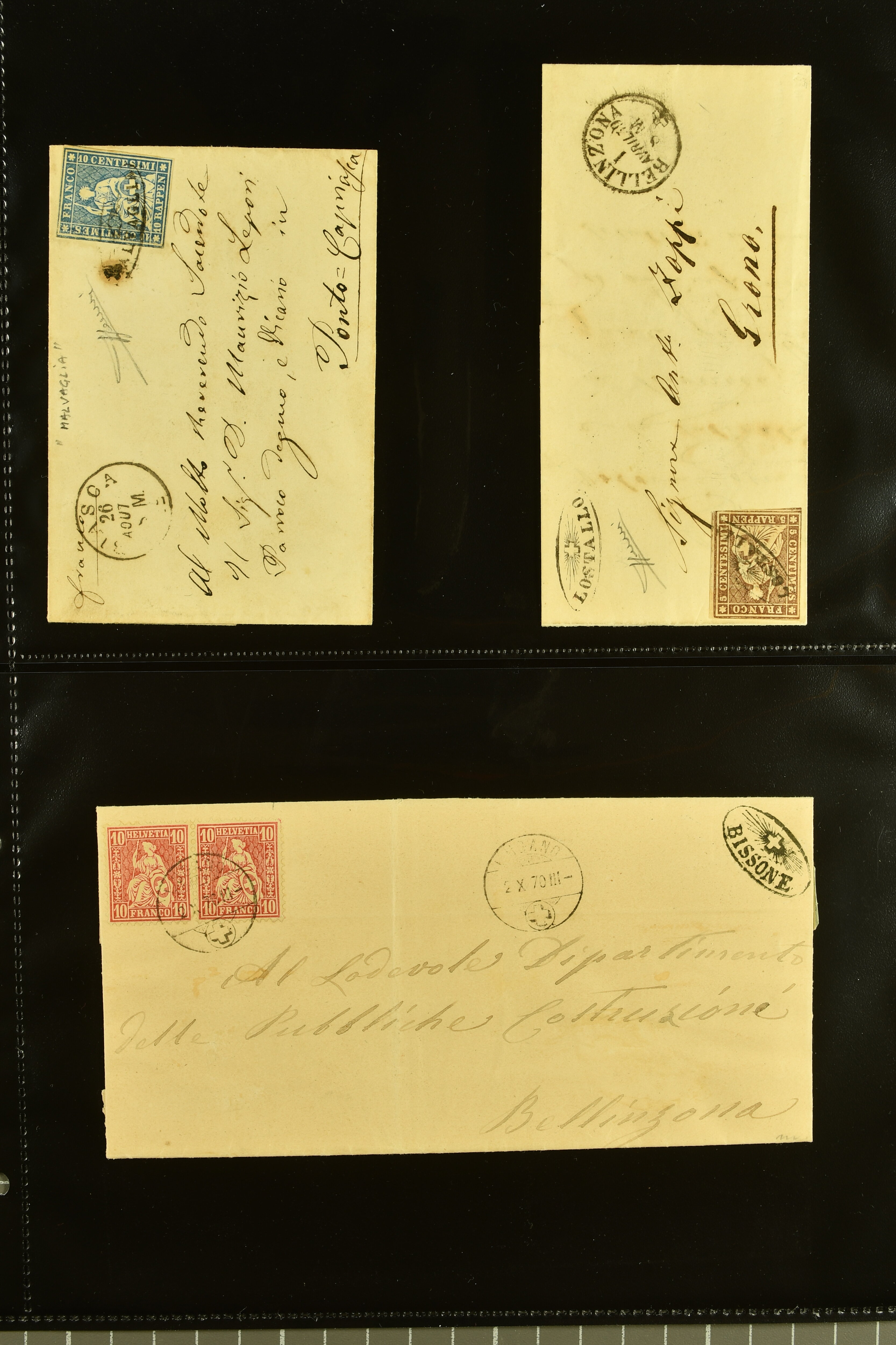 9790 cover image1859/70ca: Lot 10 Briefe mit Strubel resp. Sitzender mit Strahlenstempeln auf oder neben den Freimarken, alle im Tessin gelaufen, dabei Entwertungen von DONGIO, GORDOLA, LOTTIGNA, CEVIO, MALVAGLIA & LOSTALLO, nebengesetzt in MAGLIASO, PONTE TRESA, MADONNA DEL PIANO sowie BISSONE auf doppelgewichtigem Brief neben Paar der Sitzenden 10 Rp. rot mit Strahlenstempel BISSONE. In unterschiedlicher Erhaltung, aber eine ansprechende Gruppe dieser gesuchten Stempel (Image 1) (Image 2) (Image 3)