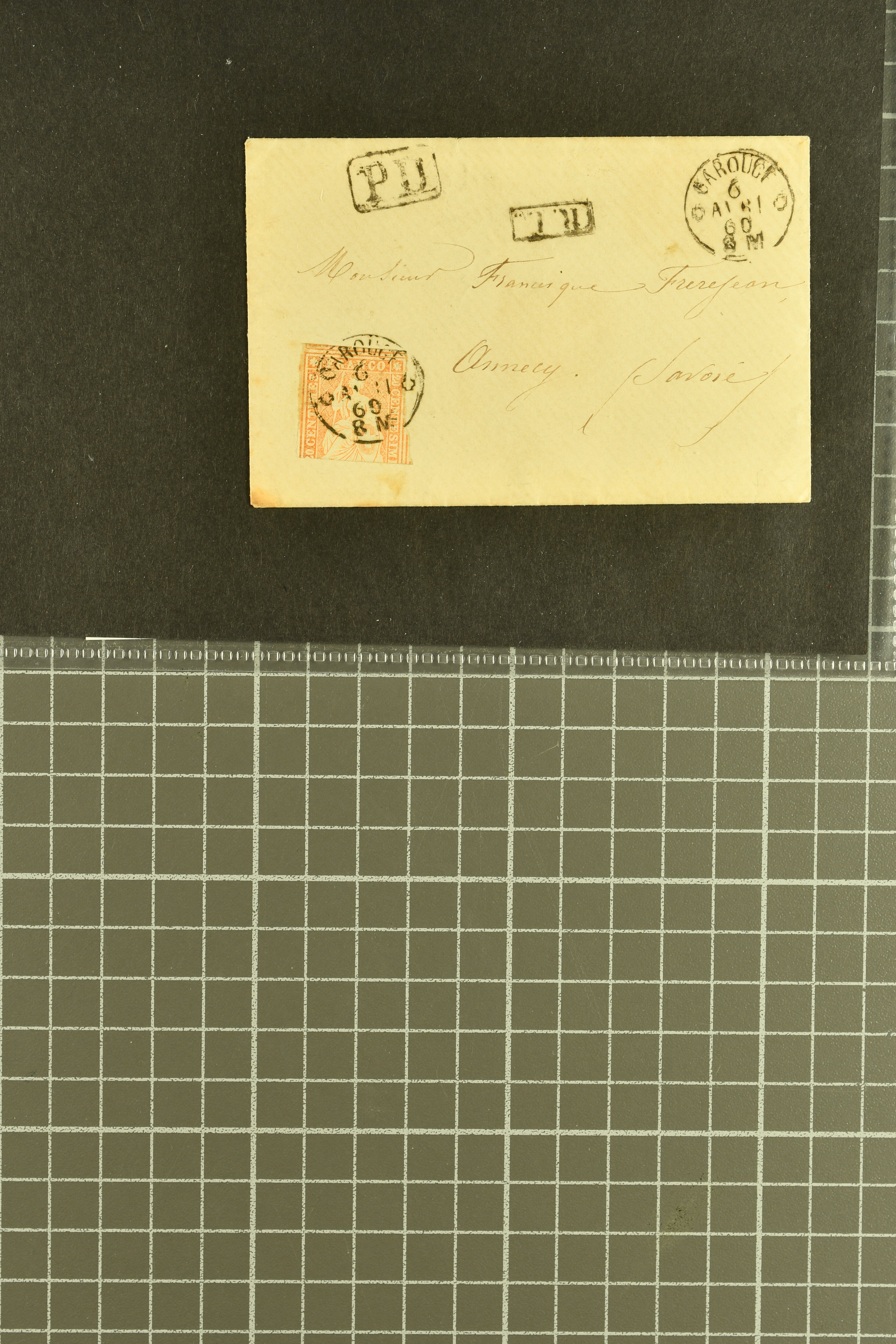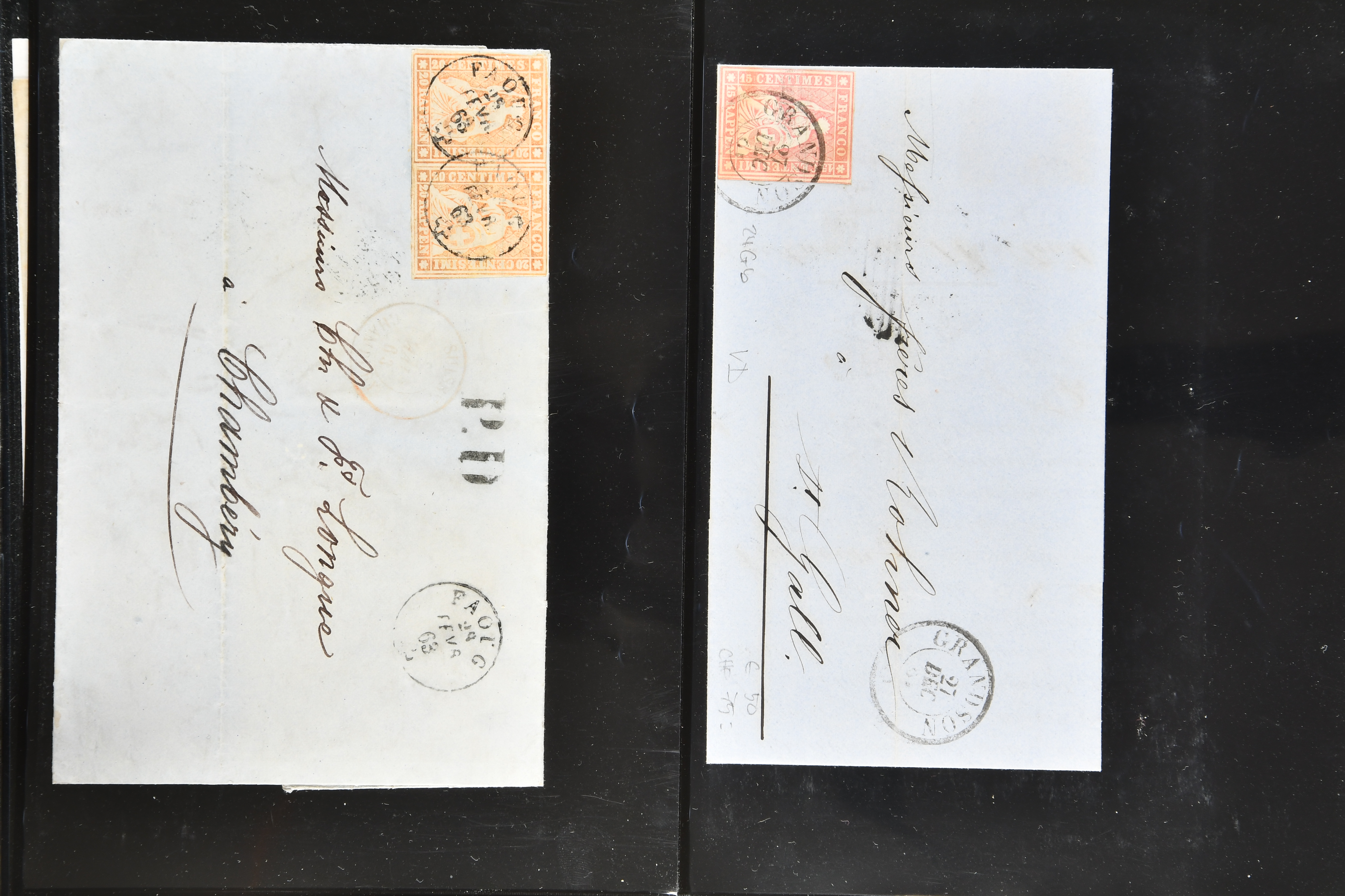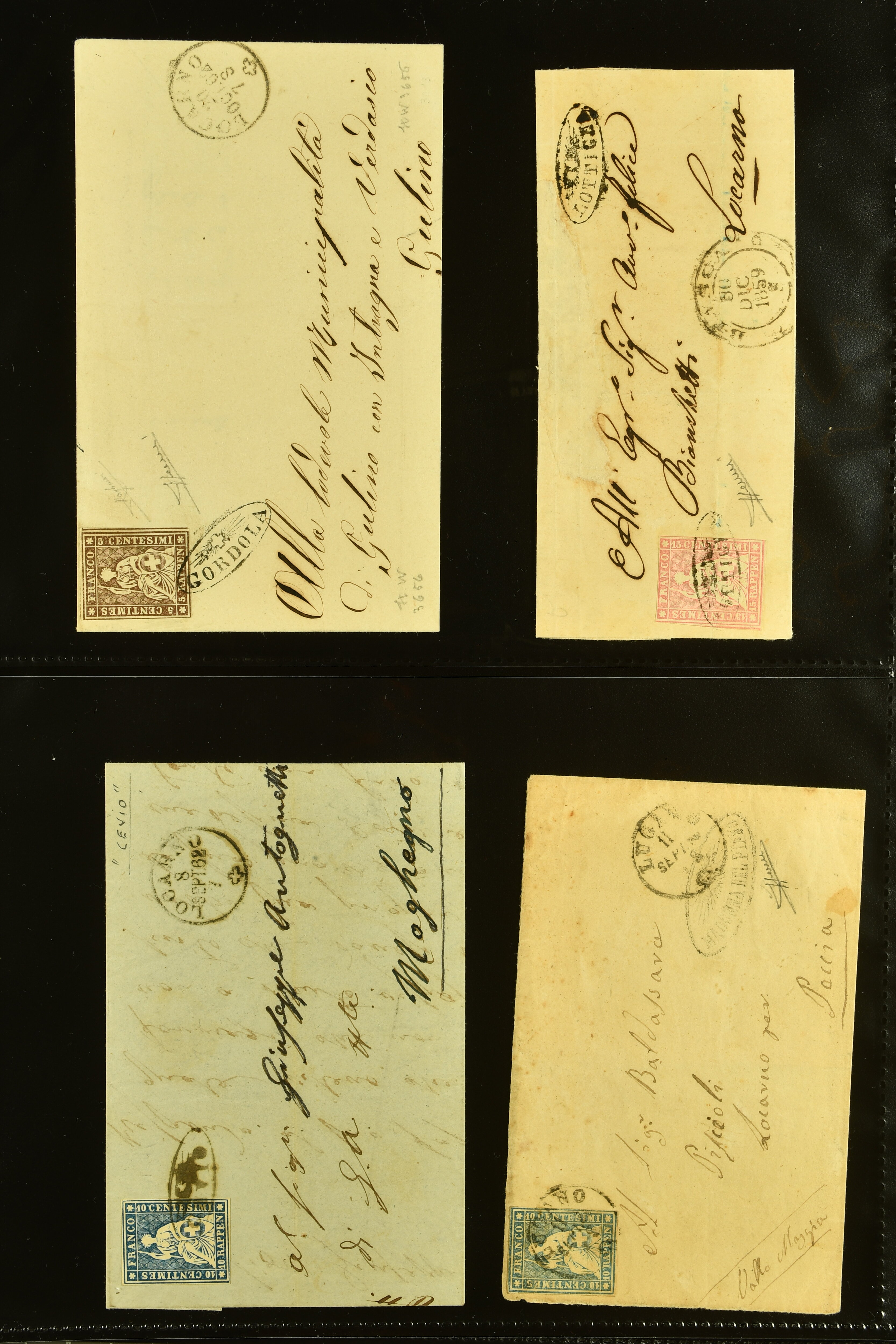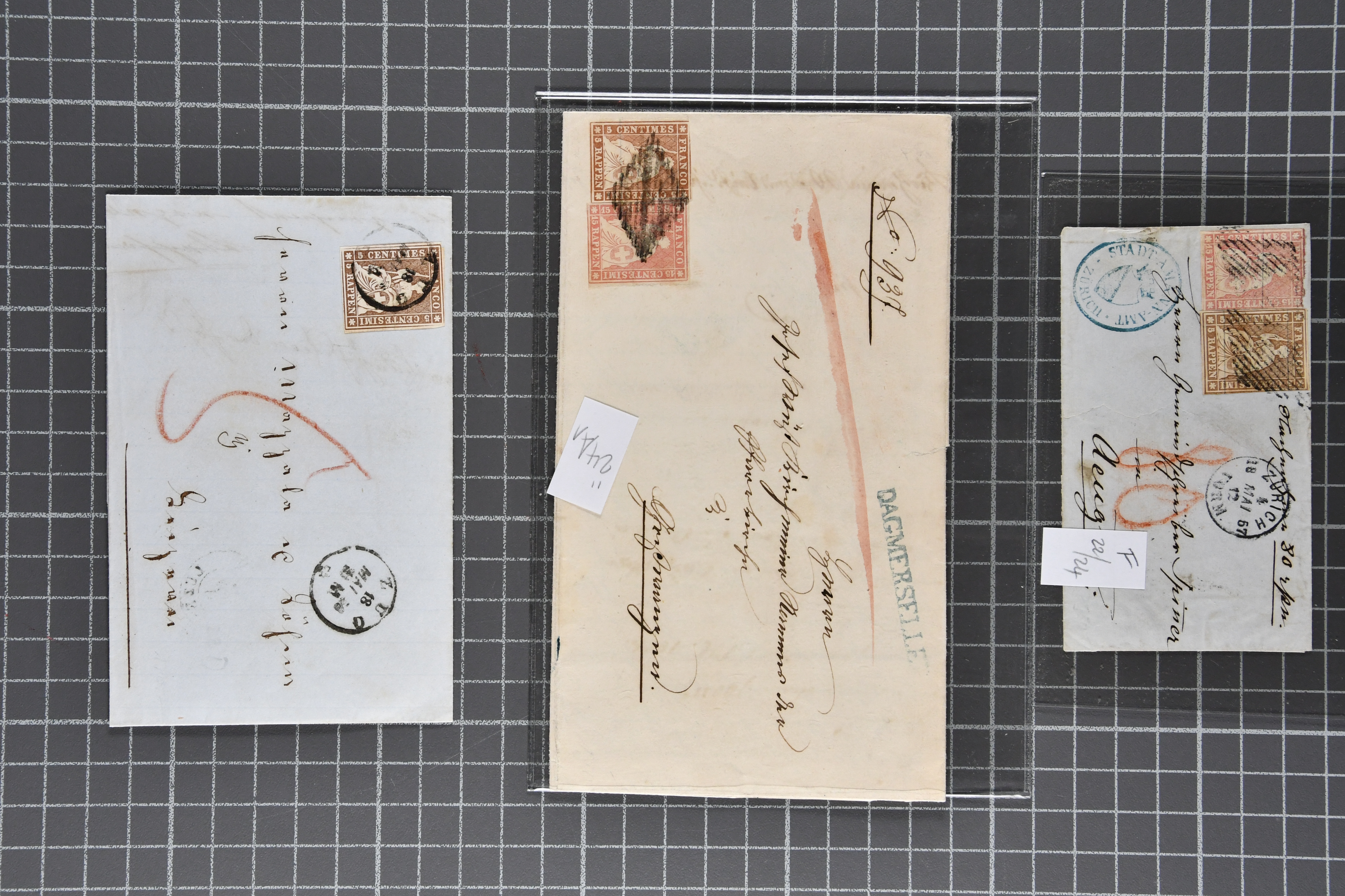 9790 cover image1859/70ca: Lot 10 Briefe mit Strubel resp. Sitzender mit Strahlenstempeln auf oder neben den Freimarken, alle im Tessin gelaufen, dabei Entwertungen von DONGIO, GORDOLA, LOTTIGNA, CEVIO, MALVAGLIA & LOSTALLO, nebengesetzt in MAGLIASO, PONTE TRESA, MADONNA DEL PIANO sowie BISSONE auf doppelgewichtigem Brief neben Paar der Sitzenden 10 Rp. rot mit Strahlenstempel BISSONE. In unterschiedlicher Erhaltung, aber eine ansprechende Gruppe dieser gesuchten Stempel (Image 1) (Image 2) (Image 3)