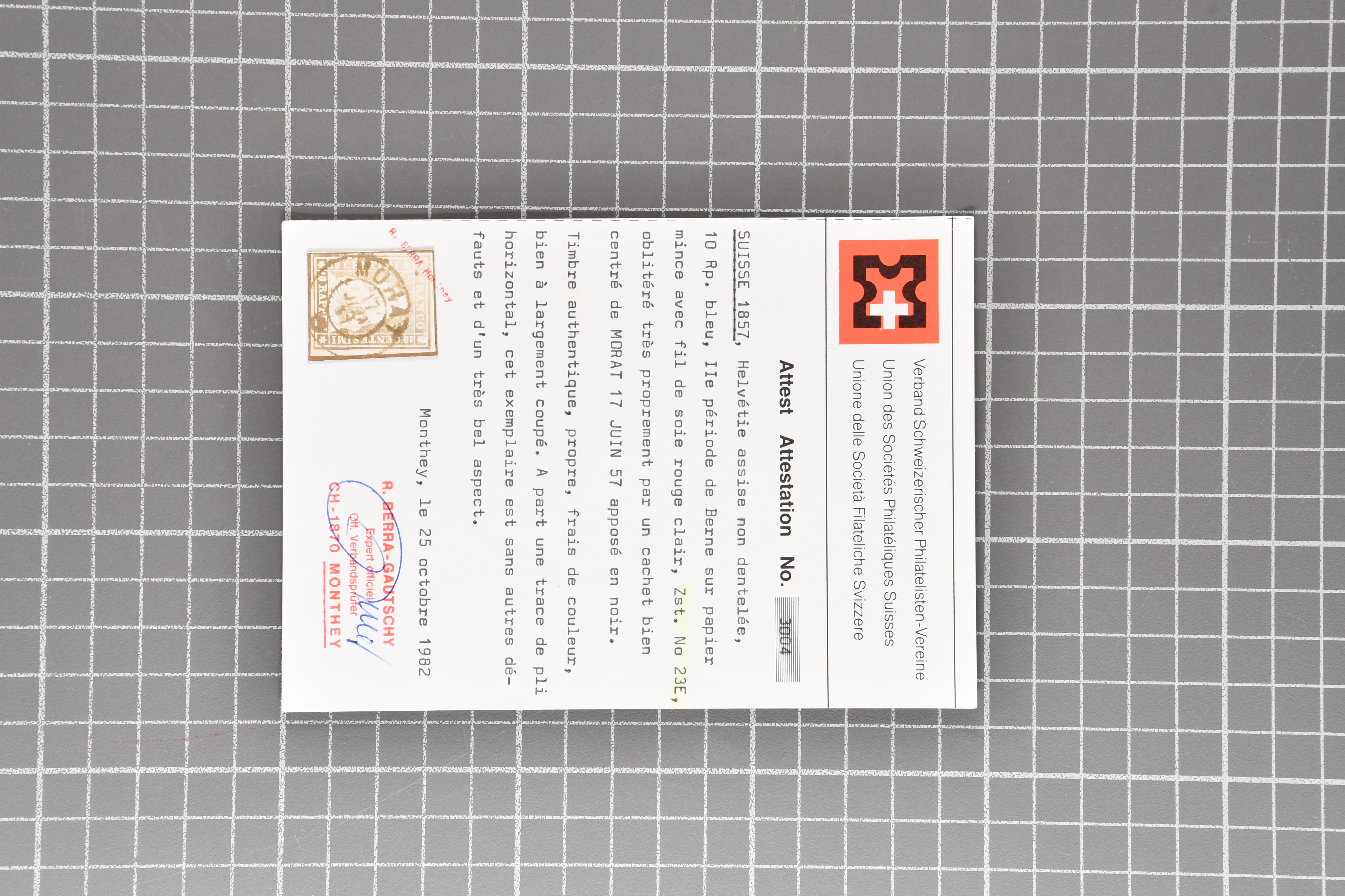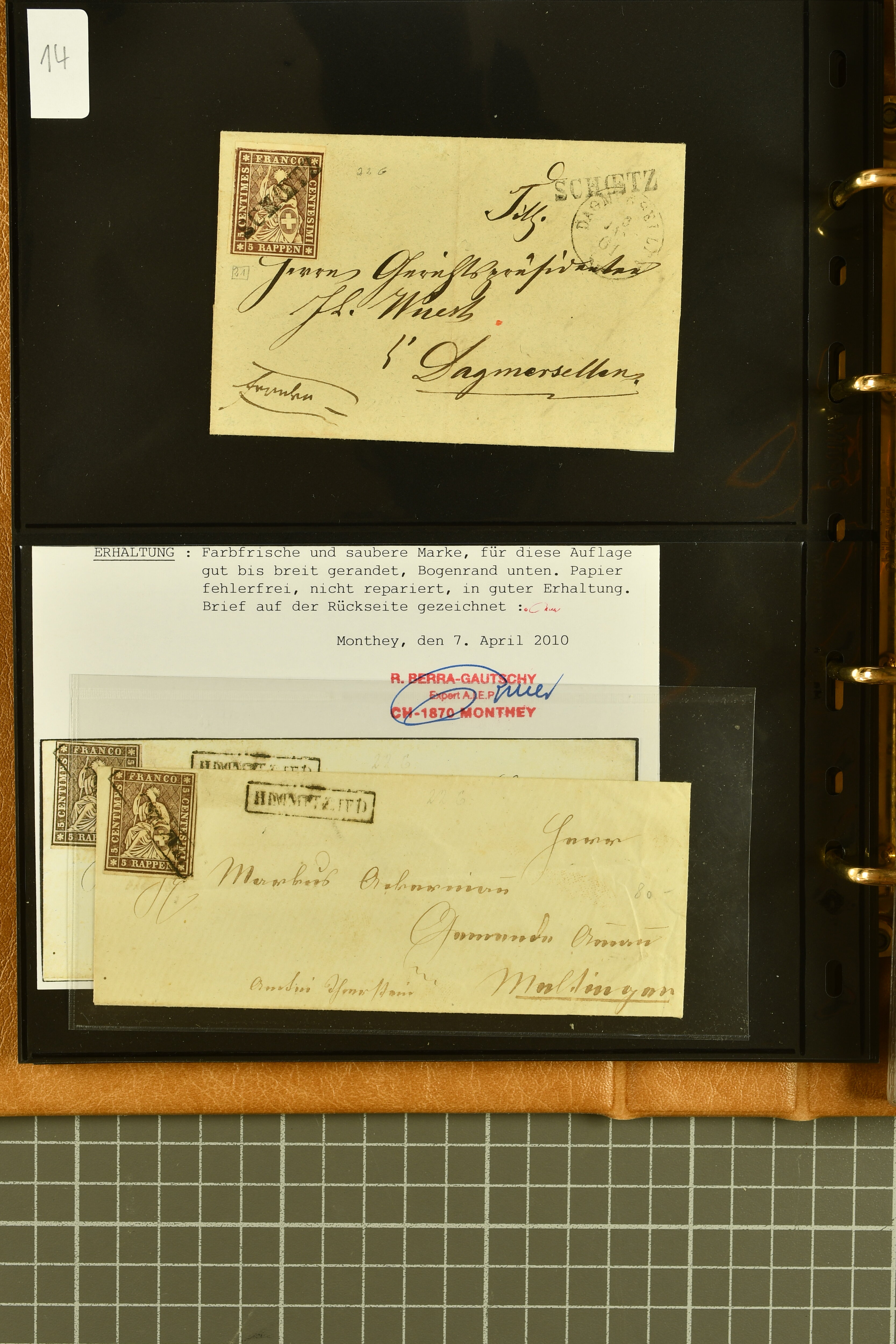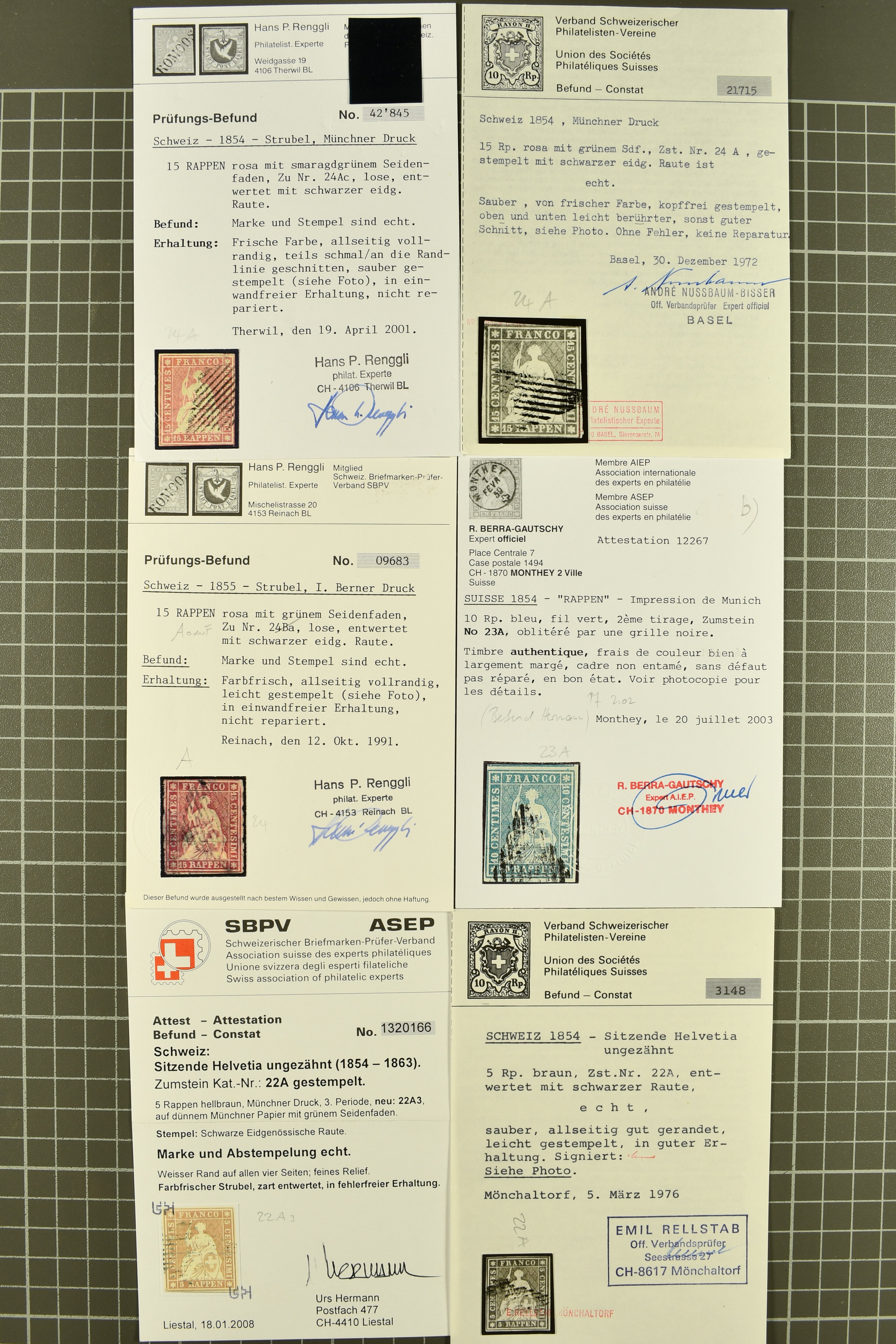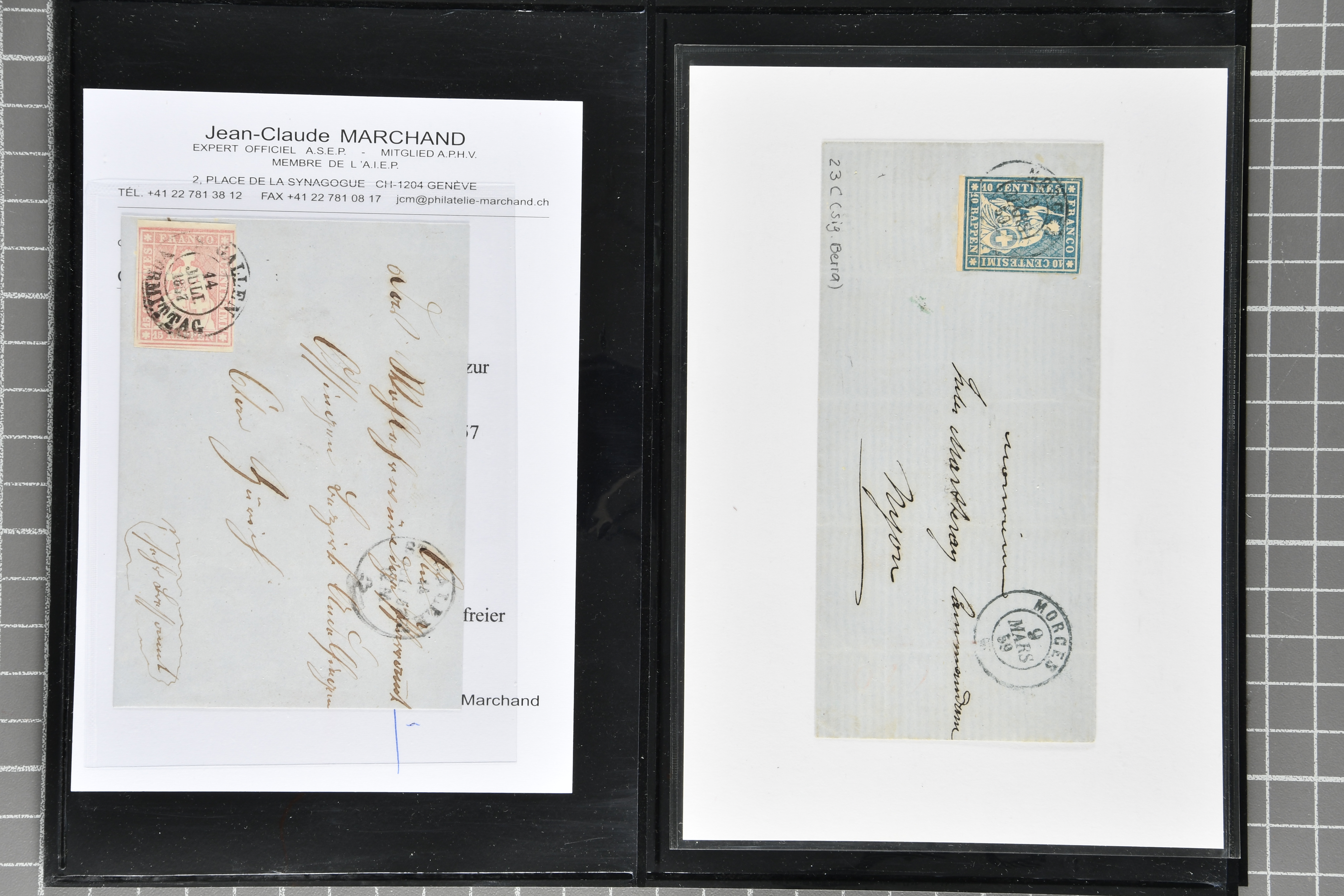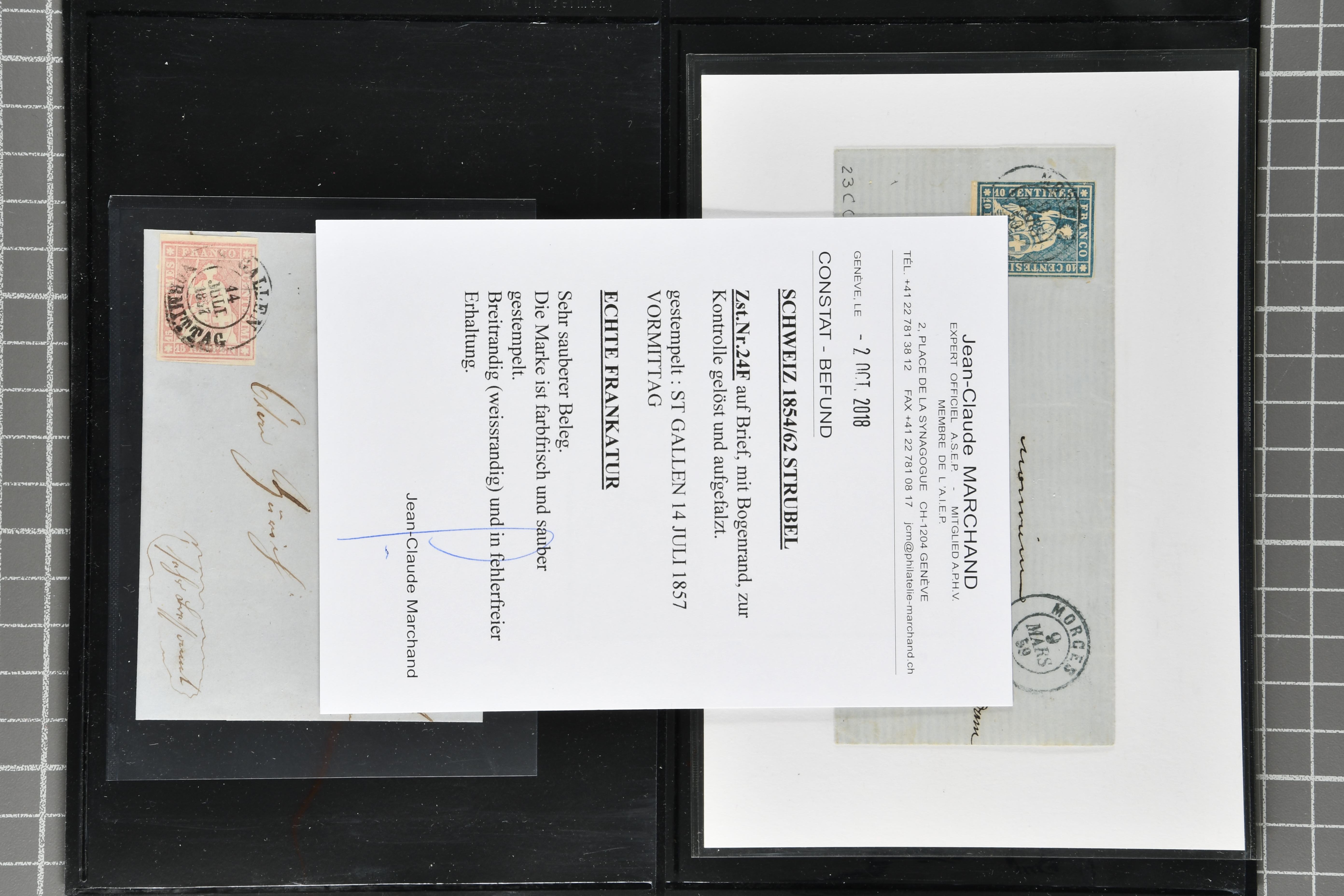 9776 image1854/62: Ausgesuchte Partie elf Einzelmarken, zwei Briefstücke und ein Brief. Dabei seltenere Werte wie weissrandige 10 Rp. hellpreussischblau (SBK 23Aa) oder ebenfalls weissrandige 1 Fr. grau (SBK 27C), Einheiten wie 5 Rp. graubraun auf dünnem Münchner Papier (SBK 22F) im waagr. Dreierstreifen, Frankaturen wie 15 Rp. rötlichkarmin auf ebensolchem Papier (SBK 24F) auf frischem Faltbrief von Rorschach nach Chur sowie Entwertungen wie diverse Stabstempel, schwarze Genfer Raute oder seltener "Tessiner" Zierkreisstempel "BIASCA 2 FEB 1858 S" auf Briefstück mit 15 Rp. karmin (SBK 24D). Ausserdem diverse überrandige Ausnahmestücke oder solche mit Bogenrand. Eine attraktive Zusammenstellung in guter bis sehr guter Erhaltung, drei Befunde, fünf Atteste. SBK=CHF 10'000+ (Image 1) (Image 2) (Image 3)