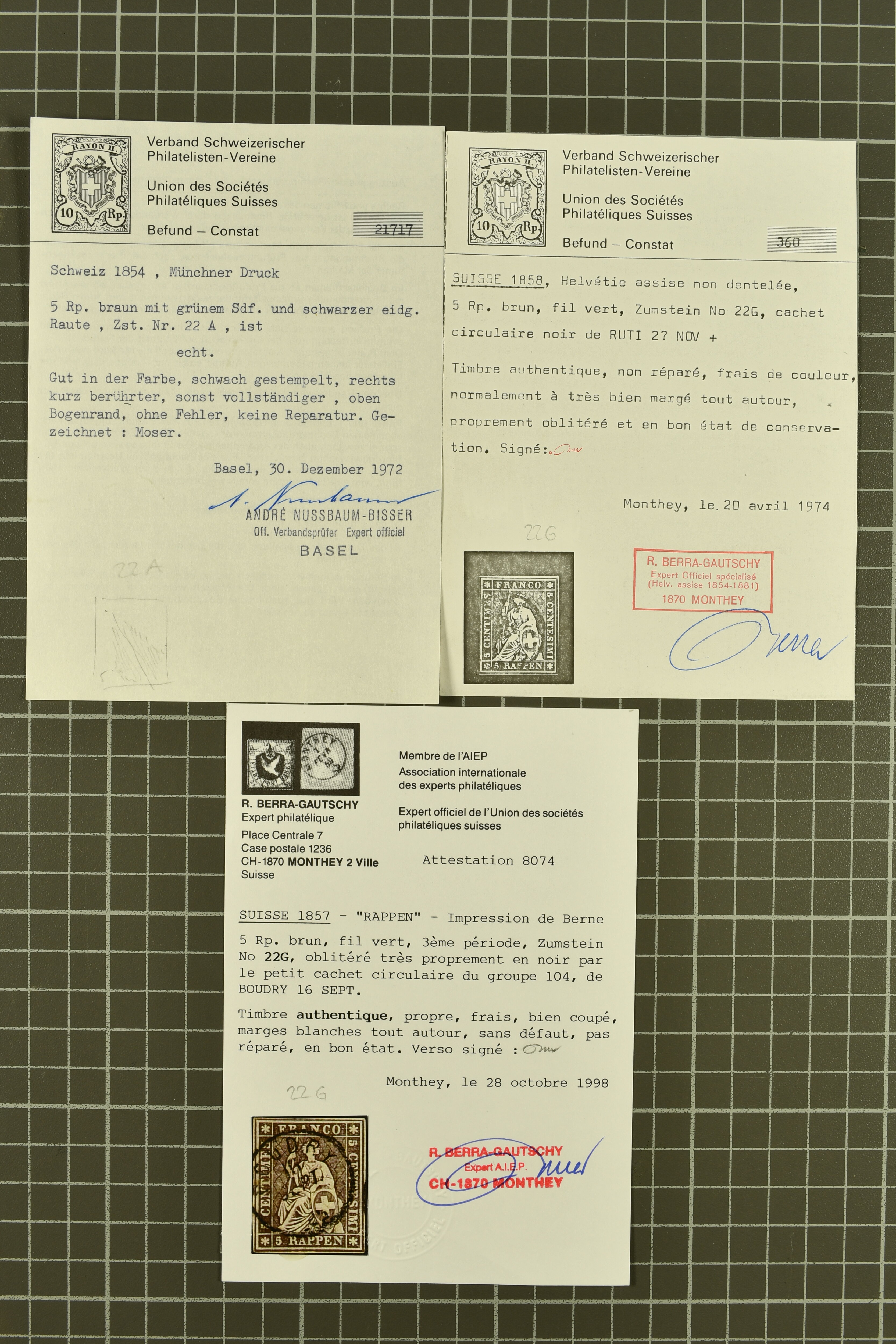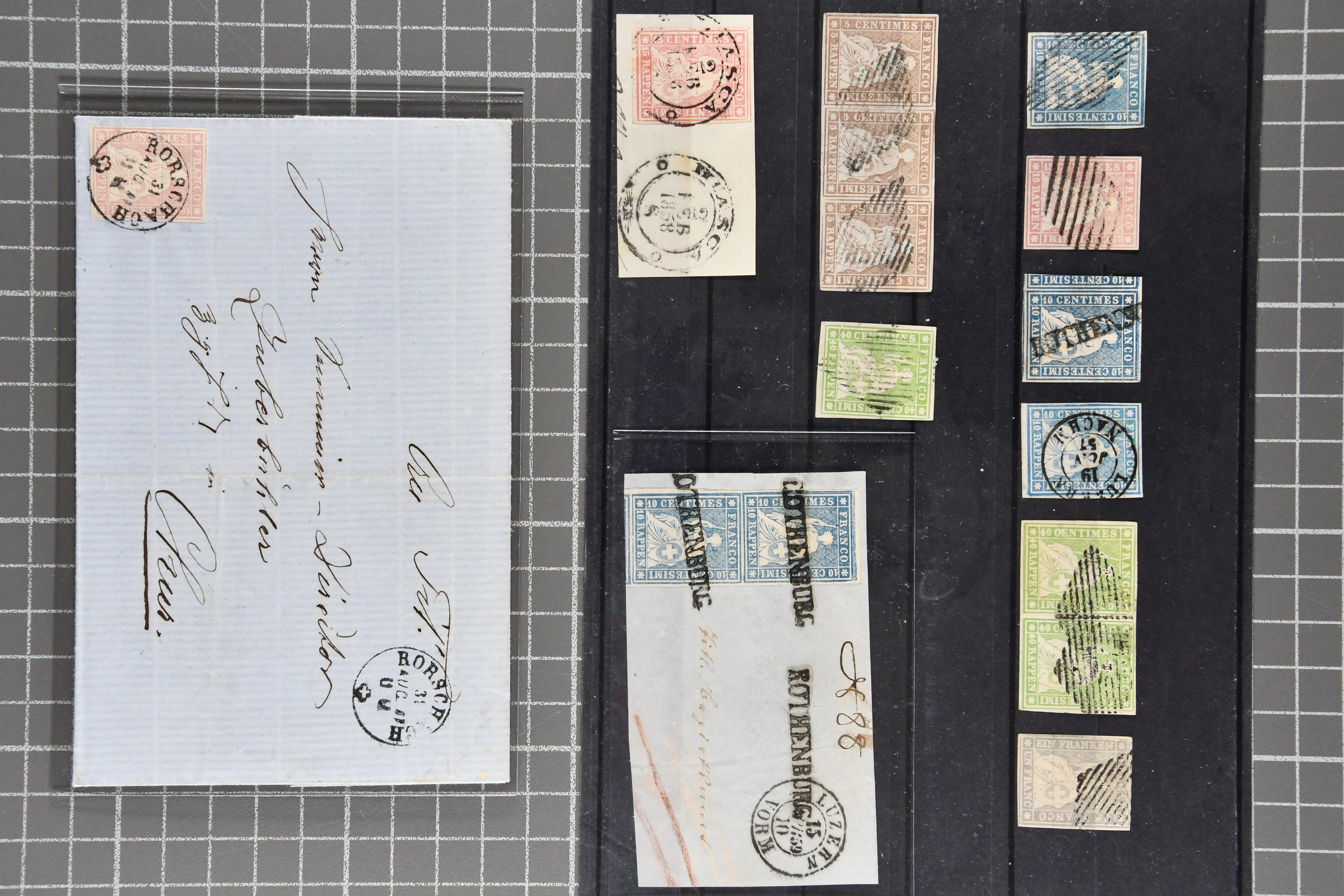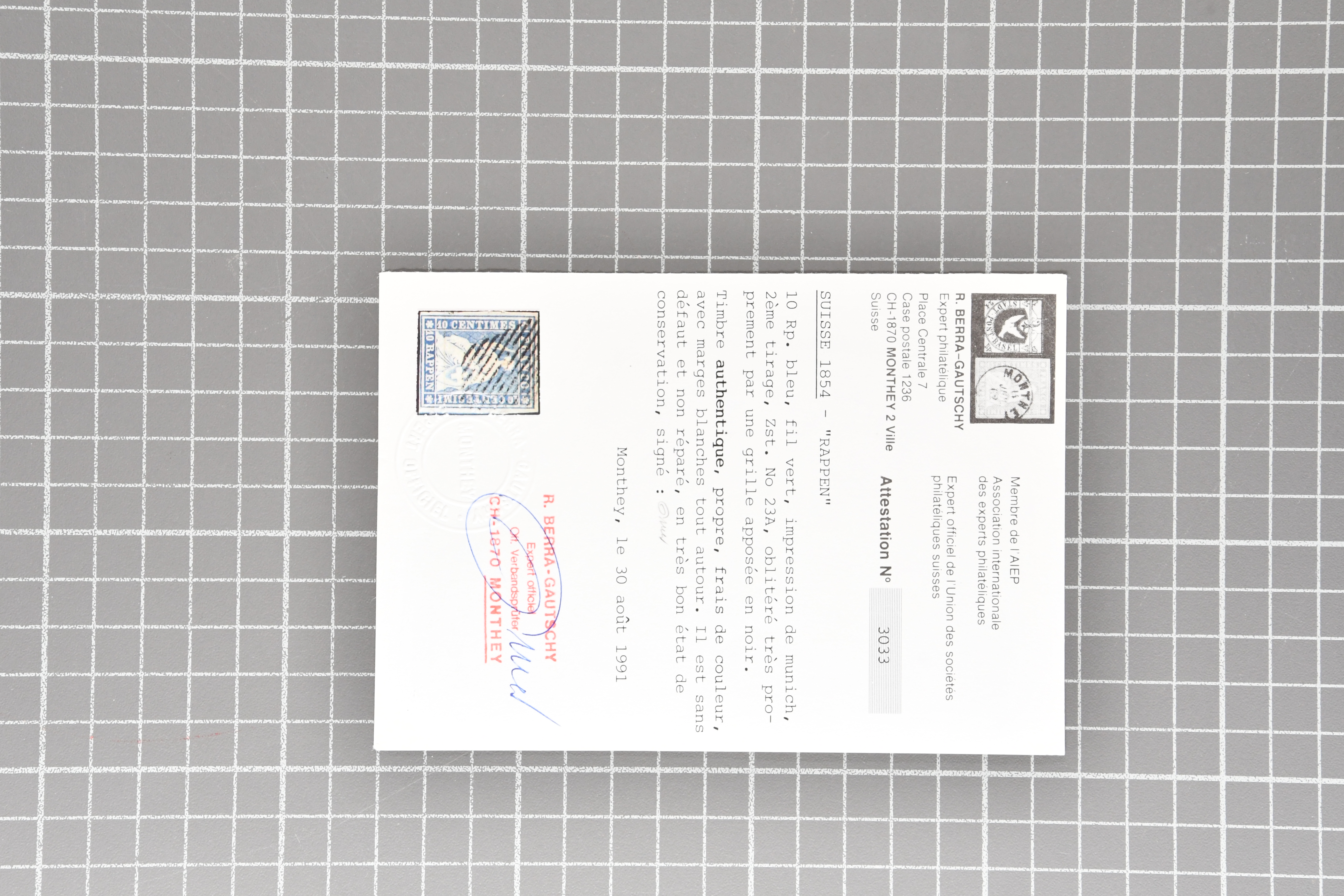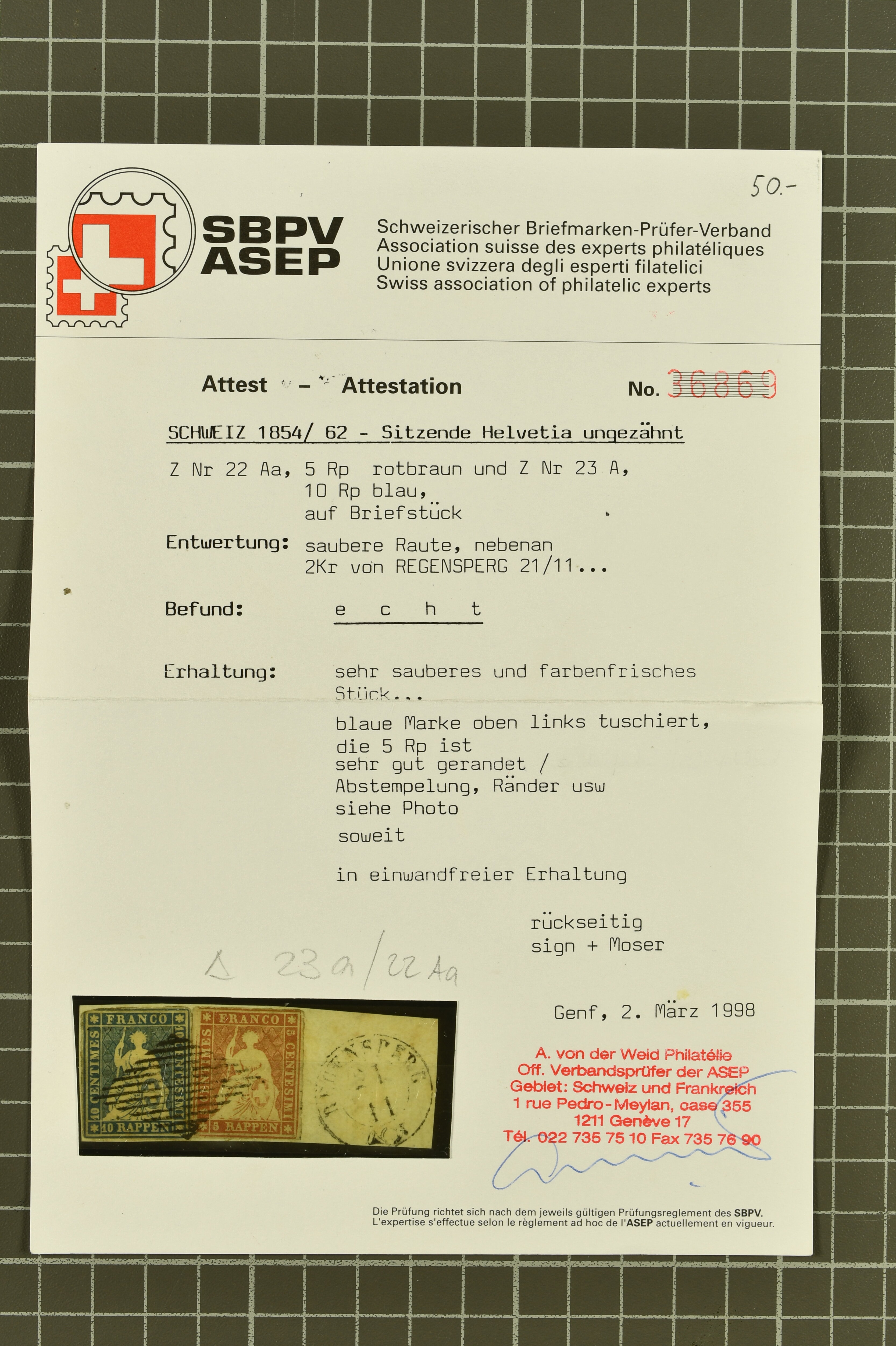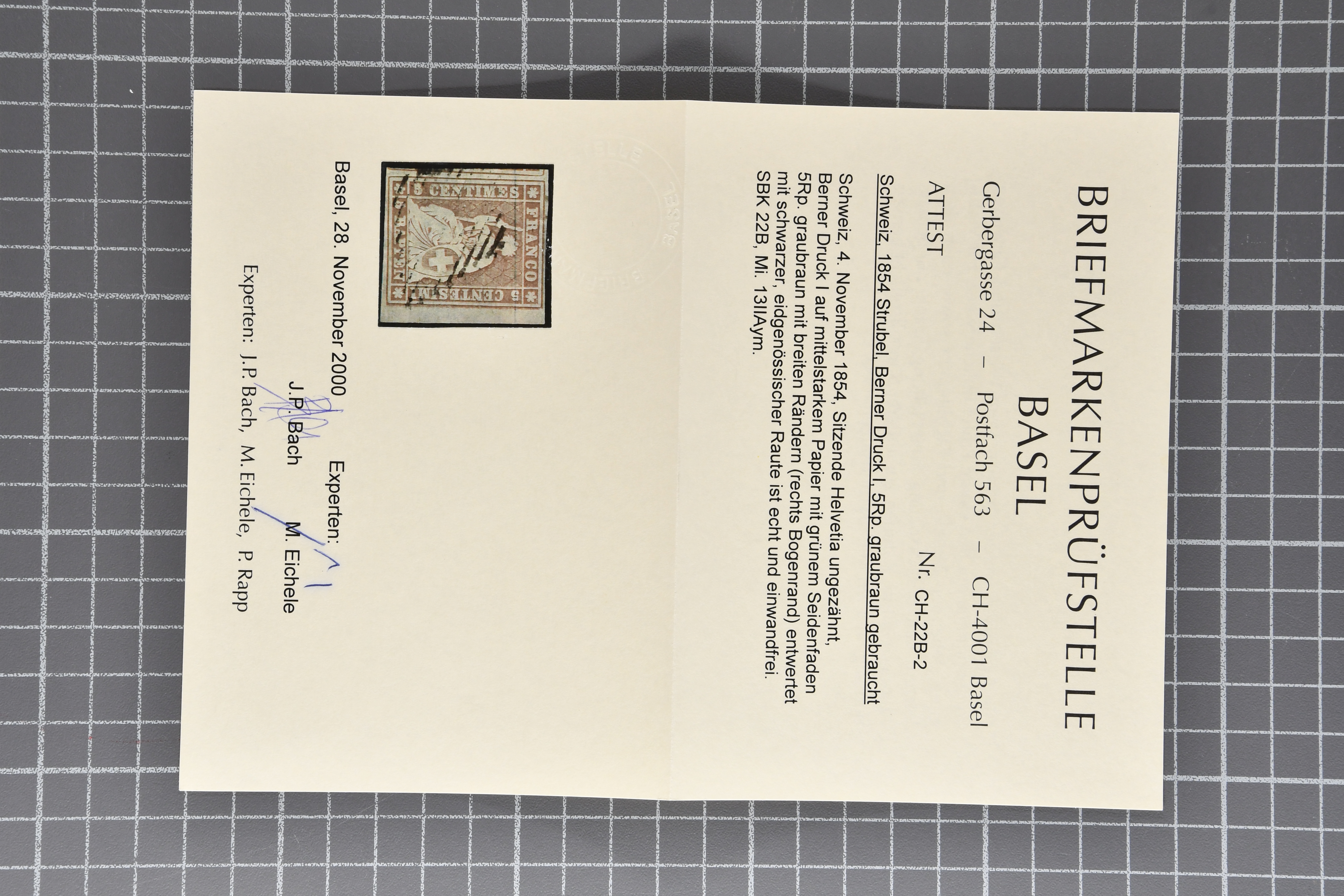 9776 image1854/62: Ausgesuchte Partie elf Einzelmarken, zwei Briefstücke und ein Brief. Dabei seltenere Werte wie weissrandige 10 Rp. hellpreussischblau (SBK 23Aa) oder ebenfalls weissrandige 1 Fr. grau (SBK 27C), Einheiten wie 5 Rp. graubraun auf dünnem Münchner Papier (SBK 22F) im waagr. Dreierstreifen, Frankaturen wie 15 Rp. rötlichkarmin auf ebensolchem Papier (SBK 24F) auf frischem Faltbrief von Rorschach nach Chur sowie Entwertungen wie diverse Stabstempel, schwarze Genfer Raute oder seltener "Tessiner" Zierkreisstempel "BIASCA 2 FEB 1858 S" auf Briefstück mit 15 Rp. karmin (SBK 24D). Ausserdem diverse überrandige Ausnahmestücke oder solche mit Bogenrand. Eine attraktive Zusammenstellung in guter bis sehr guter Erhaltung, drei Befunde, fünf Atteste. SBK=CHF 10'000+ (Image 1) (Image 2) (Image 3)