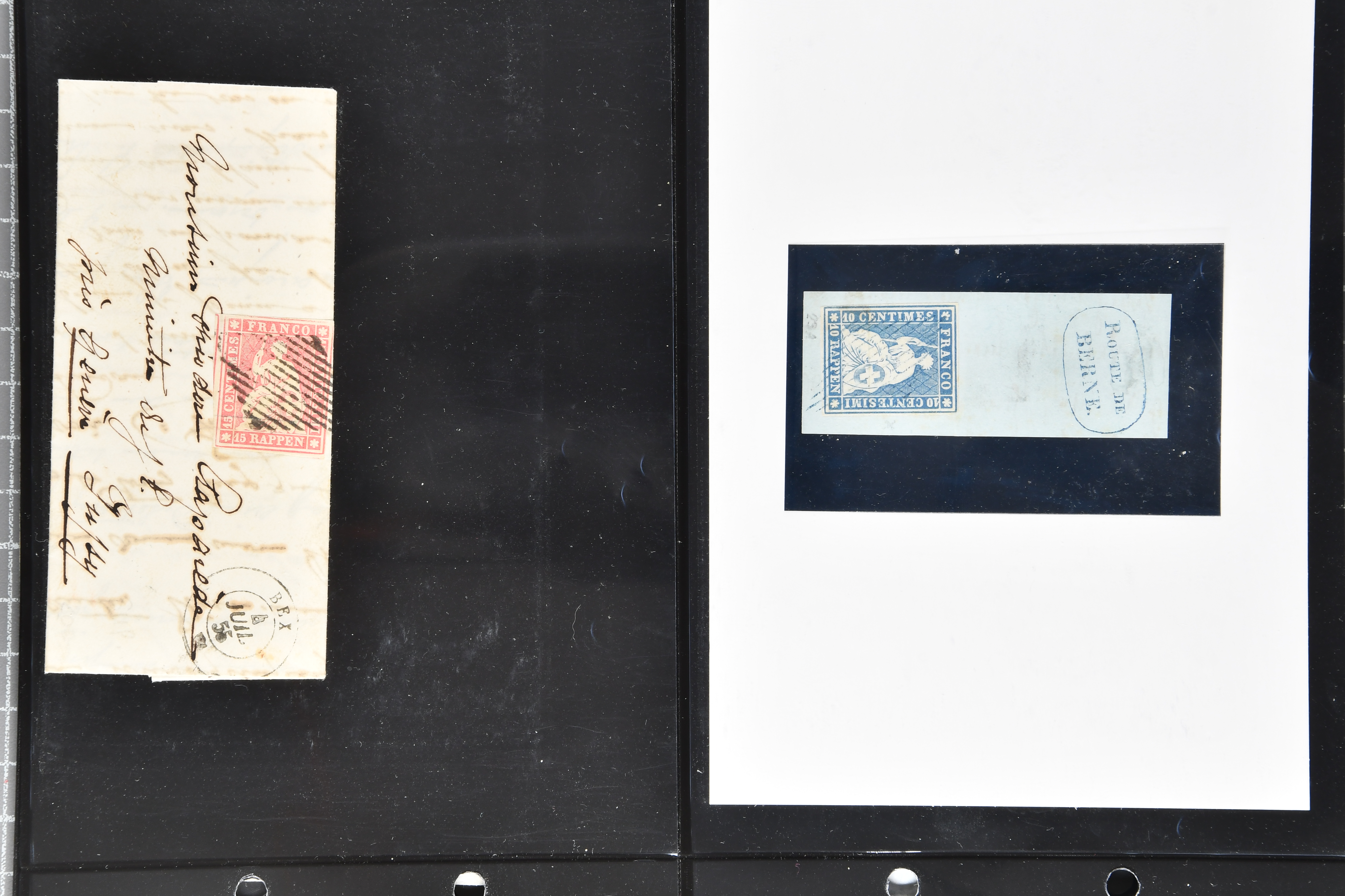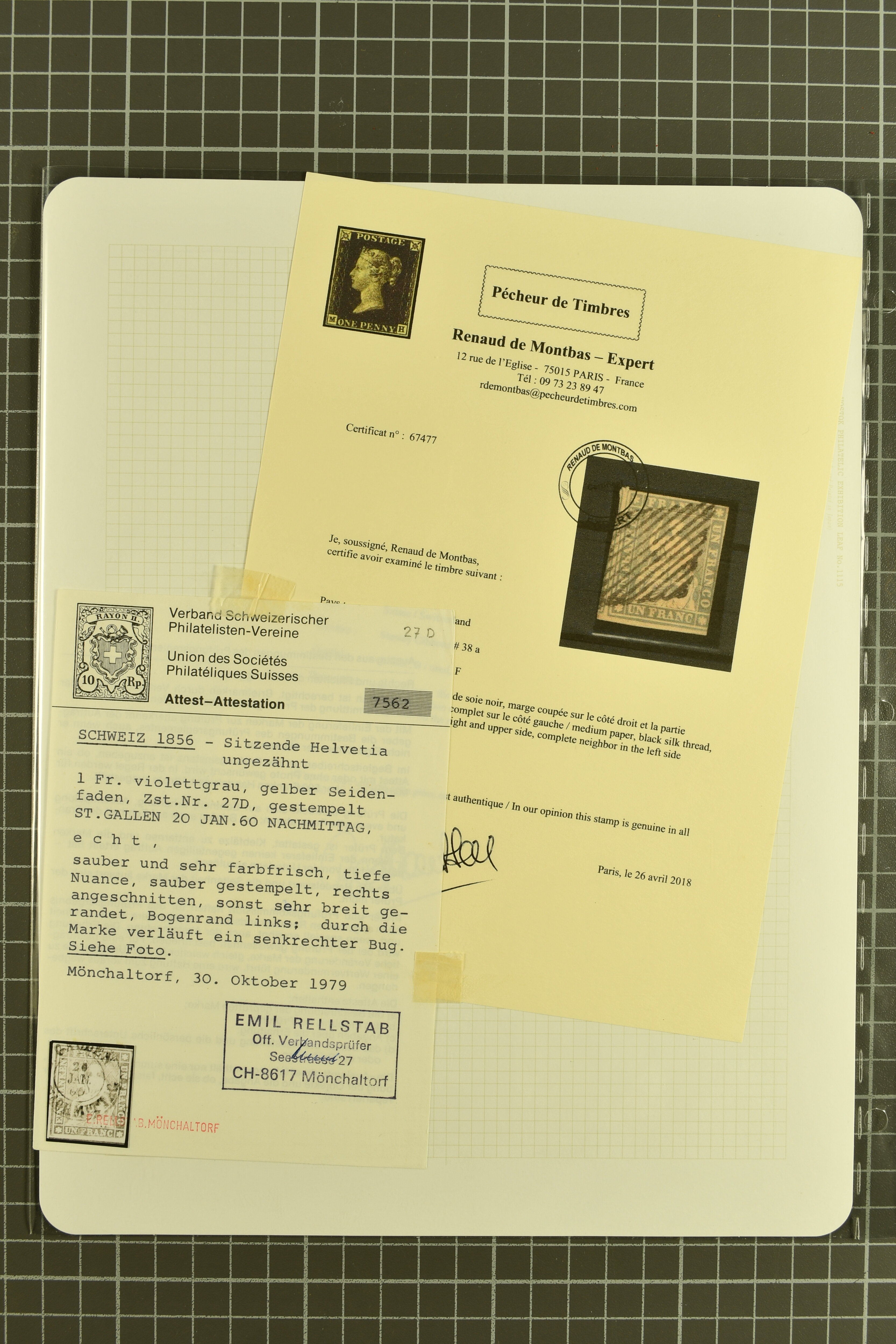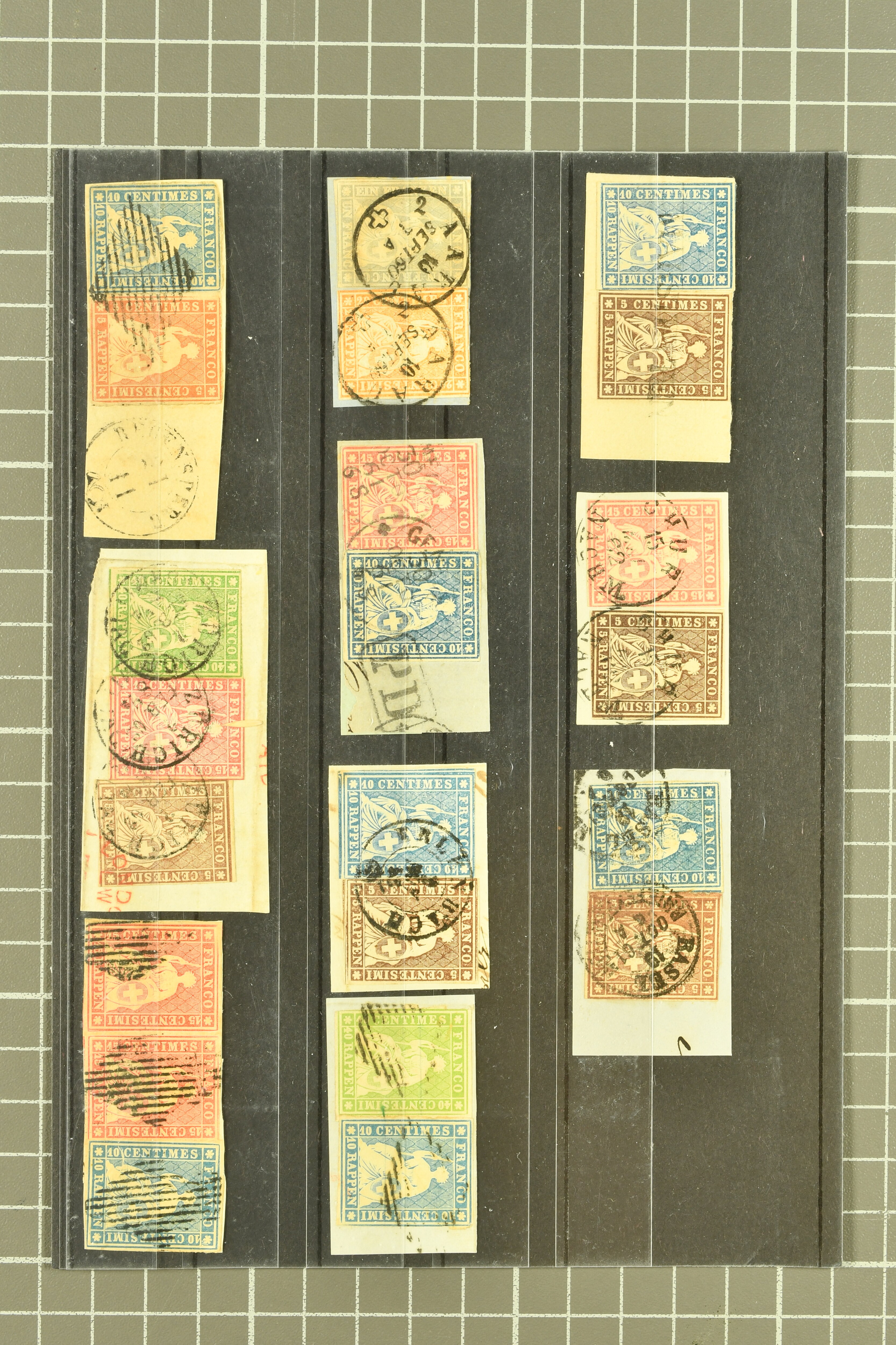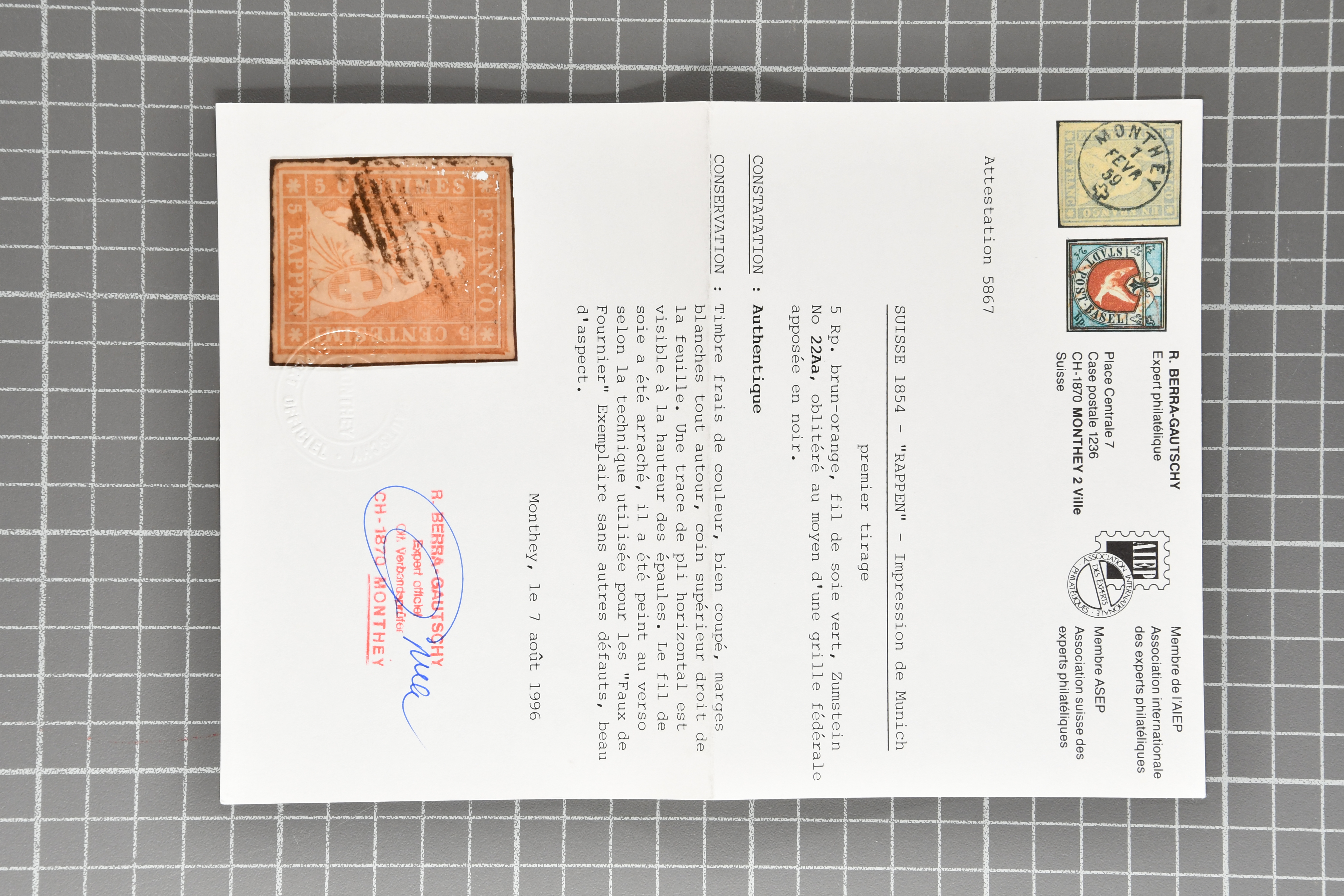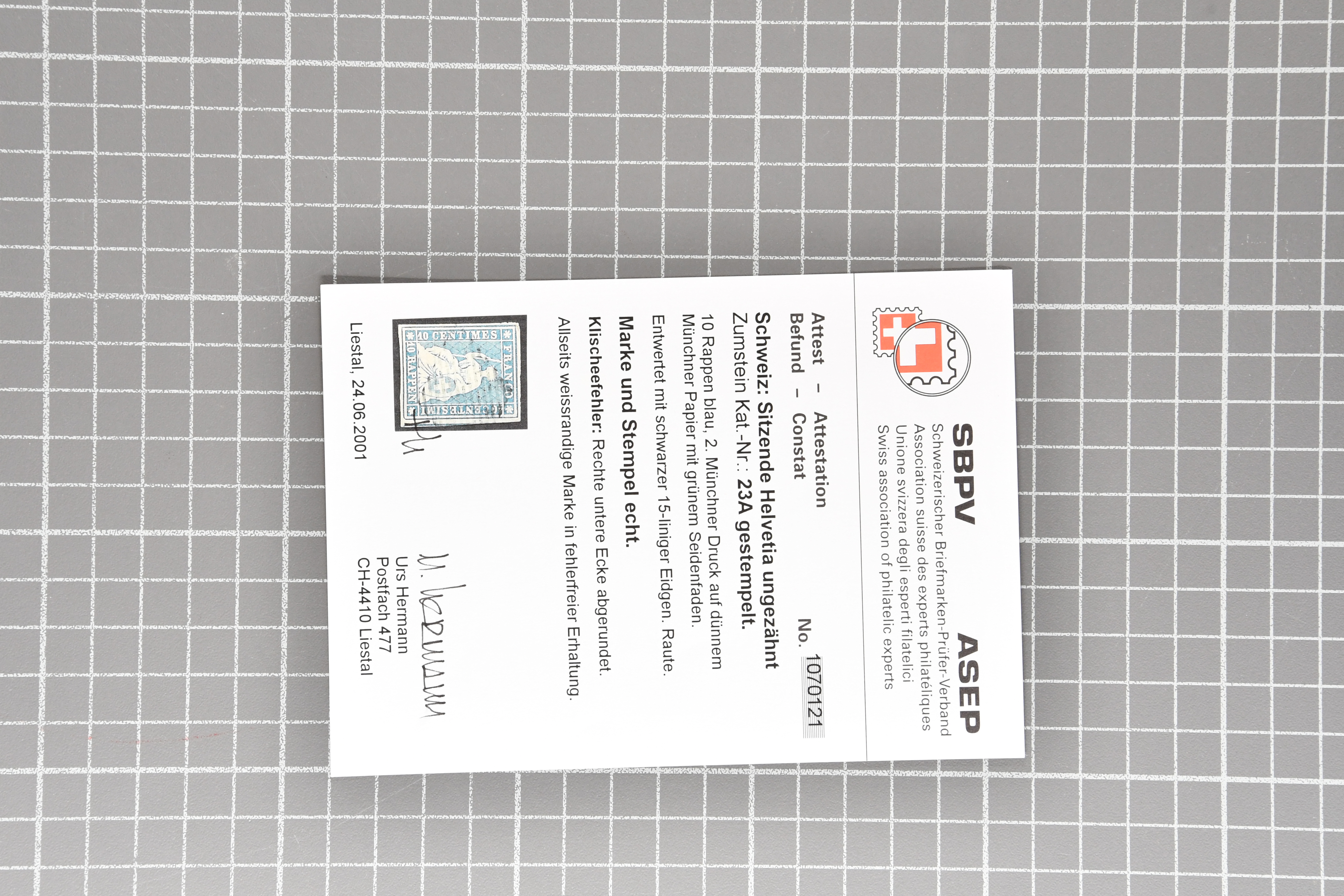 9776 image1854/62: Ausgesuchte Partie elf Einzelmarken, zwei Briefstücke und ein Brief. Dabei seltenere Werte wie weissrandige 10 Rp. hellpreussischblau (SBK 23Aa) oder ebenfalls weissrandige 1 Fr. grau (SBK 27C), Einheiten wie 5 Rp. graubraun auf dünnem Münchner Papier (SBK 22F) im waagr. Dreierstreifen, Frankaturen wie 15 Rp. rötlichkarmin auf ebensolchem Papier (SBK 24F) auf frischem Faltbrief von Rorschach nach Chur sowie Entwertungen wie diverse Stabstempel, schwarze Genfer Raute oder seltener "Tessiner" Zierkreisstempel "BIASCA 2 FEB 1858 S" auf Briefstück mit 15 Rp. karmin (SBK 24D). Ausserdem diverse überrandige Ausnahmestücke oder solche mit Bogenrand. Eine attraktive Zusammenstellung in guter bis sehr guter Erhaltung, drei Befunde, fünf Atteste. SBK=CHF 10'000+ (Image 1) (Image 2) (Image 3)