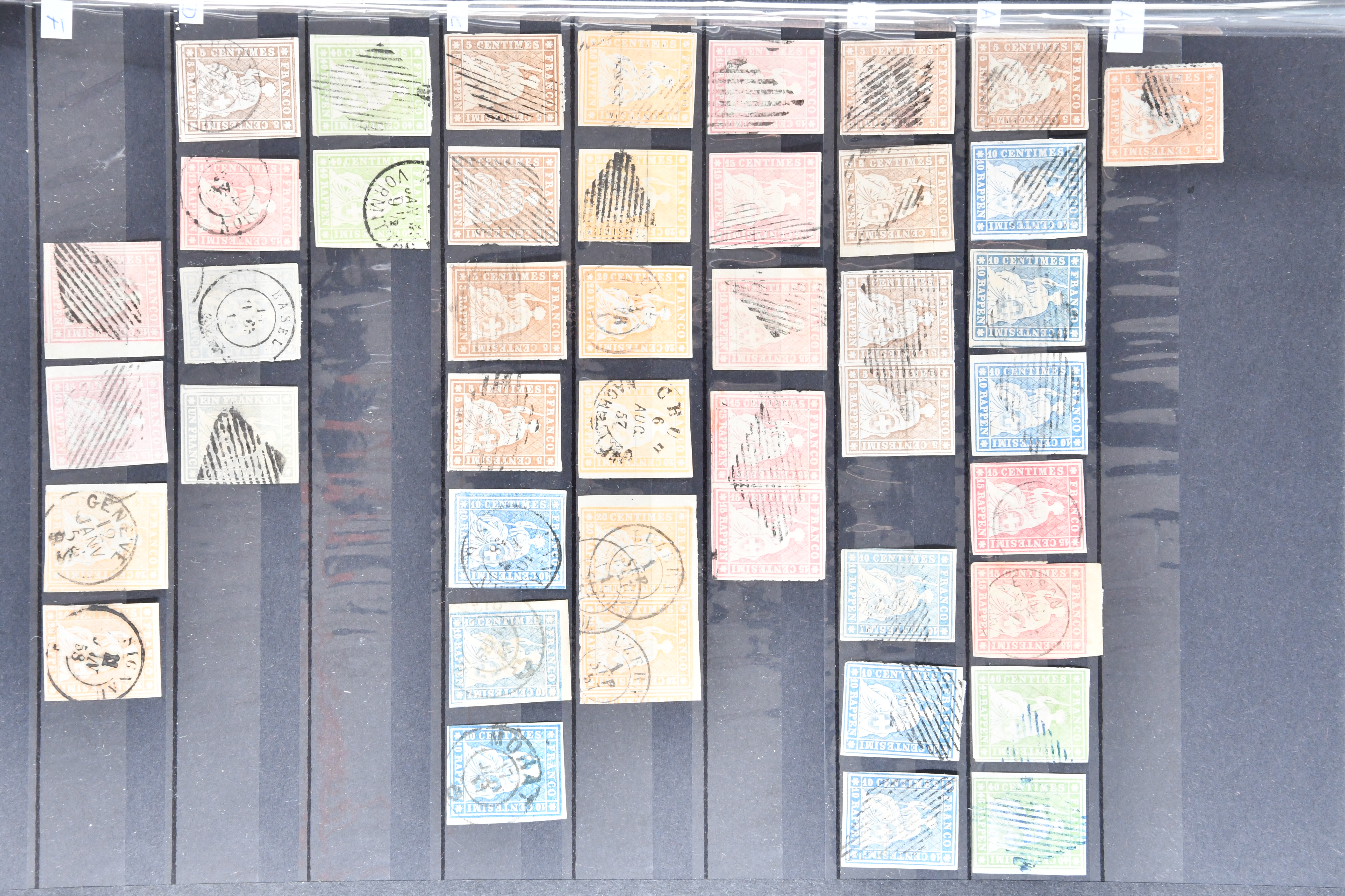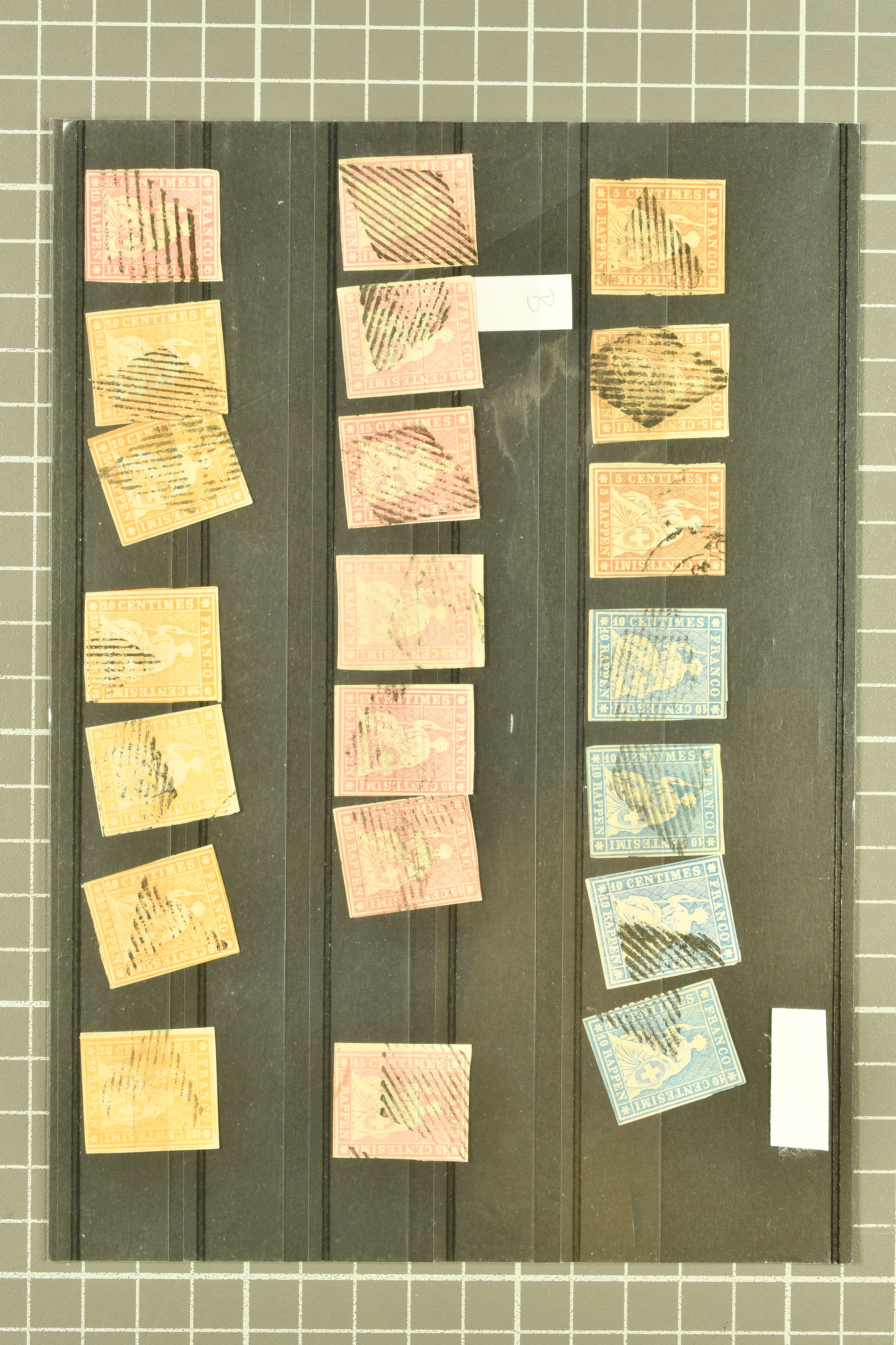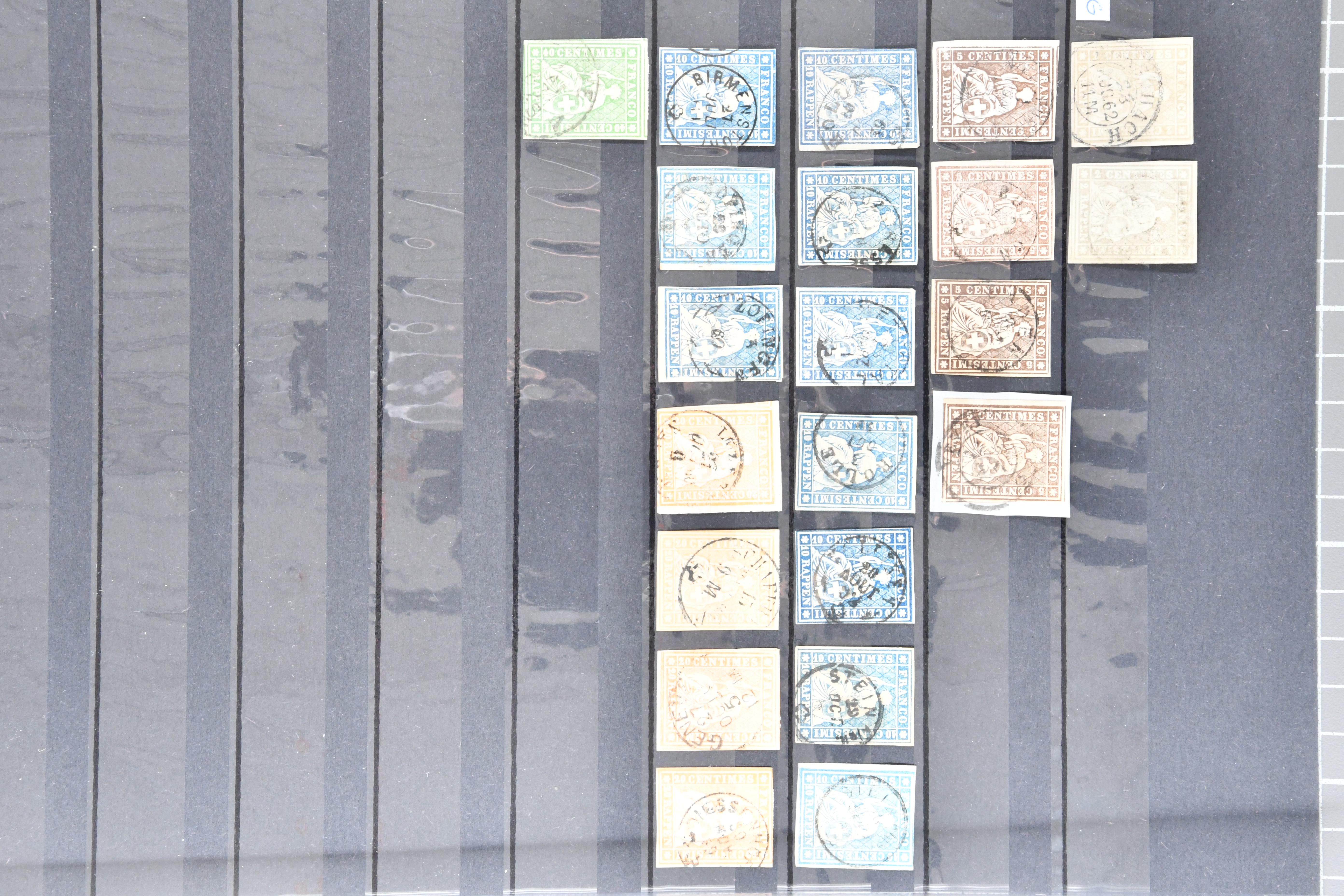 9780 cover 1854/62: Umfangreicher Strubelbestand mit über 800 Einzelwerten und einigen Briefstücken. Dabei auch bessere Werte vielfach vorhanden, so 1 Fr. grau mit schwarzem Seidenfaden (5, SBK 27C), 1 Fr. grau mit gelbem Seidenfaden (14, SBK 27C) oder 2 Rp. grau (12, SBK 21G), einige ungebrauchte Werte, schöne Rand- und Eckstücke, interessante Entwertungen wie 5 Rp. braun (SBK 22A) entw. mit handgezeichneter "Raute" in brauner Tinte und teils übergehend aufgesetzter schwarzer Luzerner Raute, Stabstp., Fingerhutstp. und verschiedene Rauten. Unterschiedliche Erhaltung. SBK=CHF 75'000+