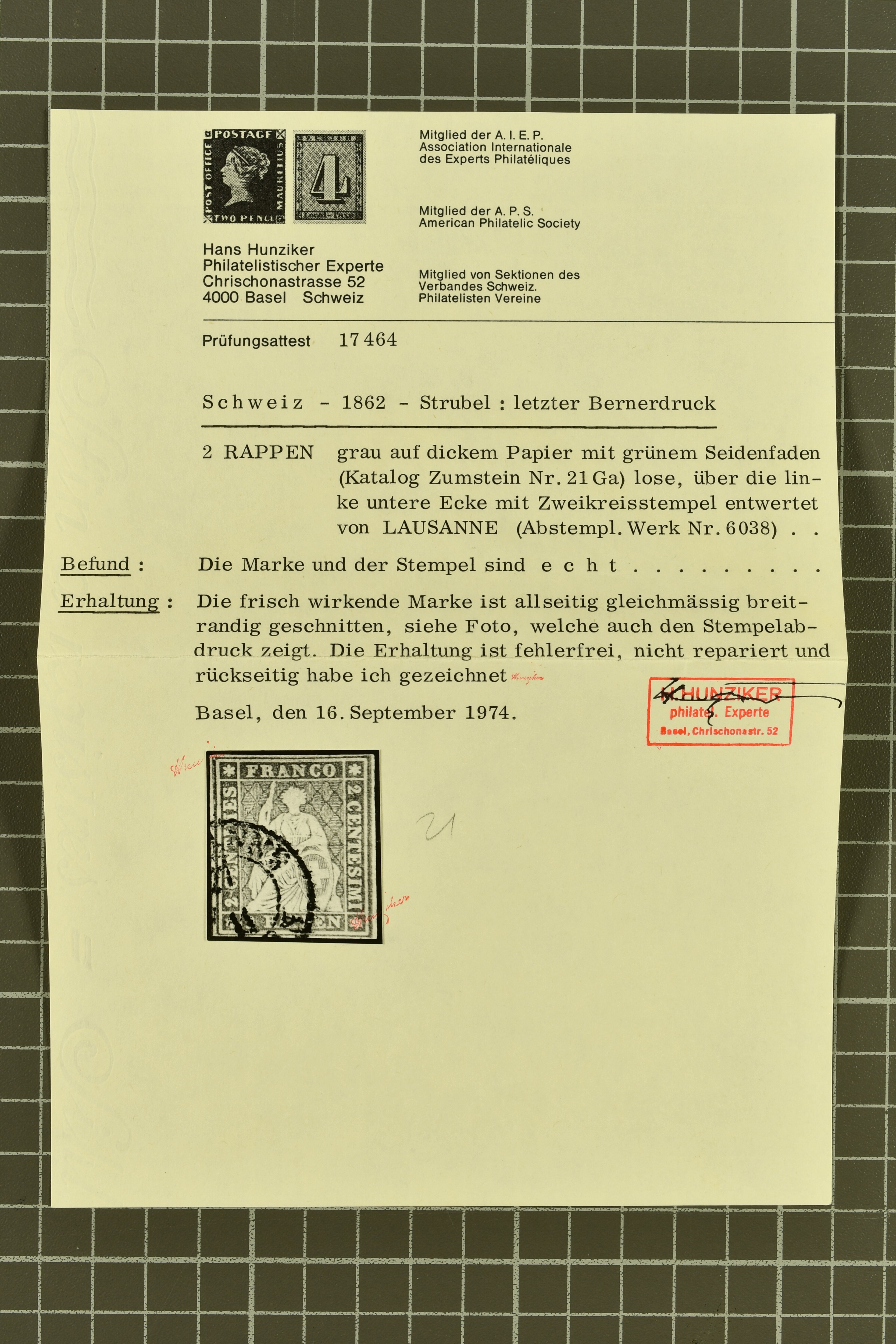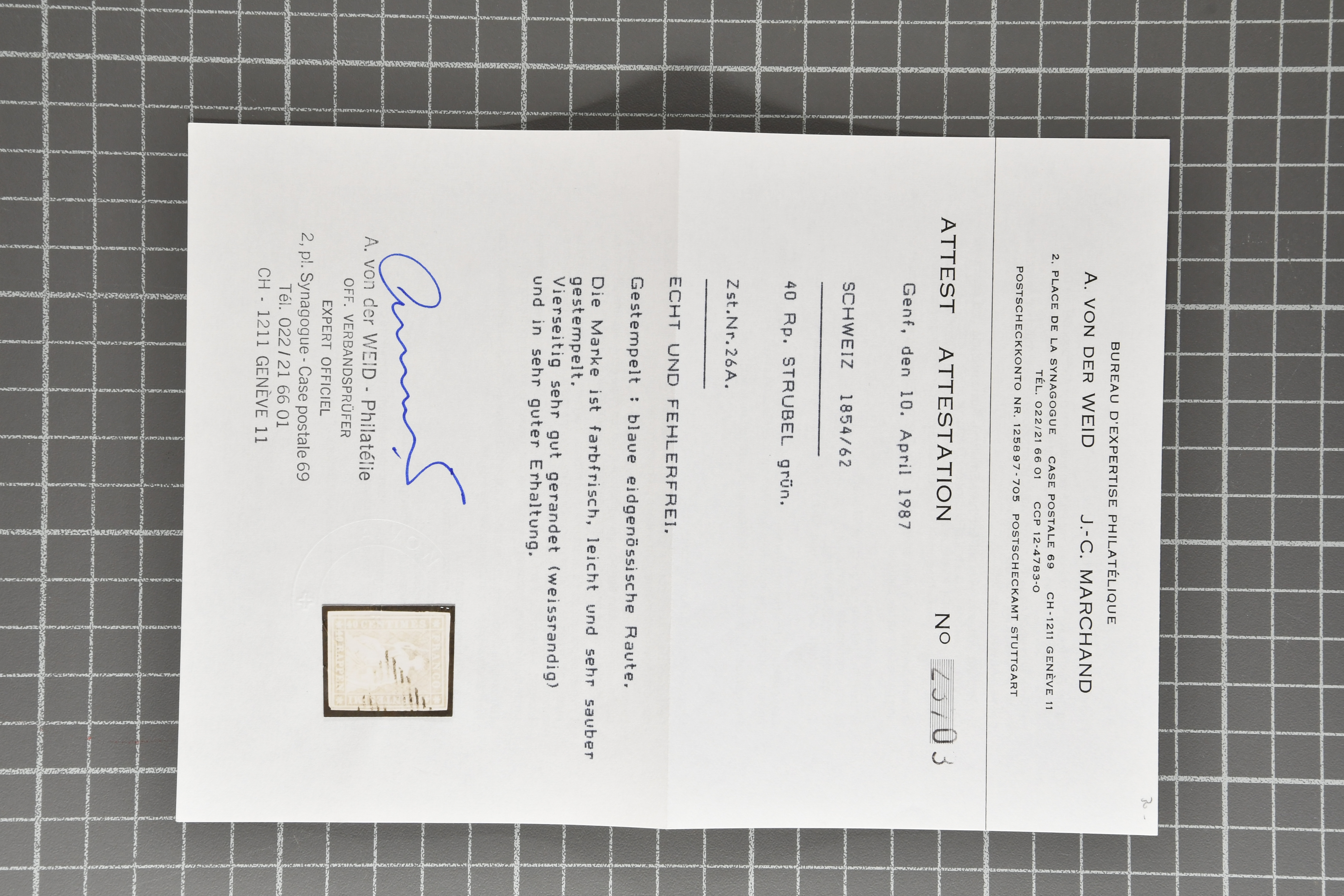 9775 image1865/62: Schöne Partie von 64 meist farbfr. und weissrandigen Strubelwerten aller Druckperioden. Dabei einige schöne Stücke mit breiten Bogenrändern und viele bessere Werte wie weissrandige 5 Rp. hellrotbraun (SBK 22Aa) aus der rechten oberen Bogenecke, 40 Rp. hellgrünlicholiv (SBK 26A), zart und zentr. entw. mit blauer eidg. Raute, 20 Rp. gelborange (SBK 25B) im waagr. Paar aus der linken oberen Bogenecke mit grossem Teil der rechten Nebenmarke, 10 Rp. grauultramarin auf dünnem Münchner Papier (SBK 23F) mit Bogenrand rechts und zarter Rautenentwertung, 10 Rp. lebhaftpreussichblau auf dünnem Zürcher Papier (SBK 23E) mit Bogenrand oben, je ein weissrandiges Exemplar der 1 Fr. grau mit gelbem resp. schwarzem Seidenfaden (SBK 27C/D) und zwei Exemplare der 2 Rp. grau (SBK 21G). Eine attraktive Zusammenstellung in meist guter Erhaltung; 13 Befunde, 14 Atteste. SBK=CHF 14'000+ (Image 1) (Image 2) (Image 3) (Image 4) (Image 5) (Image 6) (Image 7) (Image 8) (Image 9) (Image 10) (Image 11) (Image 12) (Image 13) (Image 14) (Image 15) (Image 16) (Image 17) (Image 18) (Image 19) (Image 20) (Image 21) (Image 22) (Image 23) (Image 24) (Image 25) (Image 26) (Image 27)