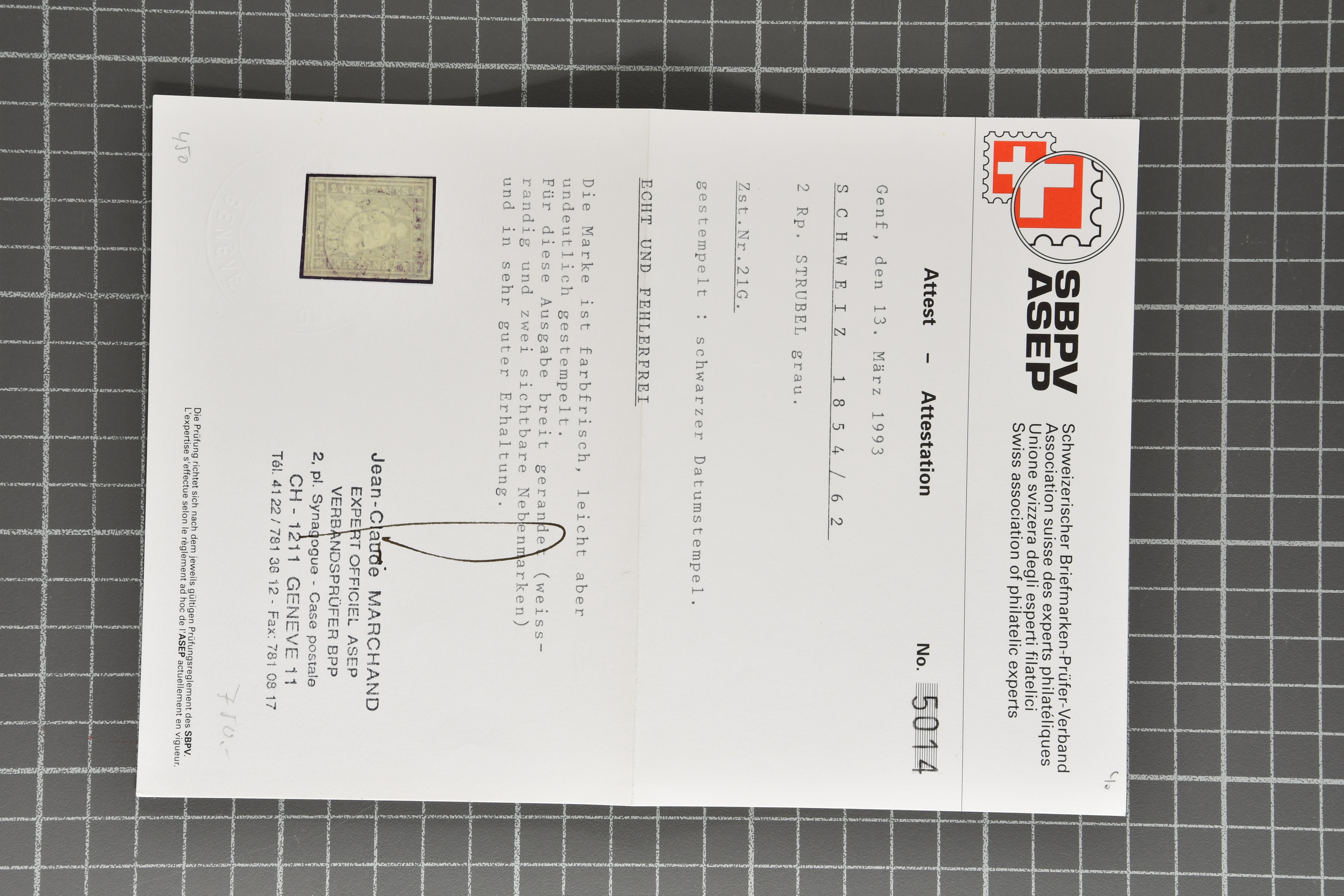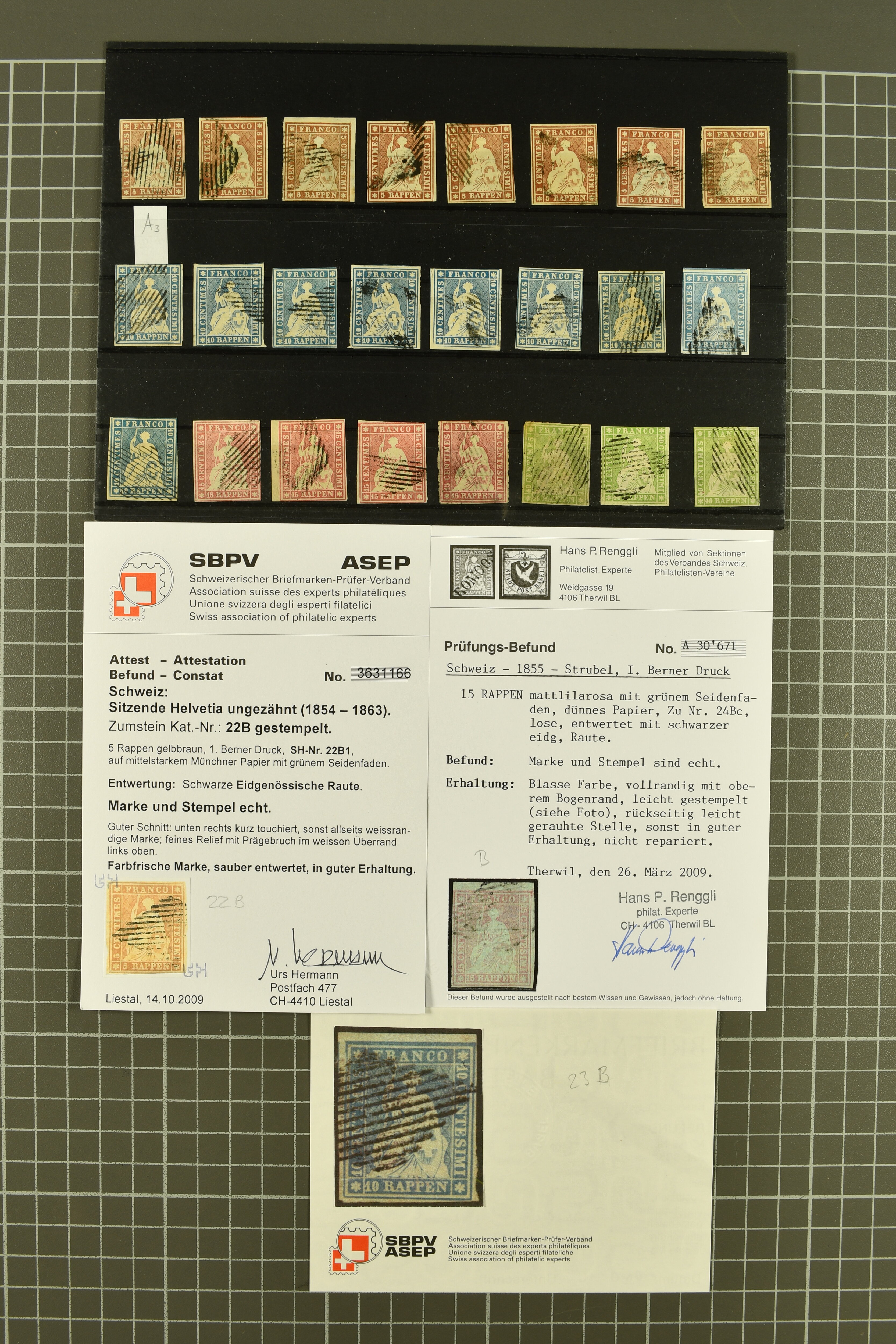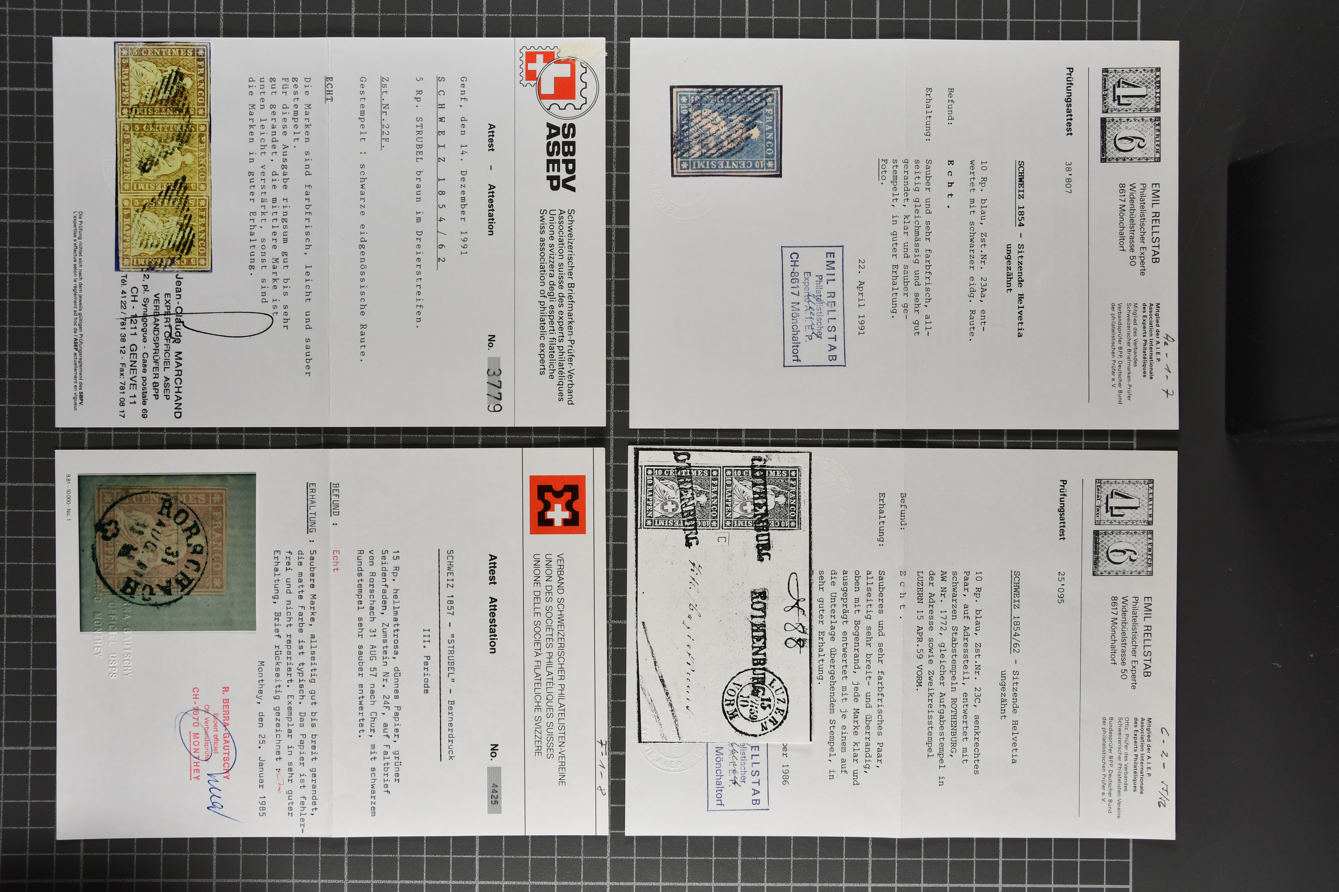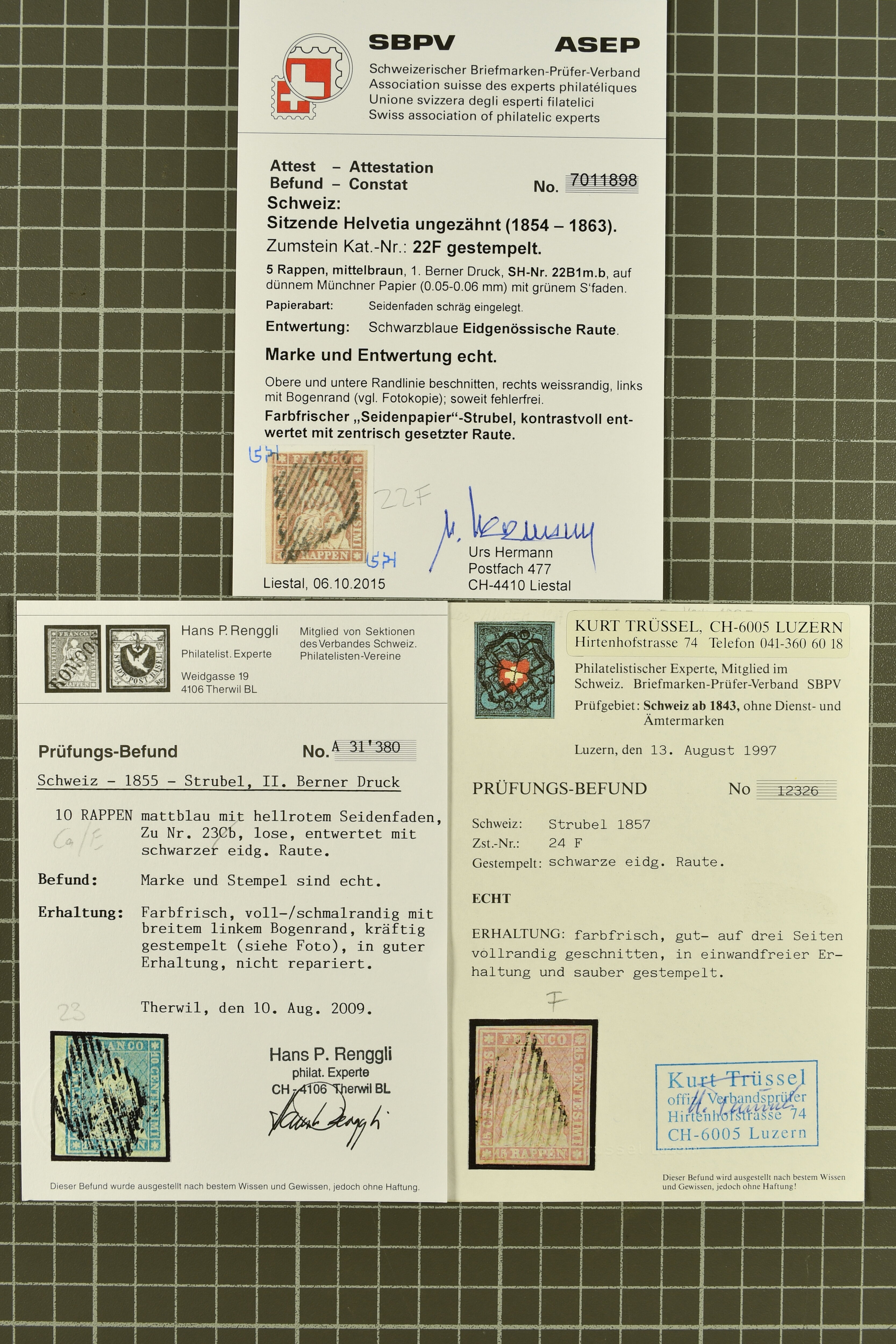 9779 image1854/62: Reichhaltige Partie von 240 Einzelwerten, Paaren und Briefstücken aller Druckperioden. Dabei auch bessere Werte mehrfach vorhanden wie 5 Rp. braunorange (SBK 22Aa, 2), 10 Rp. hellpreussischblau (SBK 23Aa), 15 Rp. hellbräunlichrot (SBK 24Aa), 5 Rp. graubraun auf dünnem Münchner Papier (SBK 22F, 5), 10 Rp. grauultramarin auf ebensolchem Papier (SBK 23F, 4), 1 Fr. grau mit schwarzem Seidenfaden (SBK 27C, 3) sowie mit gelbem Seidenfaden (SBK 27D, 4) oder 2 Rp. grau (SBK 21G, 6). Ausserdem schöne Rand- und Eckstücke, Entwertungen wie Stab- oder Fingerhutstempel je separat gesammelt auf einer resp. zwei Steckkarten aber auch verschieden Rautenformen und zehn Briefstücke, worunter 1 Fr. grau und 20 Rp. gelblichorange (SBK 27C+25D) je klar und übergehend entw. mit Elzevir-Einkreisstp. "AARAU 10 SEPT. 60 7A" oder 5 Rp. braunorange und 10 Rp. blau (SBK 22Aa+23A), zus. zart und voll aufges. entw. mit schwarzer eidg. Raute mit nebenges. Bruchstp. "REGENSPERG 21/11". Etw. unterschiedliche, oftmals aber gute Erhaltung; 17 Befunde, sechs Atteste. SBK=CHF 45'000+ (Image 1) (Image 2) (Image 3) (Image 4) (Image 5) (Image 6) (Image 7) (Image 8) (Image 9) (Image 10) (Image 11) (Image 12) (Image 13) (Image 14) (Image 15) (Image 16) (Image 17) (Image 18) (Image 19) (Image 20) (Image 21) (Image 22) (Image 23) (Image 24) (Image 25) (Image 26) (Image 27) (Image 28) (Image 29) (Image 30) (Image 31) (Image 32) (Image 33) (Image 34) (Image 35) (Image 36) (Image 37) (Image 38) (Image 39) (Image 40) (Image 41) (Image 42) (Image 43)