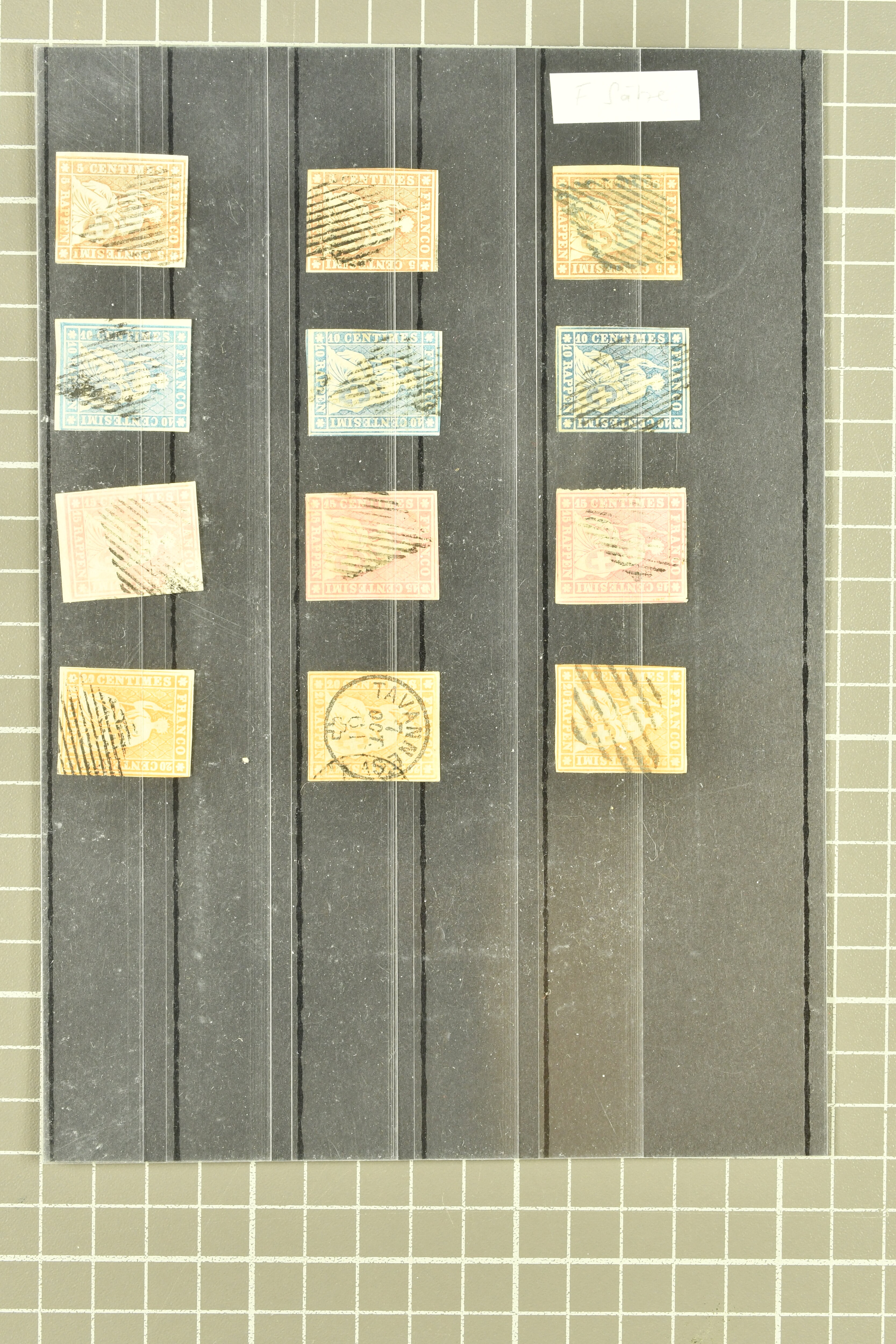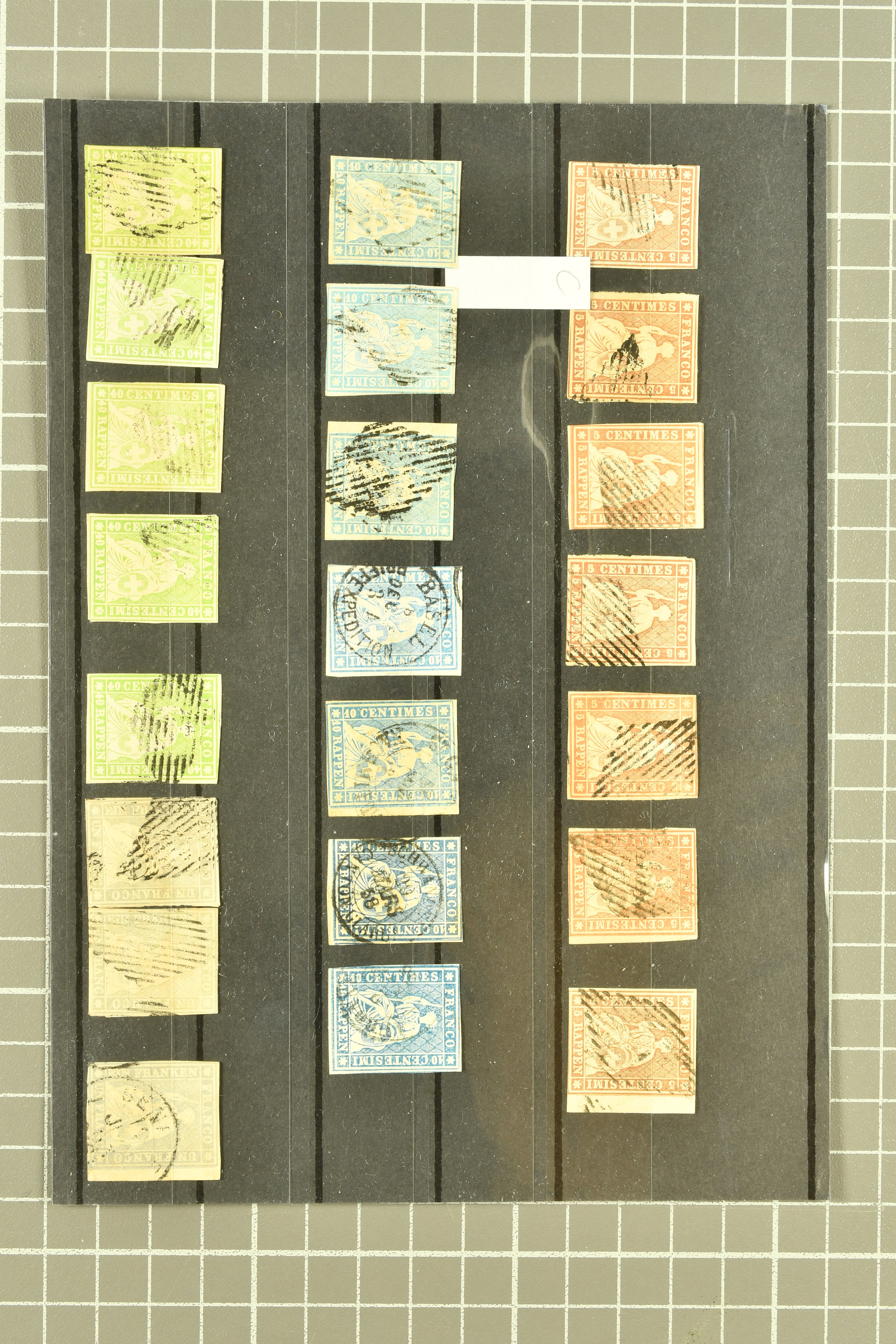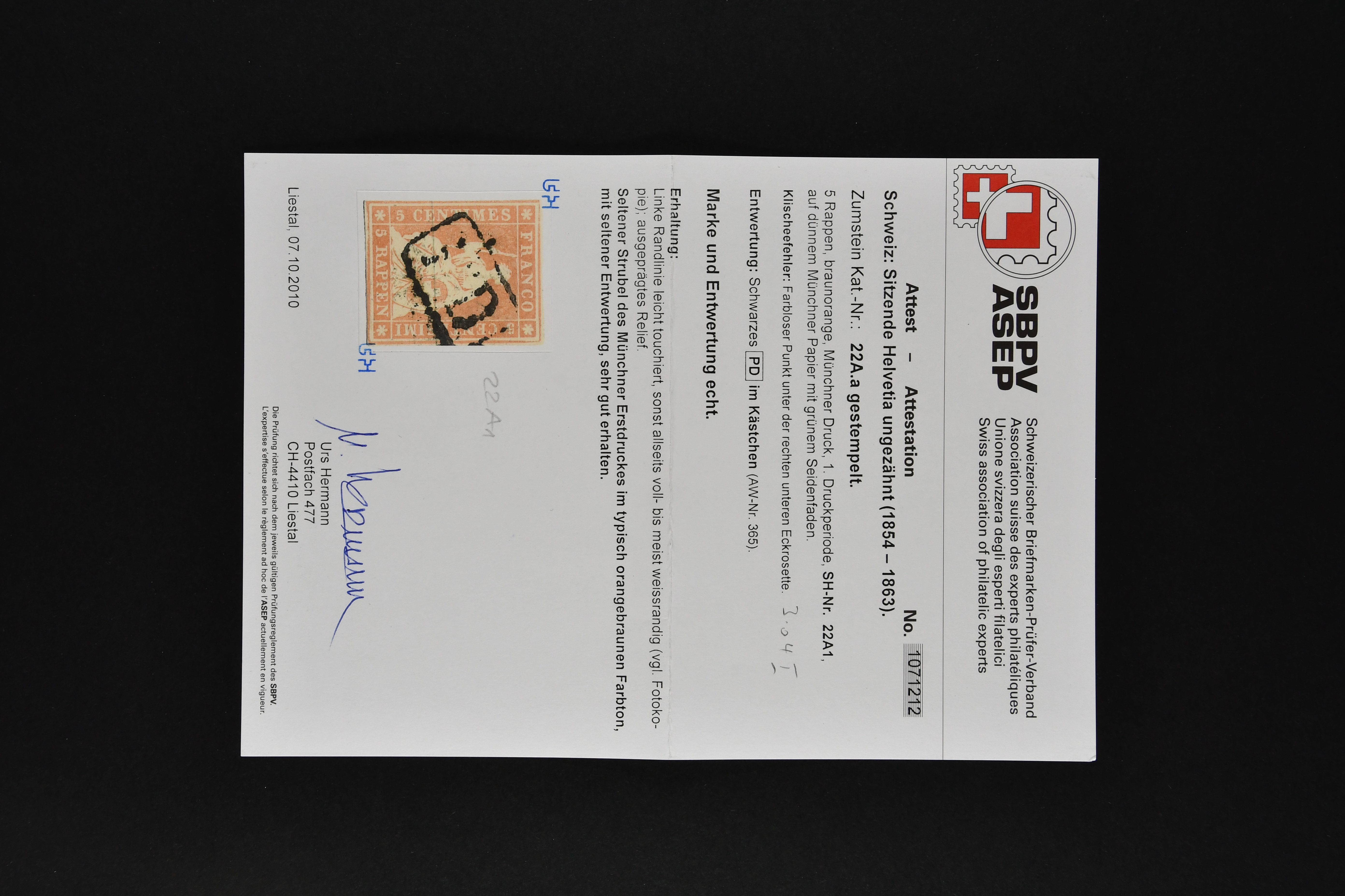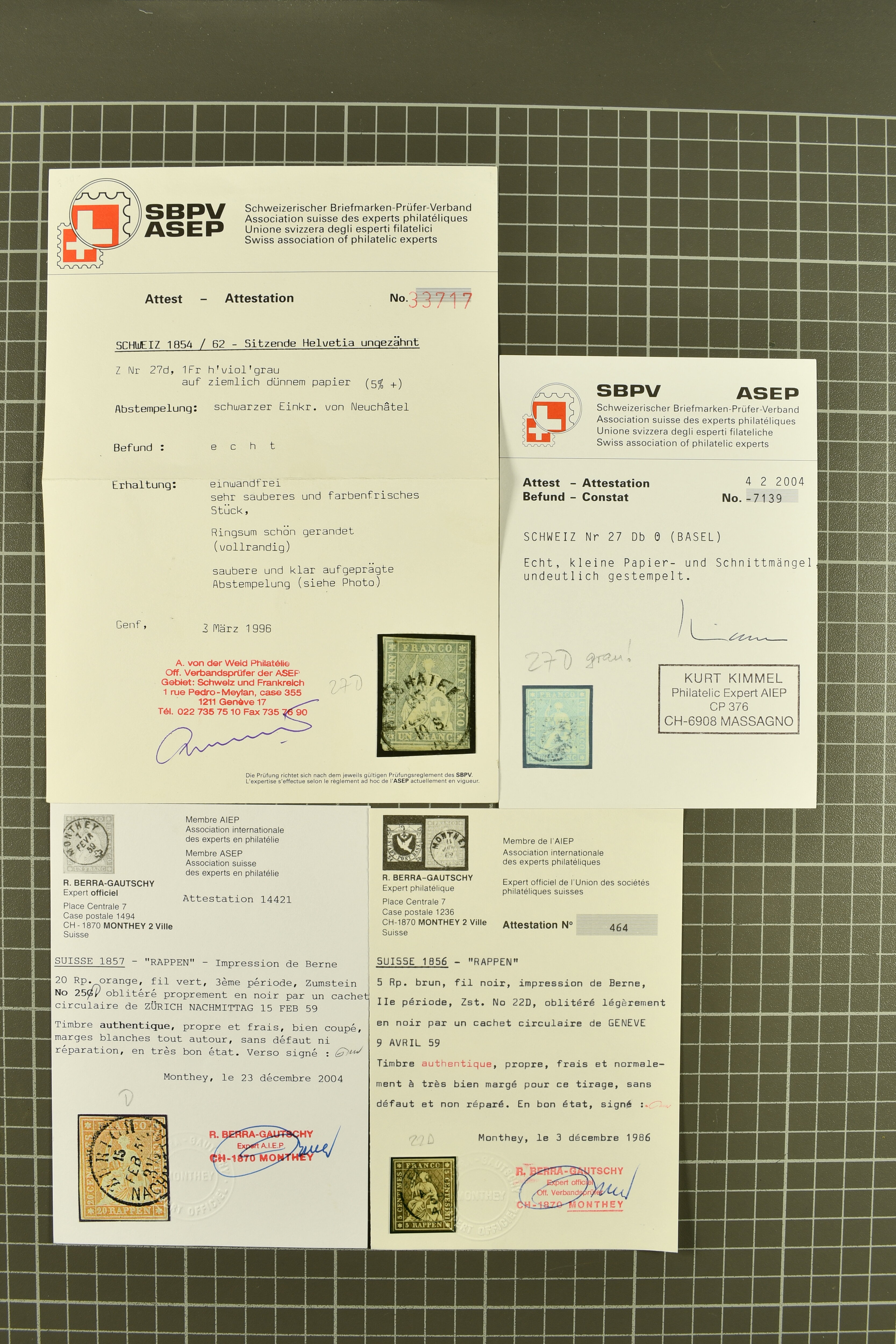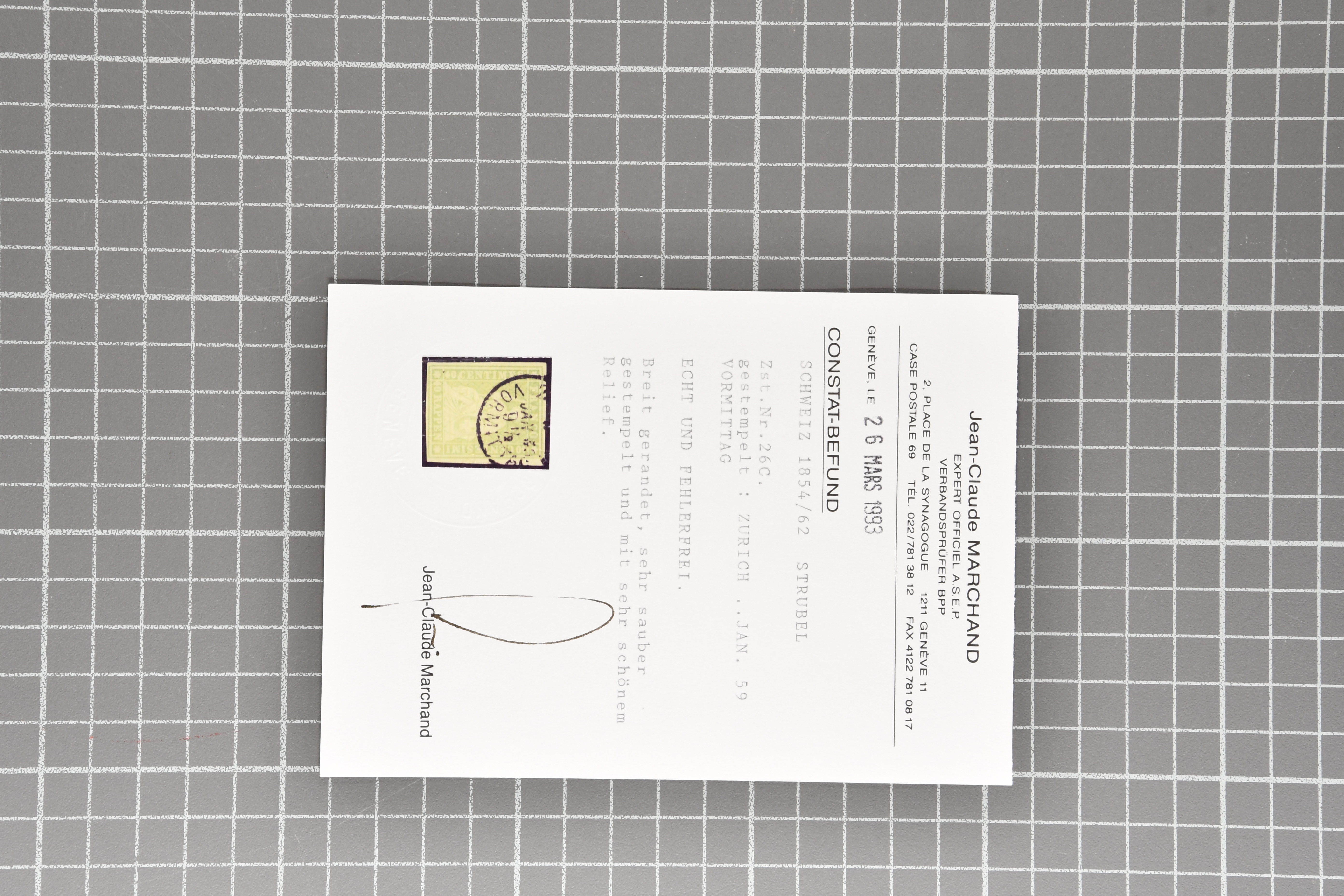 9779 image1854/62: Reichhaltige Partie von 240 Einzelwerten, Paaren und Briefstücken aller Druckperioden. Dabei auch bessere Werte mehrfach vorhanden wie 5 Rp. braunorange (SBK 22Aa, 2), 10 Rp. hellpreussischblau (SBK 23Aa), 15 Rp. hellbräunlichrot (SBK 24Aa), 5 Rp. graubraun auf dünnem Münchner Papier (SBK 22F, 5), 10 Rp. grauultramarin auf ebensolchem Papier (SBK 23F, 4), 1 Fr. grau mit schwarzem Seidenfaden (SBK 27C, 3) sowie mit gelbem Seidenfaden (SBK 27D, 4) oder 2 Rp. grau (SBK 21G, 6). Ausserdem schöne Rand- und Eckstücke, Entwertungen wie Stab- oder Fingerhutstempel je separat gesammelt auf einer resp. zwei Steckkarten aber auch verschieden Rautenformen und zehn Briefstücke, worunter 1 Fr. grau und 20 Rp. gelblichorange (SBK 27C+25D) je klar und übergehend entw. mit Elzevir-Einkreisstp. "AARAU 10 SEPT. 60 7A" oder 5 Rp. braunorange und 10 Rp. blau (SBK 22Aa+23A), zus. zart und voll aufges. entw. mit schwarzer eidg. Raute mit nebenges. Bruchstp. "REGENSPERG 21/11". Etw. unterschiedliche, oftmals aber gute Erhaltung; 17 Befunde, sechs Atteste. SBK=CHF 45'000+ (Image 1) (Image 2) (Image 3) (Image 4) (Image 5) (Image 6) (Image 7) (Image 8) (Image 9) (Image 10) (Image 11) (Image 12) (Image 13) (Image 14) (Image 15) (Image 16) (Image 17) (Image 18) (Image 19) (Image 20) (Image 21) (Image 22) (Image 23) (Image 24) (Image 25) (Image 26) (Image 27) (Image 28) (Image 29) (Image 30) (Image 31) (Image 32) (Image 33) (Image 34) (Image 35) (Image 36) (Image 37) (Image 38) (Image 39) (Image 40) (Image 41) (Image 42) (Image 43)