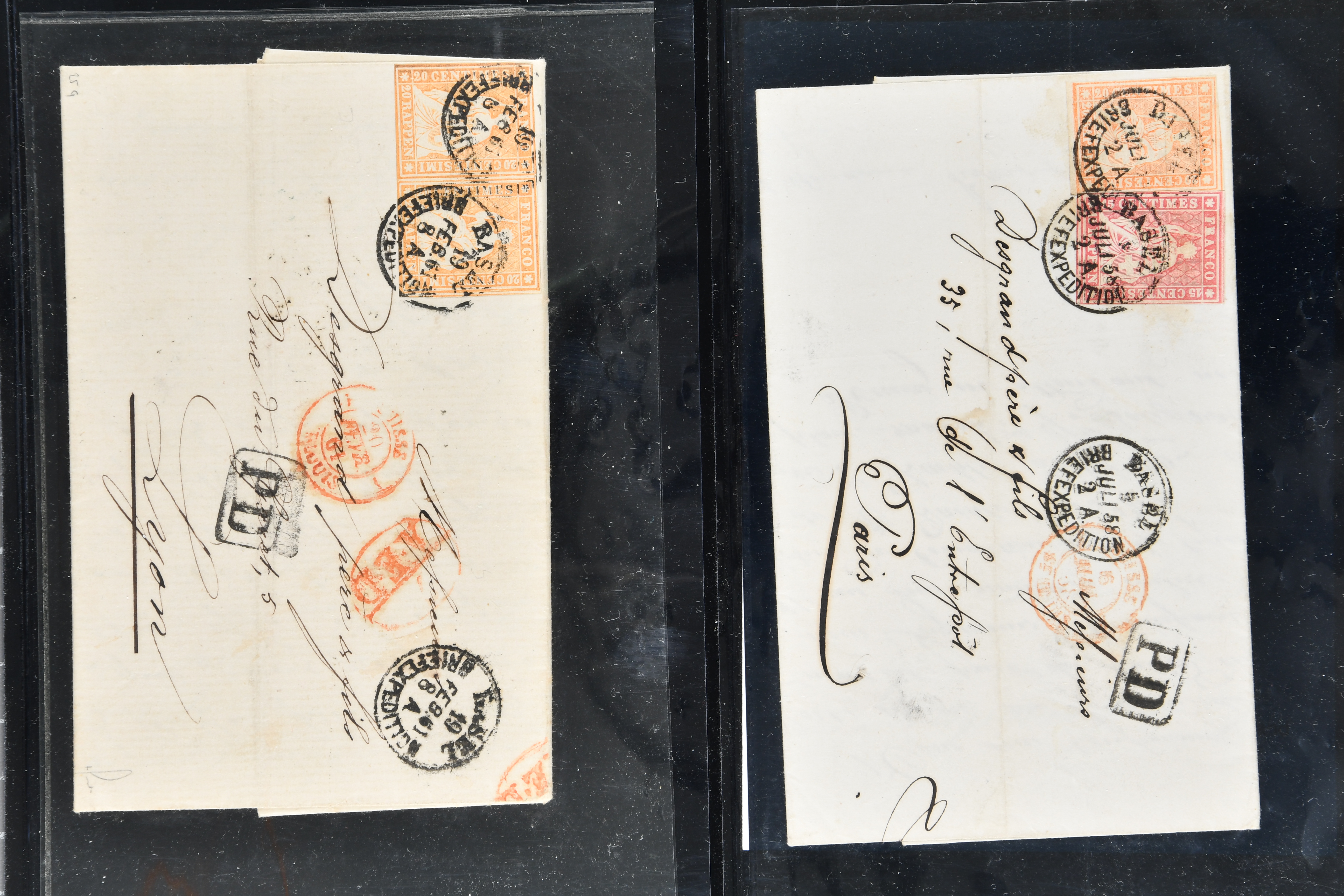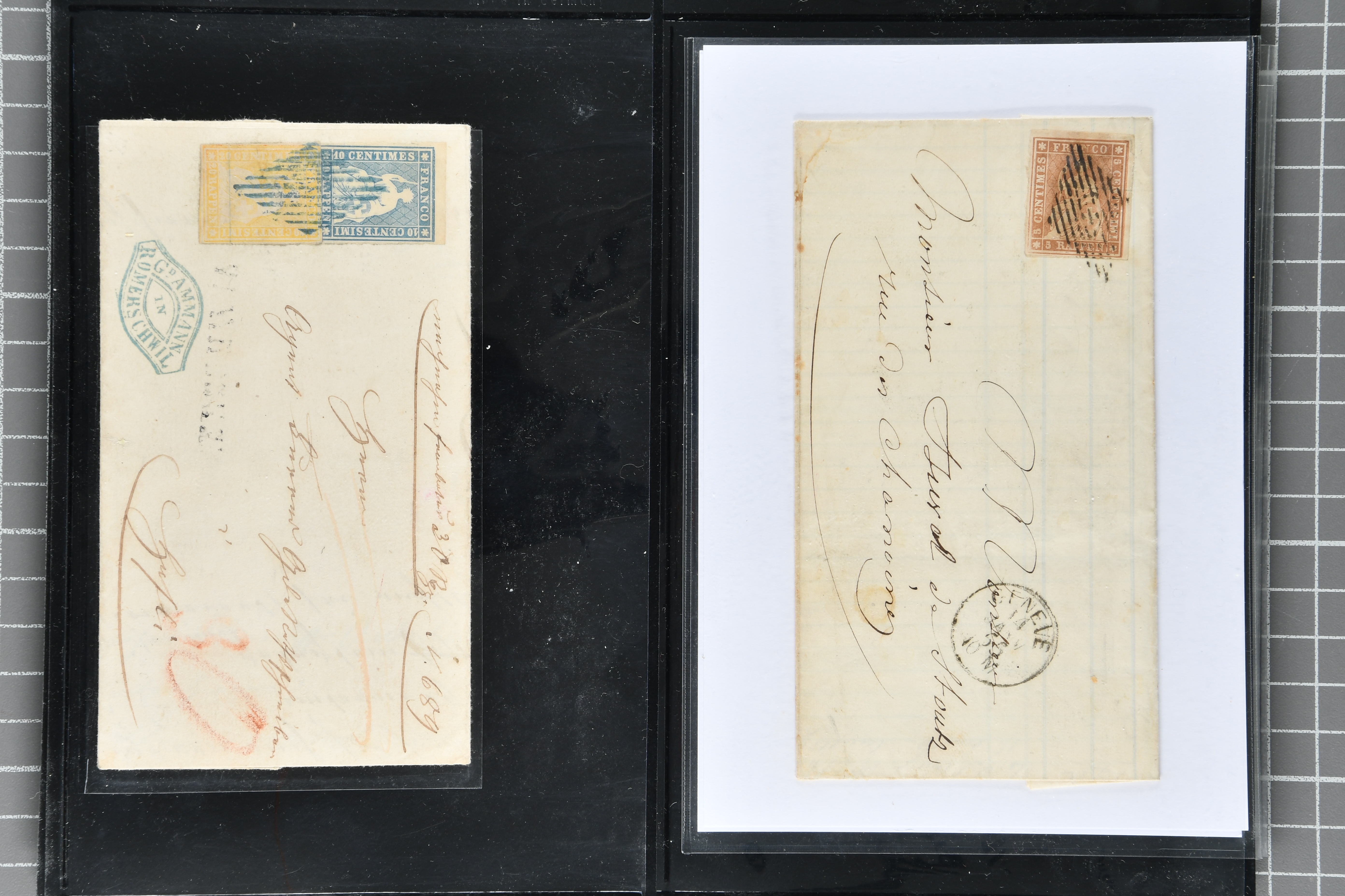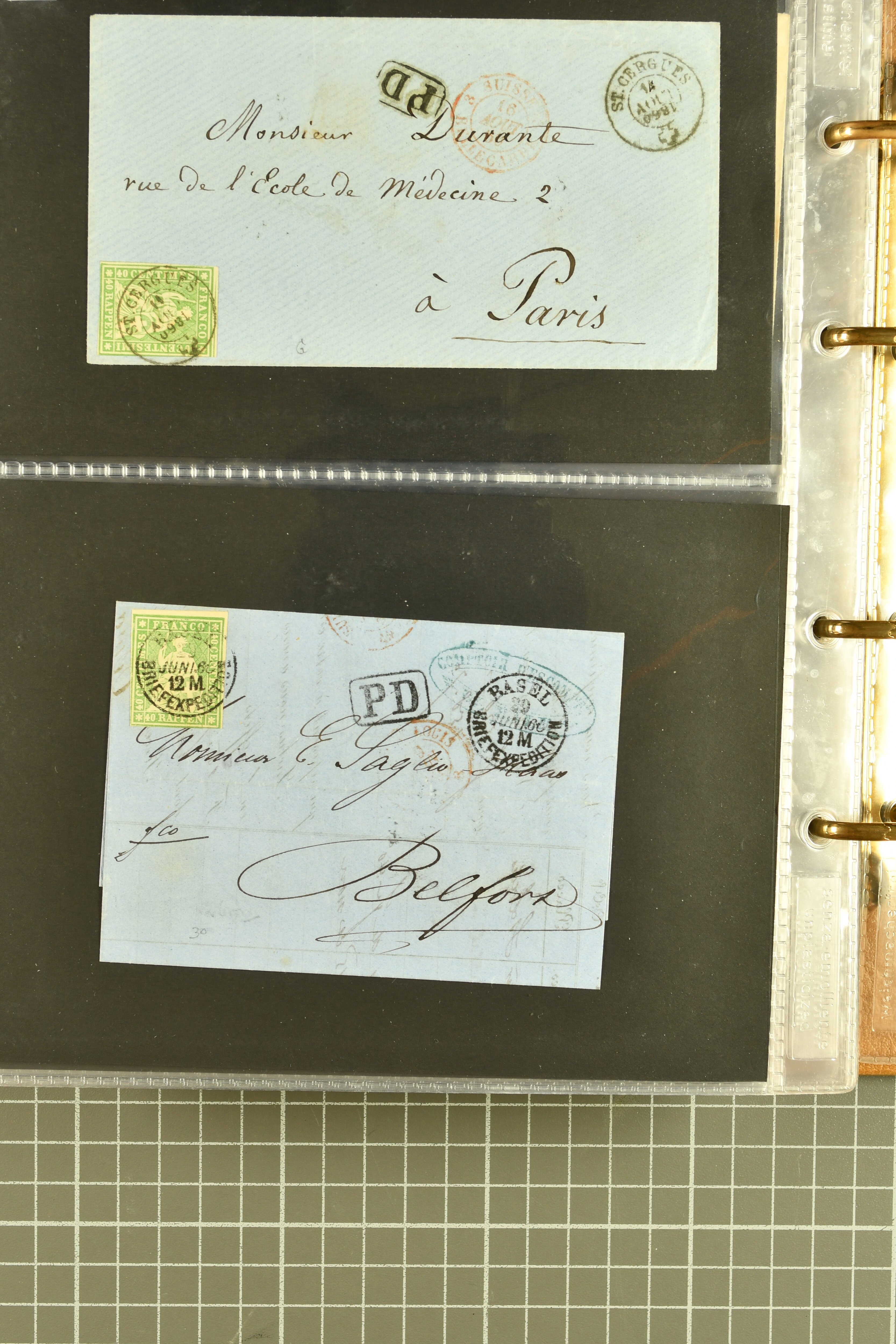 9788 cover image1854/62: Lot sechs bessere Auslandsfrankaturen. Dabei 40 Rp. gelboliv (SBK 26Aa) auf Faltbrief von Zürich nach Morchenstern (Smrzkova), Böhmen, 1 Fr. grau und 15 Rp. karmin (SBK 27D+24D) auf sauberem Transatlantikbrief von Zürich nach New York, Dreifarbenfrankatur 10 Rp. blau mit grossem Teil der linken Nebenmarke, 20 Rp. gelblichorange und 40 Rp. grünlicholiv mit breitem Bogenrand links (SBK 23C+25D+26C) auf Faltbrief der 2. Gewichtsstufe von Genf nach St. Etienne, Frankreich, 15 Rp. karmin (2, SBK 25D) und 40 Rp. grünlicholiv (SBK 26C) als ident. Porto auf Faltbrief von Genf nach Marseille, 10 Rp. blau und 40 Rp. oliv (SBK 23G+26G) auf Briefcouvert von Unterseen nach Hohenelbe (Vrchlabí), Böhmen sowie 15 Rp. karminrot (2, SBK 25D) auf Faltbrief von Altdorf nach Kempten im Allgäu. Unterschiedliche Erhaltung aber eine gehaltvolle und seltene Zusammenstellung; ein Attest Marchand (2007) für 26Aa. SBK=CHF 5'700+ (Image 1) (Image 2) (Image 3) (Image 4) (Image 5)