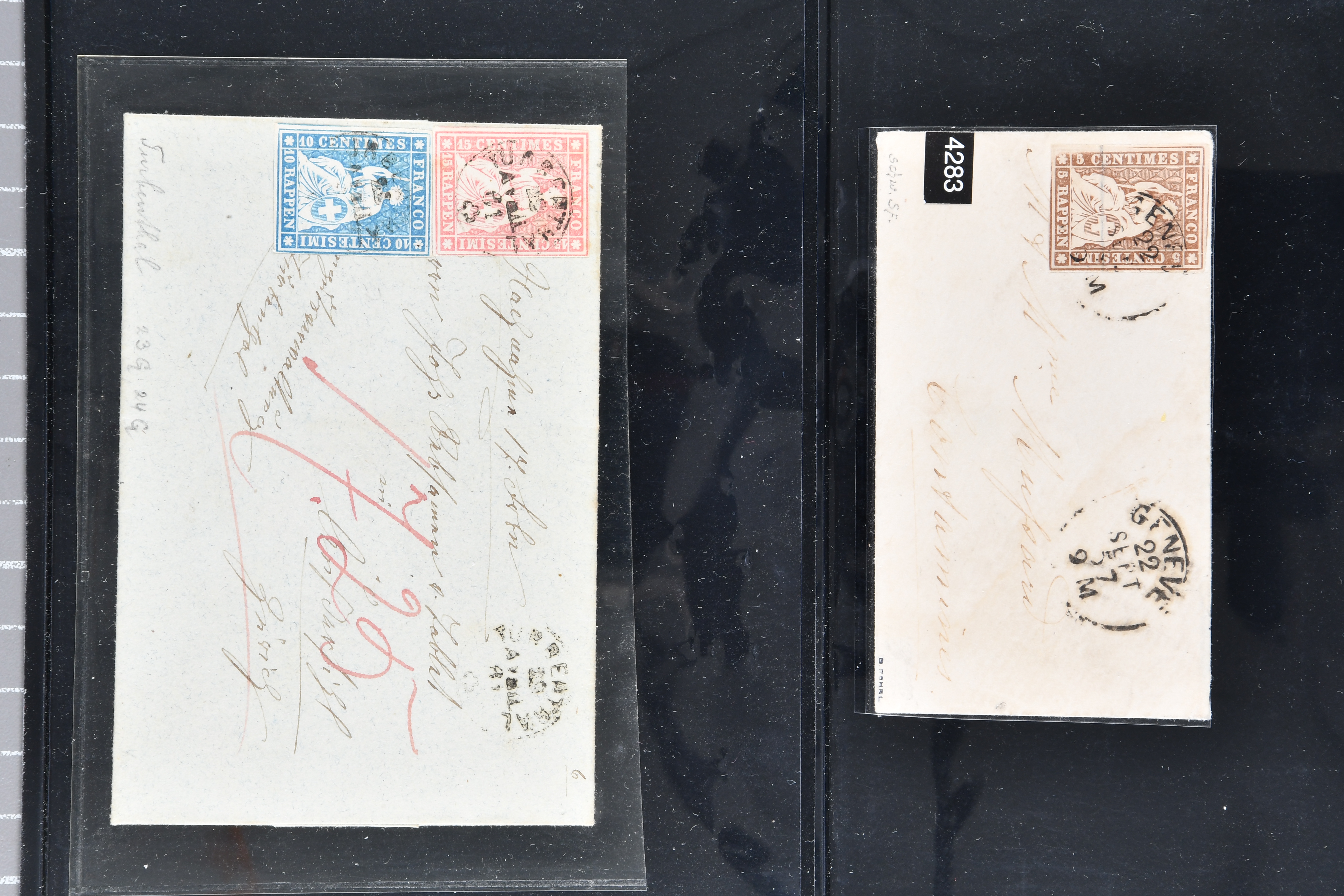 9785 cover image1855/63: Interessante Gruppe von sieben Strubelbriefen, dabei 1855 22A Brief von Genf nach Grand-Sacconex, Nachnahme-Brief mit zwei Werten der 23A mit nebenges. blauem Stabsdtp. NEUDORF, drei G-Strubel-Briefe, einer mit Entwertung durch Stabstp. CAPPEL, Juni 1863 Mischfrankatur Strubel 20 Rp. orange mit Sitzender 10 Rp. blau (SBK = CHF 2'000), und Verwendung der 20 Rp. orange nach der Gültigkeit im November 1863 auf Brief nach Bern, also eigentlich 'überfrankiert', zwar in St. GALLEN entwertet, aber dort oder später durchgestrichen, Vermerk 'ungültig' in gleicher Tinte daneben und mit dem doppelten Fehlbetrag von '30' Rappen taxiert. Fünf Briefe signiert Sorani (Image 1) (Image 2) (Image 3) (Image 4)