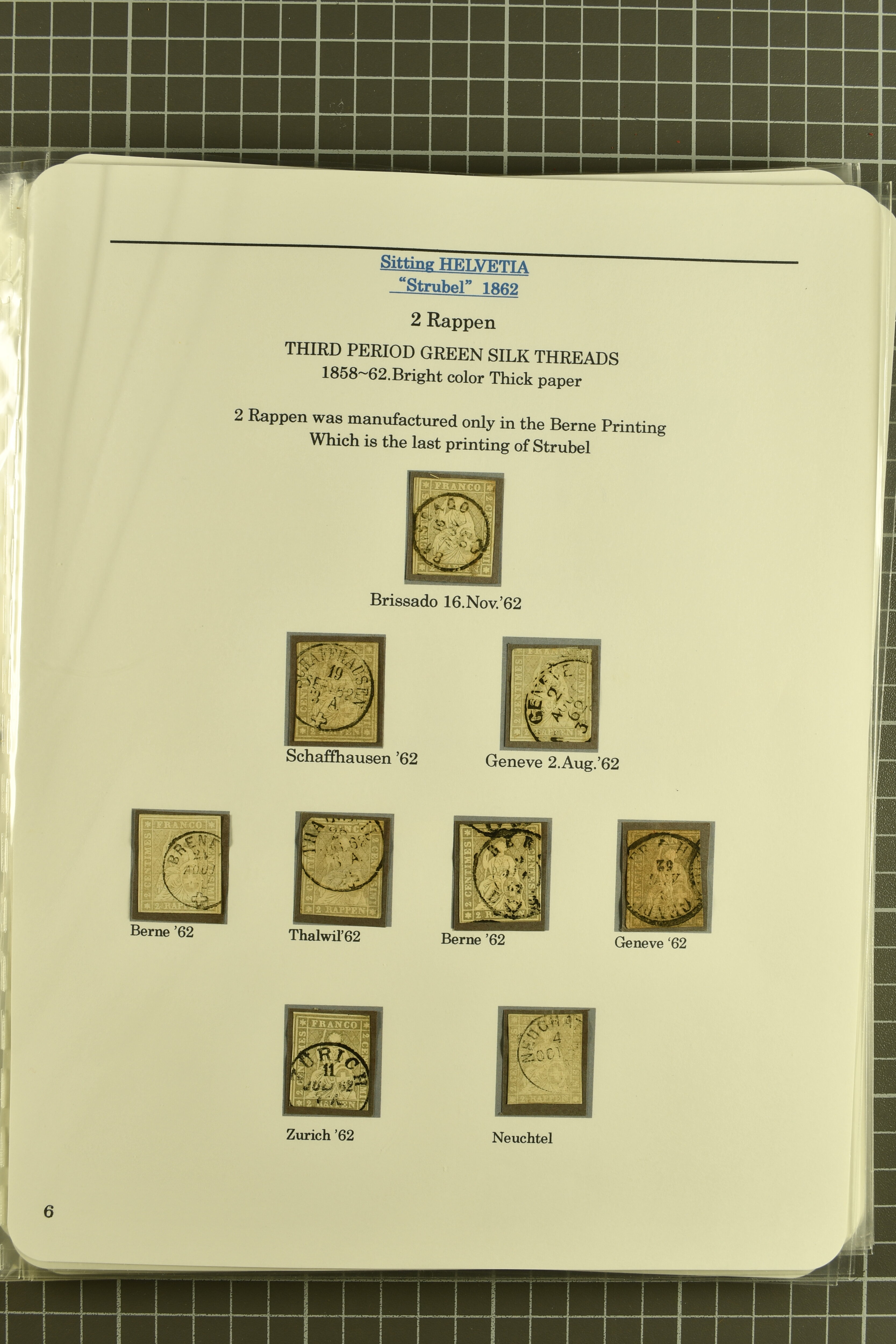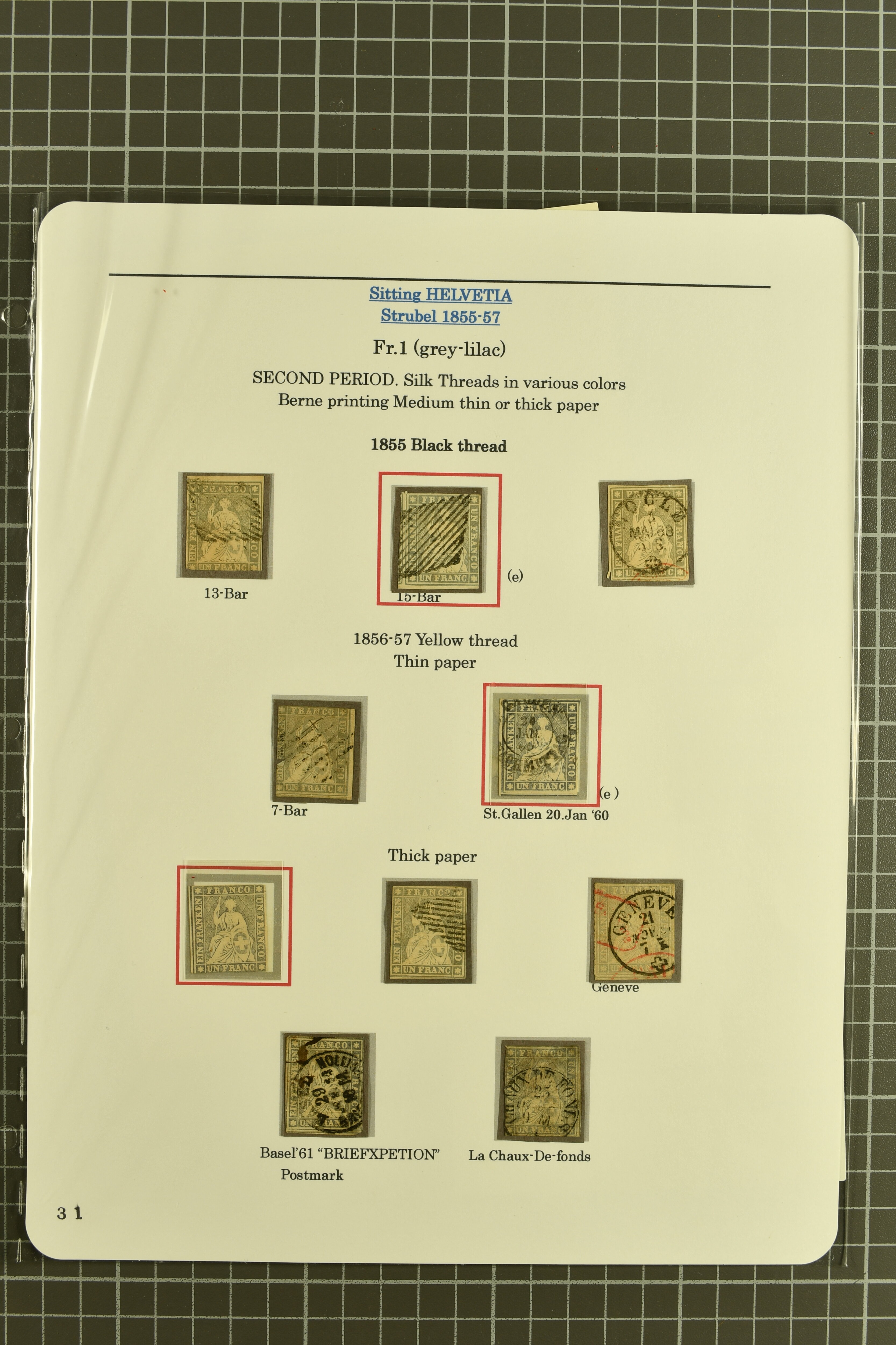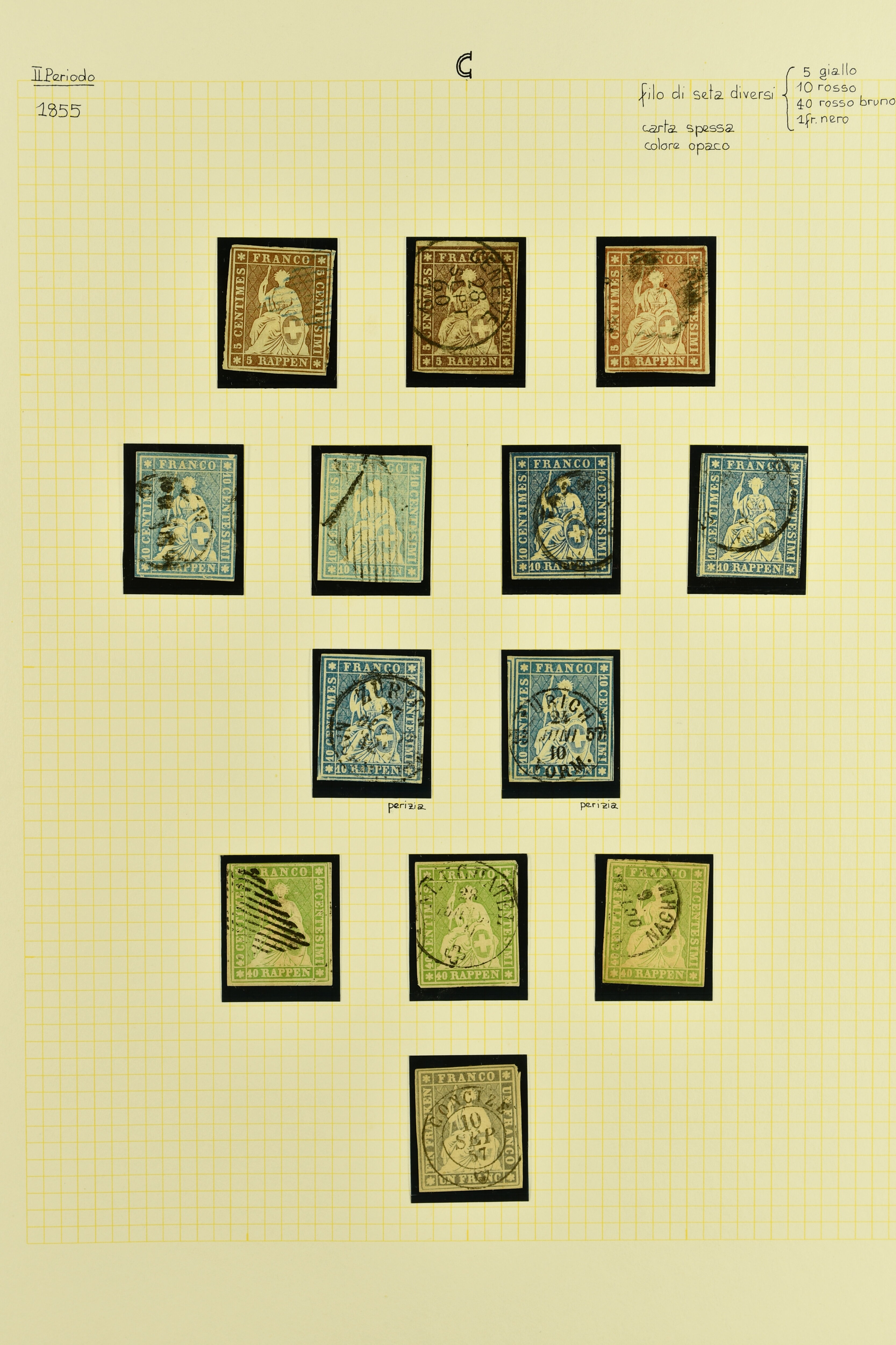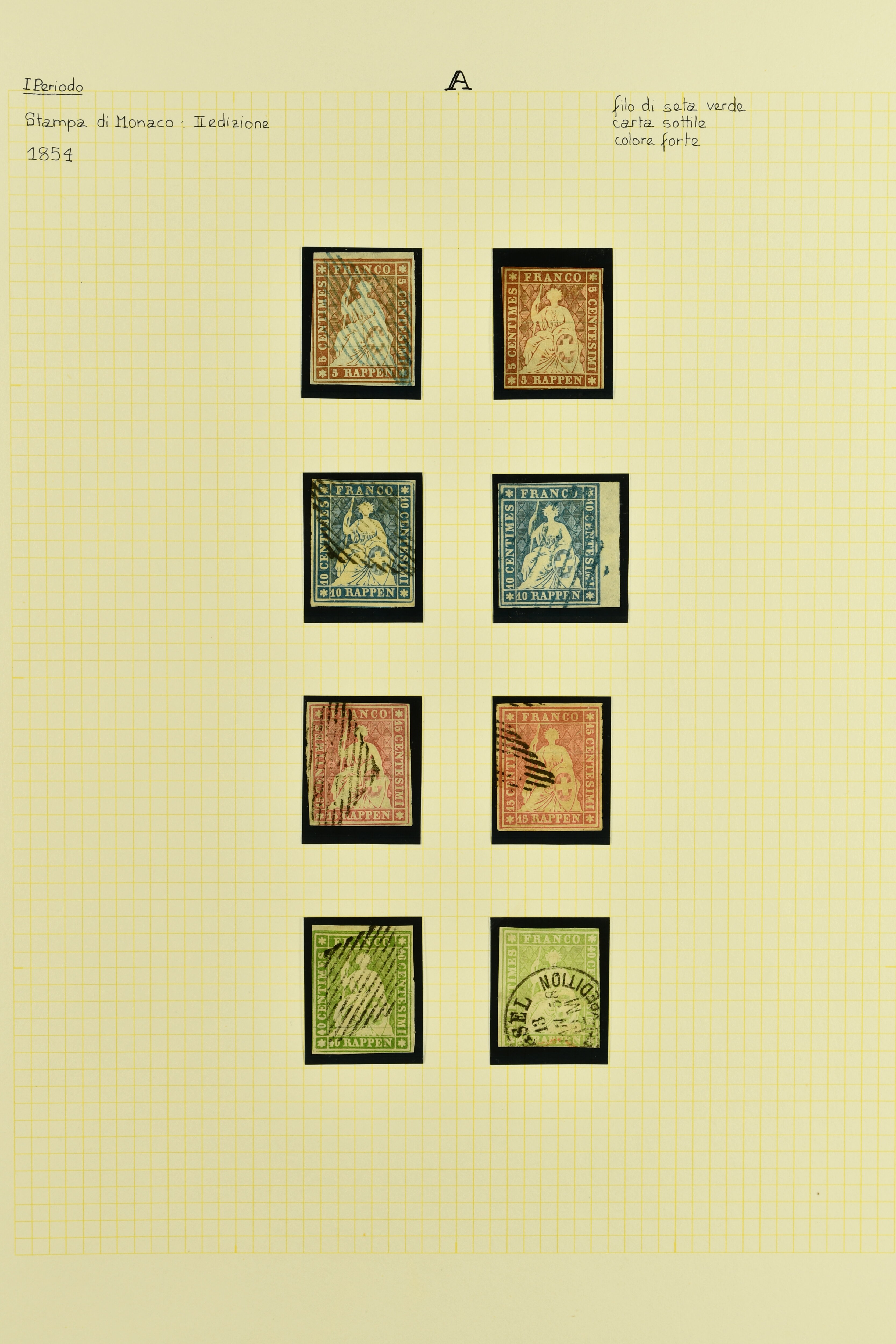 9774 image1854/62: Sammlung drei ungebrauchte und 65 gest. Einzelwerte auf acht alten Albumblättern. Dabei bessere Werte wie 5 Rp. braunorange (SBK 22Aa), 40 Rp. hellgrünlicholiv (SBK 26Aa), 5 Rp. braun (SBK 22A) ungebr., 10 Rp. hellgrünlichblau (SBK 23Ca), 1 Fr. grau mit schwarzem Seidenfaden (SBK 27C), schön zartklar und zentrisch entw. mit kl. Zweikreisstp. "CONCIZE 10 SEP. 57" in schwarz, drei Exemplare 1 Fr. grau mit gelbem Seidenfaden (SBK 27D) oder 2 Rp. grau (2, SBK 21G). Ferner schöne Randstücke wie 10 Rp. preussischblau (SBK 23A) mit breitem Bogenrand rechts oder 20 Rp. gelblichorange (SBK 25G) mit breitem Bogenrand links sowie Entwertungen wei blaue Luzerner Raute, Kastenstp. "MENDRISIO 61 GEN...", gefasster Stabstp. "ALTISHOFEN" oder schön waagr. aufges. Stabstp. "RIEIN" in schwarz auf 15 Rp. karmin (SBK 24D). Meist gute Erhaltung. SBK=CHF 15'000+ (Image 1) (Image 2) (Image 3) (Image 4) (Image 5) (Image 6) (Image 7) (Image 8)