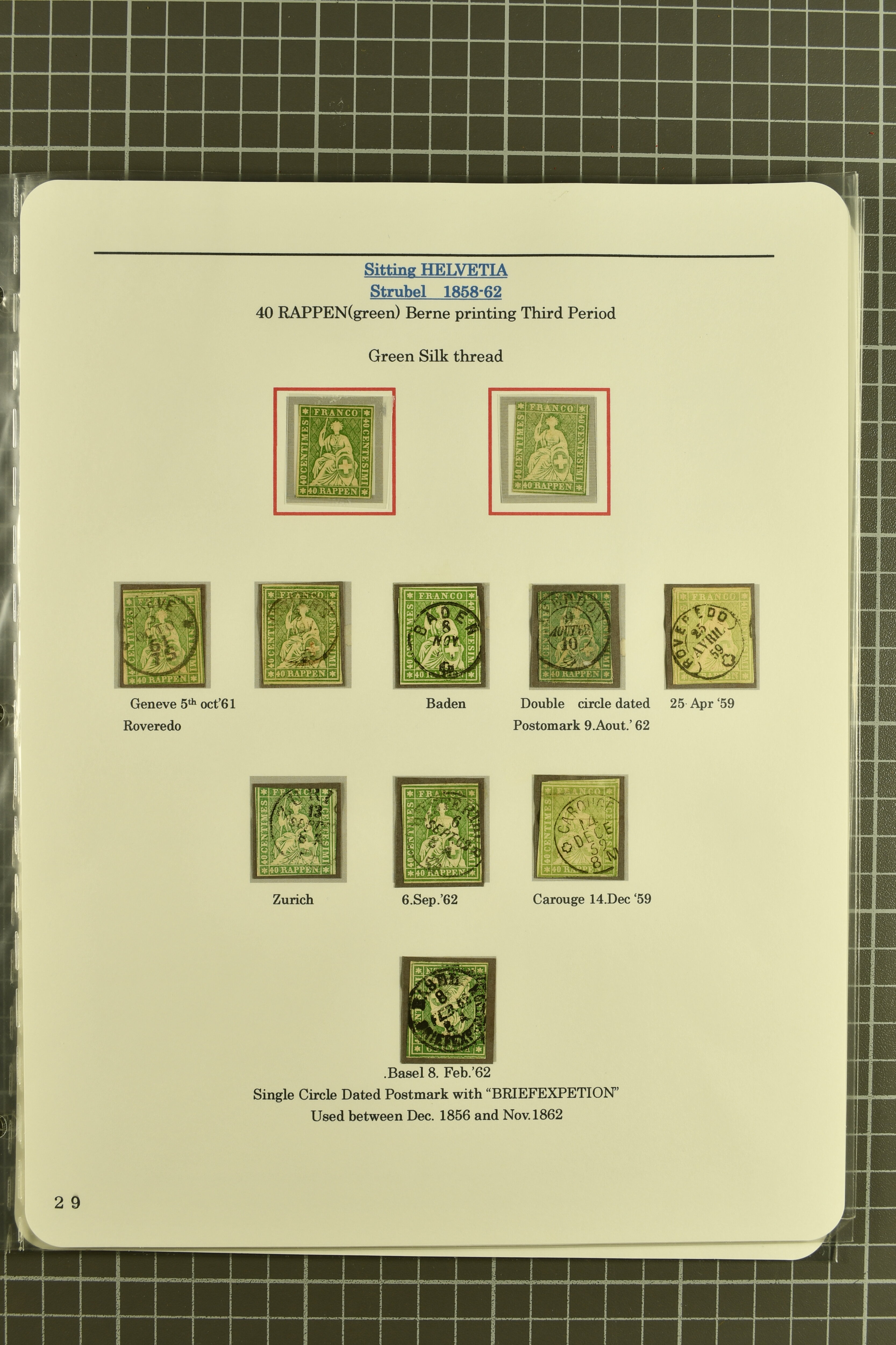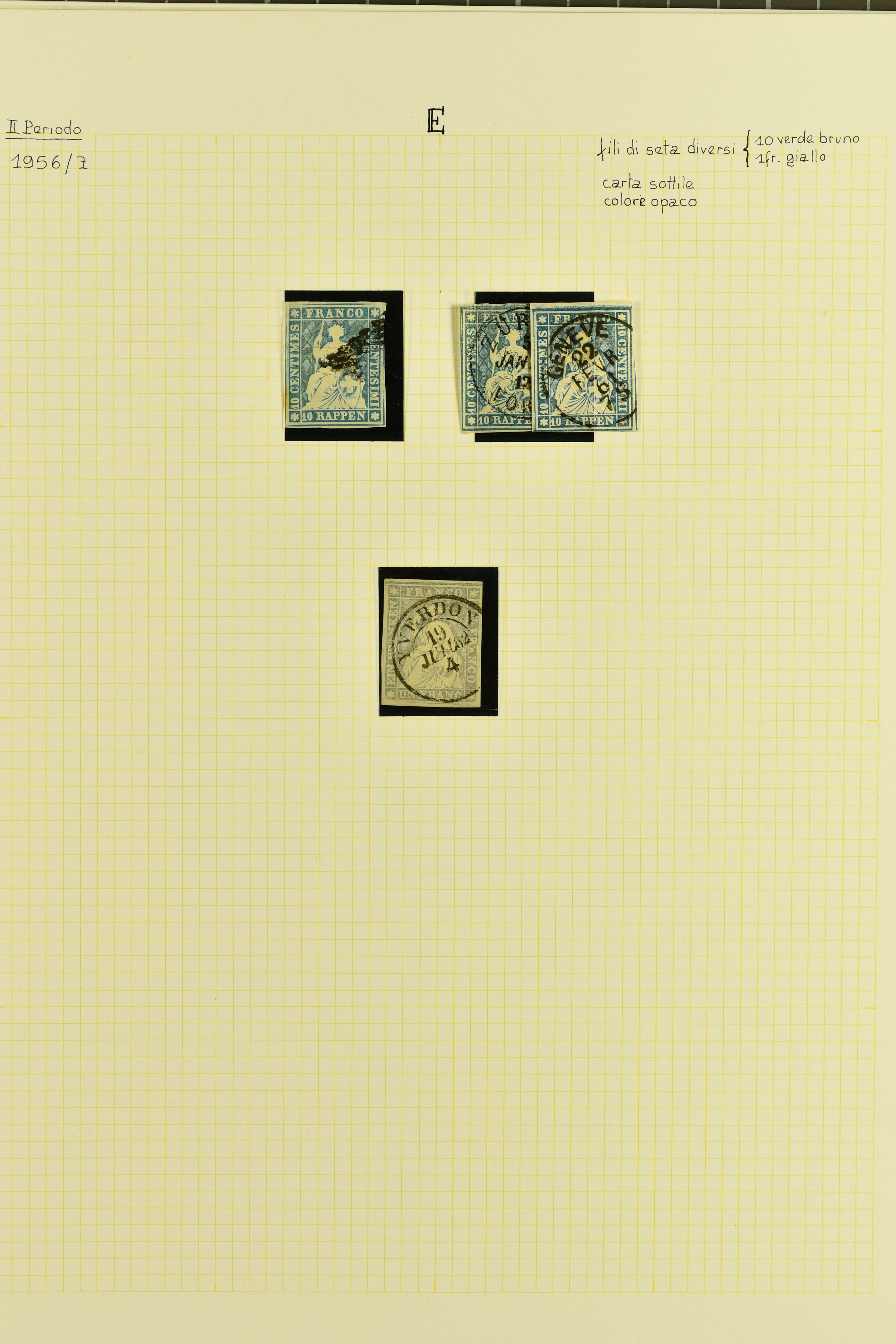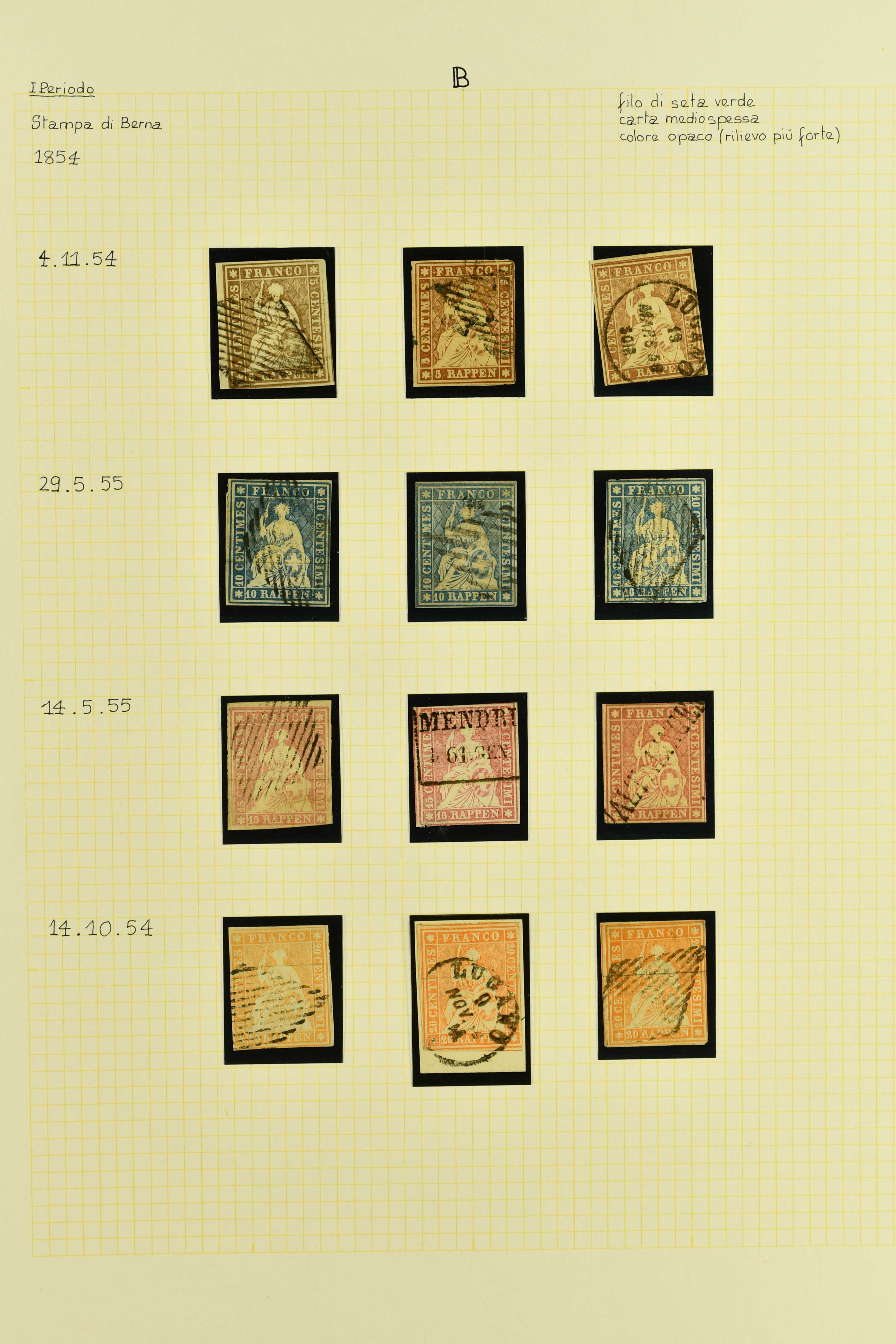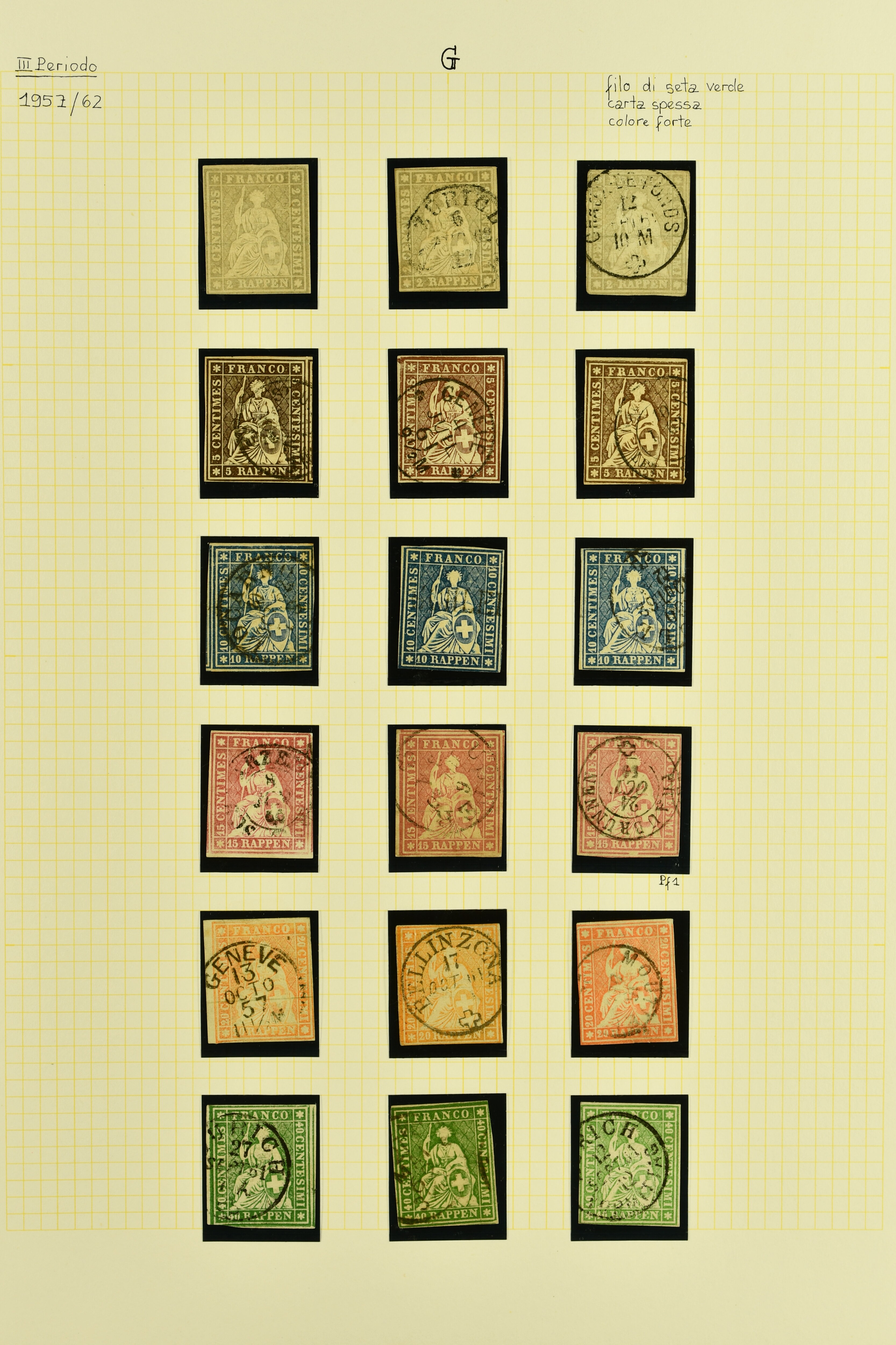 9774 image1854/62: Sammlung drei ungebrauchte und 65 gest. Einzelwerte auf acht alten Albumblättern. Dabei bessere Werte wie 5 Rp. braunorange (SBK 22Aa), 40 Rp. hellgrünlicholiv (SBK 26Aa), 5 Rp. braun (SBK 22A) ungebr., 10 Rp. hellgrünlichblau (SBK 23Ca), 1 Fr. grau mit schwarzem Seidenfaden (SBK 27C), schön zartklar und zentrisch entw. mit kl. Zweikreisstp. "CONCIZE 10 SEP. 57" in schwarz, drei Exemplare 1 Fr. grau mit gelbem Seidenfaden (SBK 27D) oder 2 Rp. grau (2, SBK 21G). Ferner schöne Randstücke wie 10 Rp. preussischblau (SBK 23A) mit breitem Bogenrand rechts oder 20 Rp. gelblichorange (SBK 25G) mit breitem Bogenrand links sowie Entwertungen wei blaue Luzerner Raute, Kastenstp. "MENDRISIO 61 GEN...", gefasster Stabstp. "ALTISHOFEN" oder schön waagr. aufges. Stabstp. "RIEIN" in schwarz auf 15 Rp. karmin (SBK 24D). Meist gute Erhaltung. SBK=CHF 15'000+ (Image 1) (Image 2) (Image 3) (Image 4) (Image 5) (Image 6) (Image 7) (Image 8)