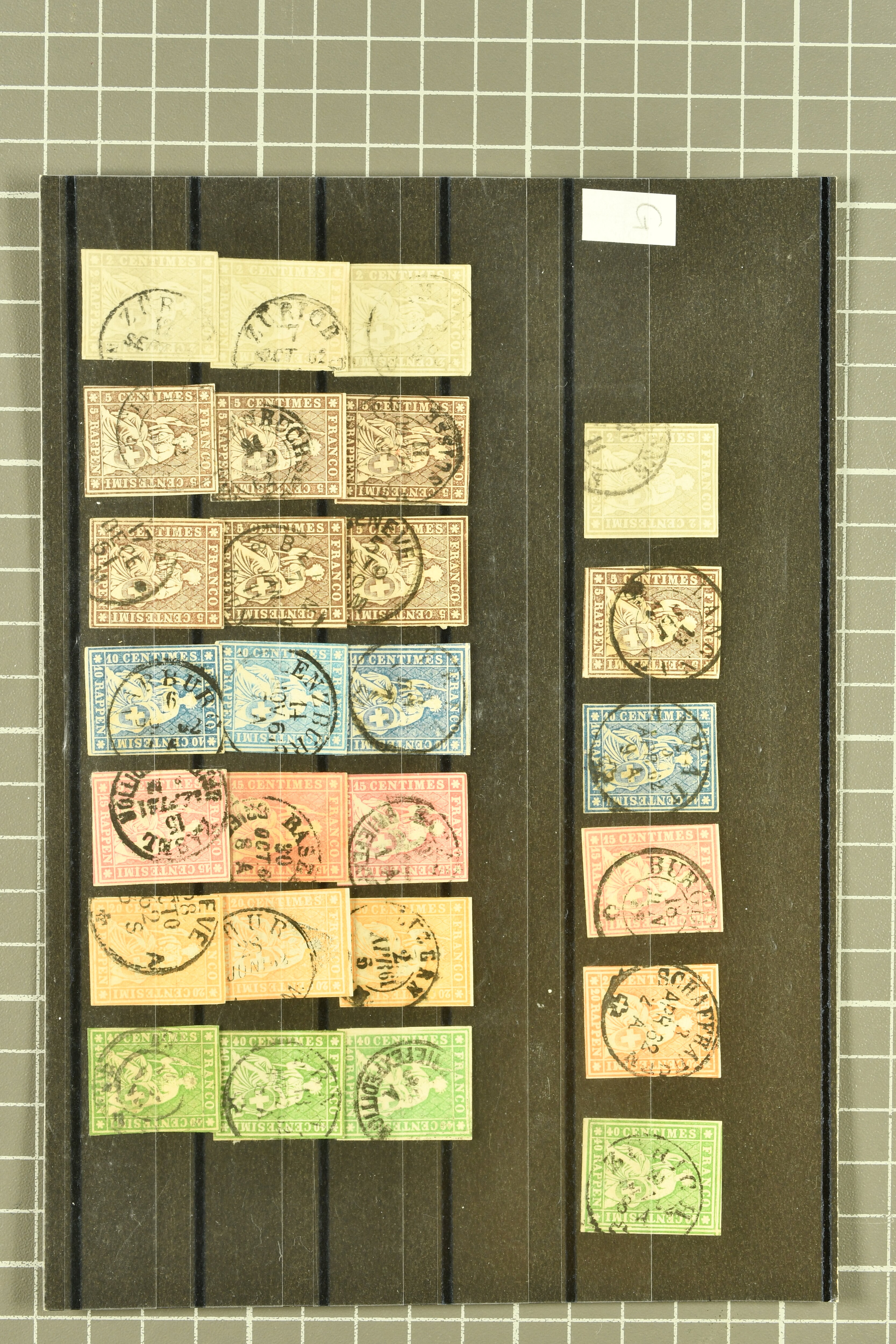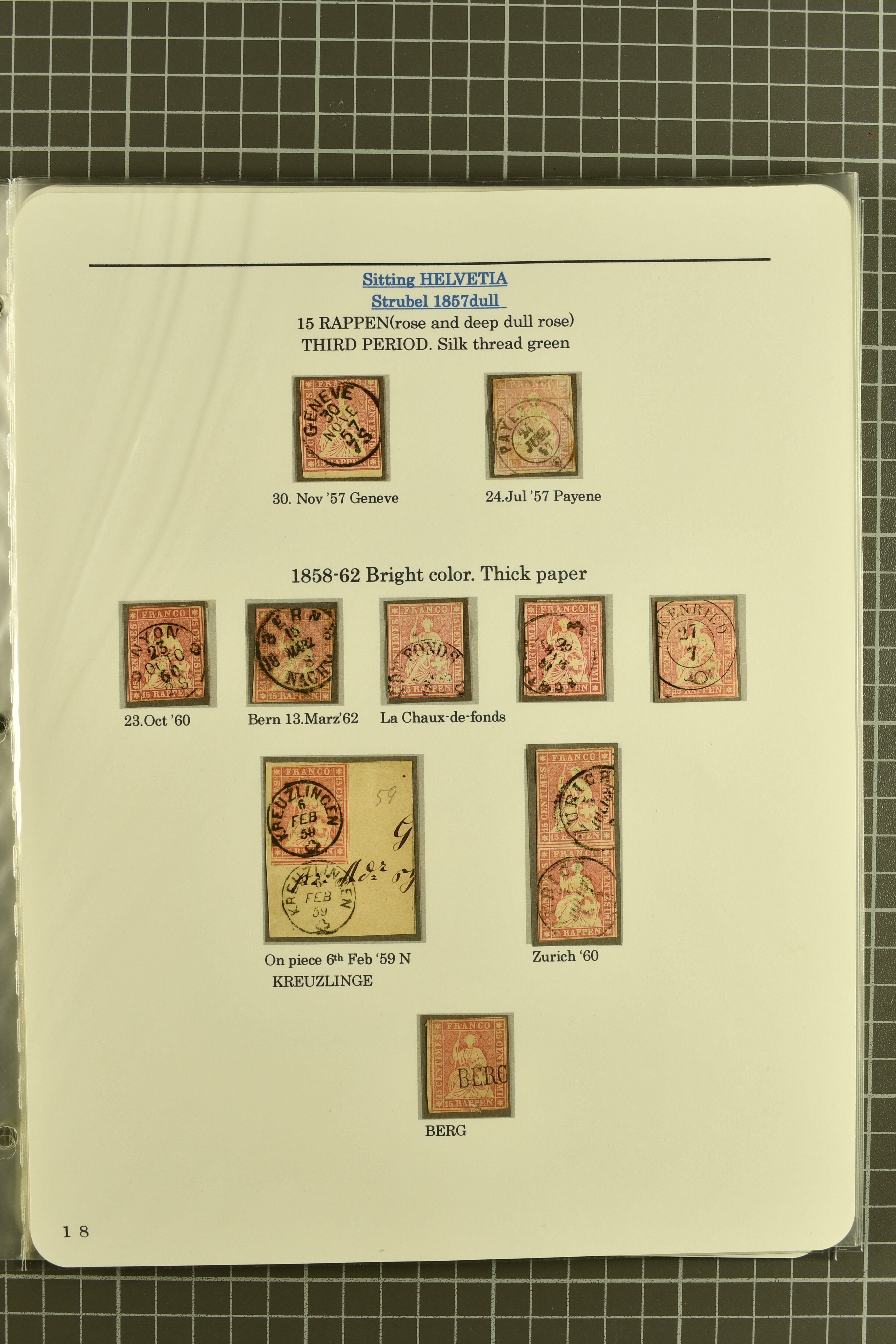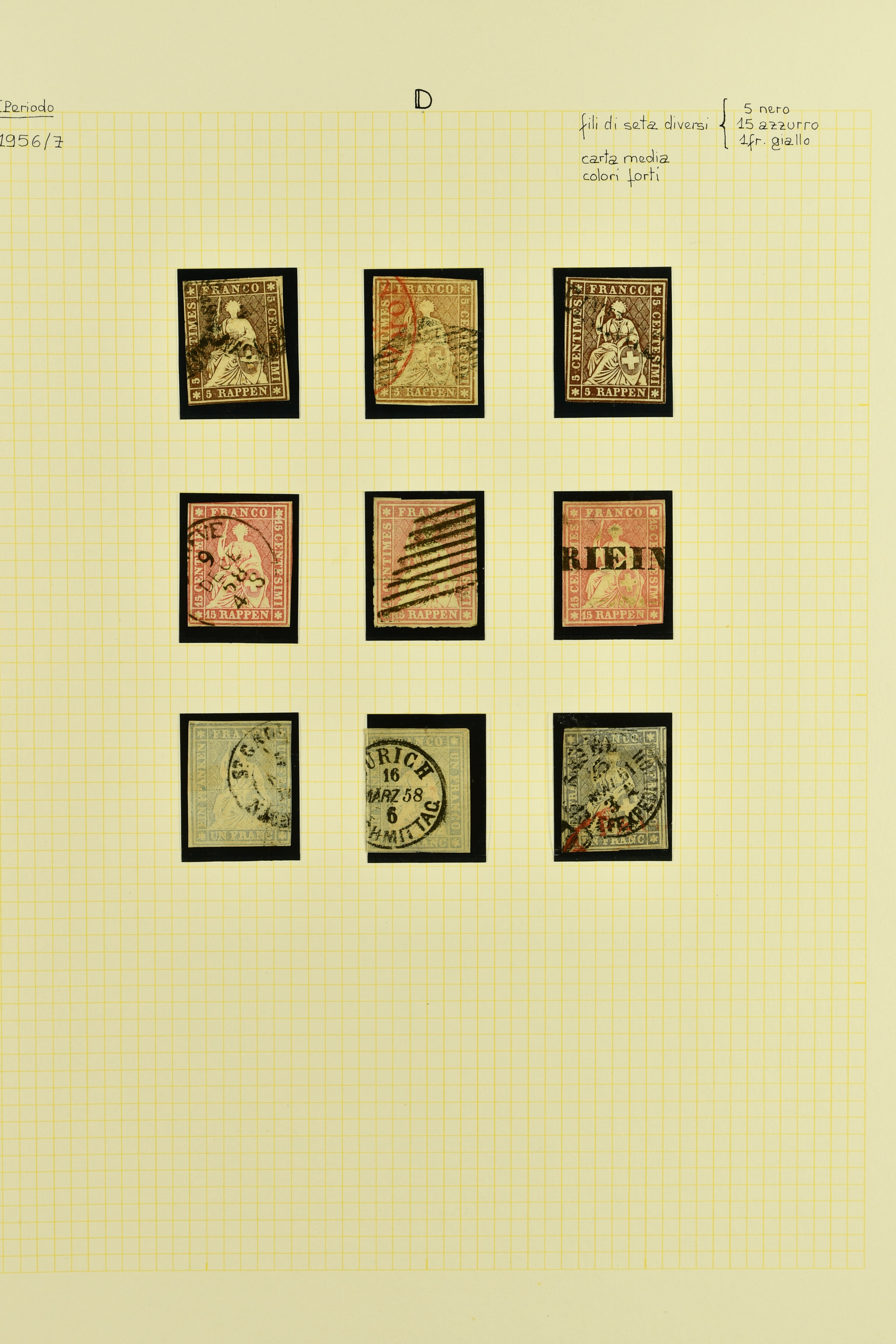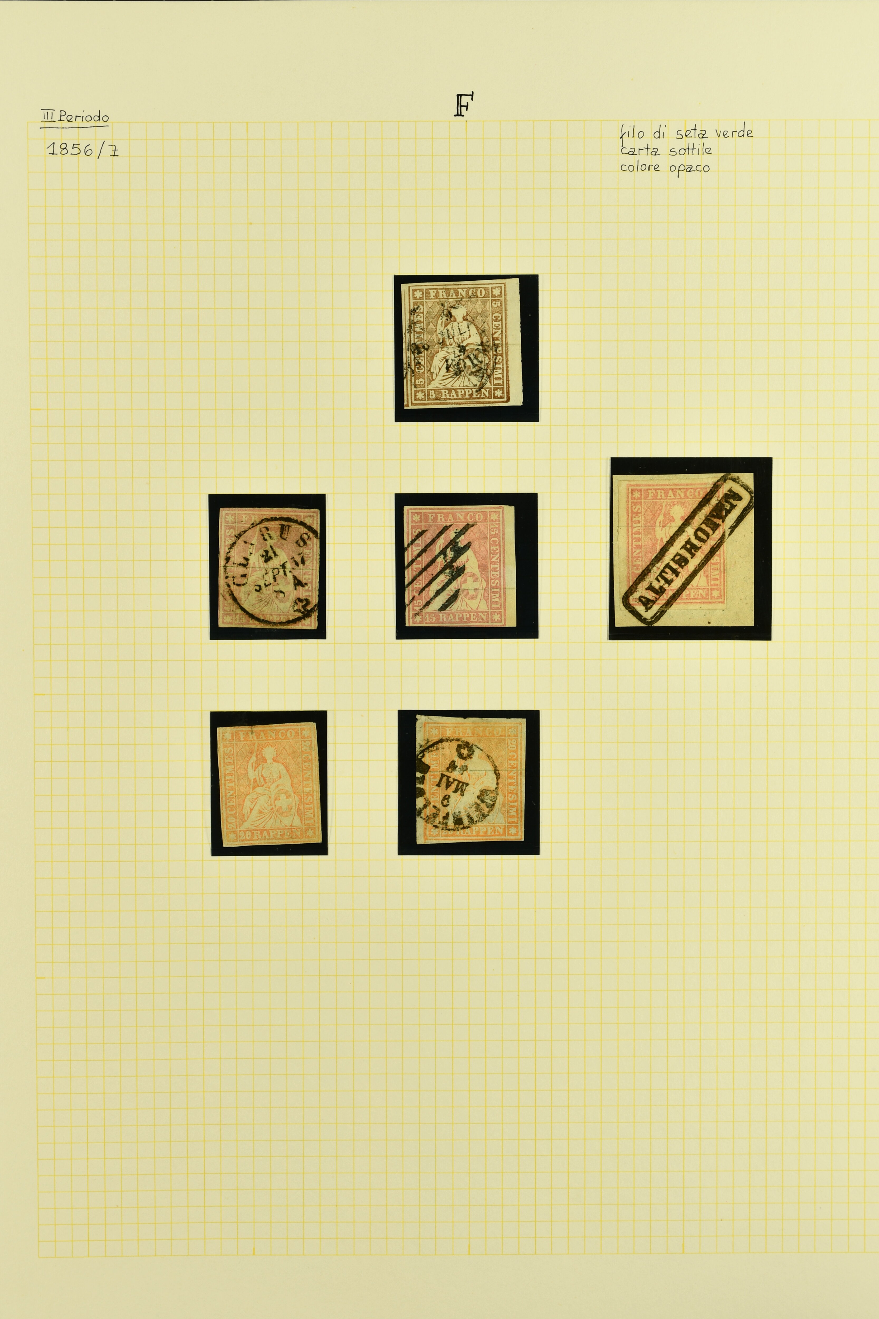 9774 image1854/62: Sammlung drei ungebrauchte und 65 gest. Einzelwerte auf acht alten Albumblättern. Dabei bessere Werte wie 5 Rp. braunorange (SBK 22Aa), 40 Rp. hellgrünlicholiv (SBK 26Aa), 5 Rp. braun (SBK 22A) ungebr., 10 Rp. hellgrünlichblau (SBK 23Ca), 1 Fr. grau mit schwarzem Seidenfaden (SBK 27C), schön zartklar und zentrisch entw. mit kl. Zweikreisstp. "CONCIZE 10 SEP. 57" in schwarz, drei Exemplare 1 Fr. grau mit gelbem Seidenfaden (SBK 27D) oder 2 Rp. grau (2, SBK 21G). Ferner schöne Randstücke wie 10 Rp. preussischblau (SBK 23A) mit breitem Bogenrand rechts oder 20 Rp. gelblichorange (SBK 25G) mit breitem Bogenrand links sowie Entwertungen wei blaue Luzerner Raute, Kastenstp. "MENDRISIO 61 GEN...", gefasster Stabstp. "ALTISHOFEN" oder schön waagr. aufges. Stabstp. "RIEIN" in schwarz auf 15 Rp. karmin (SBK 24D). Meist gute Erhaltung. SBK=CHF 15'000+ (Image 1) (Image 2) (Image 3) (Image 4) (Image 5) (Image 6) (Image 7) (Image 8)