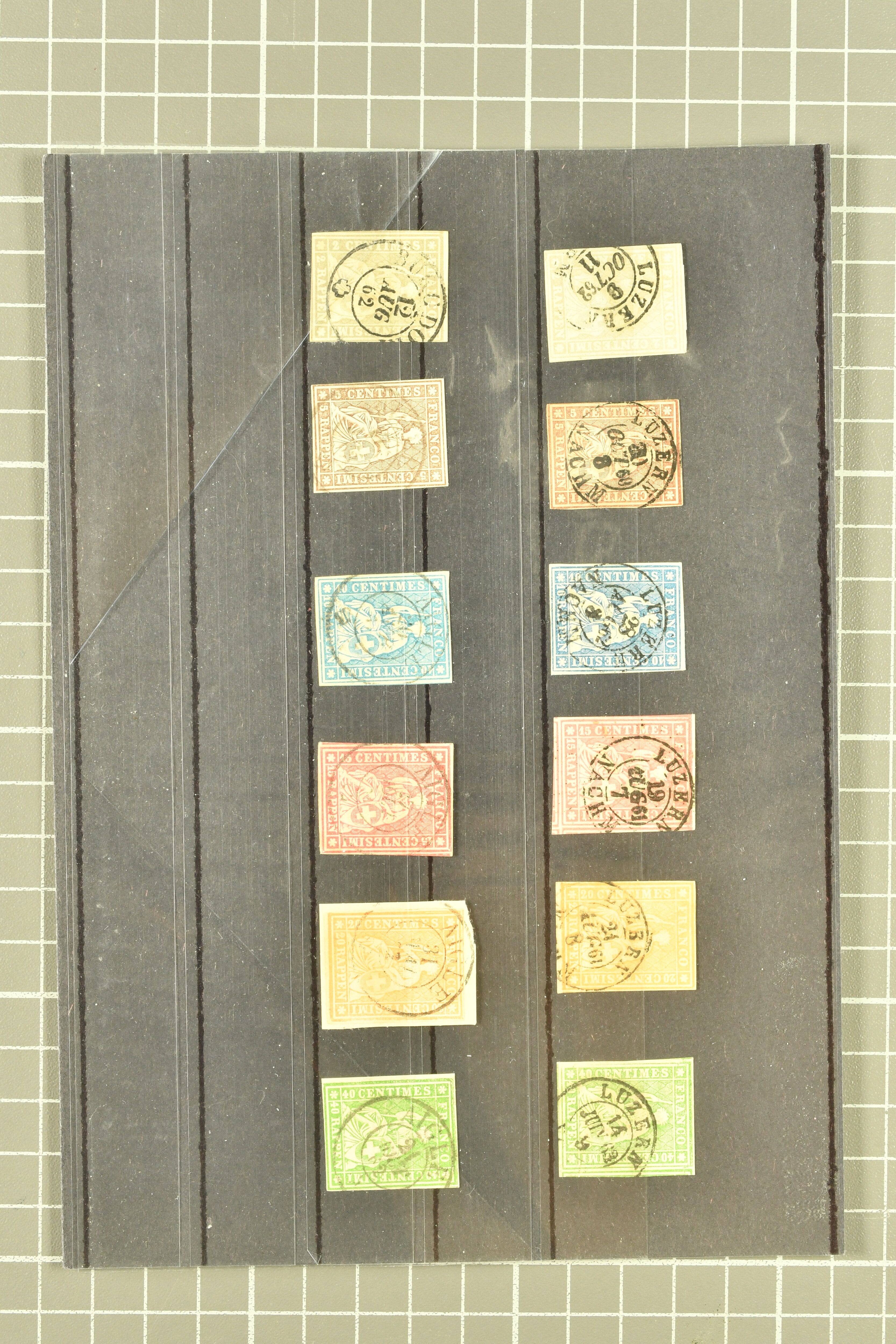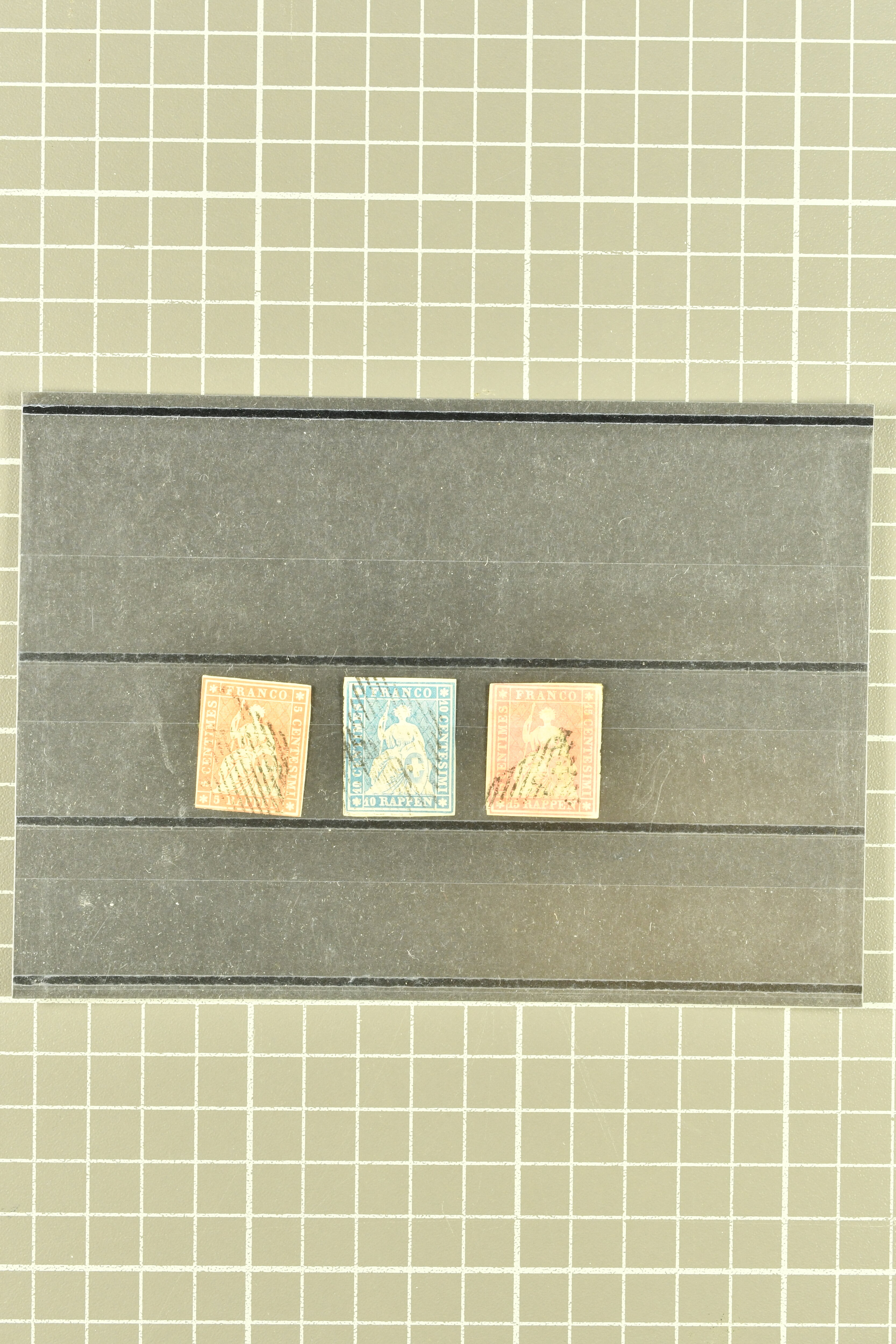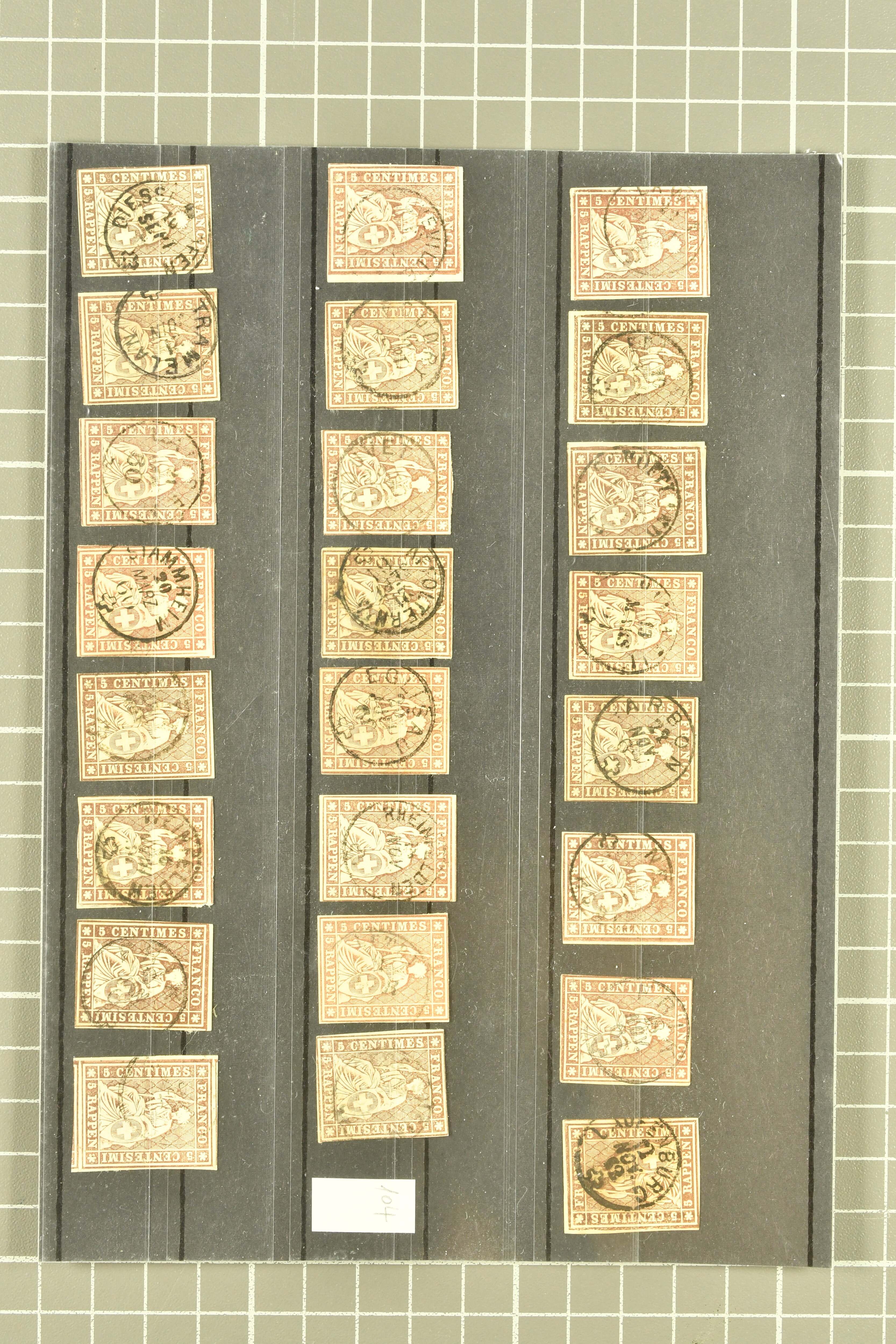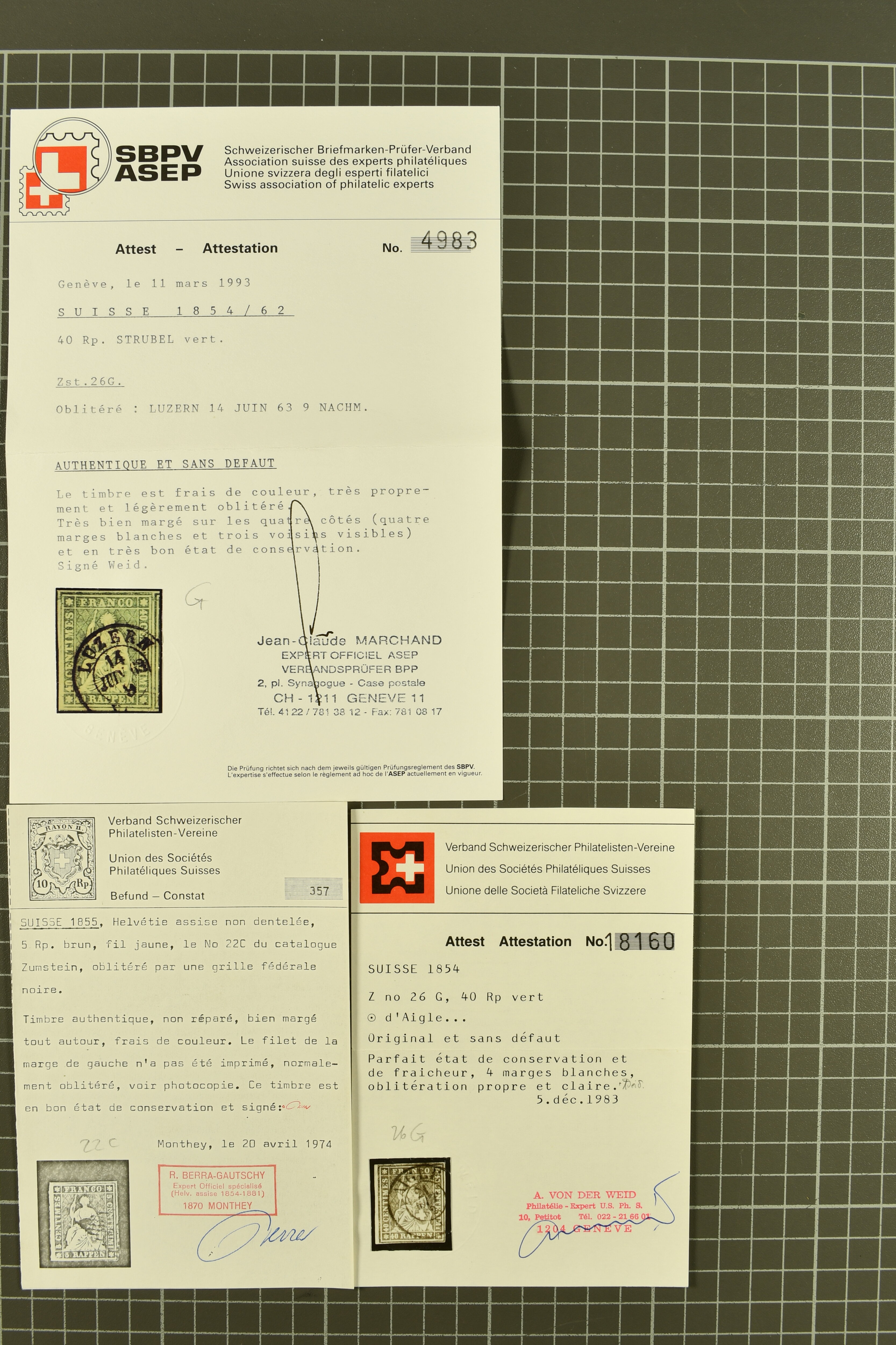 9774 image1854/62: Sammlung drei ungebrauchte und 65 gest. Einzelwerte auf acht alten Albumblättern. Dabei bessere Werte wie 5 Rp. braunorange (SBK 22Aa), 40 Rp. hellgrünlicholiv (SBK 26Aa), 5 Rp. braun (SBK 22A) ungebr., 10 Rp. hellgrünlichblau (SBK 23Ca), 1 Fr. grau mit schwarzem Seidenfaden (SBK 27C), schön zartklar und zentrisch entw. mit kl. Zweikreisstp. "CONCIZE 10 SEP. 57" in schwarz, drei Exemplare 1 Fr. grau mit gelbem Seidenfaden (SBK 27D) oder 2 Rp. grau (2, SBK 21G). Ferner schöne Randstücke wie 10 Rp. preussischblau (SBK 23A) mit breitem Bogenrand rechts oder 20 Rp. gelblichorange (SBK 25G) mit breitem Bogenrand links sowie Entwertungen wei blaue Luzerner Raute, Kastenstp. "MENDRISIO 61 GEN...", gefasster Stabstp. "ALTISHOFEN" oder schön waagr. aufges. Stabstp. "RIEIN" in schwarz auf 15 Rp. karmin (SBK 24D). Meist gute Erhaltung. SBK=CHF 15'000+ (Image 1) (Image 2) (Image 3) (Image 4) (Image 5) (Image 6) (Image 7) (Image 8)