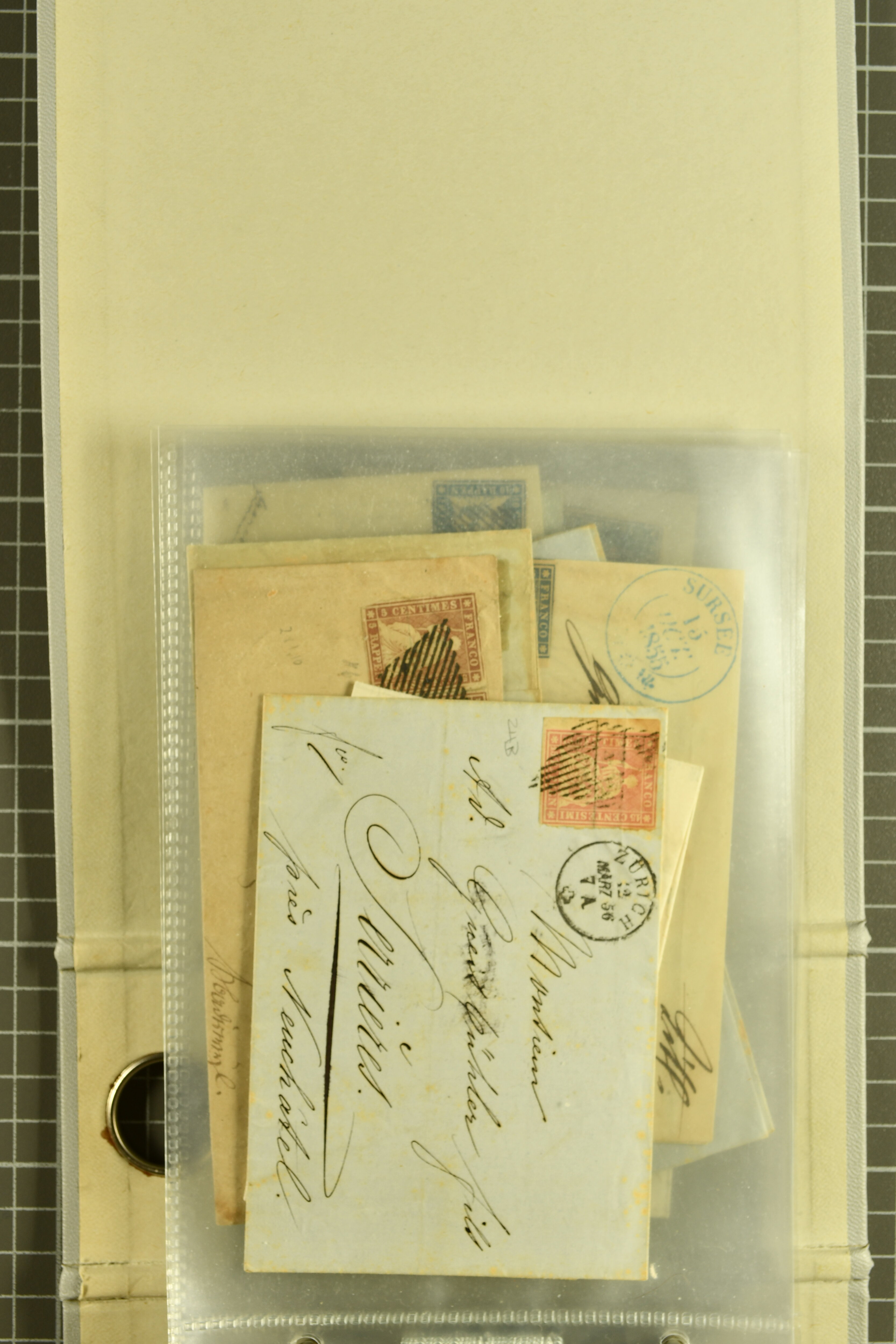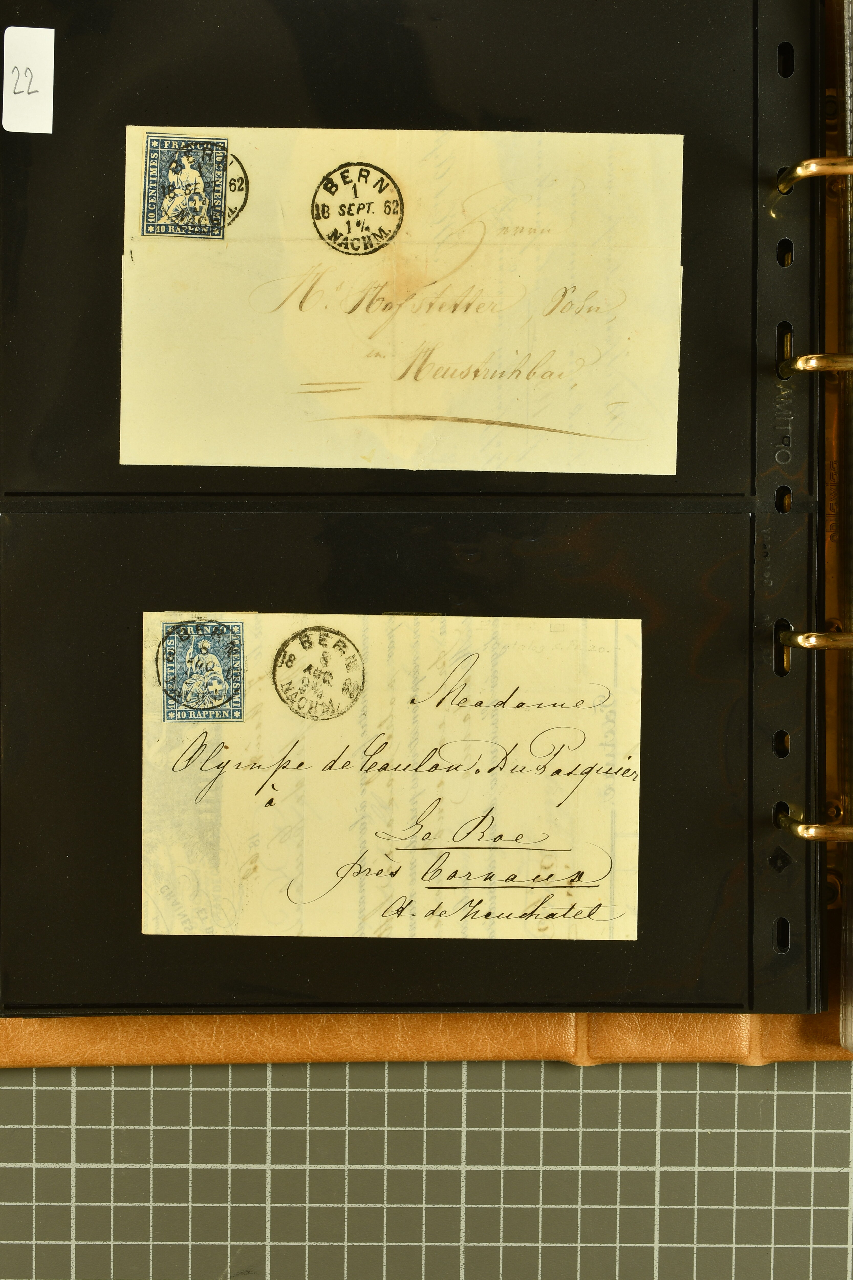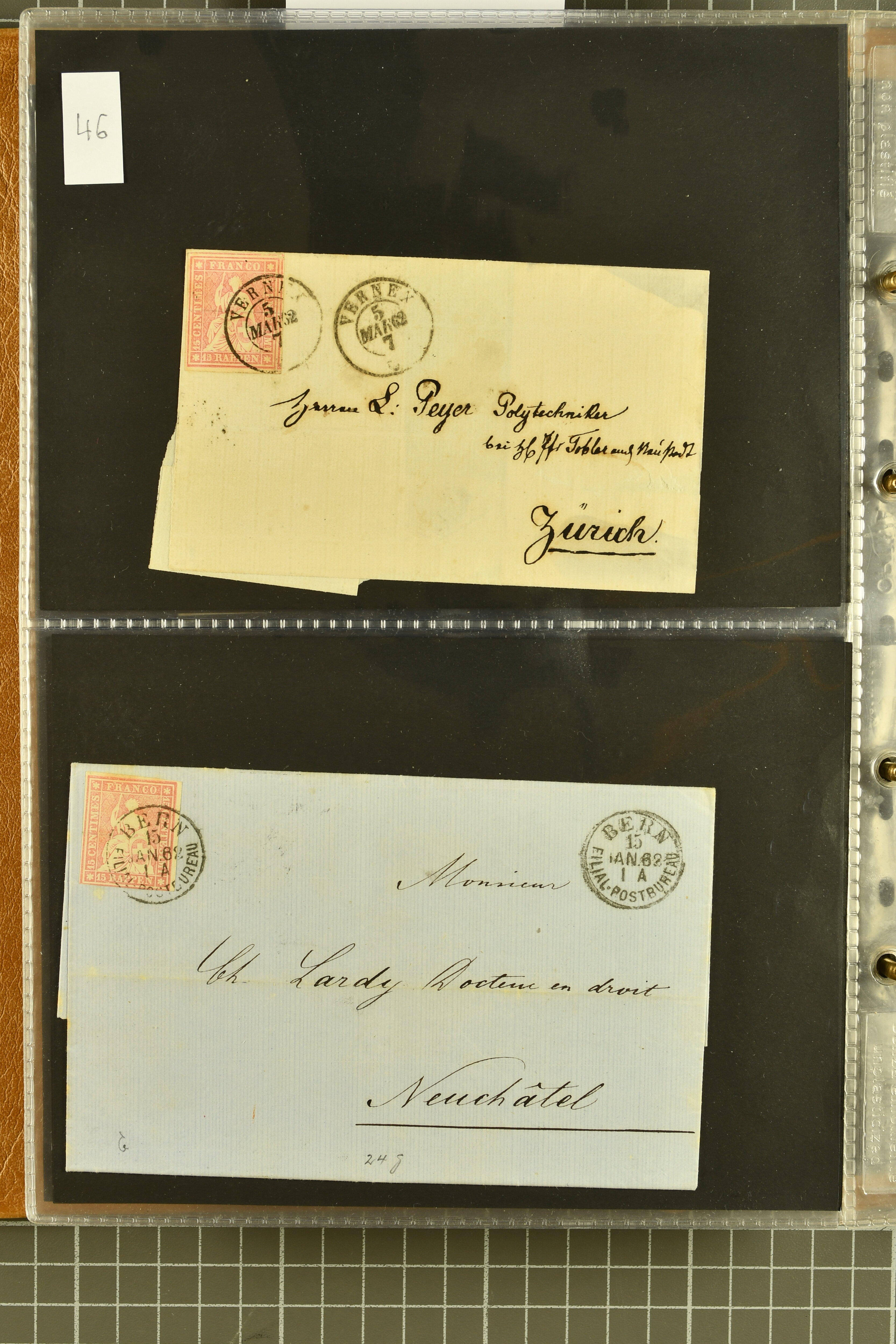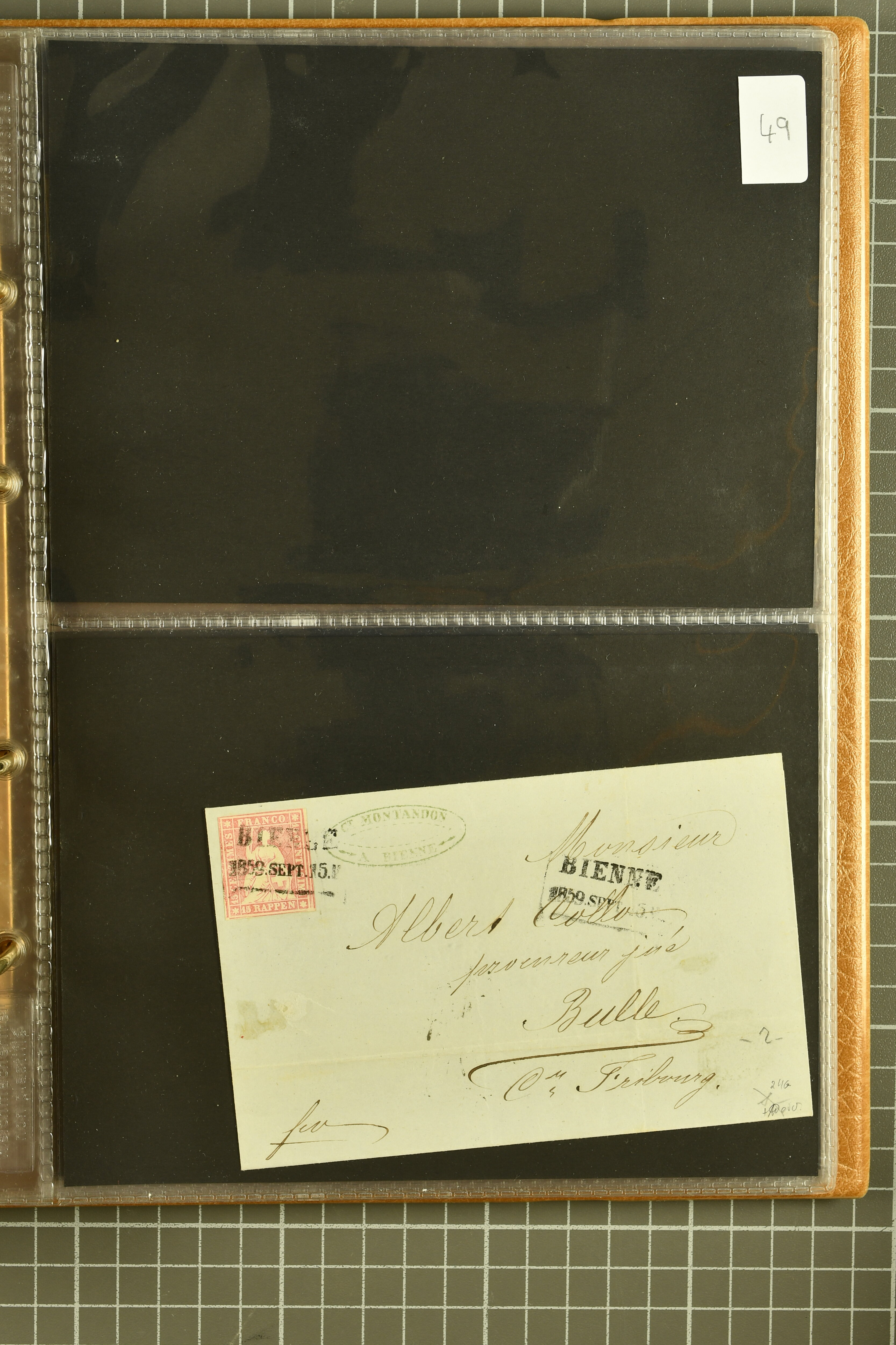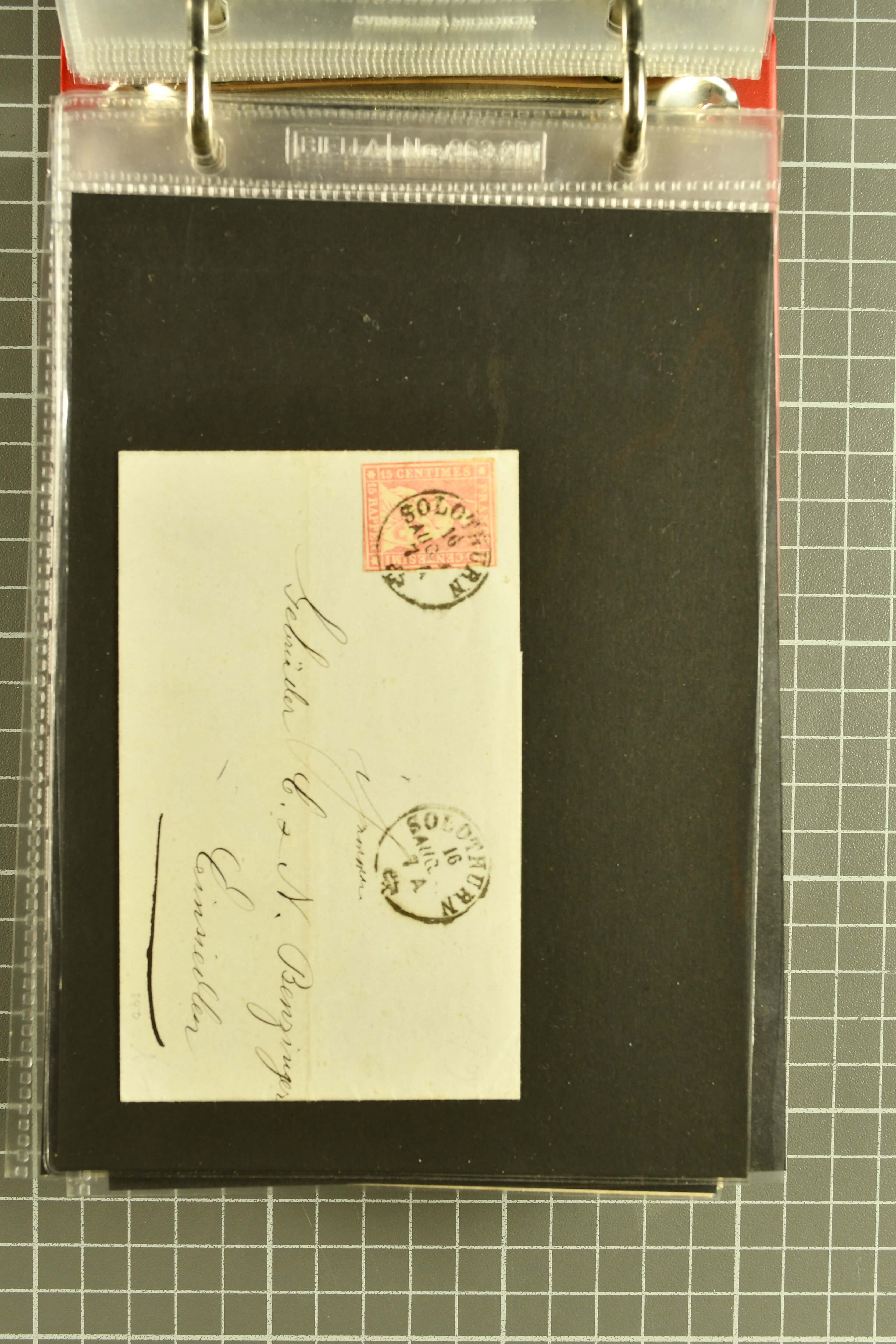 9791 cover image1859/62: Sammlung 92 Strubelfrankaturen der letzten Berner Druckperiode mit einigen schönen Randstücken, Einschreibe- oder Nachnahmefrankaturen, schwerpunktmässig aber einer interessanten Vielfalt an Entwertungen. Dabei Schreibschriftstp. "Schwarzenegg" auf 10 Rp. blau (SBK 23G) auf Brief nach Schlosswil, grosse Zierkreisstempel "SAINT-SULPICE 28 AOUT 1862" auf 10 Rp. blau mit Bogenrand unten und "AUVERNIER 14 MAI 1861" ebenfalls auf 10 Rp. blau, Zierlinienstempel "SCHÜPFHEIM 16 AVRIL 62", Fingerhutstempel inkl. "RECONVILLIER 27 NOV. 60" in blau auf 40 Rp. olivgrün (SBK 26G) auf Faltbrief mit nebenges. kursivem "P.D." im Kasten (AW 375) nach Frankreich aber auch von Sonvillier, Les Brenets oder Poschiavo, gefasste Stabstp. inkl. den selteneren Solothurner Stempeln "HIMMELRIED", "KLUS" und "BÄRSCHWIL" sowie Stabstempel von zum Teil selteneren Ortschaften wie Murg, Fällanden, Bättwil, Zutzgen, Zeinigen, Klosters Platz, Seegräben, Pfungen, Hünenberg, Corcelles. Unterschiedliche Erhaltung. SBK=CHF 11'000+ (Image 1) (Image 2) (Image 3) (Image 4) (Image 5) (Image 6) (Image 7) (Image 8) (Image 9) (Image 10) (Image 11) (Image 12) (Image 13) (Image 14) (Image 15) (Image 16) (Image 17) (Image 18) (Image 19) (Image 20) (Image 21) (Image 22) (Image 23) (Image 24) (Image 25) (Image 26) (Image 27) (Image 28) (Image 29) (Image 30) (Image 31) (Image 32) (Image 33) (Image 34) (Image 35) (Image 36) (Image 37) (Image 38) (Image 39) (Image 40) (Image 41) (Image 42) (Image 43) (Image 44) (Image 45) (Image 46) (Image 47) (Image 48) (Image 49)