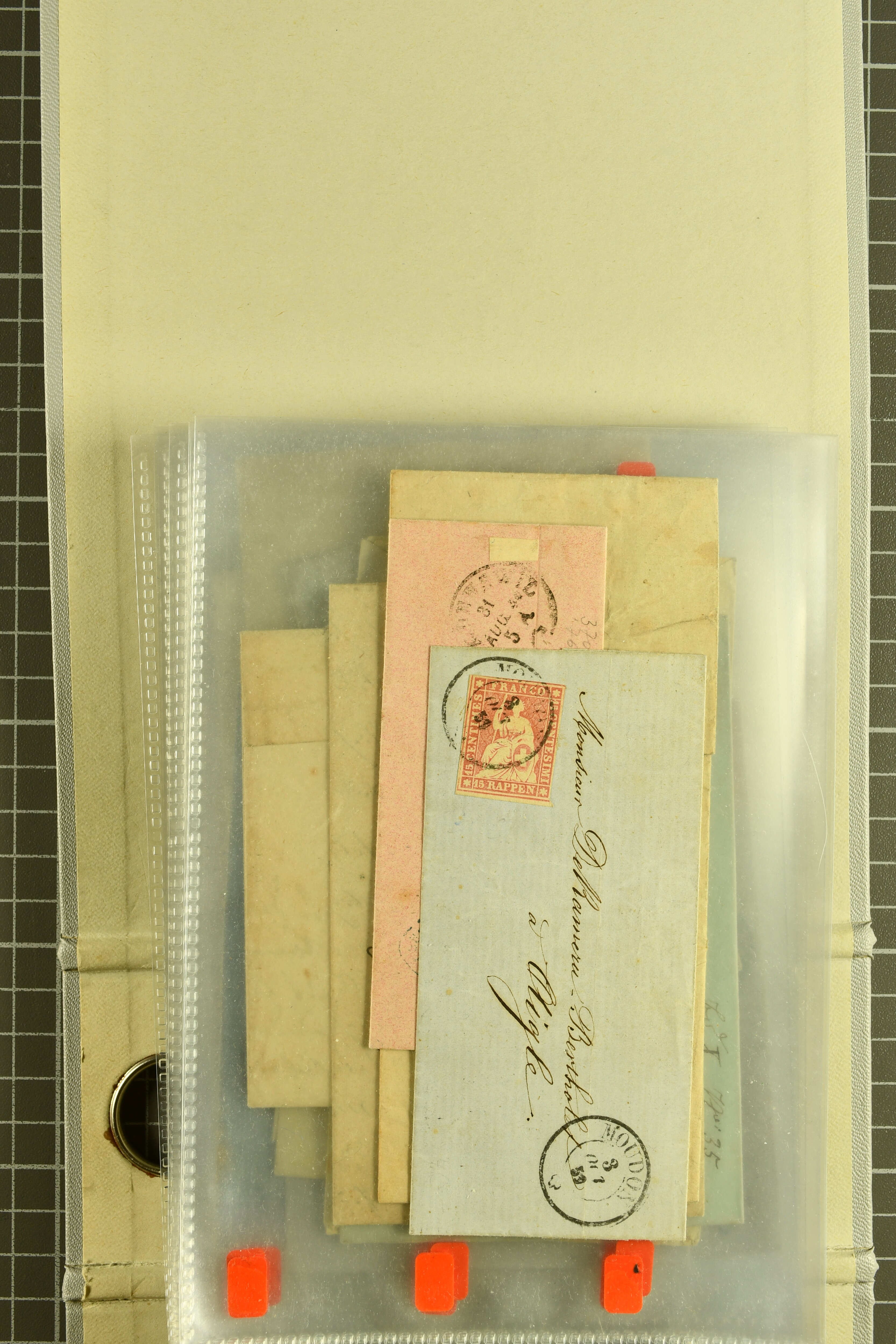 9787 cover image1854/62: Partie 18 interessante Strubelfrankaturen. Dabei seltenere Werte wie 15 Rp. hellbräunlichrot (SBK 24Aa) oder 5 Rp. graubraun auf dünnem Münchner Papier (SBK 22F) jeweils in Buntfrankatur mit anderen Werten, Einheiten wie 10 Rp. blau (SBK 23G) im waagr. Dreierstreifen, klar entw. mit drei Abschlägen des Stabstp. "HILDISRIEDEN" auf hübschem blauem Nachnahme-Faltbrief nach Reiden, Auslandsfrankaturen wie 10 Rp. preussischblau und 40 Rp. hellgrünlicholiv (SBK 23A+26A) auf dekorativem Briefcouvert von Zürich an einen Schweizer in fremden Diensten in Vicenza, interessante Verwendungen wie 5 Rp. braun (SBK 22D) als moderierte s Drucksachenporto von 5 Rp. im 3. Briefkreis bei gleichzeitiger Aufgabe von 21 oder mehr Exemplaren auf Drucksache mit entspr. Stabstp. "AFFT. MODÉRÉ" von Fribourg nach Porrentruy, grosszügige Randstücke, attraktive Belege wie Drucksachenstreifbänder oder ein geprägter Zierbriefumschlag sowie ausgesuchte Entwertungen wie Stabstp. "DACHSEN" in blau, "FILISUR", "BONADUZ", "SCANFS" und "NEUENEGG" oder Fingerhutstp. "NEUENKIRCH 19 AUG". Vorab gute Erhaltung; zwei Befunde, ein Attest (Image 1) (Image 2) (Image 3) (Image 4) (Image 5) (Image 6)