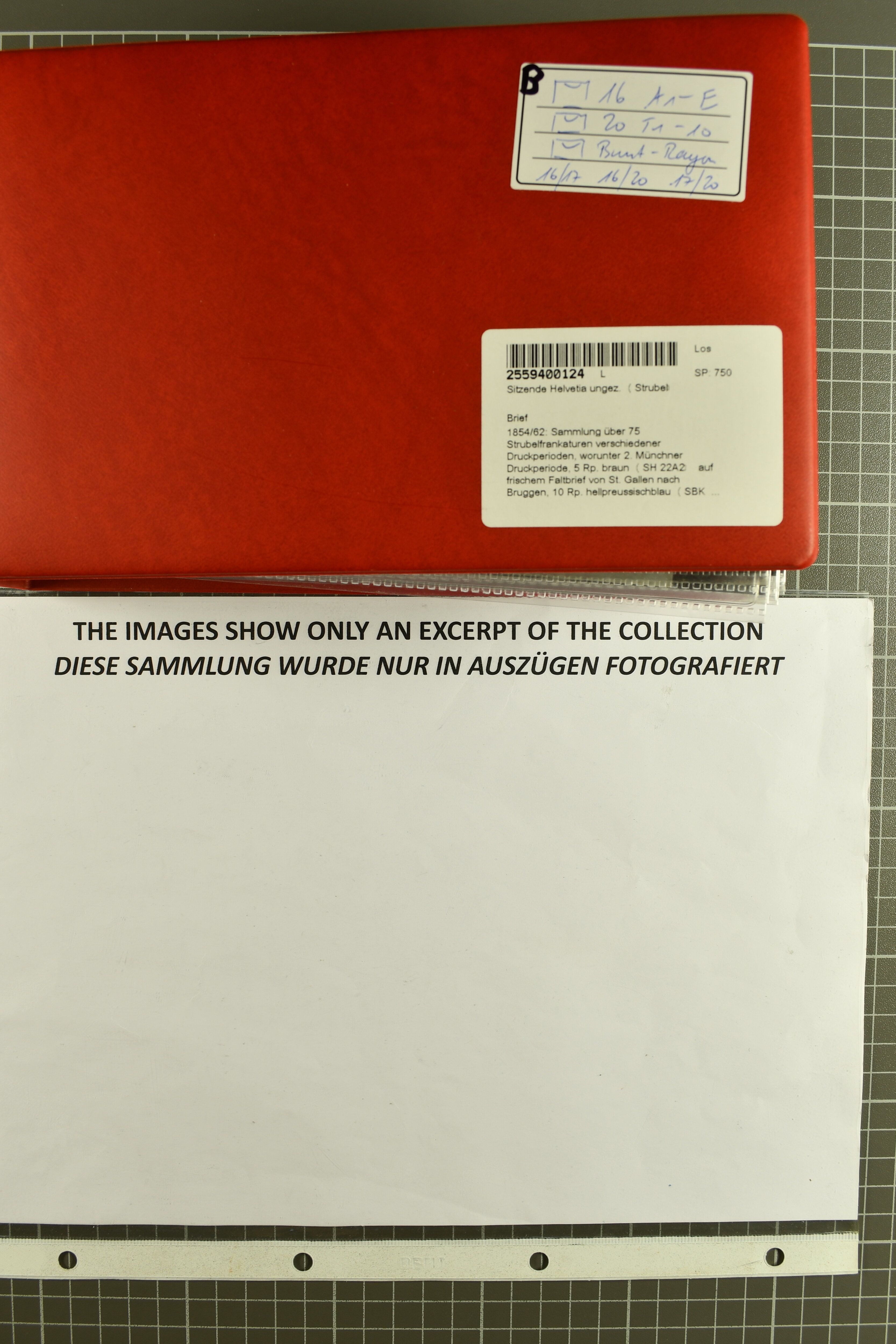 9793 cover image1854/62: Sammlung über 75 Strubelfrankaturen verschiedener Druckperioden, worunter 2. Münchner Druckperiode, 5 Rp. braun (SH 22A2) auf frischem Faltbrief von St. Gallen nach Bruggen, 10 Rp. hellpreussischblau (SBK 23Aa), leicht entw. auf Faltbrief von Kreuzstrasse (Oftringen) nach Bremgarten, 15 Rp. hellbräunlichrot (SBK 24Aa) auf sauberem Faltbrief von Basel nach Bremgarten, 10 Rp. preussischblau auf dünnem Zürcher Papier (SBK 23F) auf Faltbrief von Huttwil nach Sumiswald, 5 Rp. graubraun auf dünnem Münchner Papier (SBK 22F) dekorativ entw. mit schwarzer Genfer Raute auf Faltbrief nach Satigny sowie ein weiteres Exemplar zus. mit 15 Rp. rötlichkarmin (SBK 24B) auf Nachnahmecouvert von Hinwil nach Wald, vier Frankaturen der 15 Rp. rötlichkarmin auf ebensolchem Papier (SBK 24F) oder 2 Rp. grau (SBK 21G) auf Drucksache von Winterthur nach Boniswil (AG). Ausserdem interessante Frankaturen wie diagonal halbierte 5 Rp. braun (SBK 22G) als "Genfer Provisorium" auf grossem Briefteil sowie Nachnahme-, Einschreibe- oder Auslandsfrankaturen, zahlreiche attraktive Randstücke und vielfältige Entwertungen wie Stabstempel "KOENIZ", gekreuzte Stabstp. "ROTHENBURG", doppelt gefasster Stabstp. "UFFIKON" oder Fingerhutstp. "RHEINFELDEN 24 SEPT. 62", "LENGNAU 15 JUIN" oder "OBERUZWYL 12 JUNI 57" . Etwas unterschiedlich aber attraktiv, teils signiert, sieben Befunde, drei Atteste. SBK=CHF 28'000+ (Image 1) (Image 2) (Image 3) (Image 4) (Image 5) (Image 6) (Image 7) (Image 8) (Image 9) (Image 10) (Image 11) (Image 12) (Image 13)