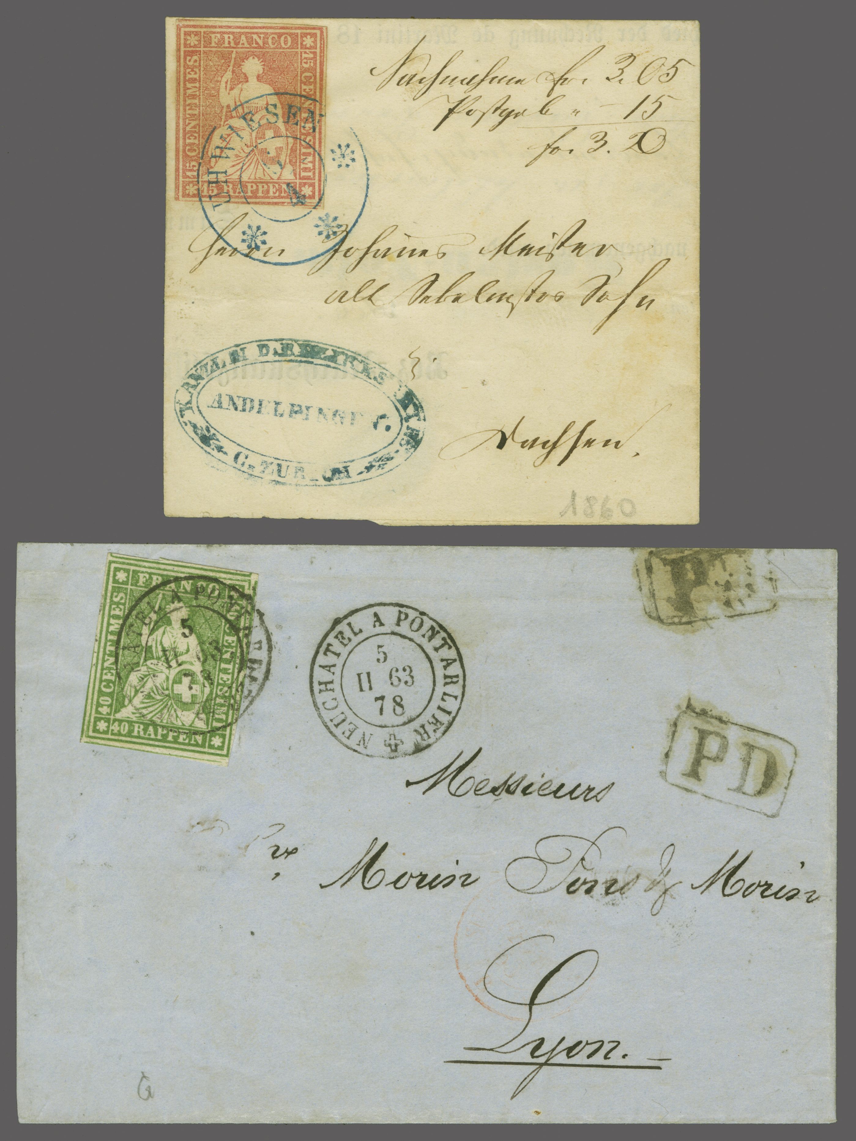 9781 cover image1860/63: Lot zwei Strubelbreife mit interessanten Entwertungen. Dabei 15 Rp. karminrot (SBK 24G), klar, kontrastreich und übergehend entw. mit Bruchstp. "UHWIESEN 6/4" in blau auf charakteristischer, kleinformatiger Kostennota mit Nachnahme über Fr. 3.20 nach Dachsen sowie 40 Rp. olivgrün (SBK 26G), klar und übergehend entw. mit seltenem Bahnpoststp. "NEUCHATEL A PONTARLIER 5.II.63 78" in schwarz, nebenges. wiederholt, auf Faltbriefhülle nach Lyon. Ein attraktives Duo (Image 1)