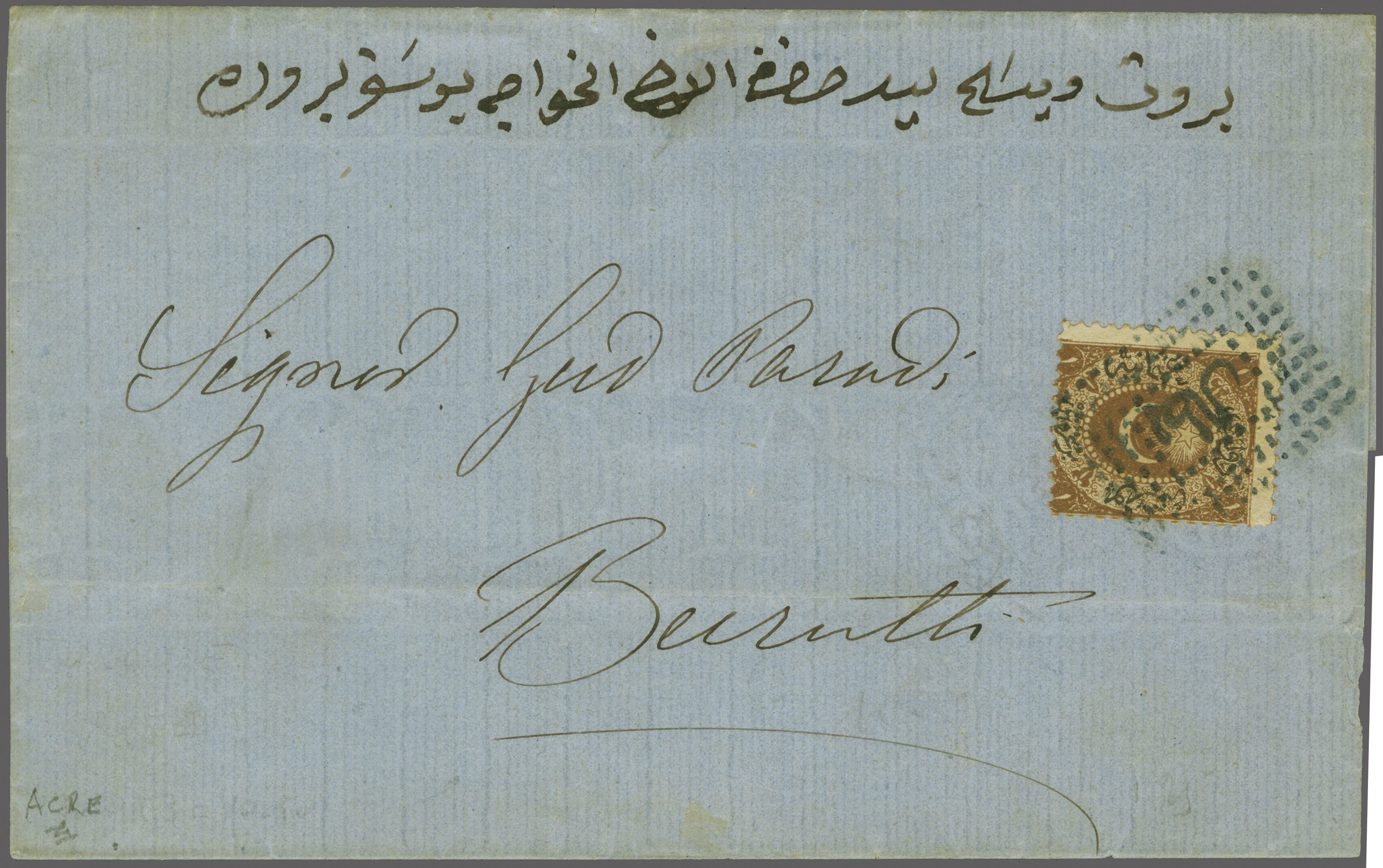 Beirut 1865: Turkey Postage Due 1 pi. brown, used to pay the postage on 17 March 1865 cover from Acre (Palestine) to Beirut and tied by bold strike of the dotted "Battal" in blue - this being an unusual usage on the Dulos
