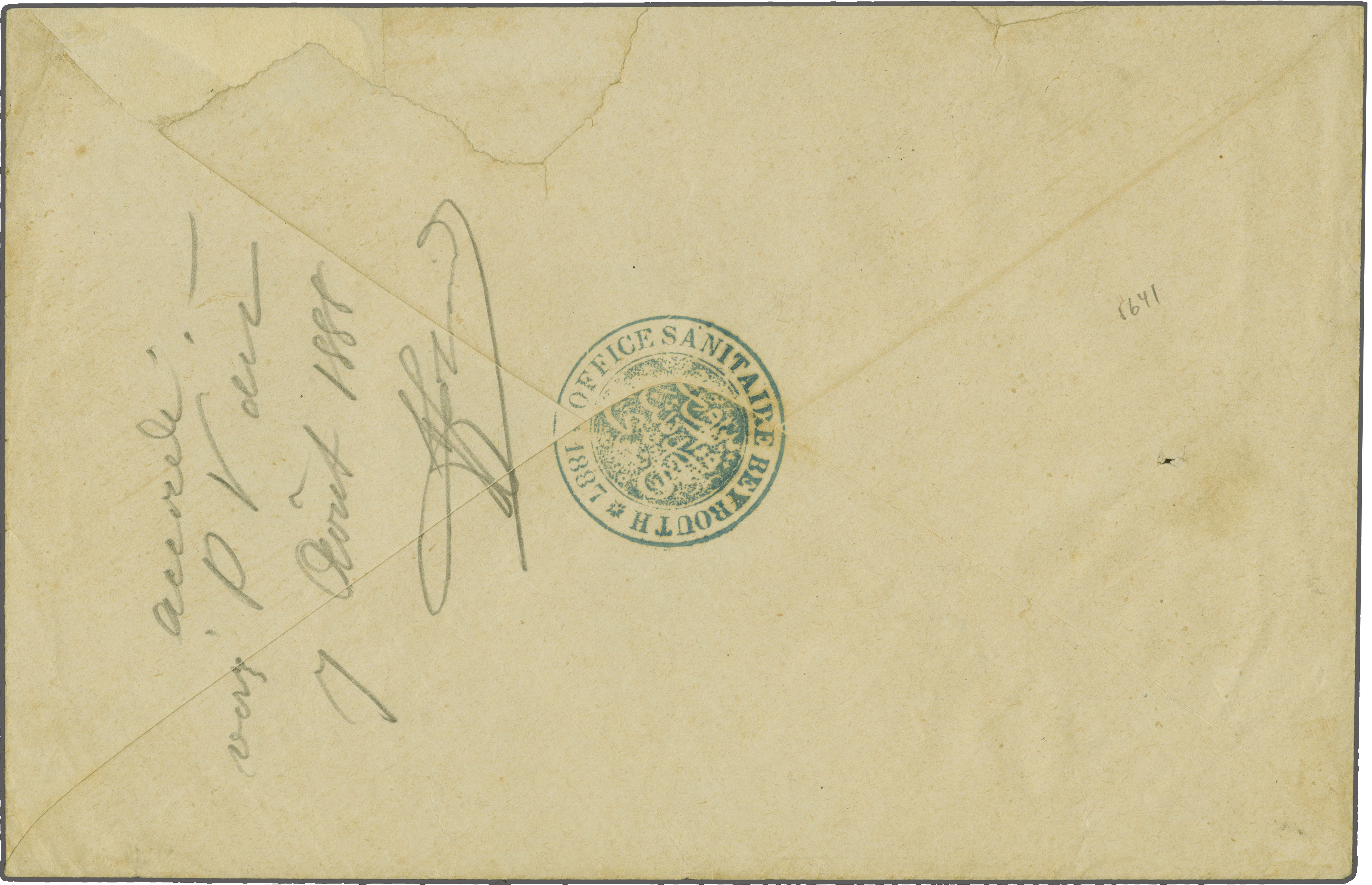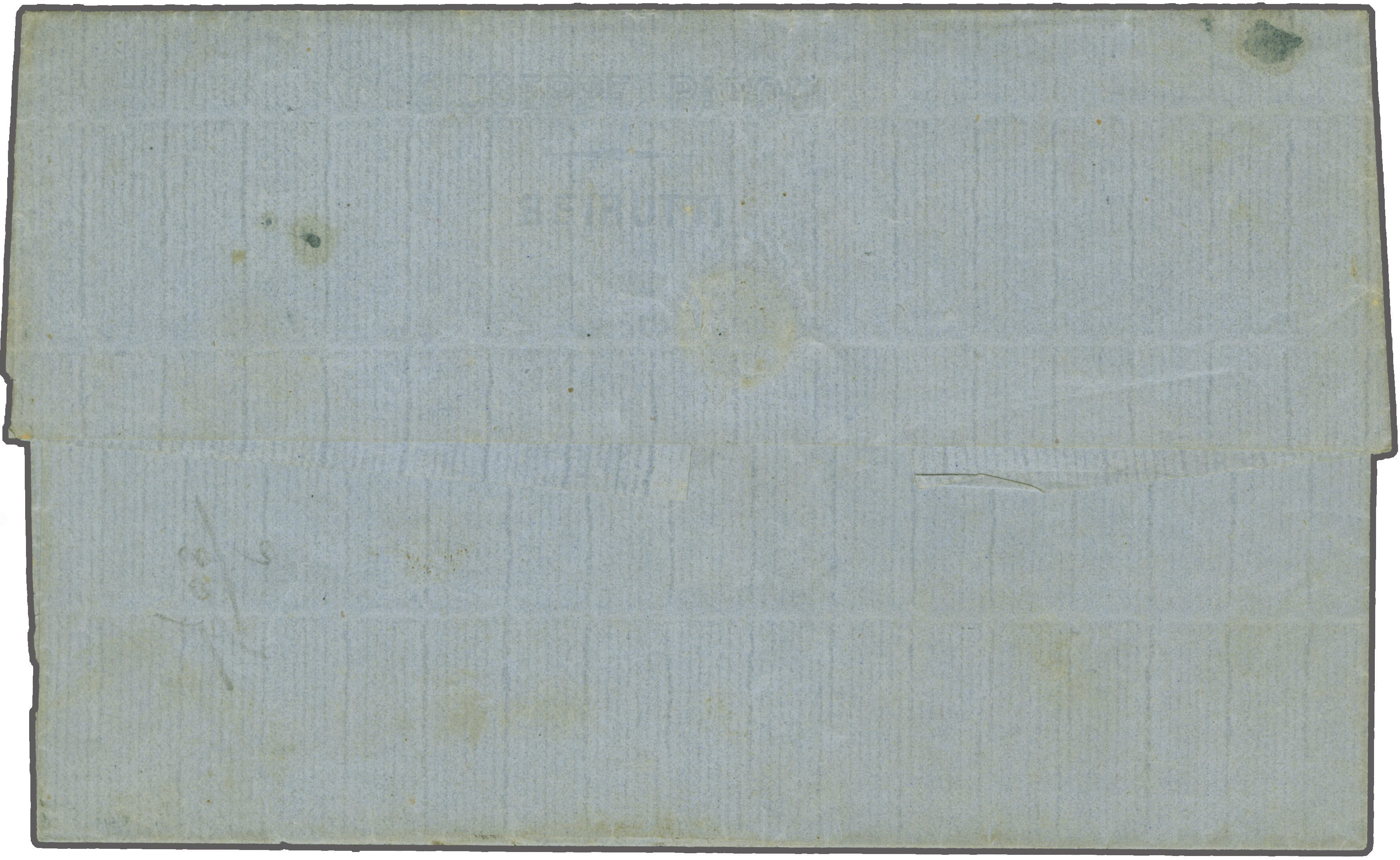 despatch cds (July 16) in black (Coles & Walker fig. 10, Ziya fig. 10). Further strike of Sanitaire cachet on reverse and cover with restored closed tears but scarce (Image 1)