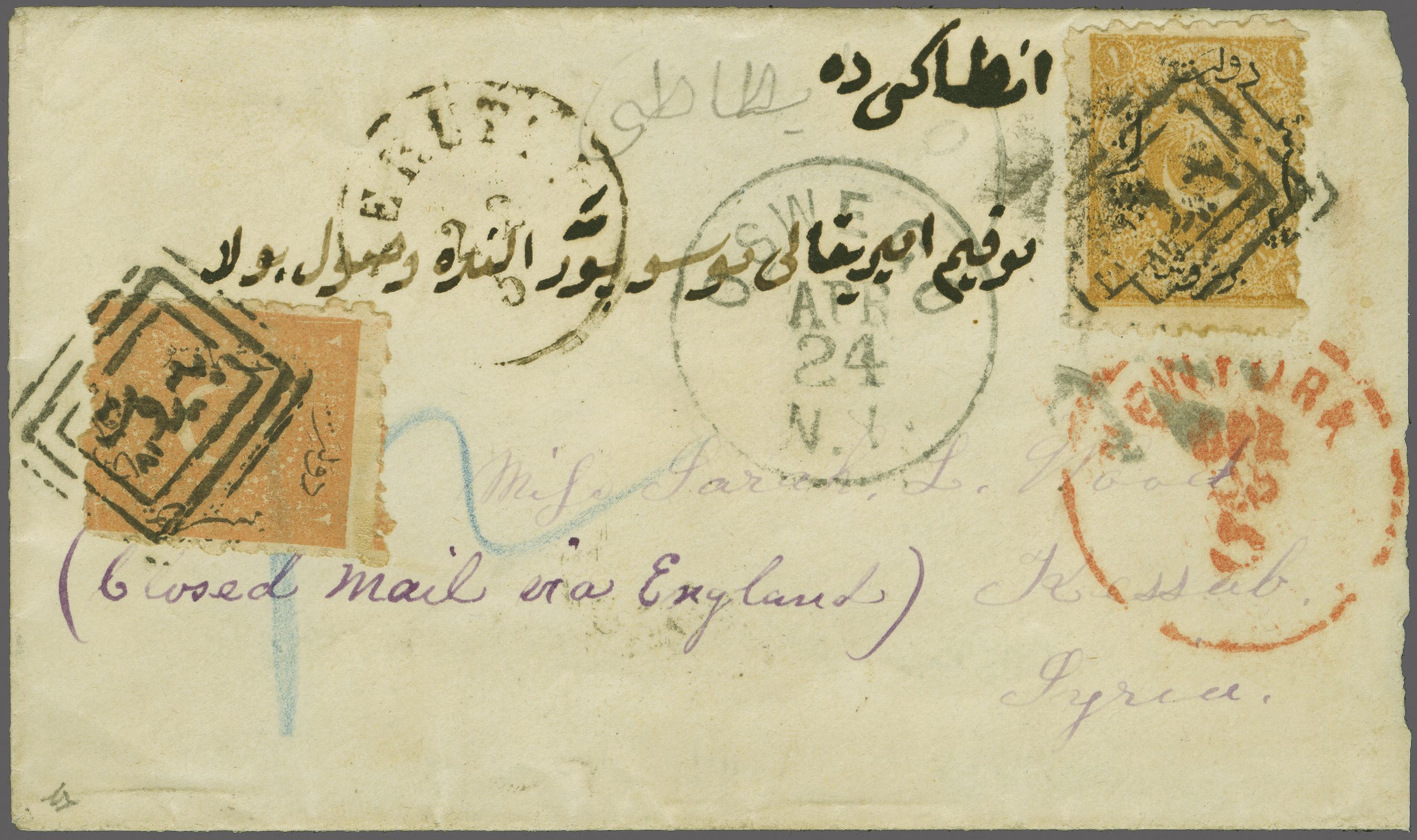 York transit in red (April 25). Reverse with Triest transit (May 11) thence via Lloyd steamer with Austrian P.O. "BERUTTI" cds in black of arrival (May 22) and transferred to the Ottoman P.O. where the 1 pi. and 2 pi. adhesives were applied (after