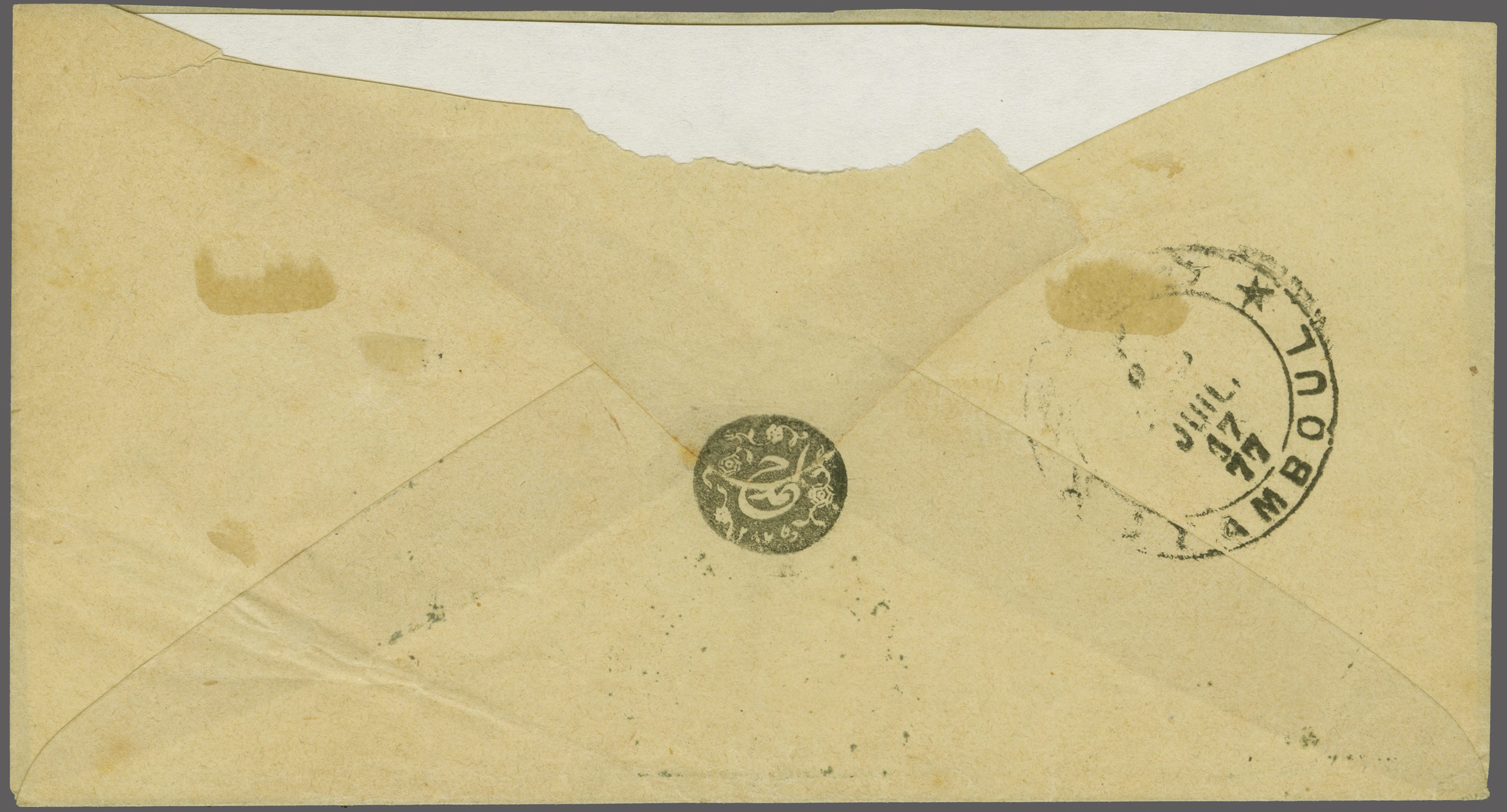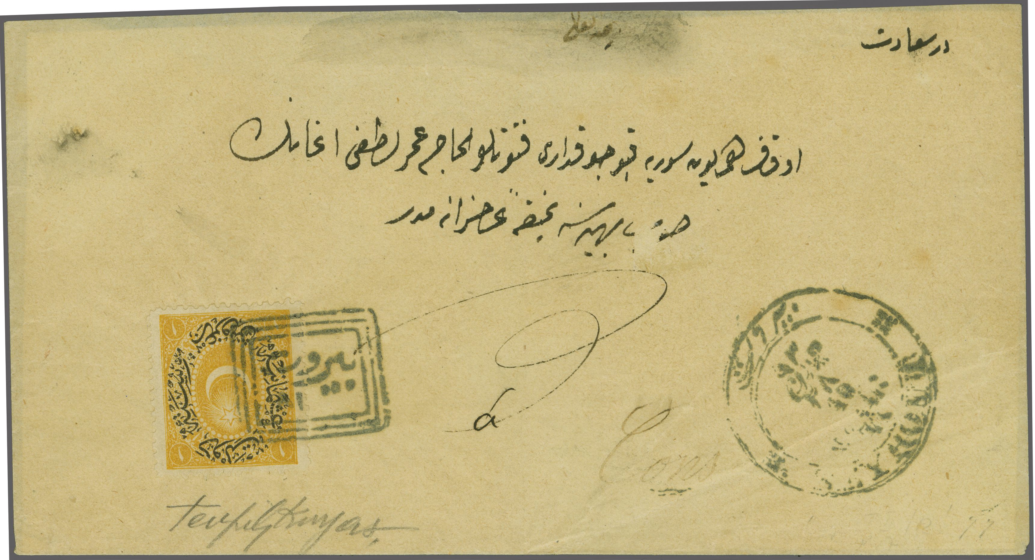Beirut 1876: Turkey 1 pi. yellow, a fine used example on 10 July 1877 cover to Constantinople tied by fine strike of large inner (15 x 12 mm.) triple framed "BEIRUT 81" handstamp in black (Coles & Walker fig. 5, Ziya fig.