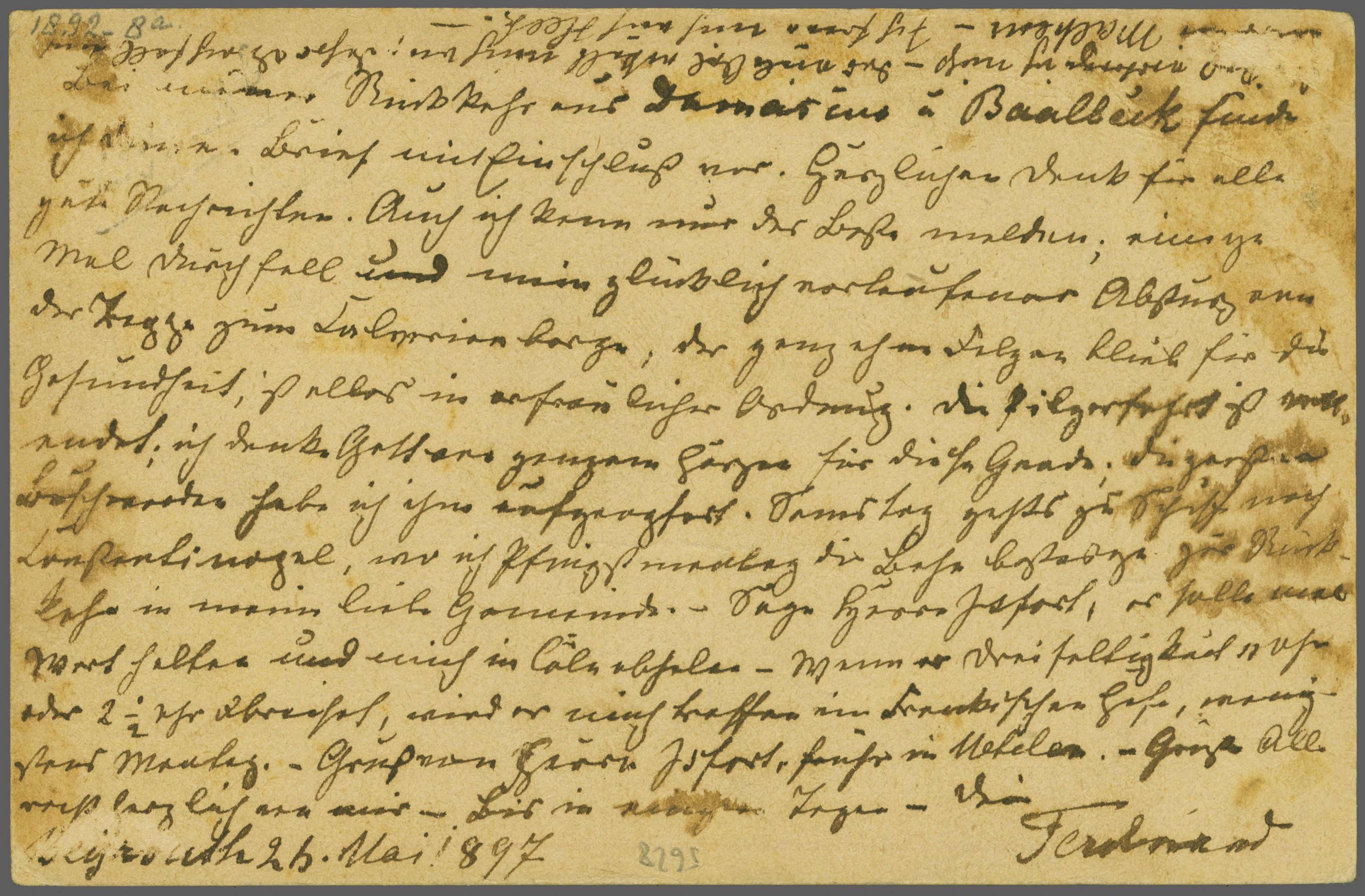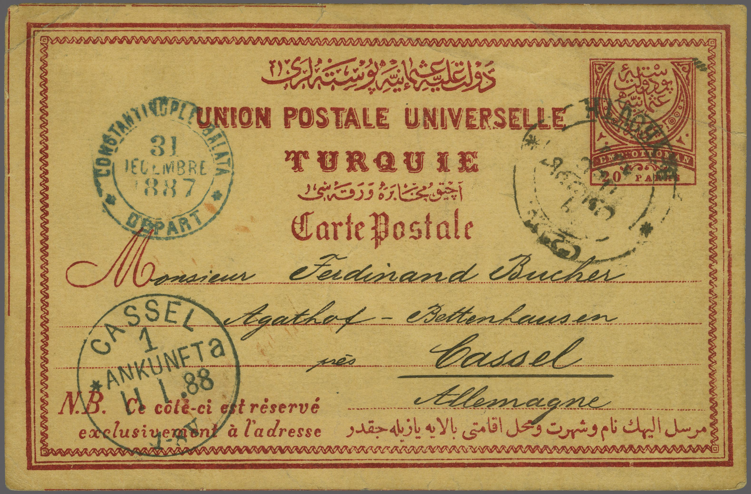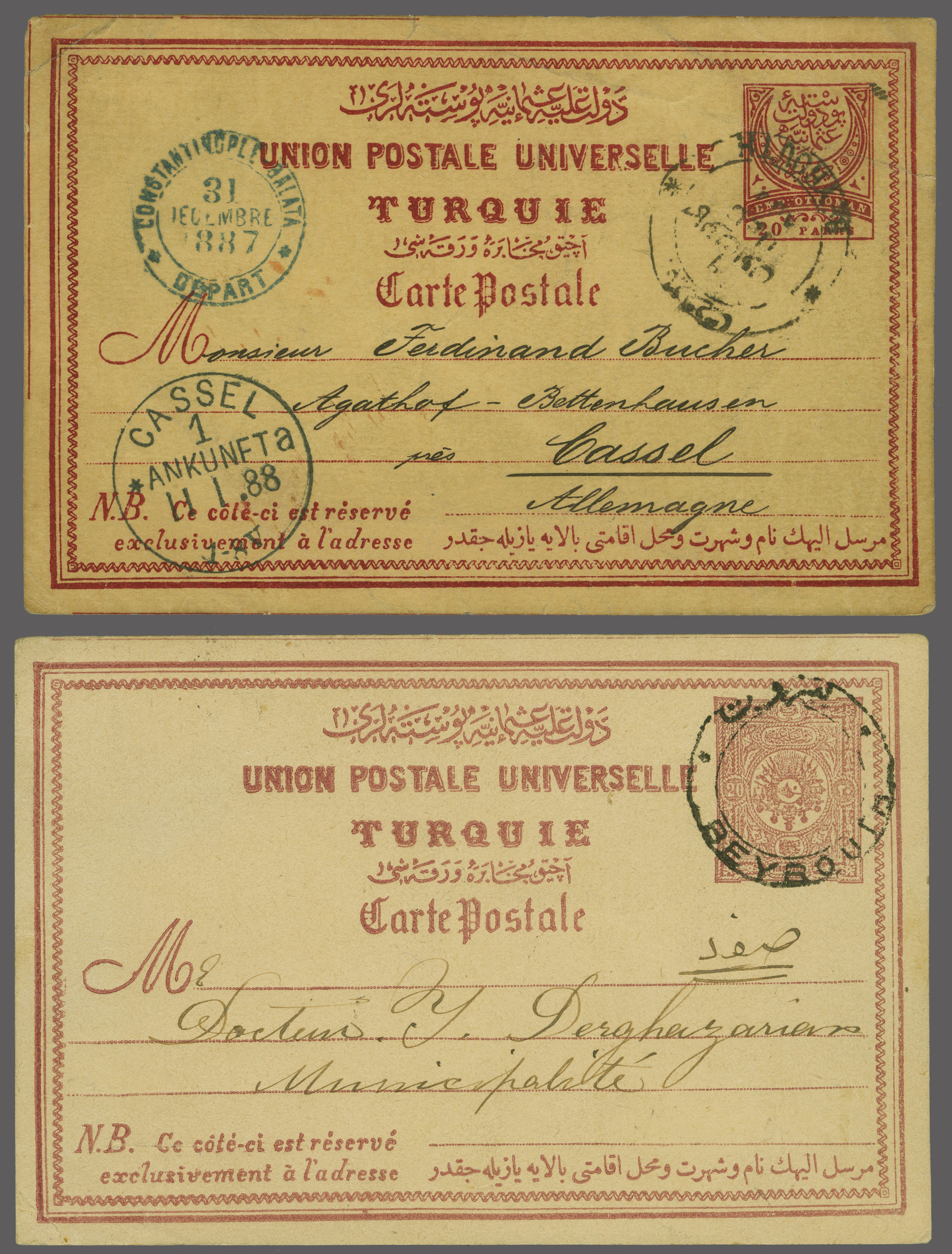 blue cds (Dec 31) and Cassel arrival (Jan 11) - this is the sole recorded complete example of this Beyrouth datestamp - the other partial strike is illustrated in Ziya, catalogue 'B' on page 124. Sold together with an 1892 20 pa. claret card