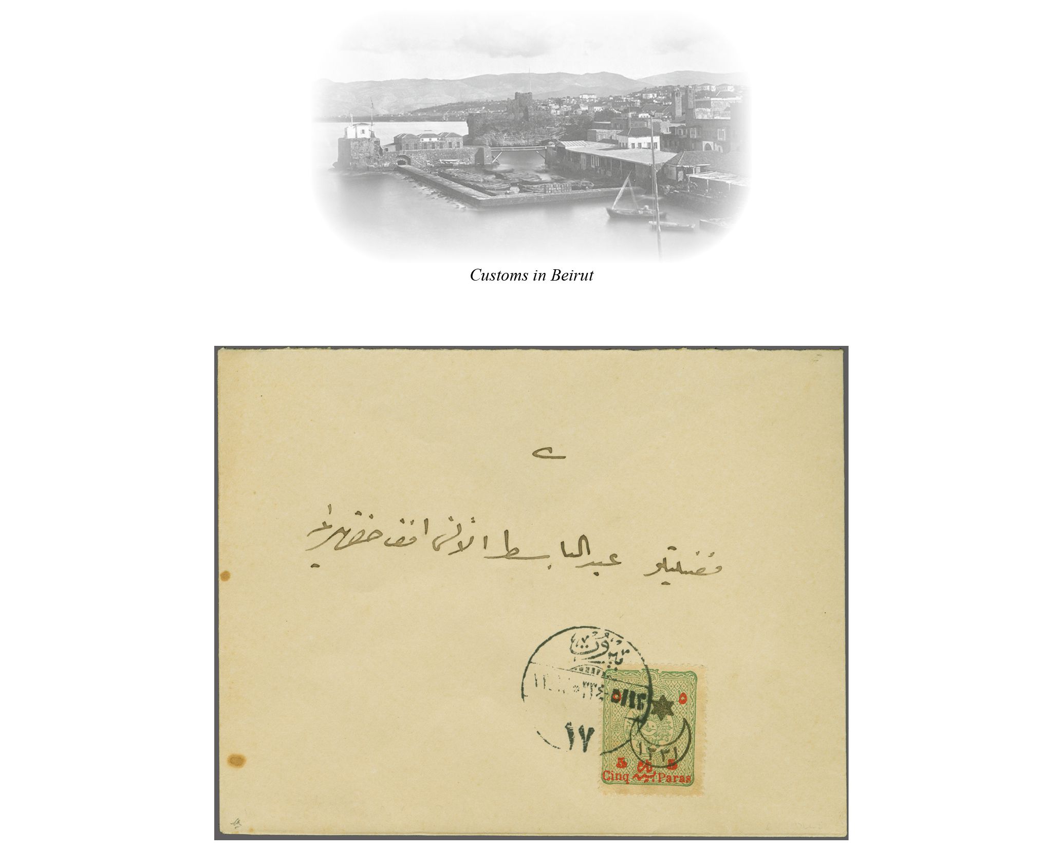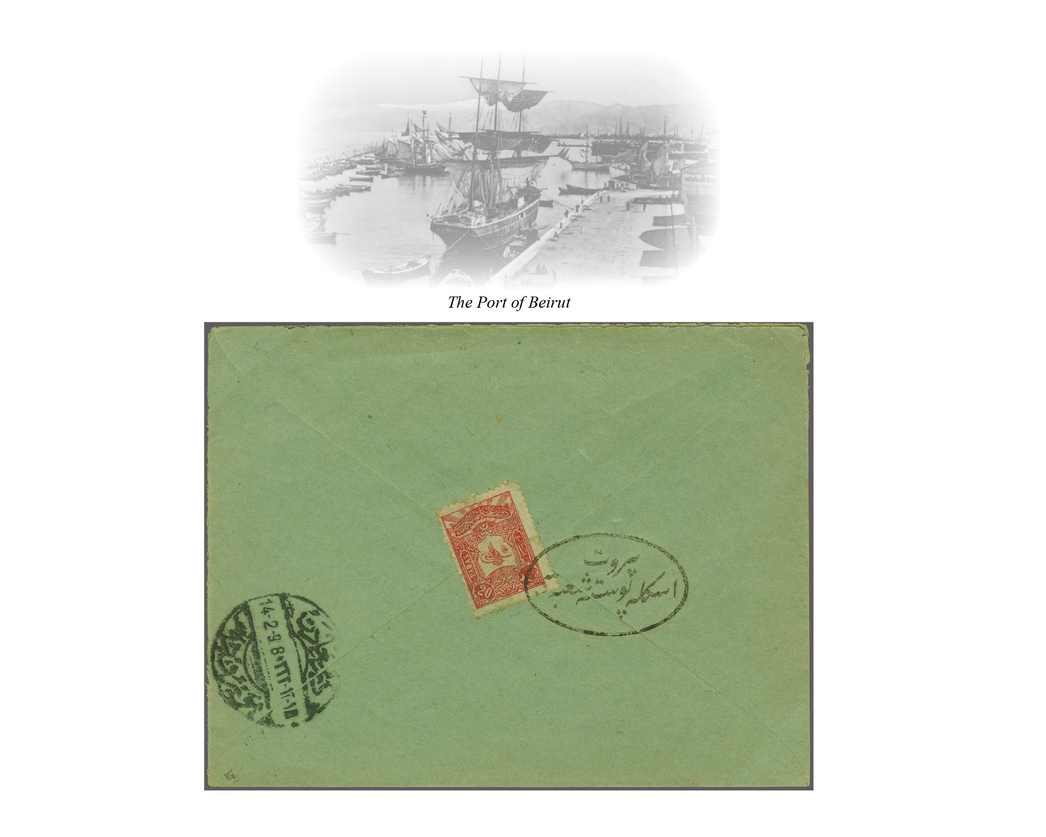 Harbour Postal Branch No. 2) struck in black (Coles & Walker fig. 37, Ziya fig. 2 - rated 'RR') with bilingual "Beyrouth" cds at left (June 27). Slight corner bend to card otherwise superb and rare. Note: This cover is illustrated in the Ziya