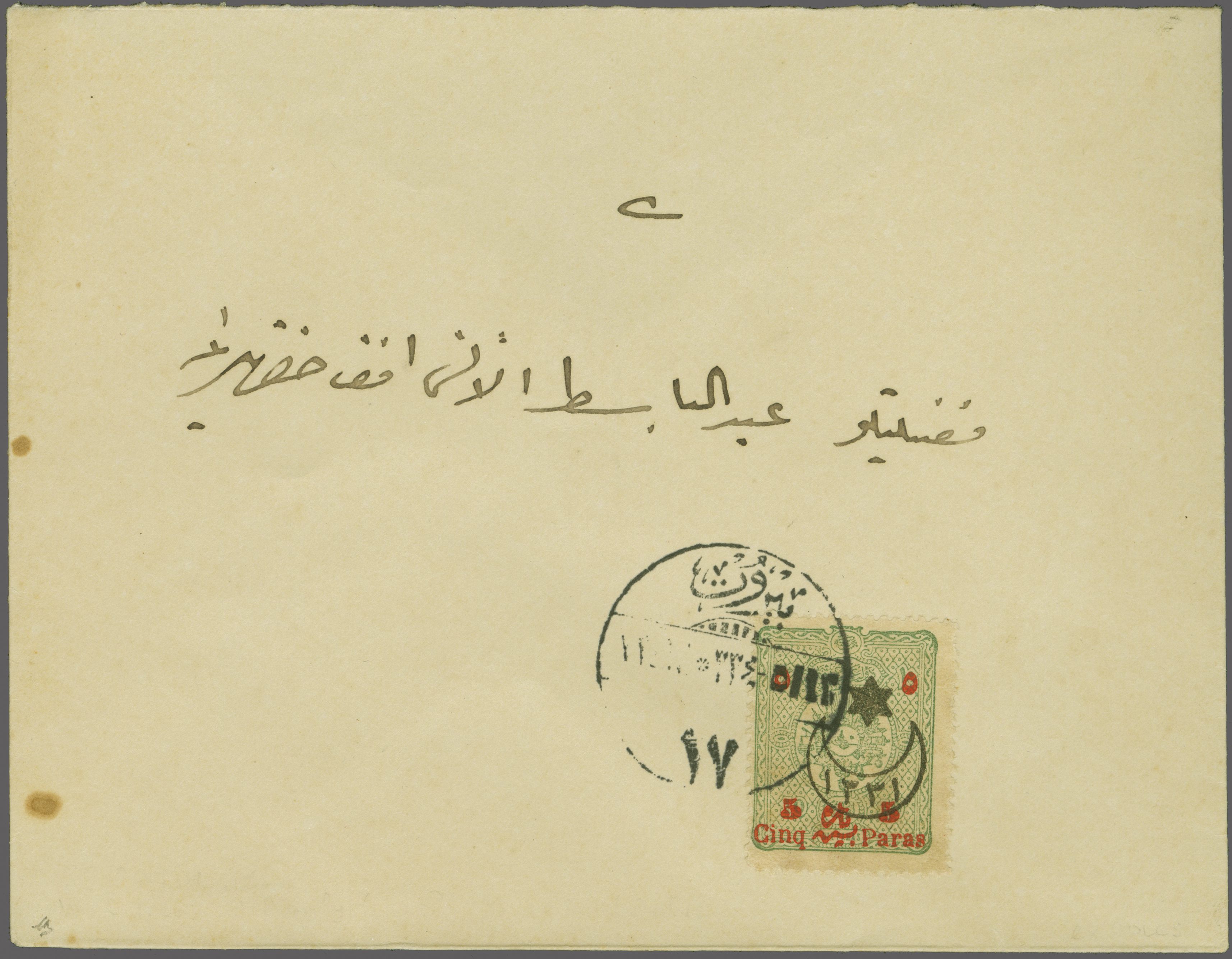 Beirut 1918: Turkey printed rate 5 pa. in red on 10 pa. green, used on local 13 May 1918 cover to an Official and thus uncensored, tied by "BEIRUT / 17" circular datestamp in black (Coles & Walker fig. 26, unlisted by