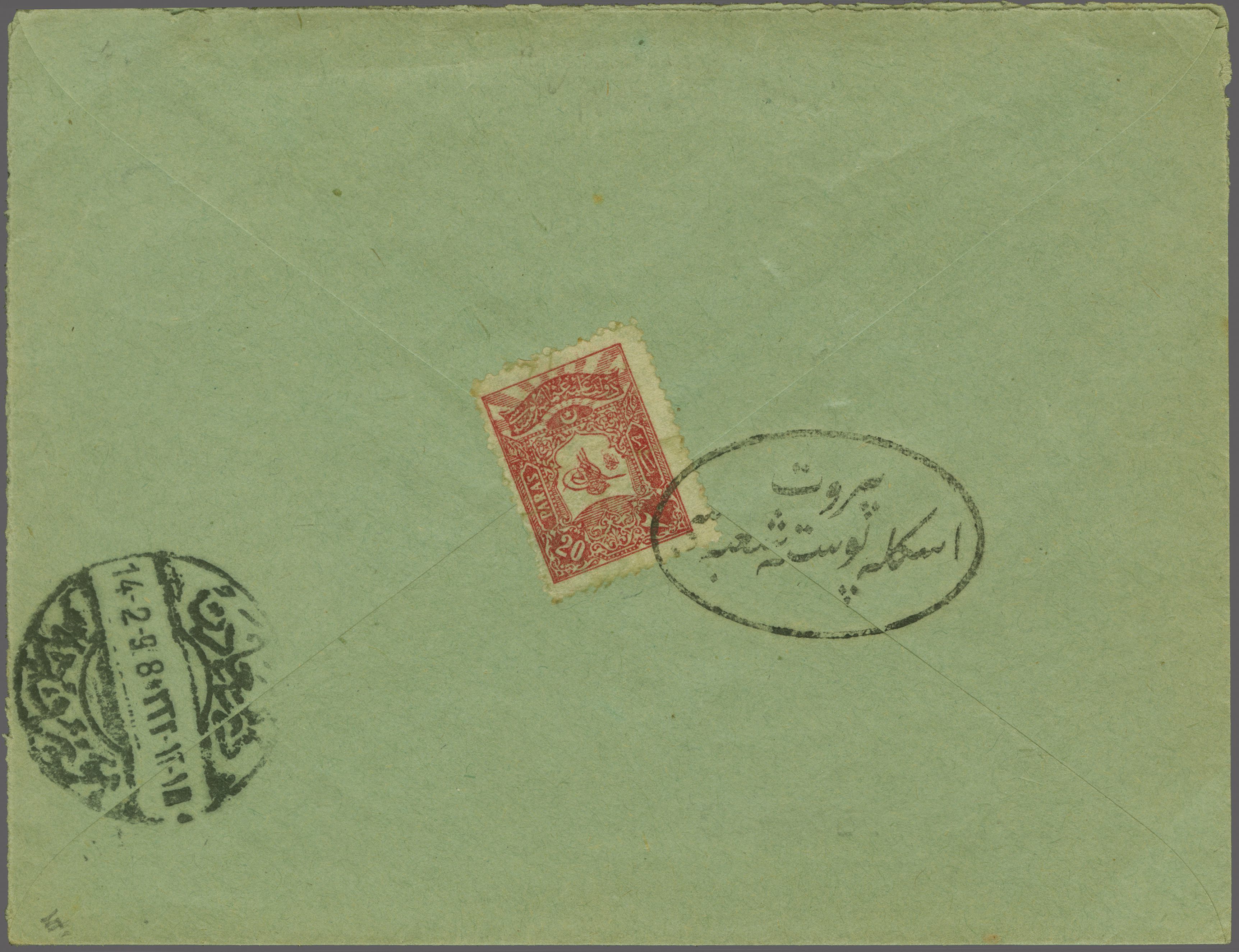 POSTA SHUBESI" handstamp (Beirut Harbour Postal Branch) in black (Coles & Walker unlisted, Ziya fig. 1 - rated 'RRR'). Constantinople arrival cds at left (Feb 14). An exceptional cover, believed unique. Note: This cover is illustrated in the Ziya