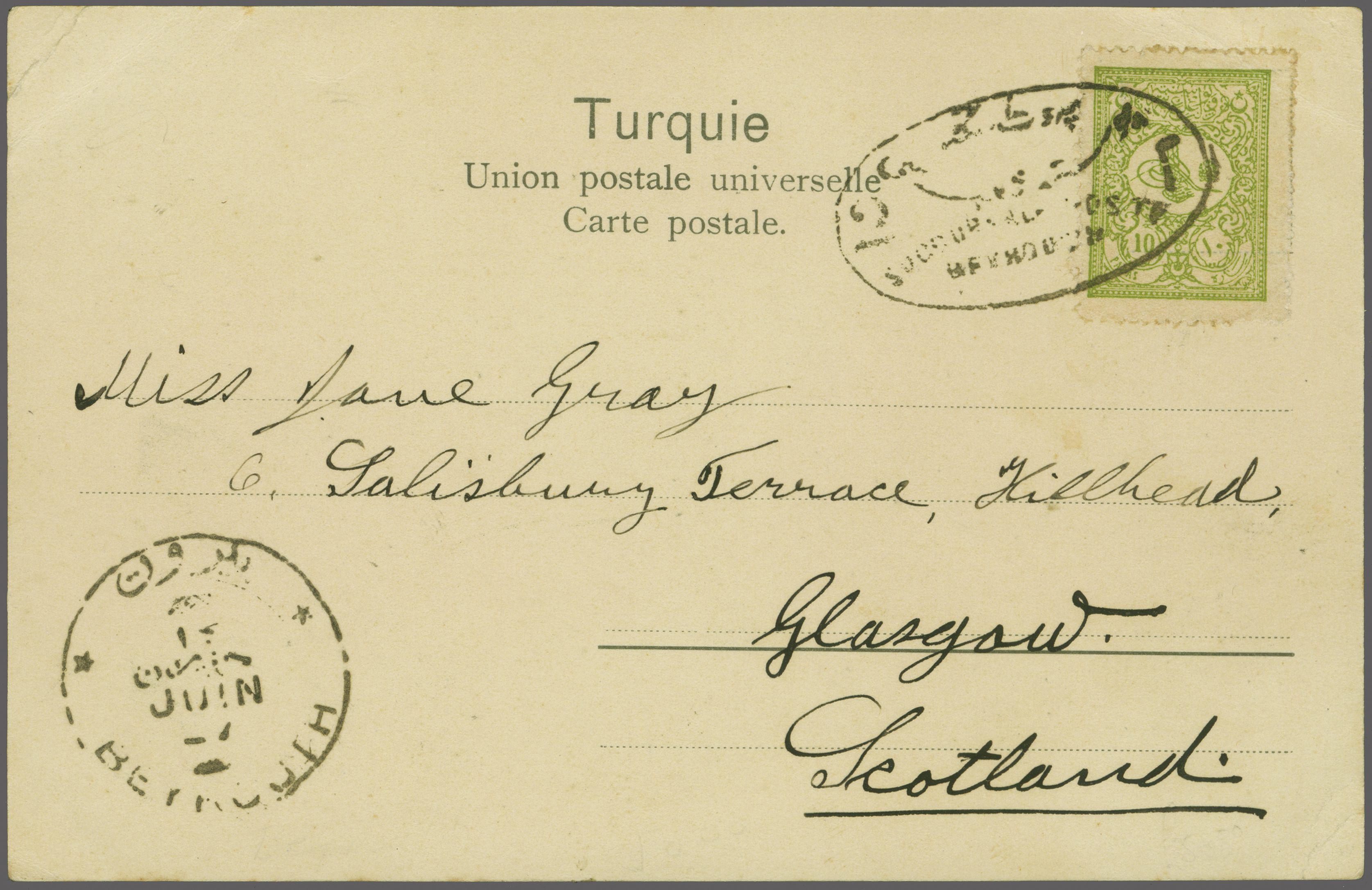 Beirut Harbour Office 1901: Turkey 10 pa. yellow-green, a single example on postcard used from Beirut Harbour to Glasgow, tied by oval framed bilingual "BEIRUT ISKELESI 2 / SUCCURSALE POSTE BEYROUTH 2" handstamp (Beirut