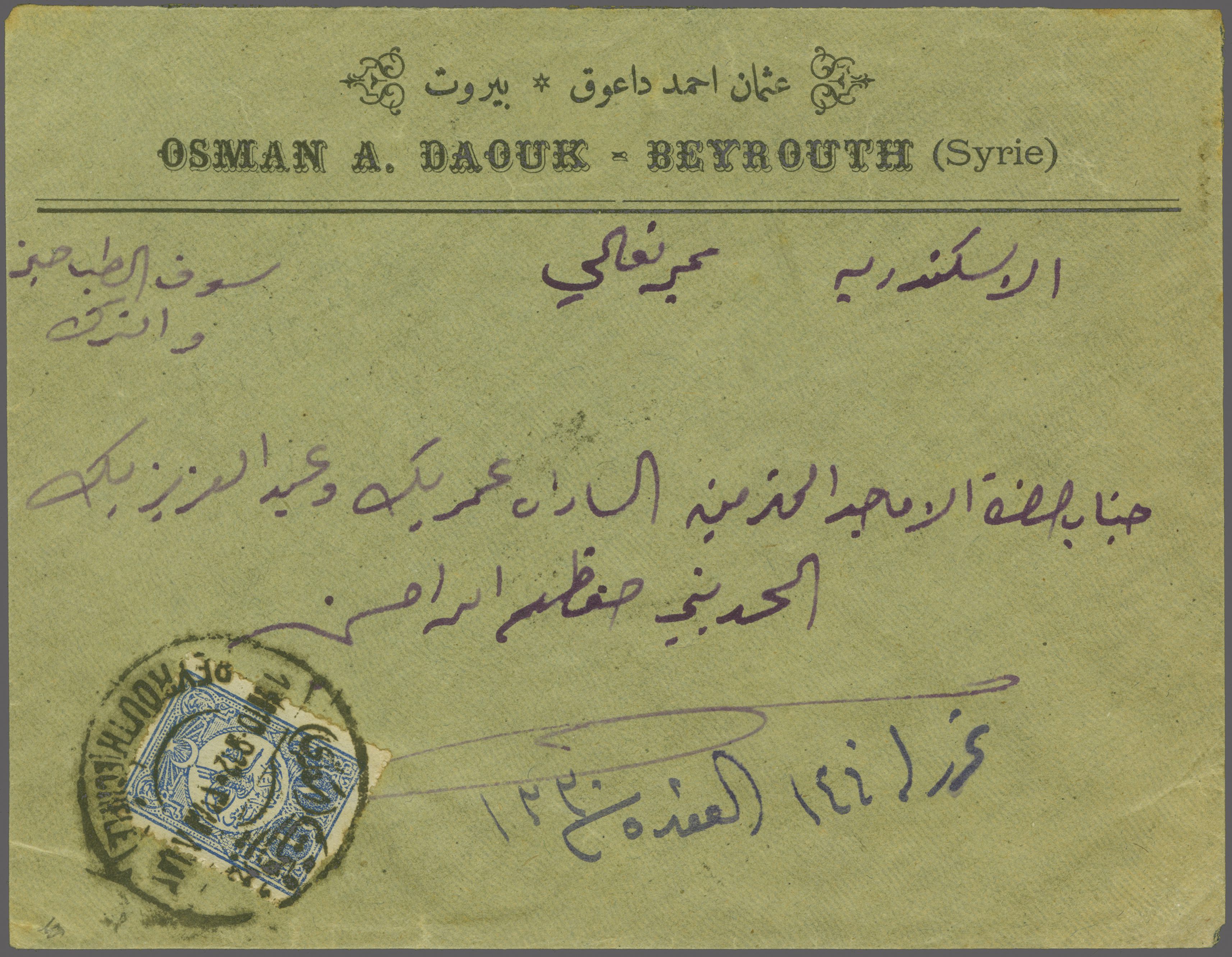 Beirut Harbour Office 1909: Turkey 1 pi. blue, a single example used on cover from Beirut Harbour to Alexandria, Egypt tied by bold strike of "BEYROUTH (ECHELE)" circular daetstamp (Oct 15) in black (Coles & Walker fig.