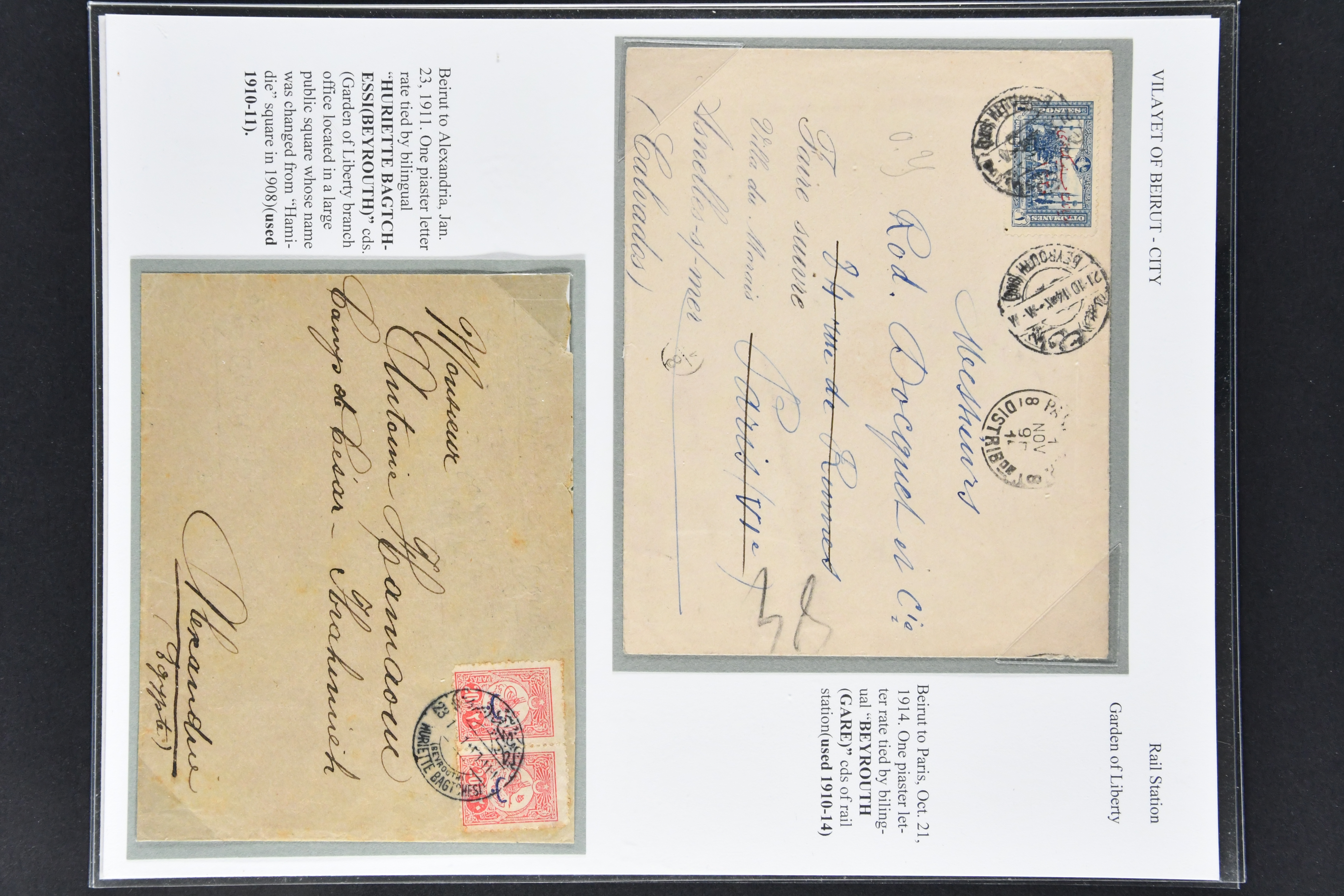 fig. 35) and 1914 cover to Paris franked by 1914 1 pi. blue tied by circular "BEYROUTH (GARE)" Railway Station P.O. datestamp (Oct 21) in black (Coles & Walker fig. 34, Ziya 1 - rated 'R'). A good group (Image 1)