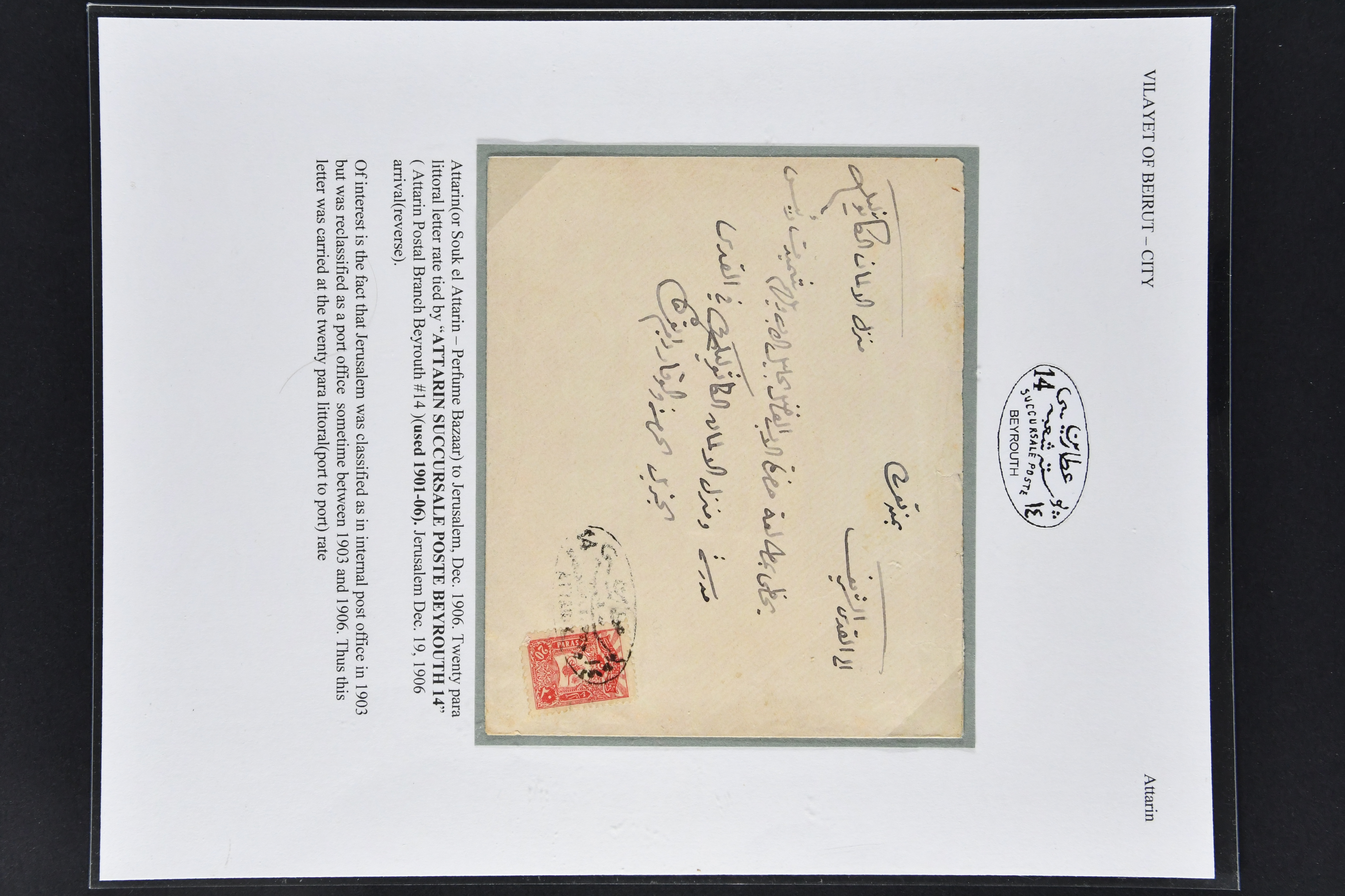 Beirut Sub Offices 1906/14: Covers (3) with 1906 cover bearing 1905 20 pa. used to Jerusalem at littoral / port to port reduced rate, tied by fair bilingual "14 / SUCURSALE POSTE / ATTARIN / 14" oval handstamp
