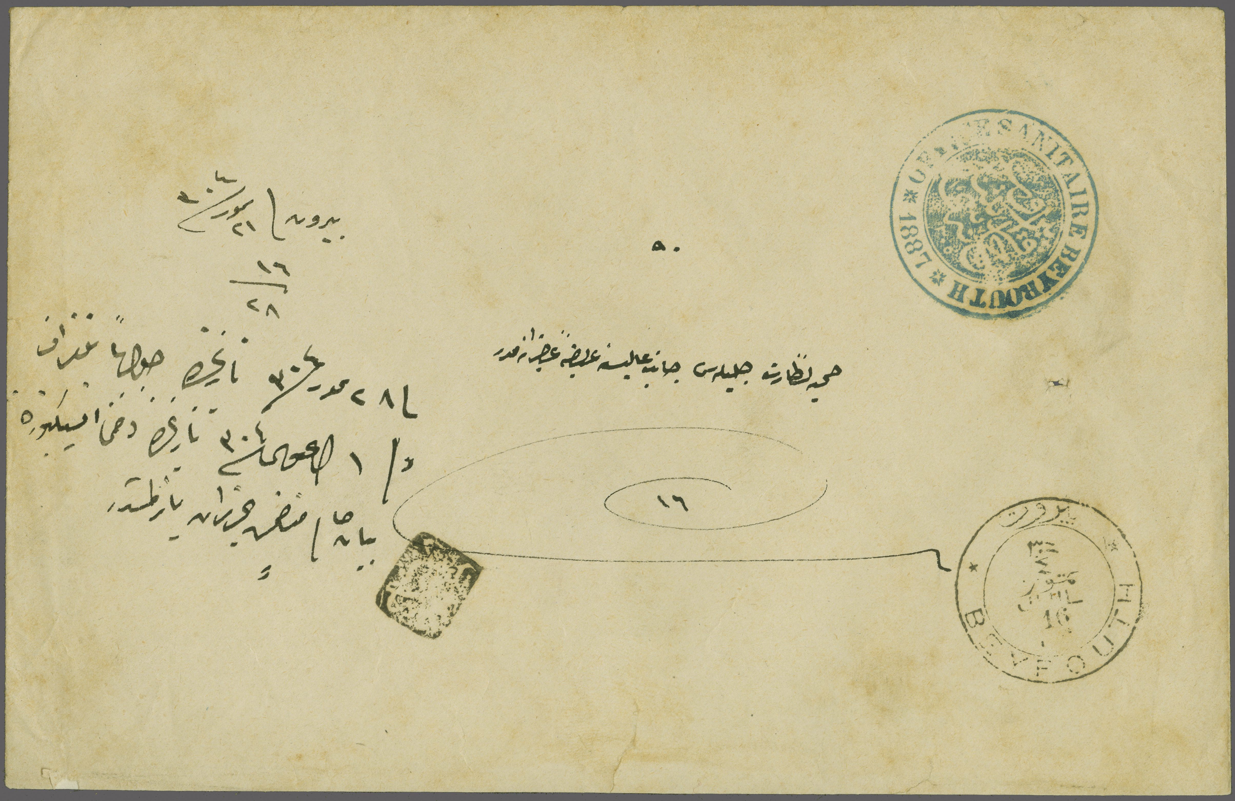 Beirut 1888: Official cover from Beirut to the Ministry of Health in Constantinople, struck with free frank negative chop at left, fine "OFFICE SANITAIRE BEYROUTH / 1887" circular cachet in blue with bilingual "BEYROUTH"