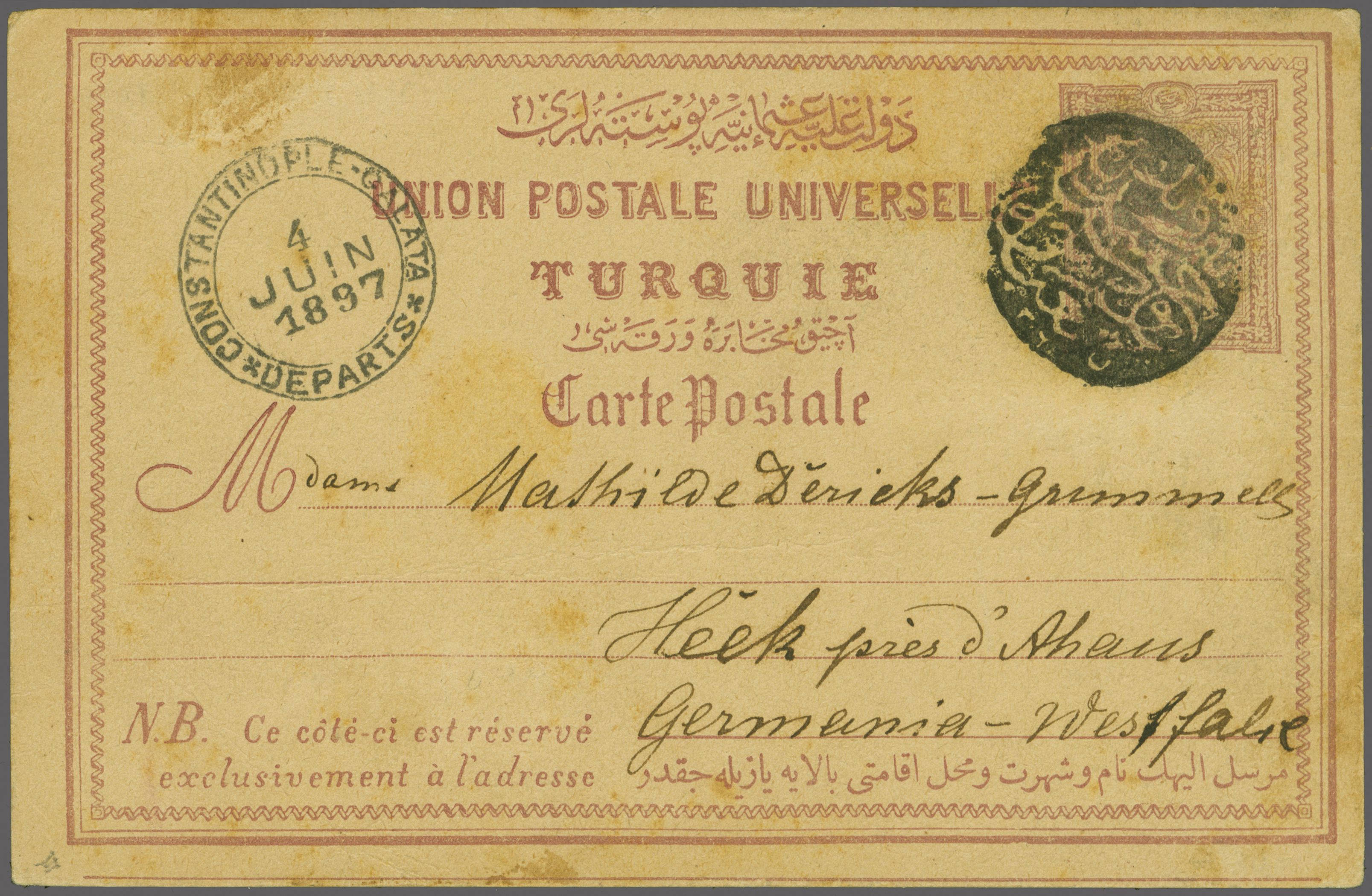 handstamp in black (Coles & Walker fig. 39, Ziya fig. 1 rated 'RR'), with "Constantinople-Galata" transit (June 4) at left. An exceptional strike. Note 1: This card is illustrated in Ziya catalogue 'B' on page 136. Note 2: Hamidiye Square was