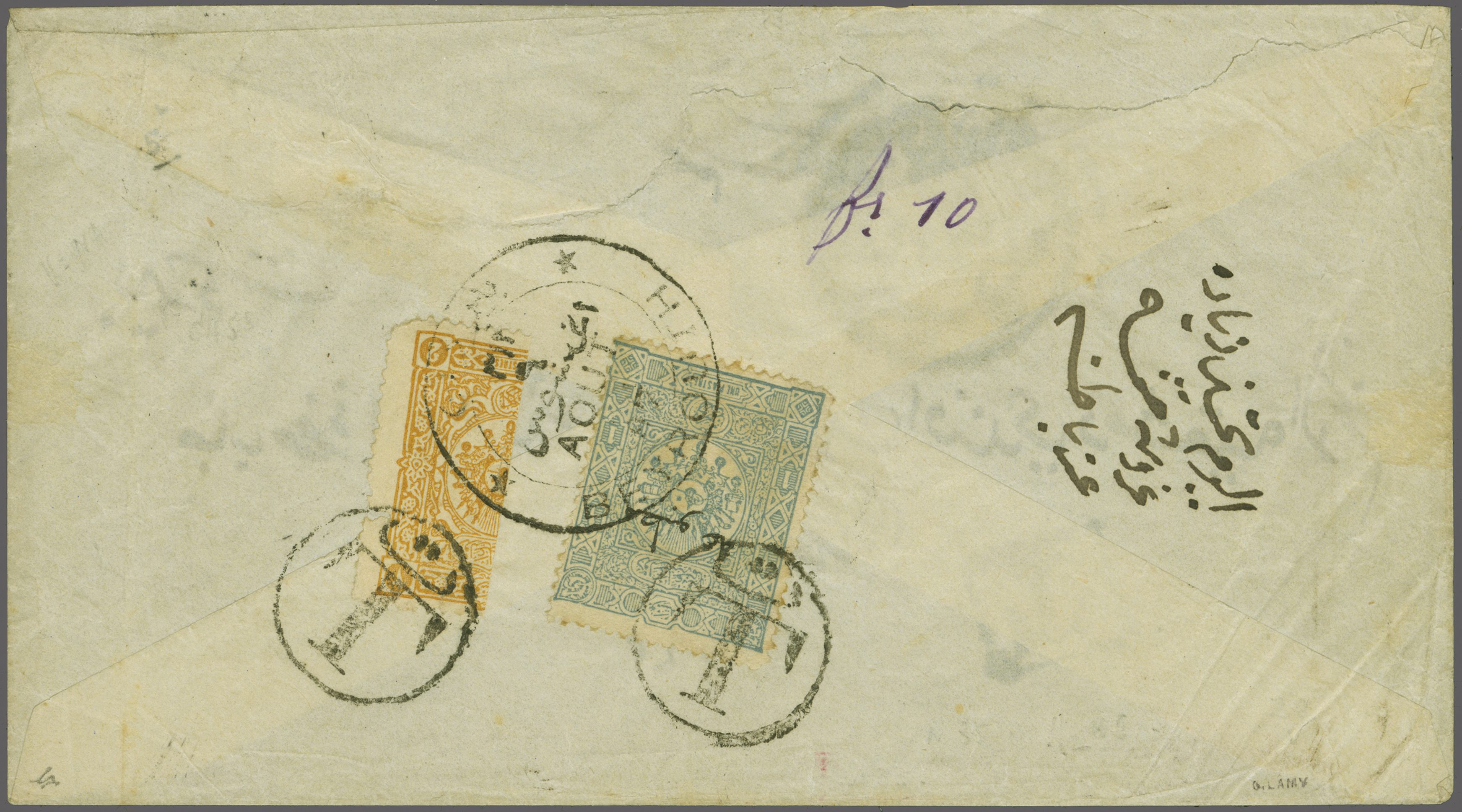Beirut Postage Due 1897: Cover from Egypt to Beirut sent stampless with superb "DAMIETTE" Star & Crescent despatch cds (Aug 17) in black with "T" marking below, reverse with Turkey 1894 1 pi. grey-blue 'Matbua' and 1892