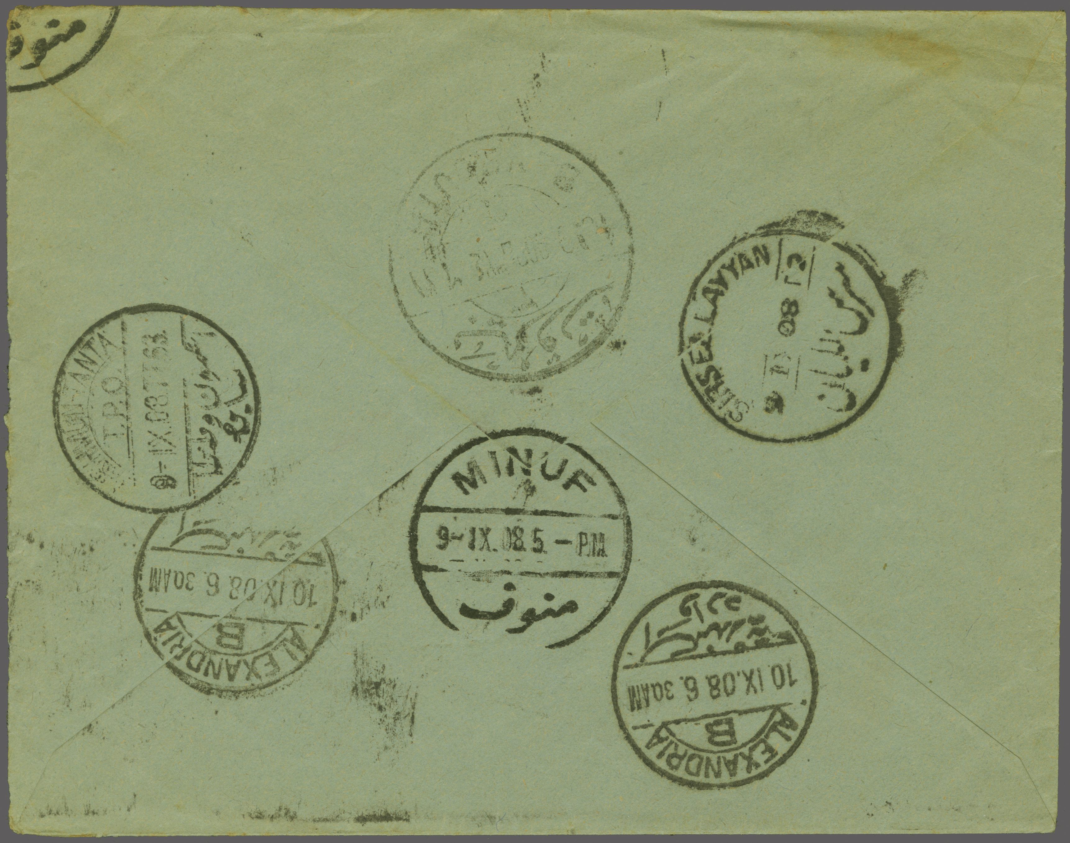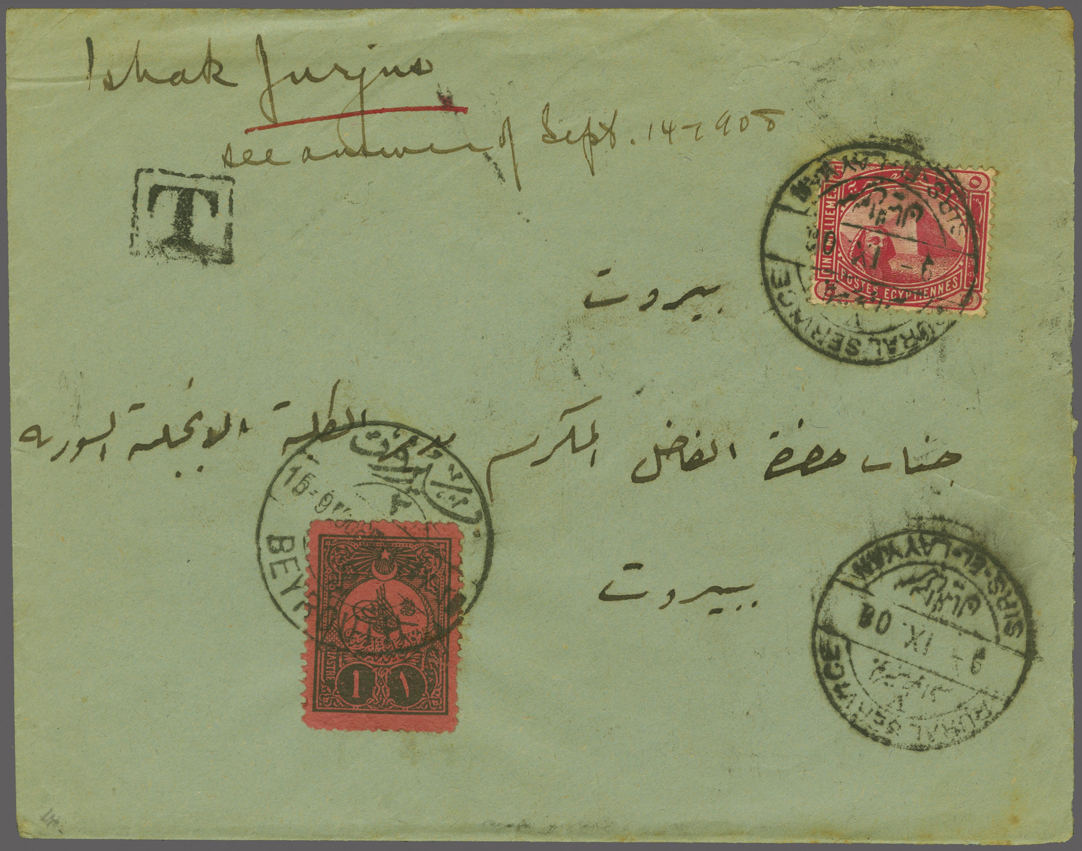 framed "T" mark in black and taxed upon arrival in Beirut with Turkey 1908 Postage Due 1 pi. black on red tied by bilingual "BEYROUTH / 2" cds in black (Sept 15) for double the deficiency. Reverse of cover with Sirs-el-Layyan cds, "Ashmoun-Tanta"