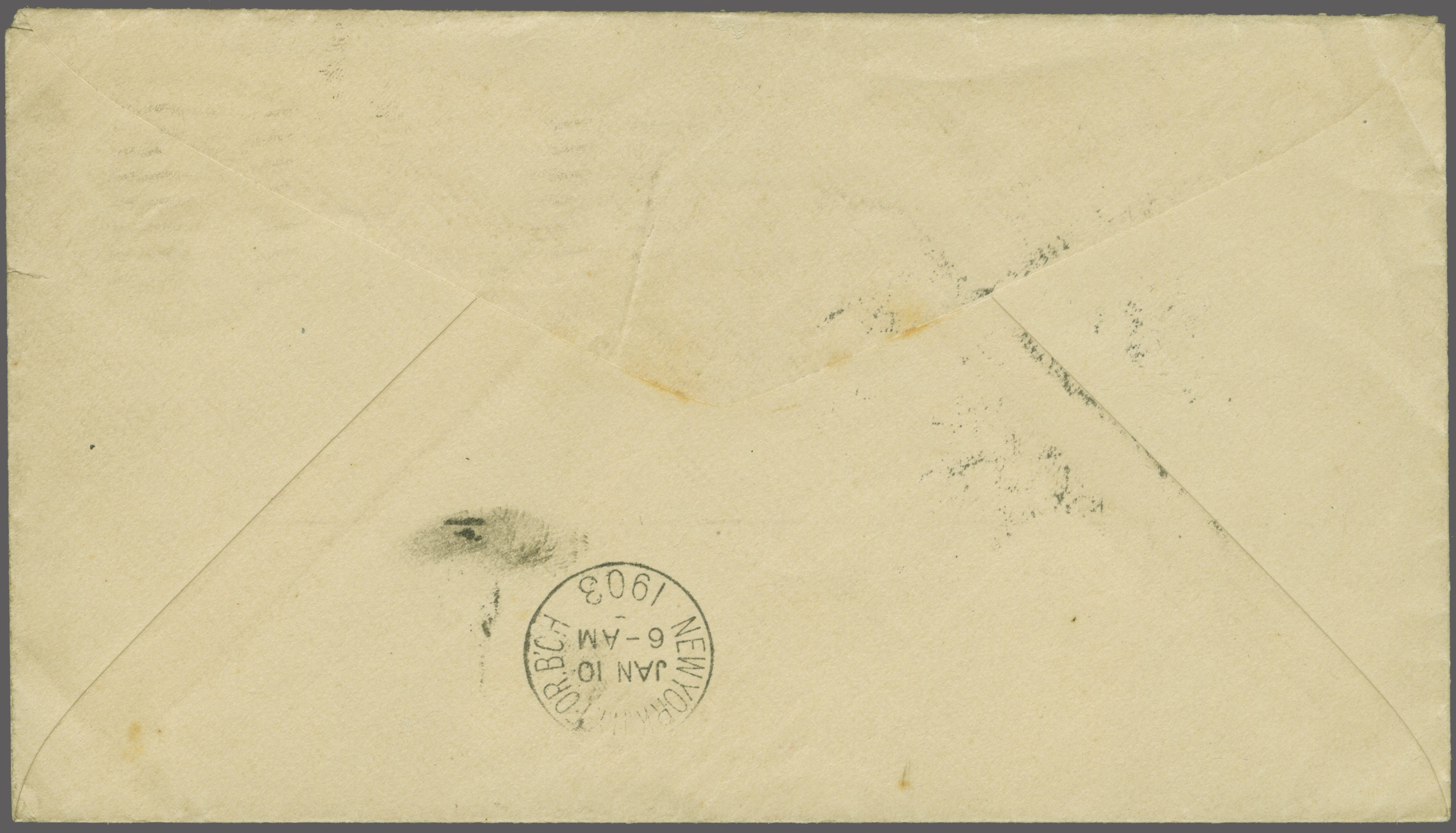 Beirut Postage Due 1903: USA 5 c. blue postal stationery envelope used from Newark, USA to Beirut, struck with "2 / T / Centimes 25" handstamp in black on despatch - underpaid as double weight and taxed upon arrival with